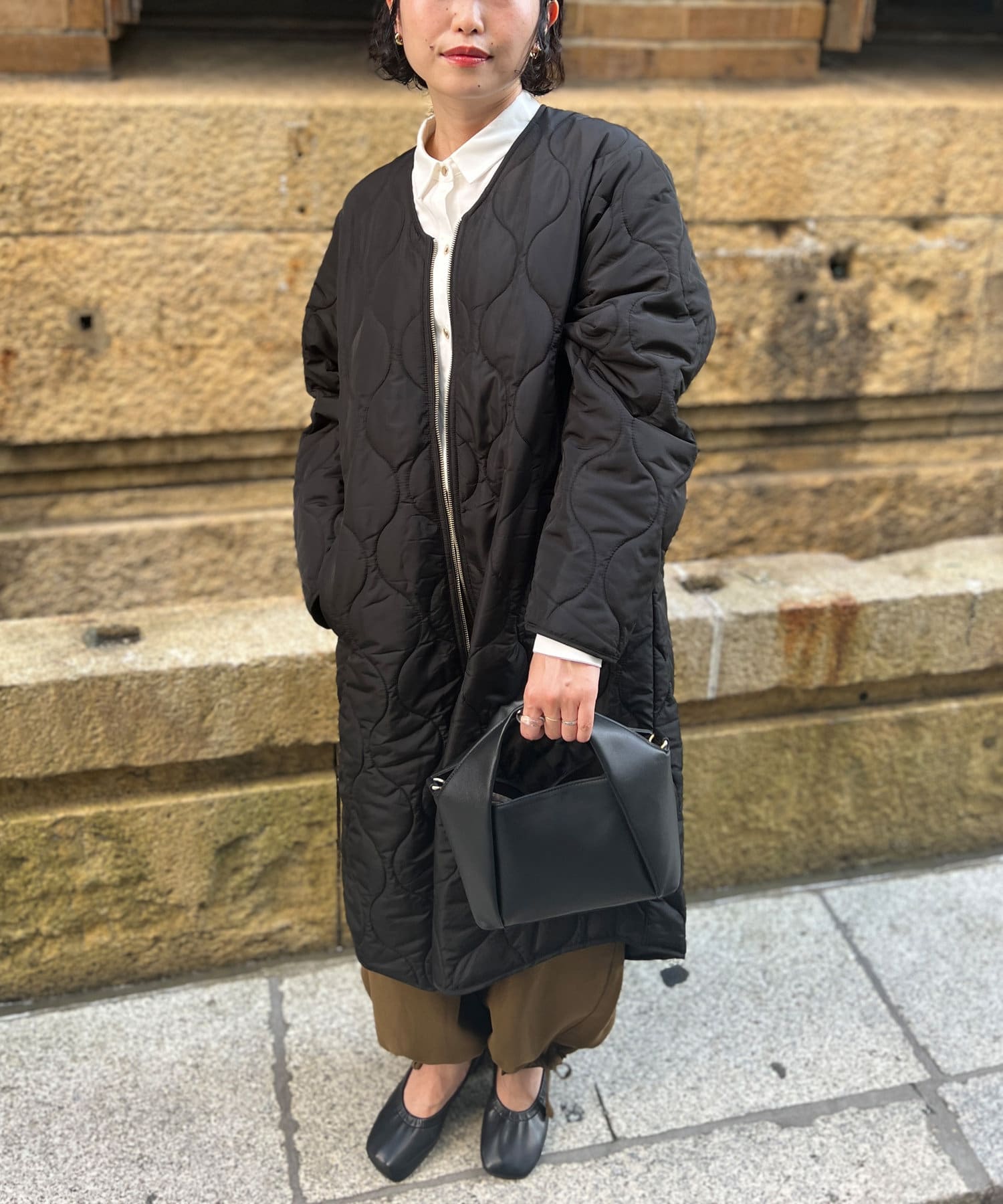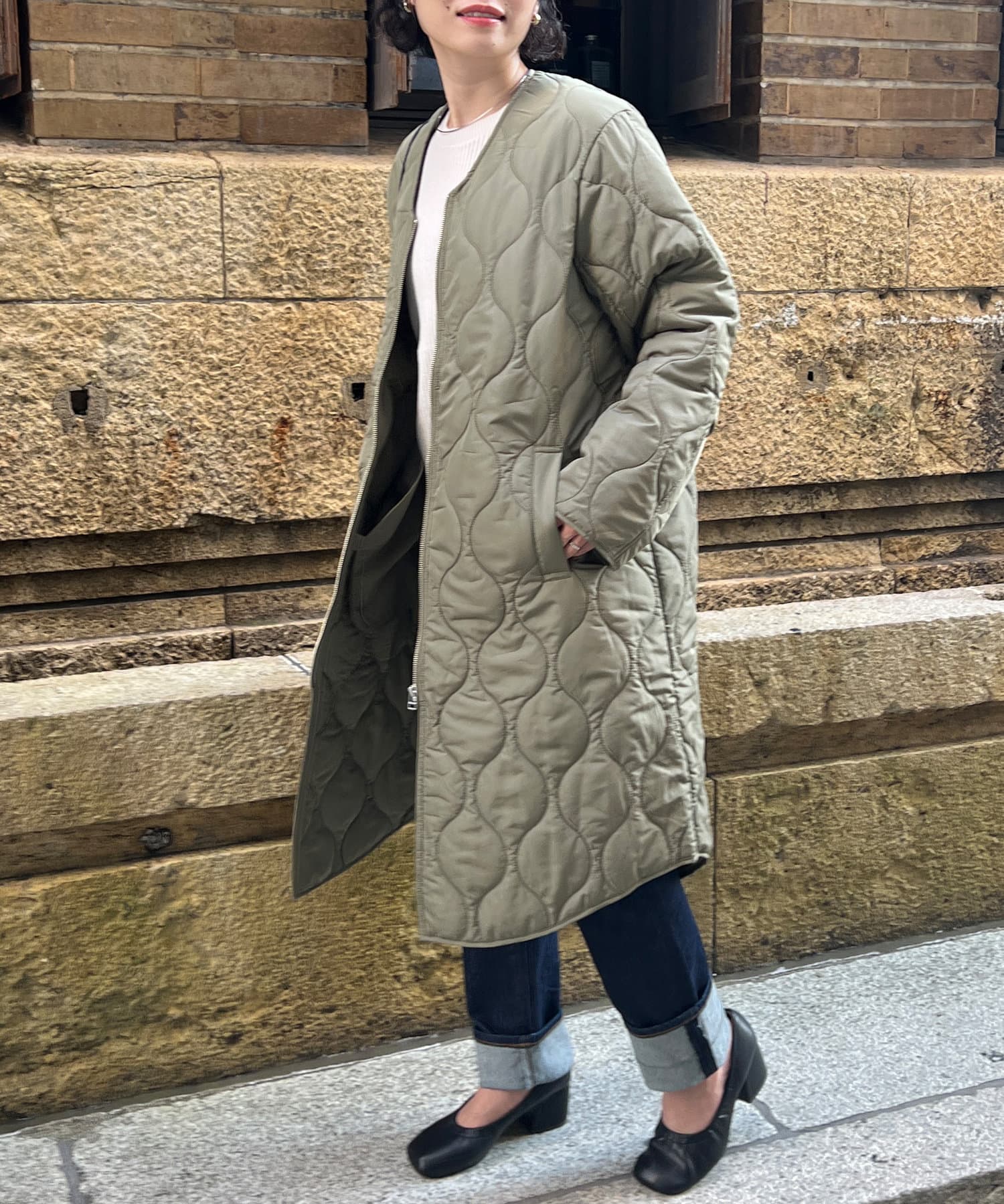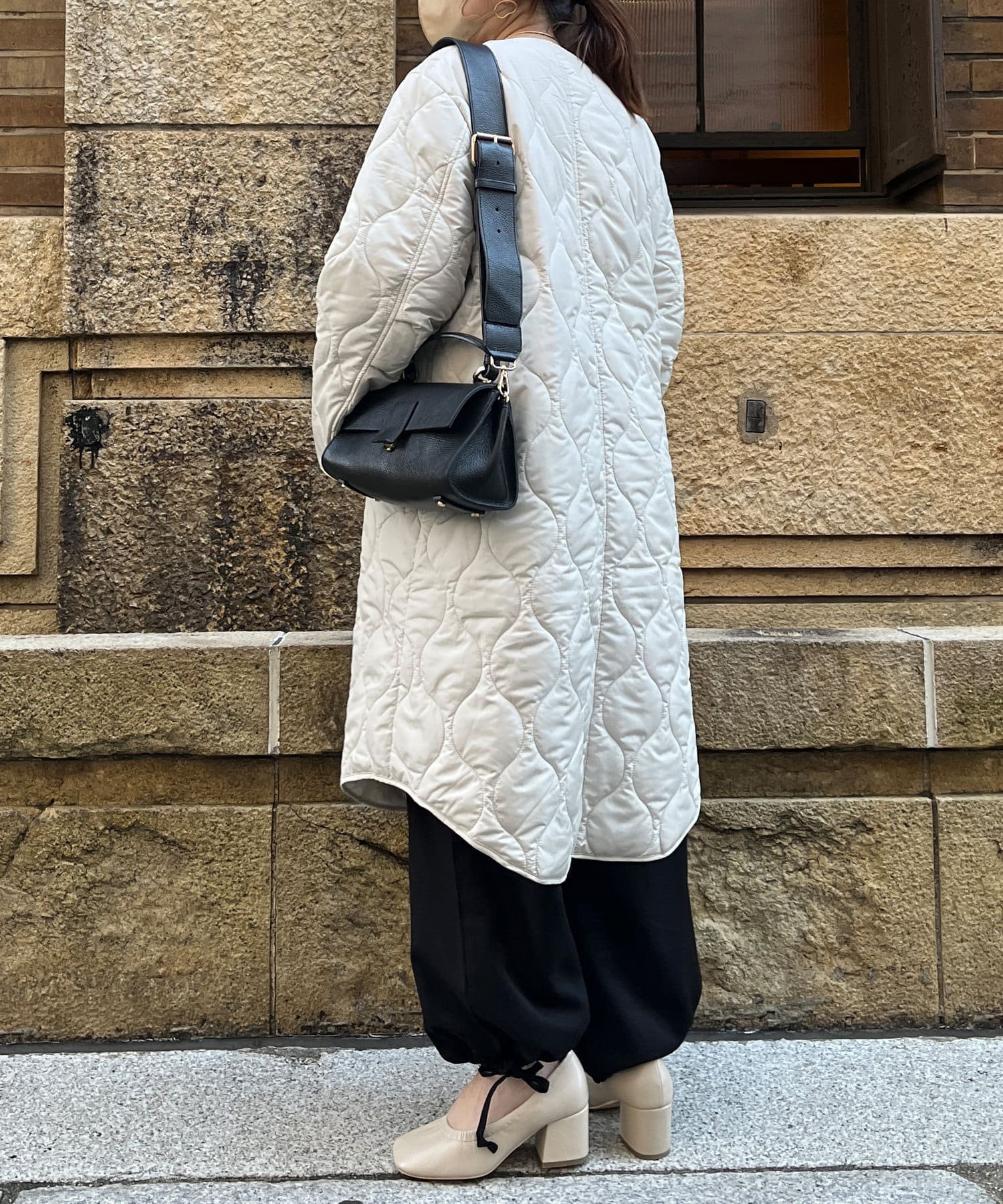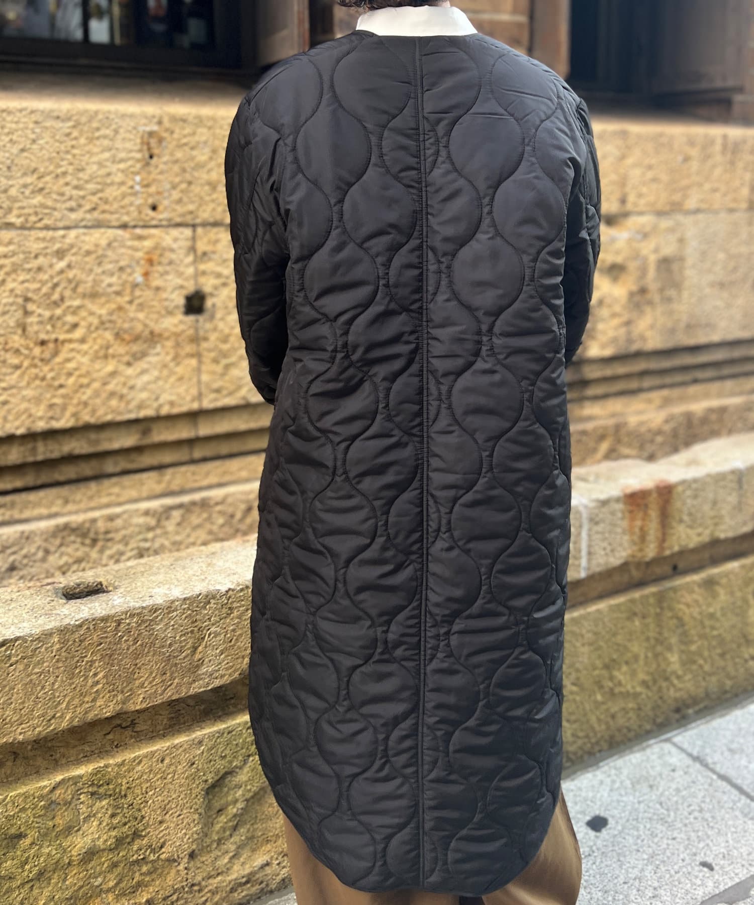 Vネックの衿ですっきりとシルエットのキルティングコートです。