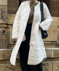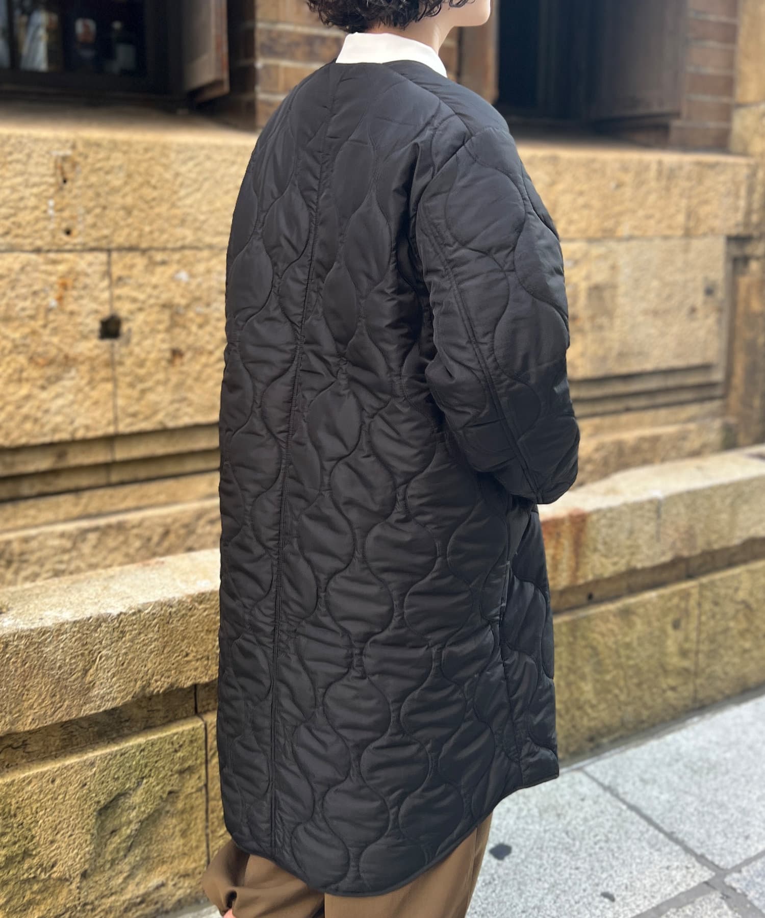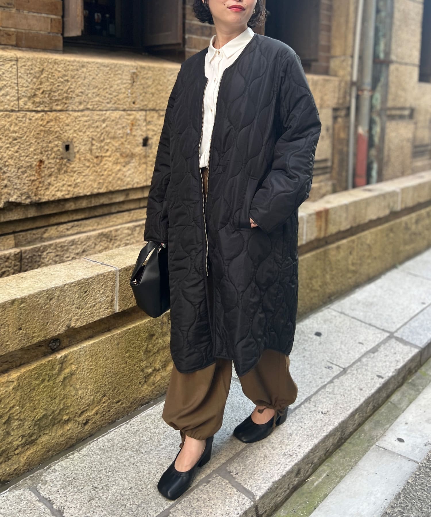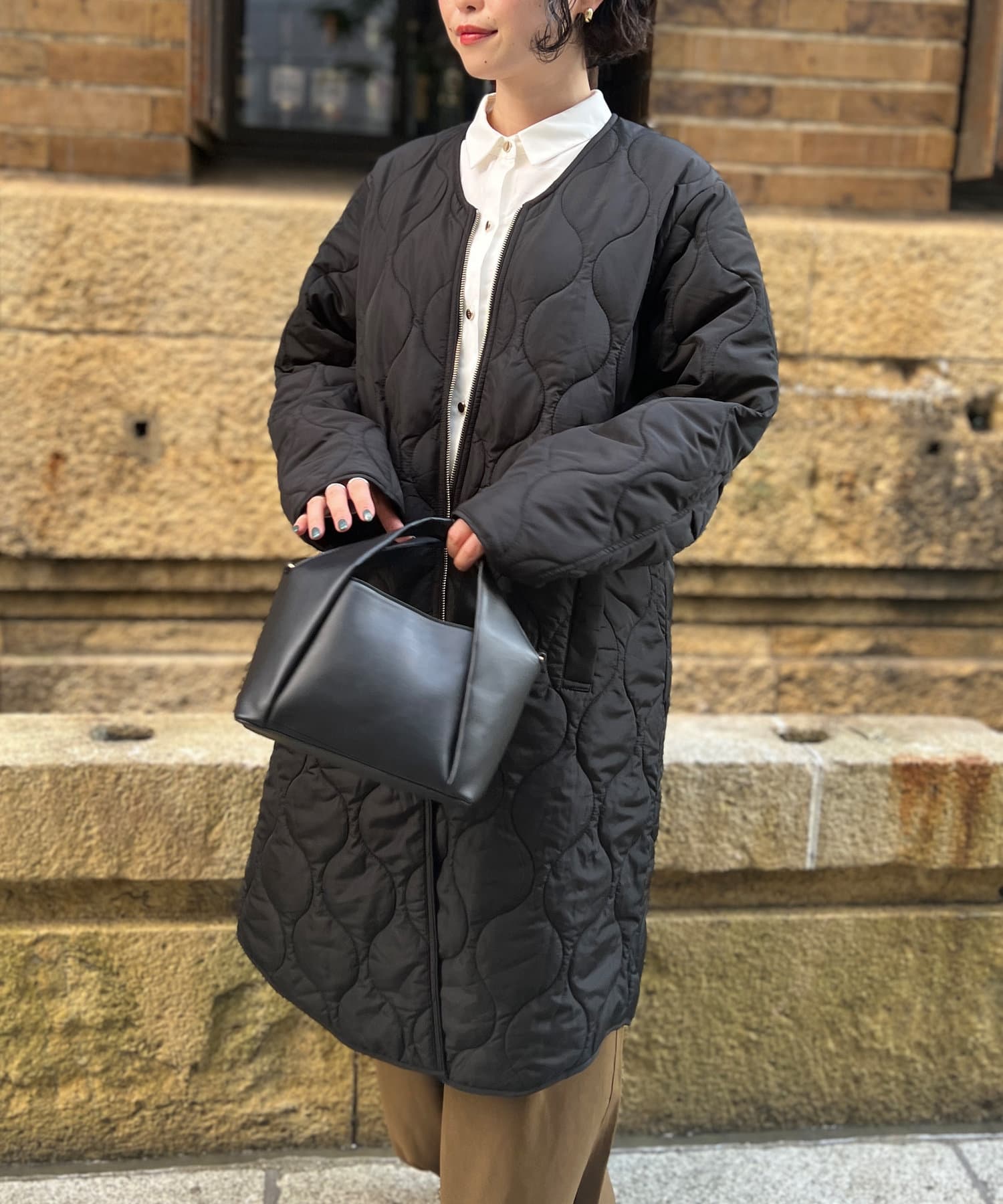 Vネックの衿ですっきりとシルエットのキルティングコートです。