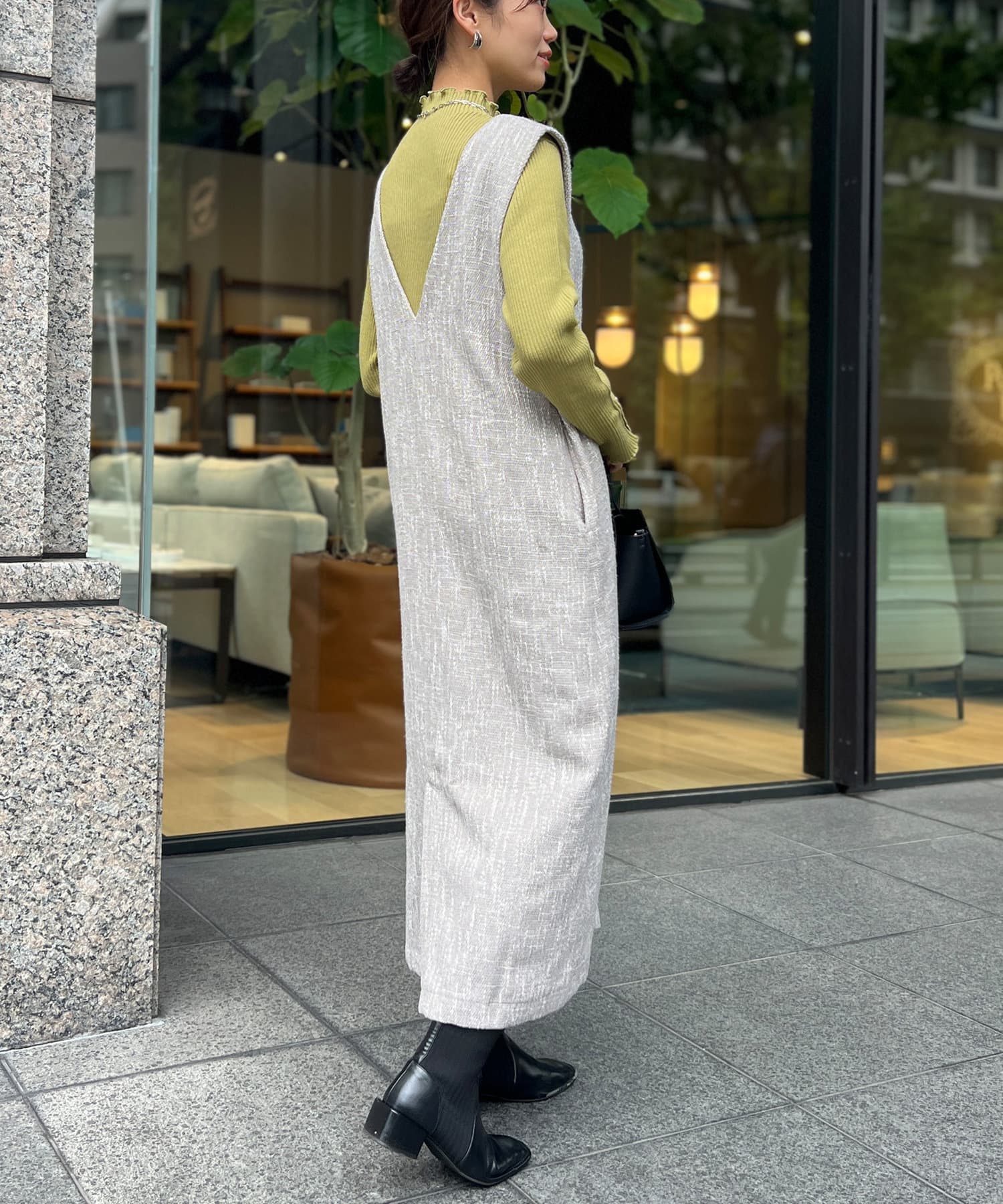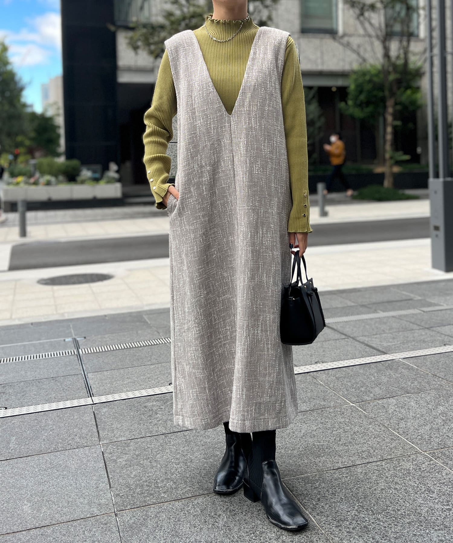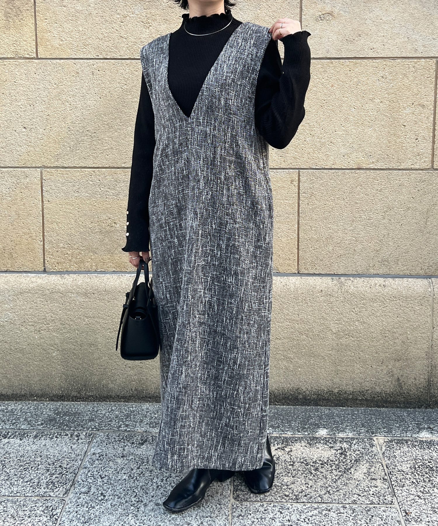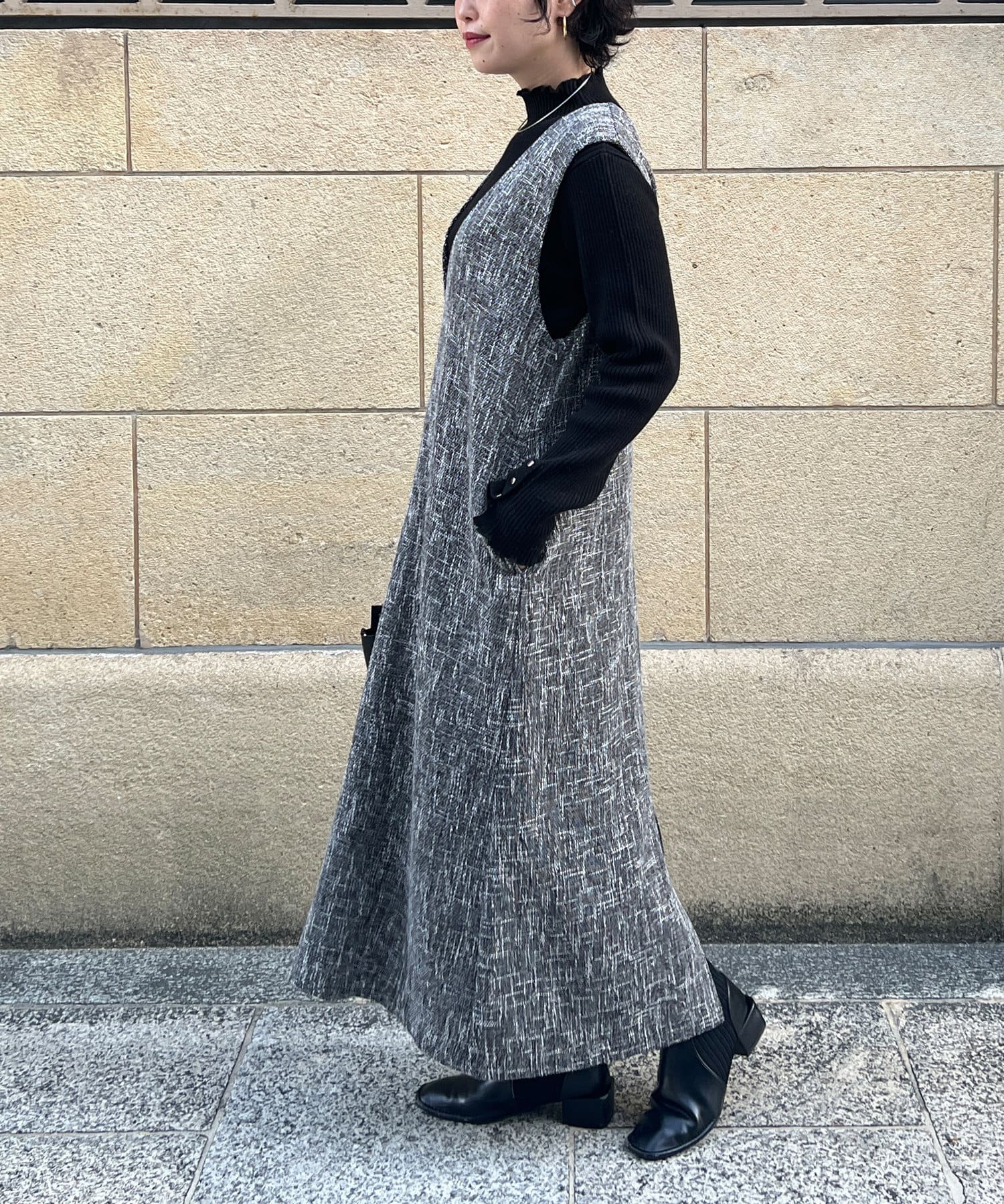 インナー次第で雰囲気に変化を出せるので、春先までロングシーズン着回しできるジャンスカです。