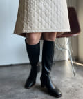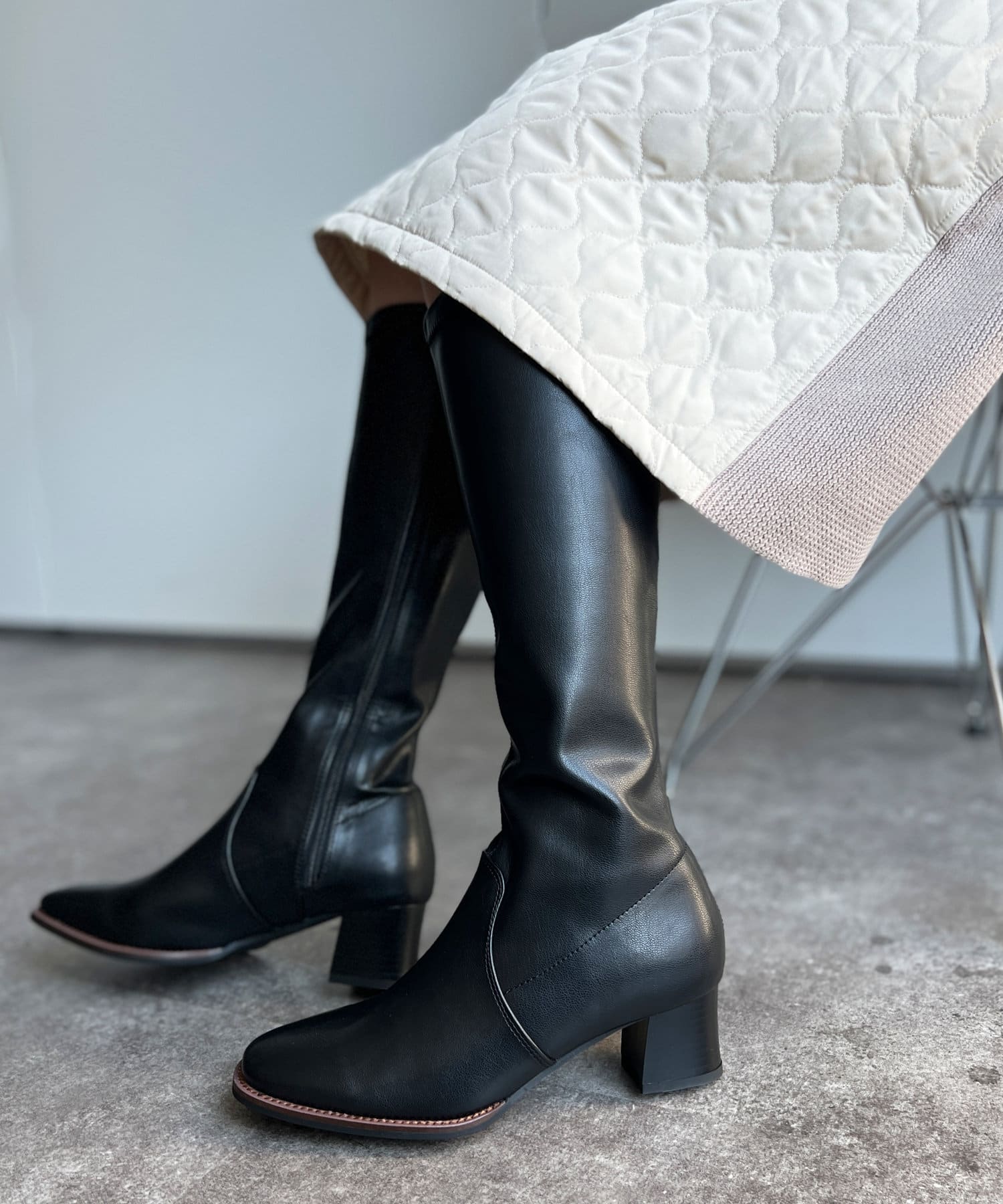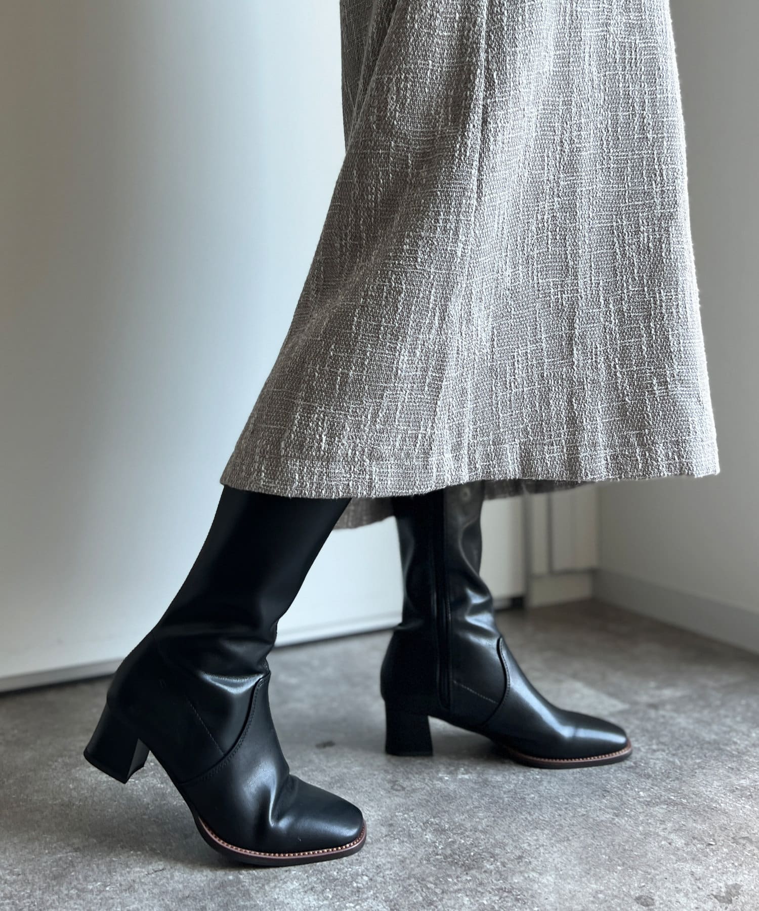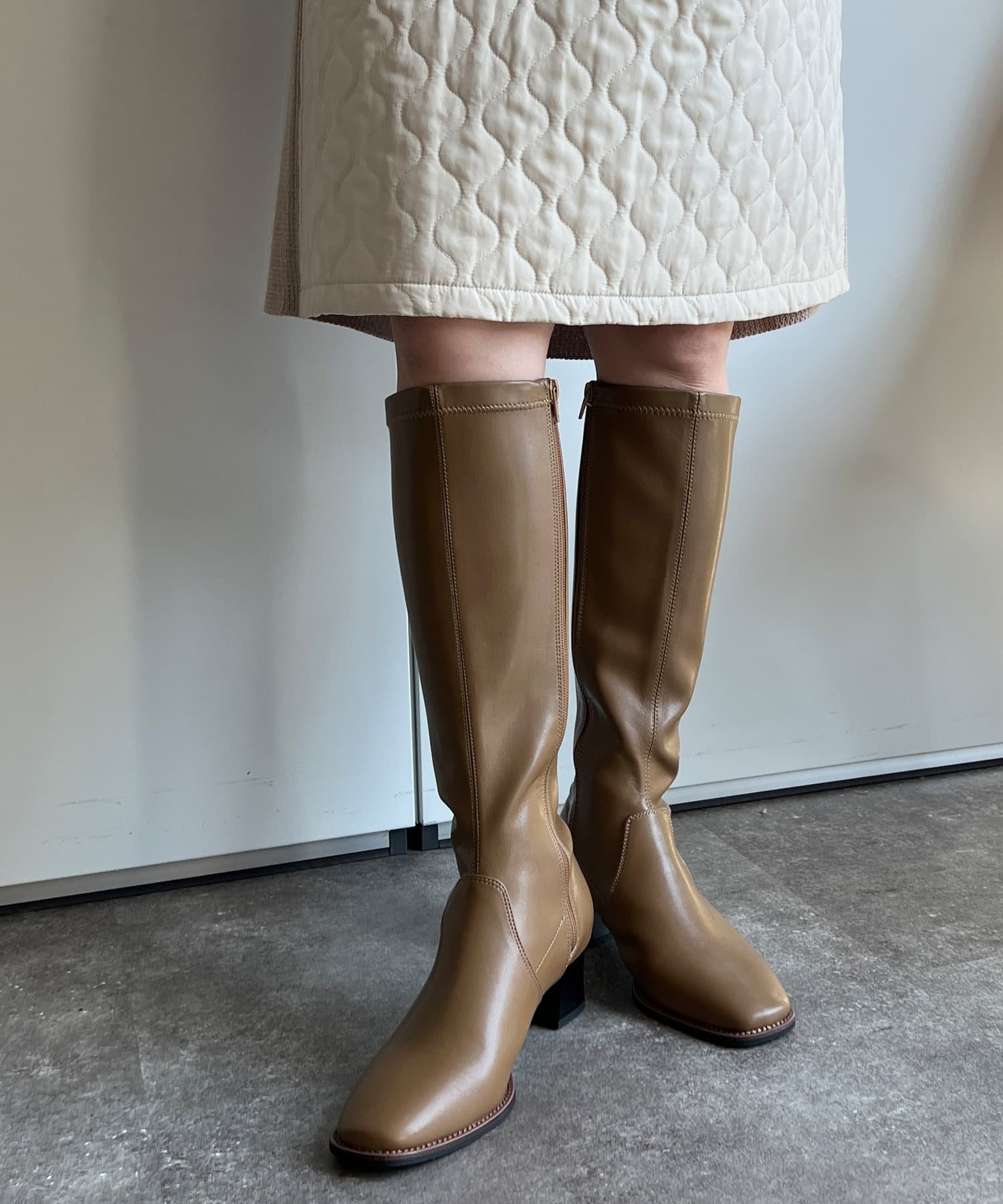 きれいめ見えするスクエアトゥと程よく高さのあるヒールのロングブーツです。