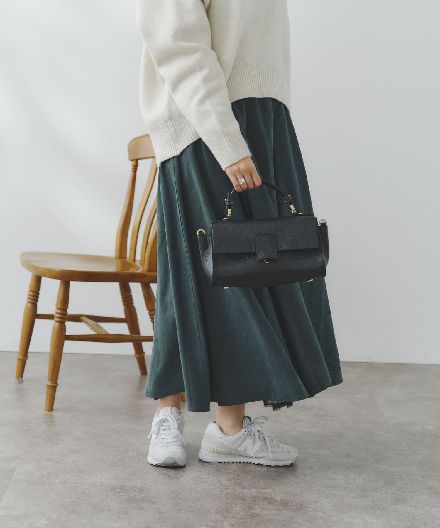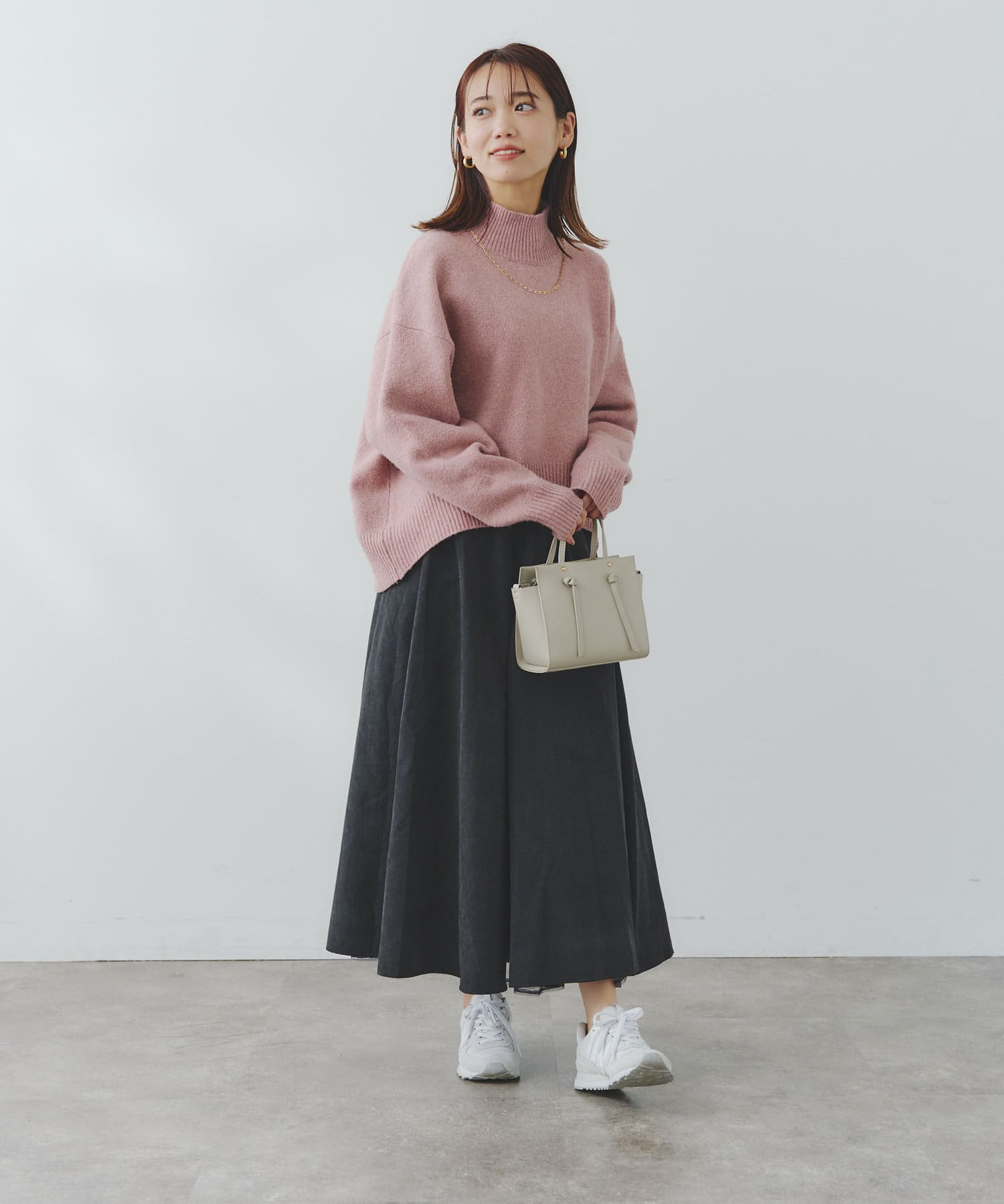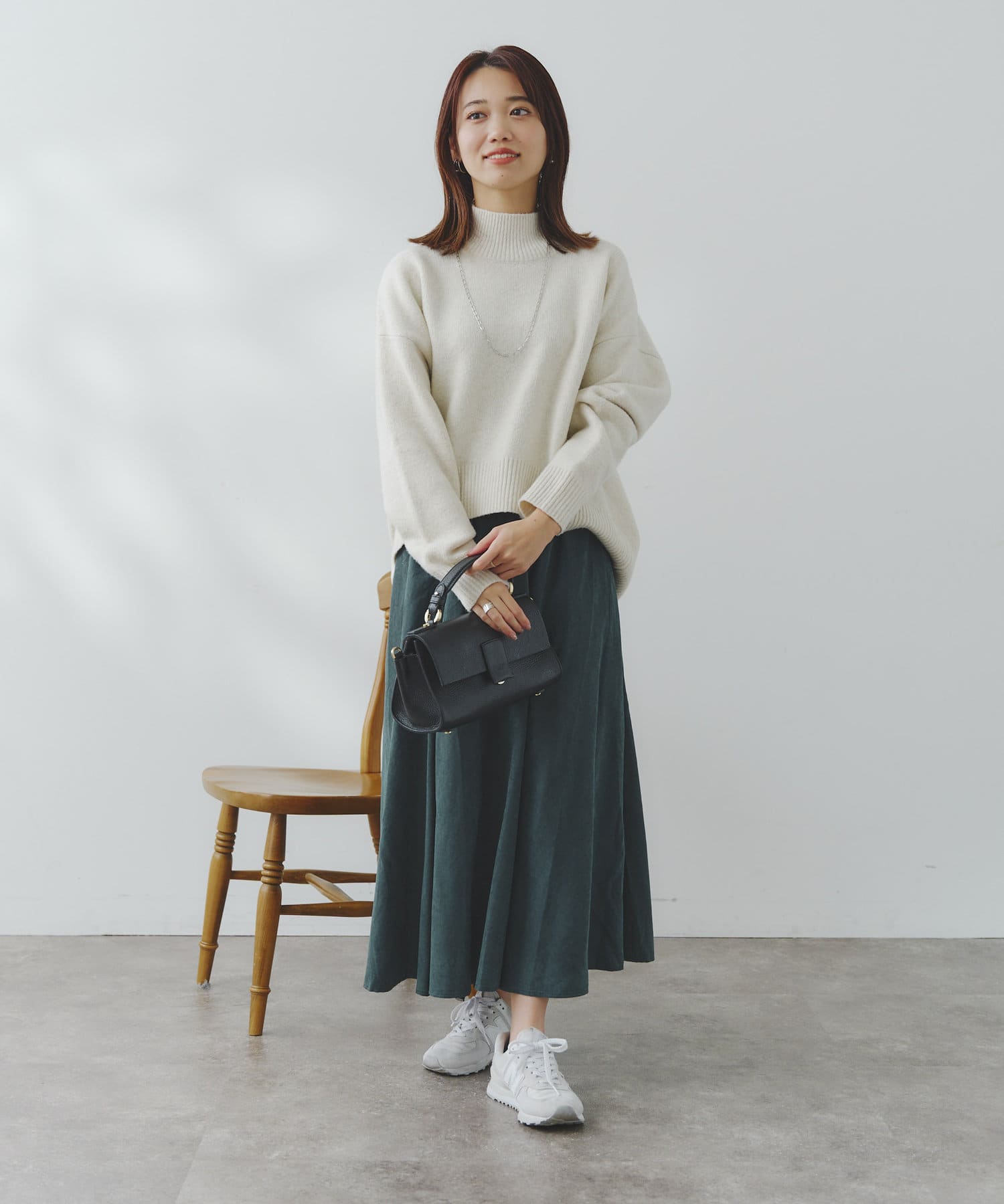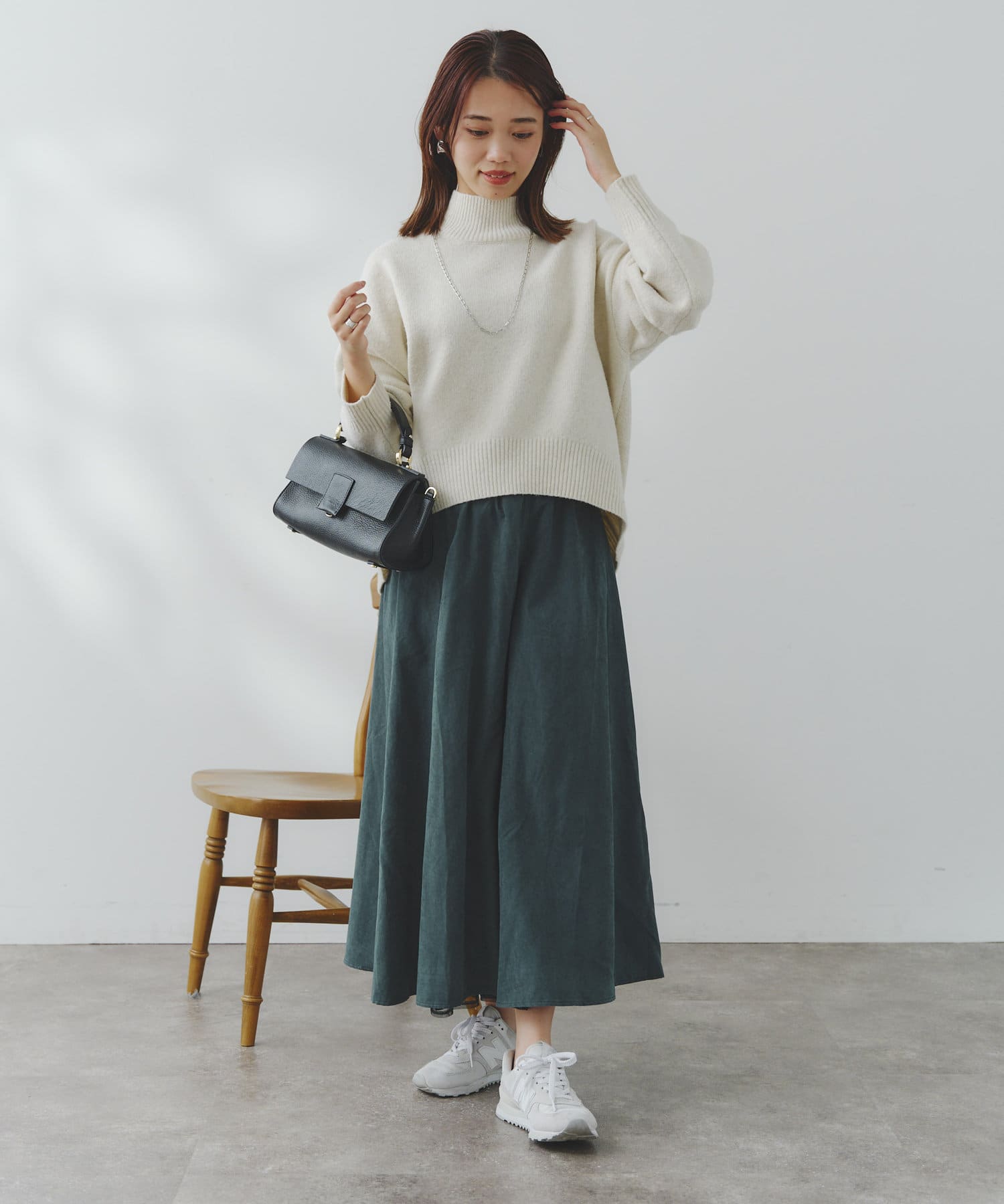 ふんわりとした広がりが軽やかな印象に見せてくれるので、ニットと合わせた時も重たくならず冬ファッションをフェミニンに彩ってくれます。