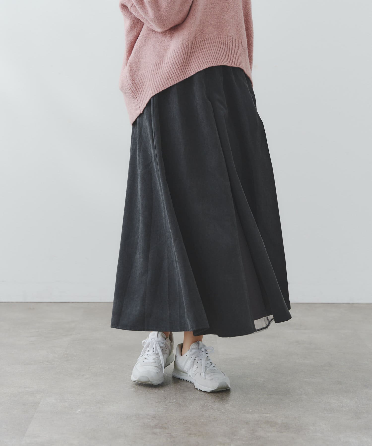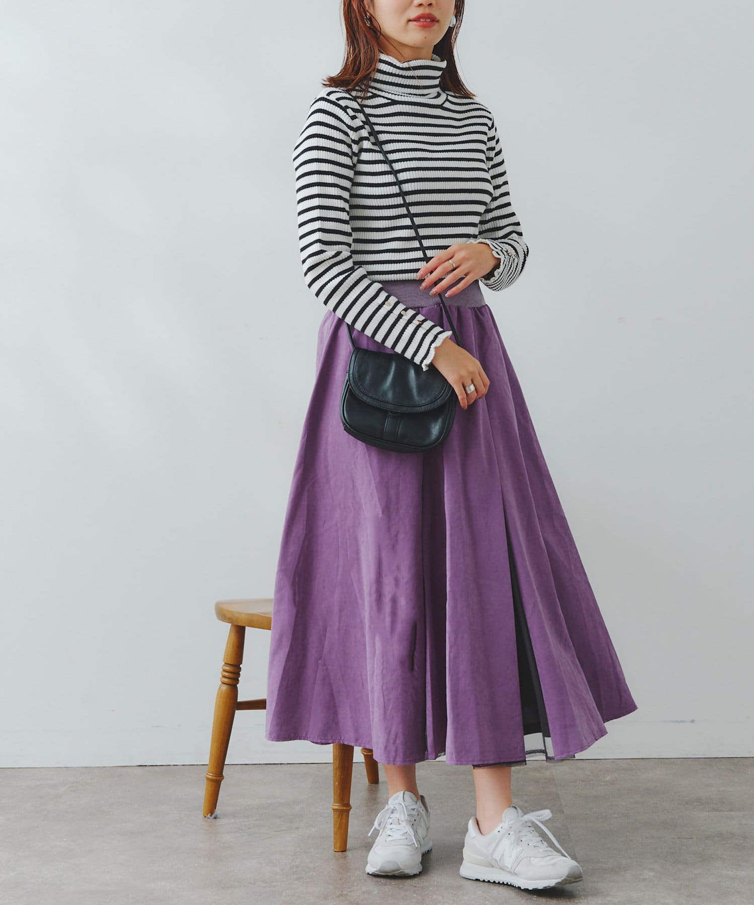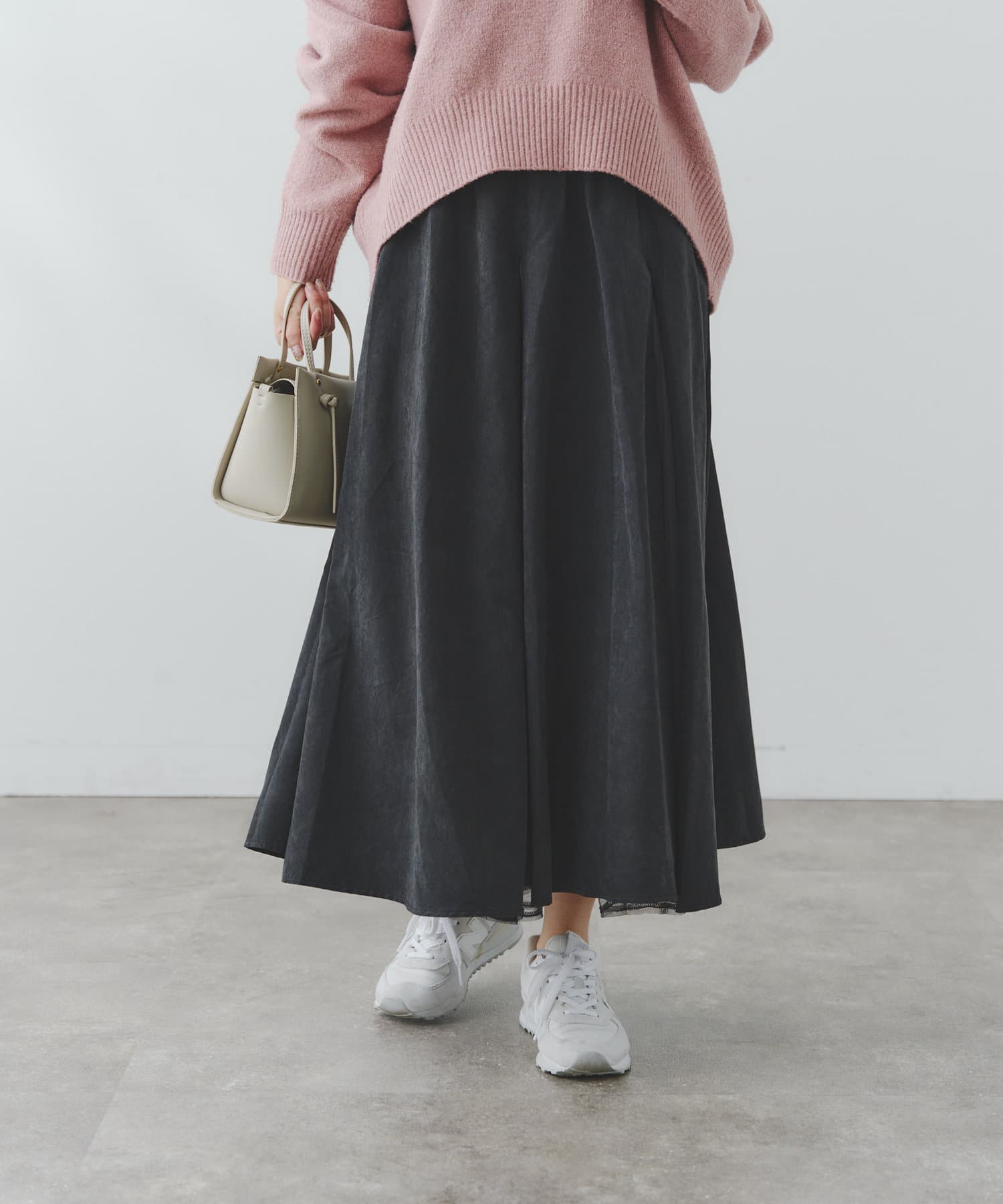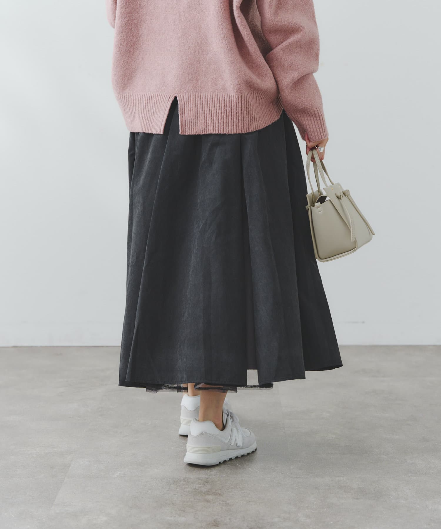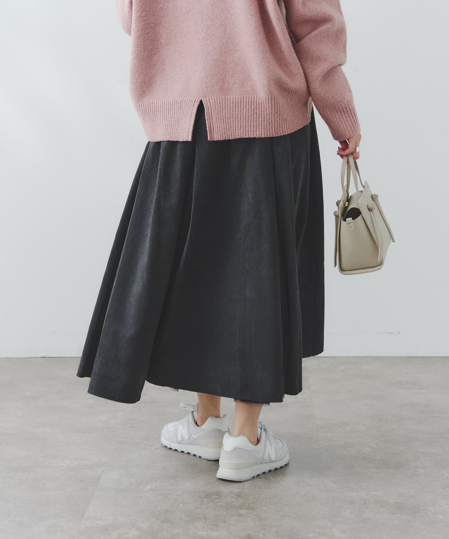 ふんわりとした広がりが軽やかな印象に見せてくれるので、ニットと合わせた時も重たくならず冬ファッションをフェミニンに彩ってくれます。