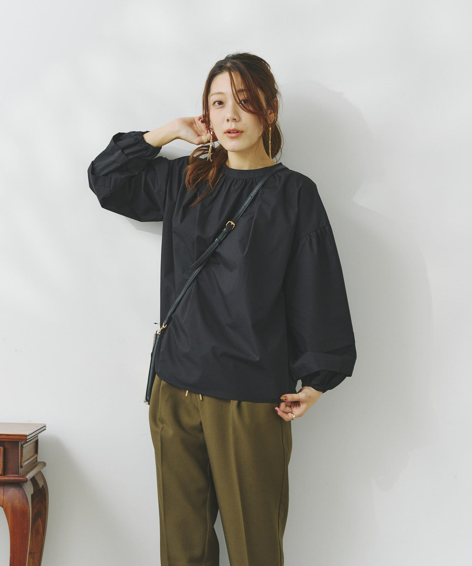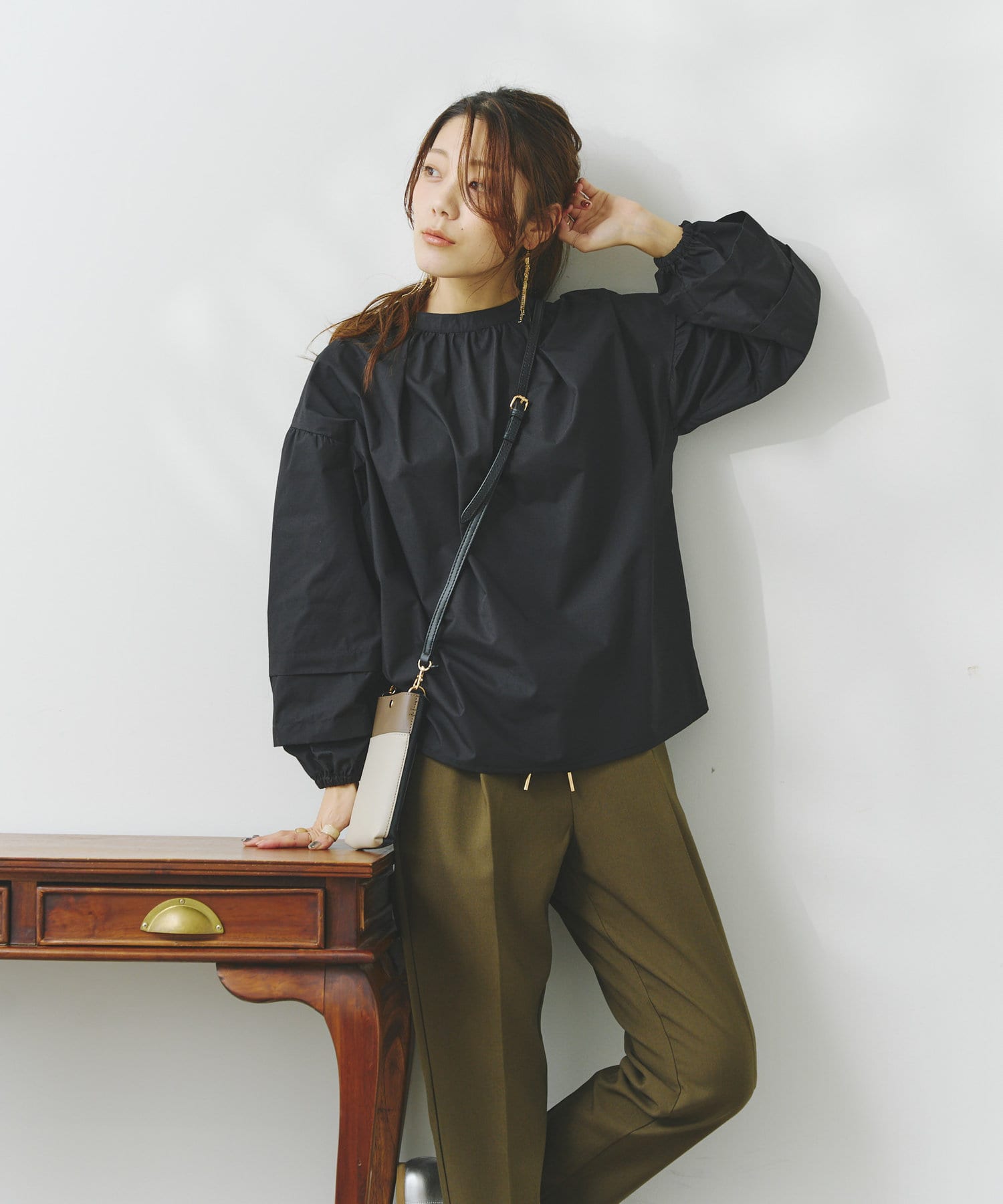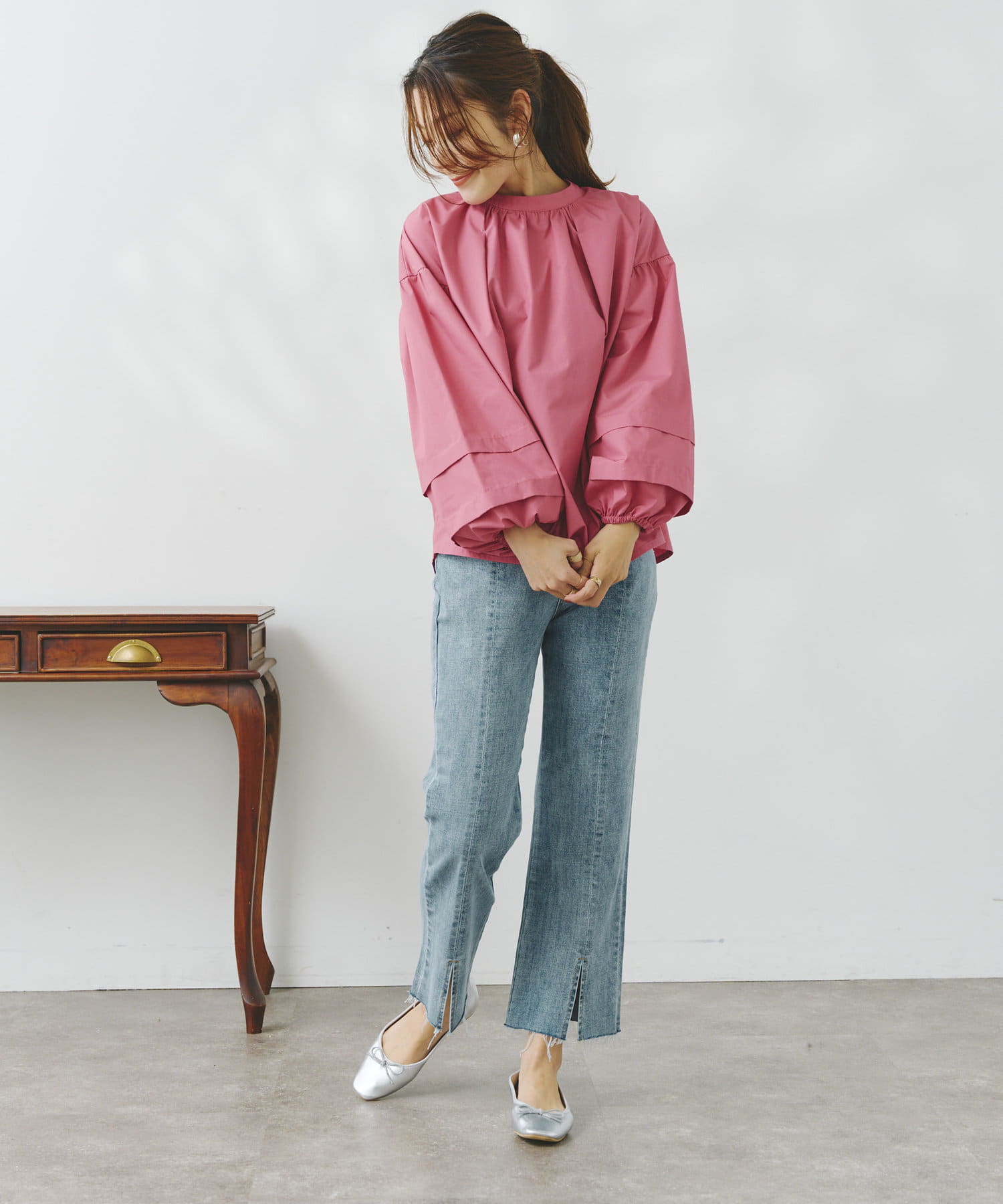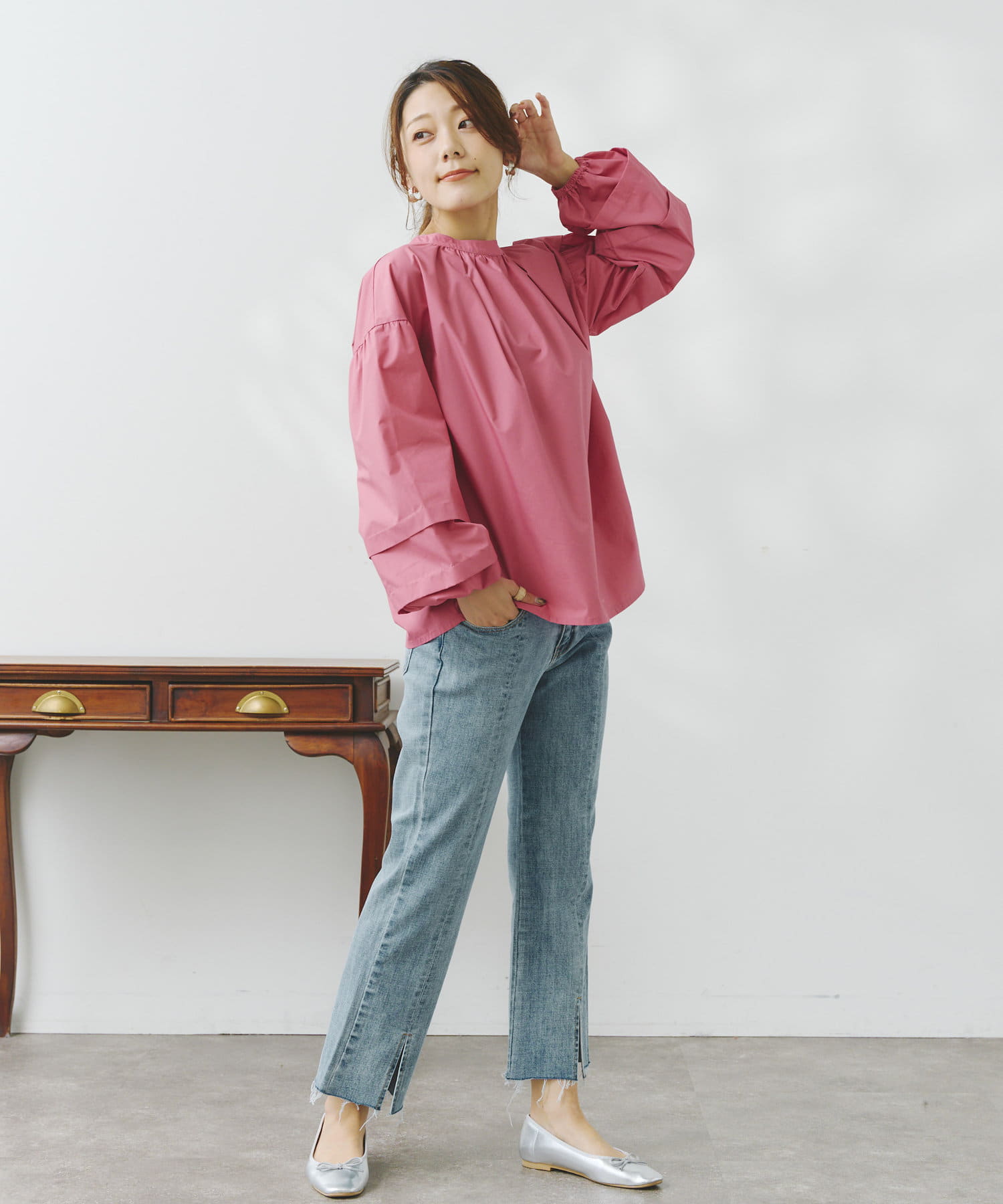 袖部分に入った2段のタックがシンプルなシルエットながらフェミニンさとこなれ感を出してくれます。
