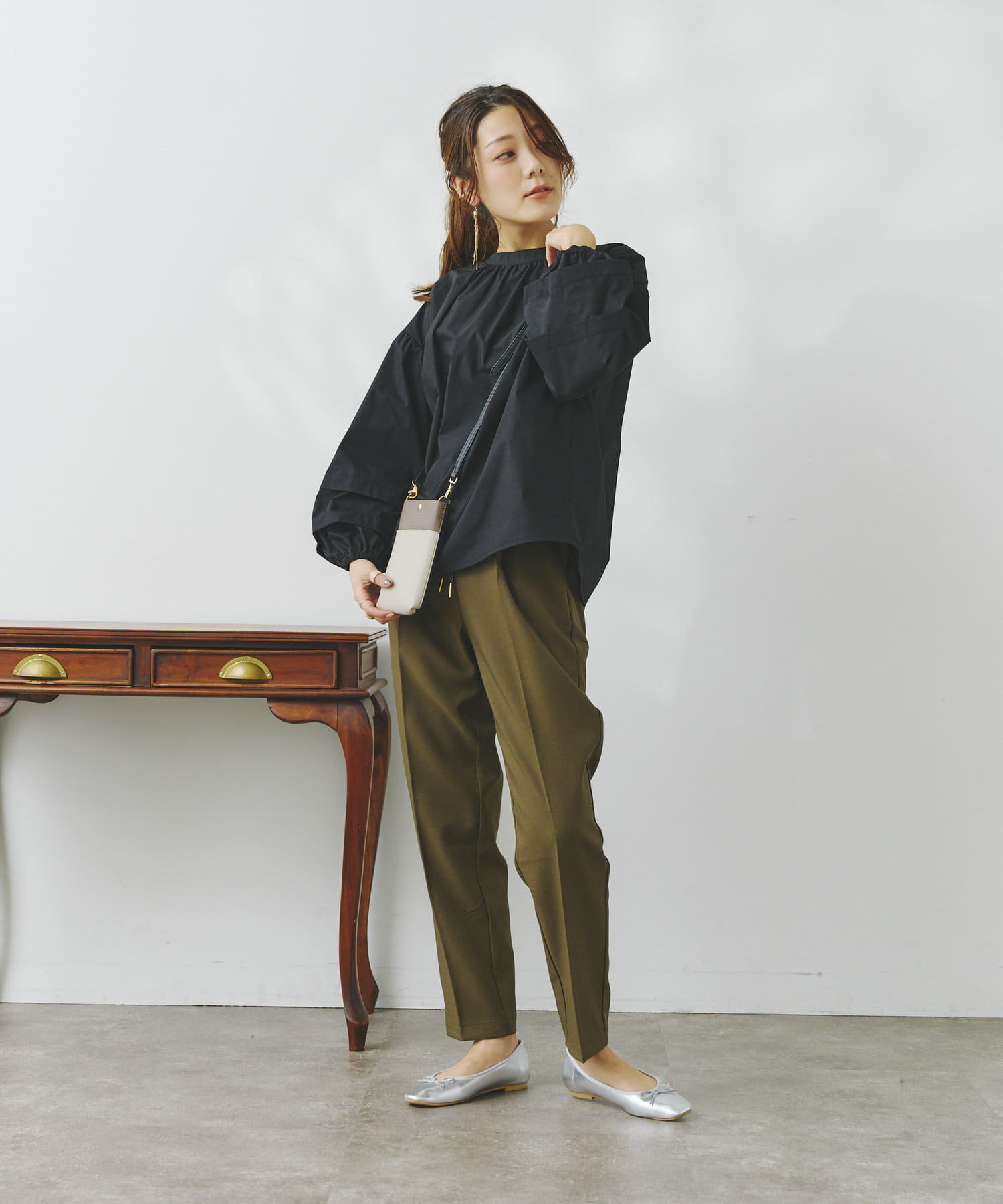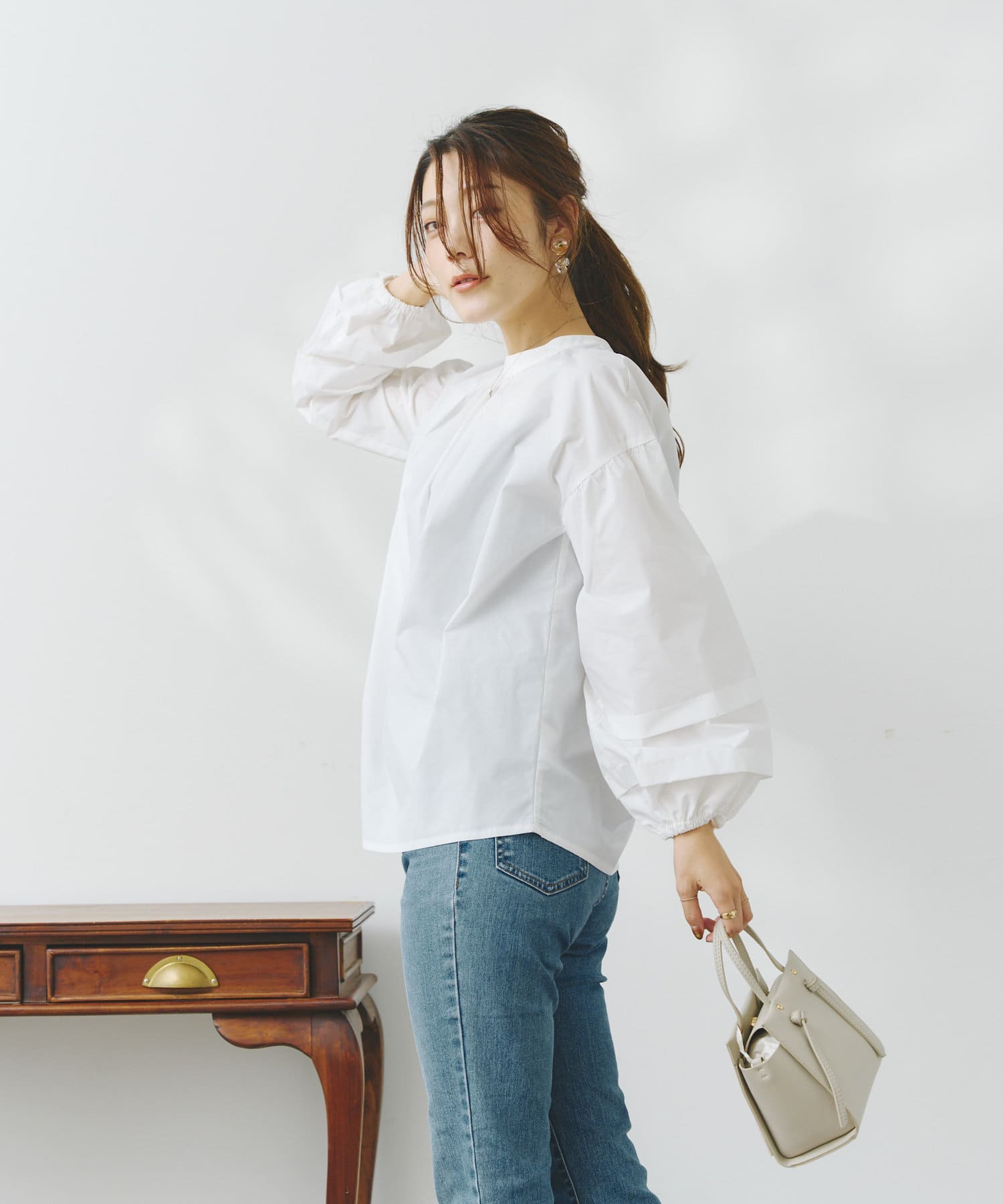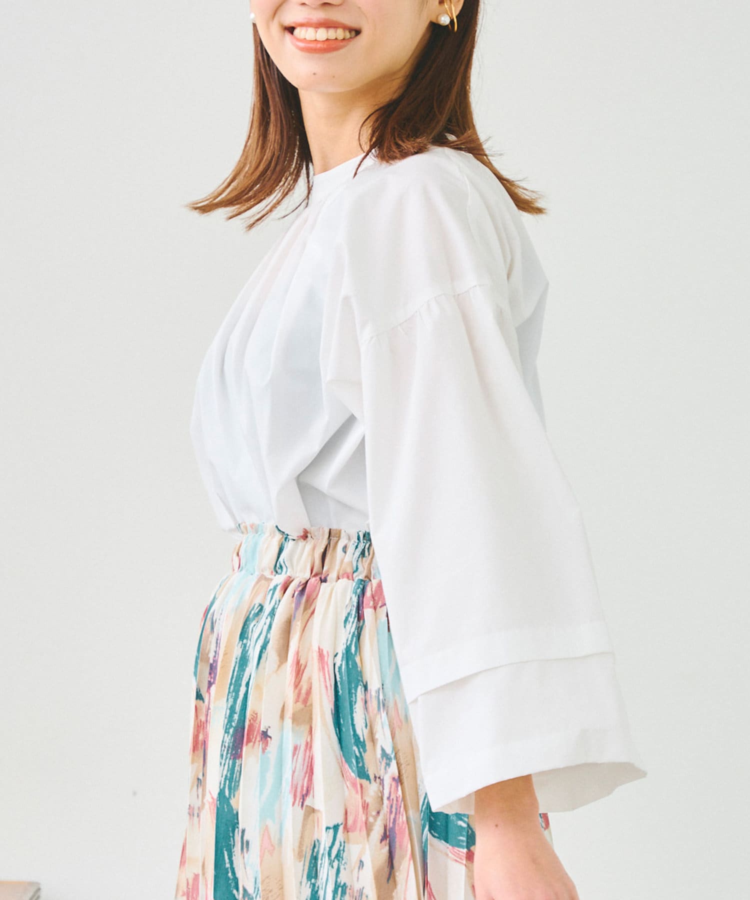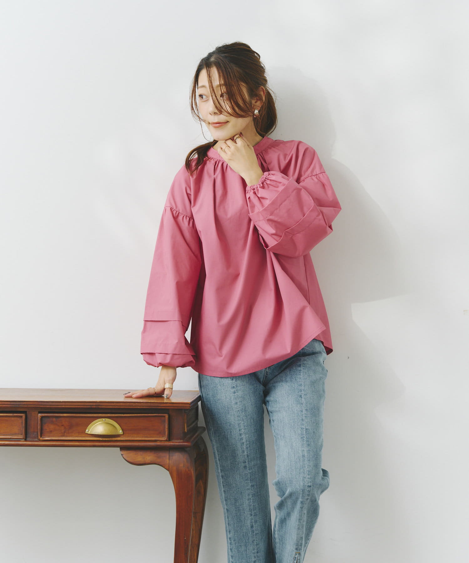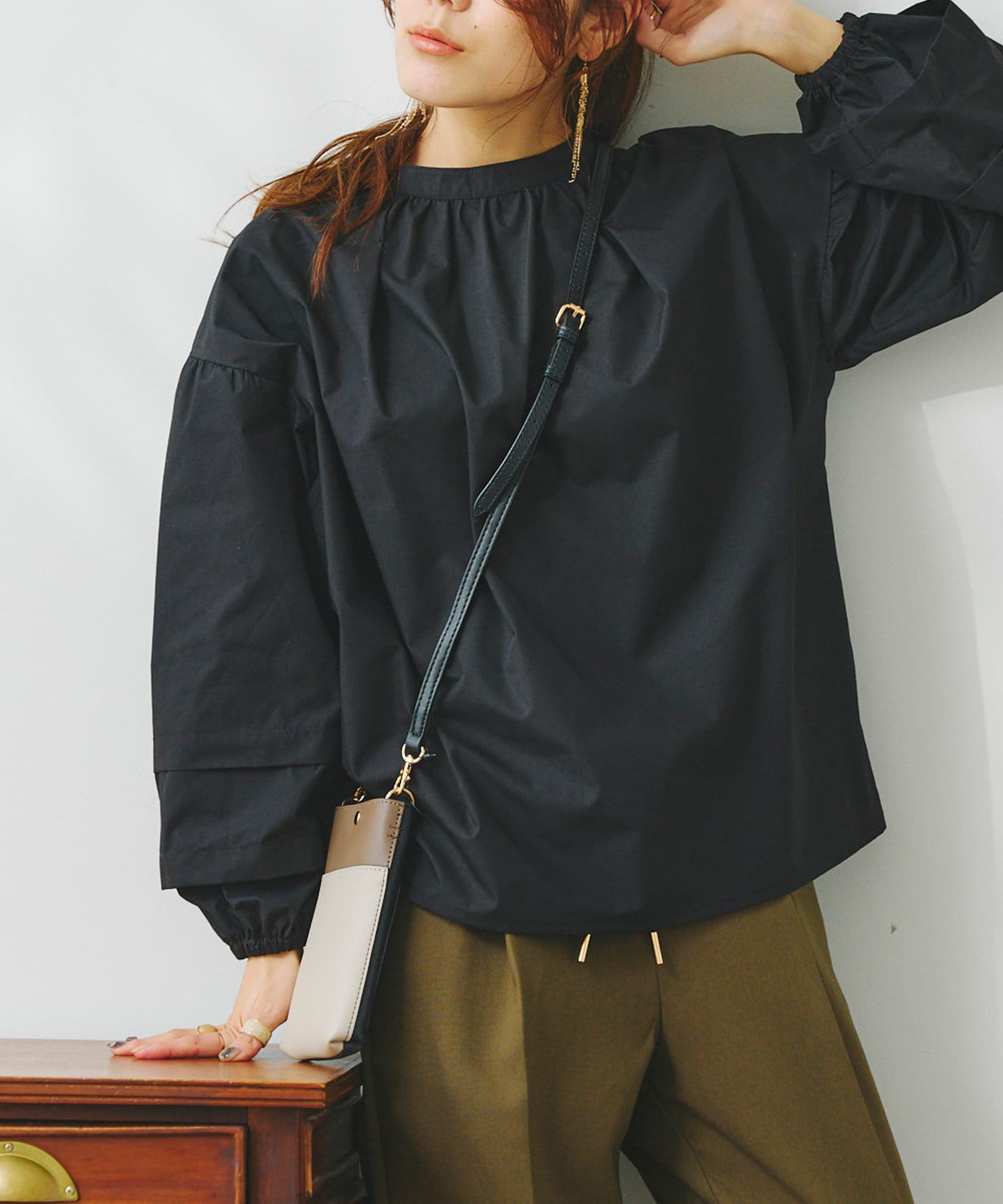 袖部分に入った2段のタックがシンプルなシルエットながらフェミニンさとこなれ感を出してくれます。