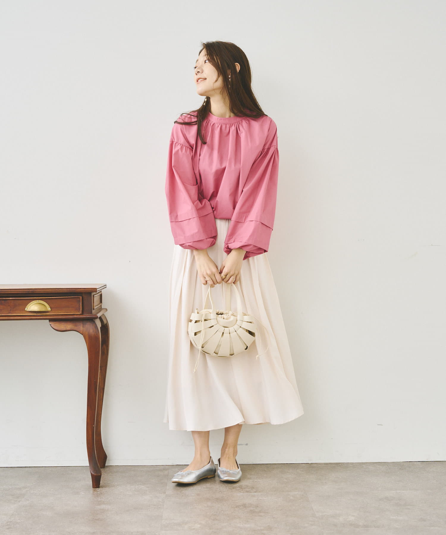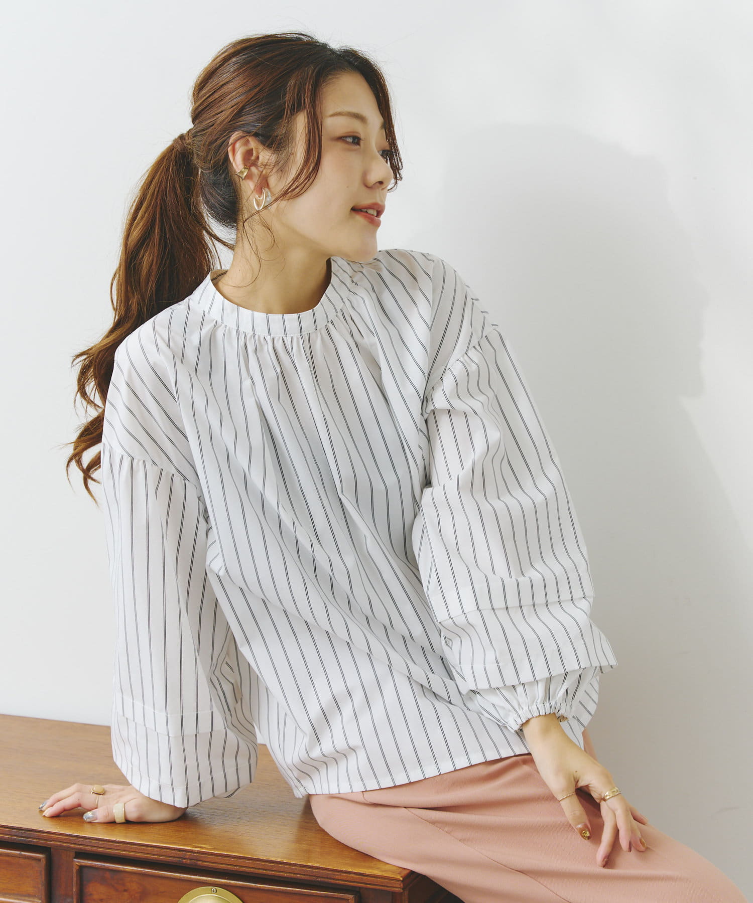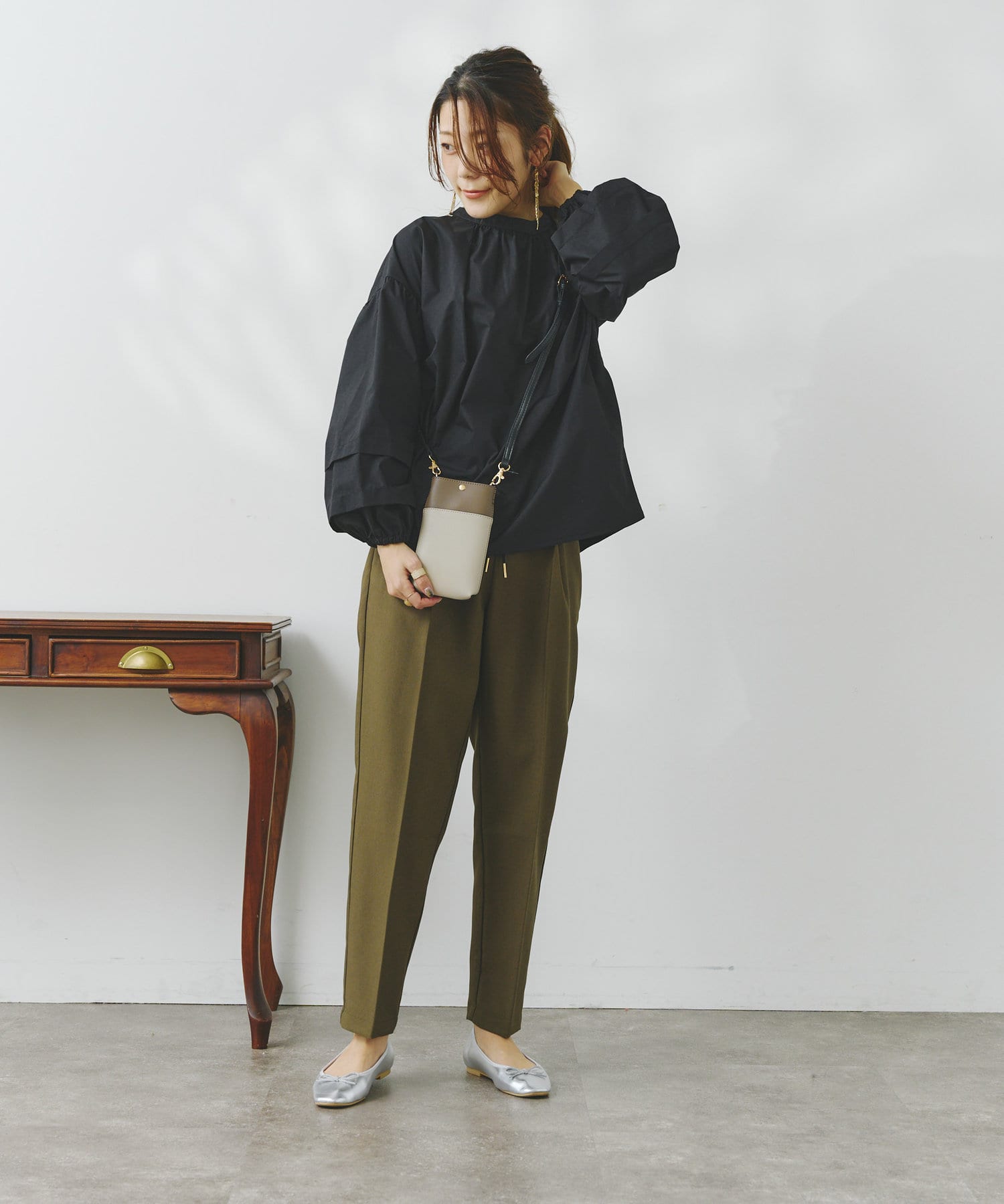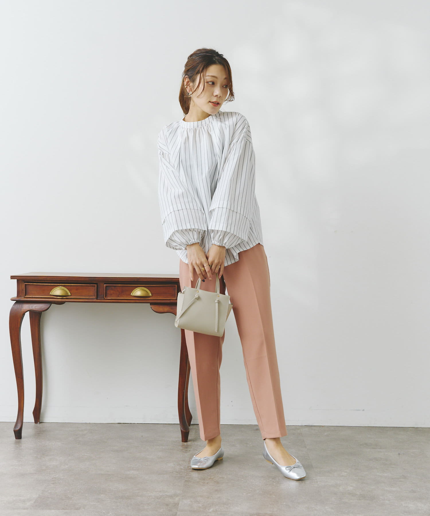袖部分に入った2段のタックがシンプルなシルエットながらフェミニンさとこなれ感を出してくれます。