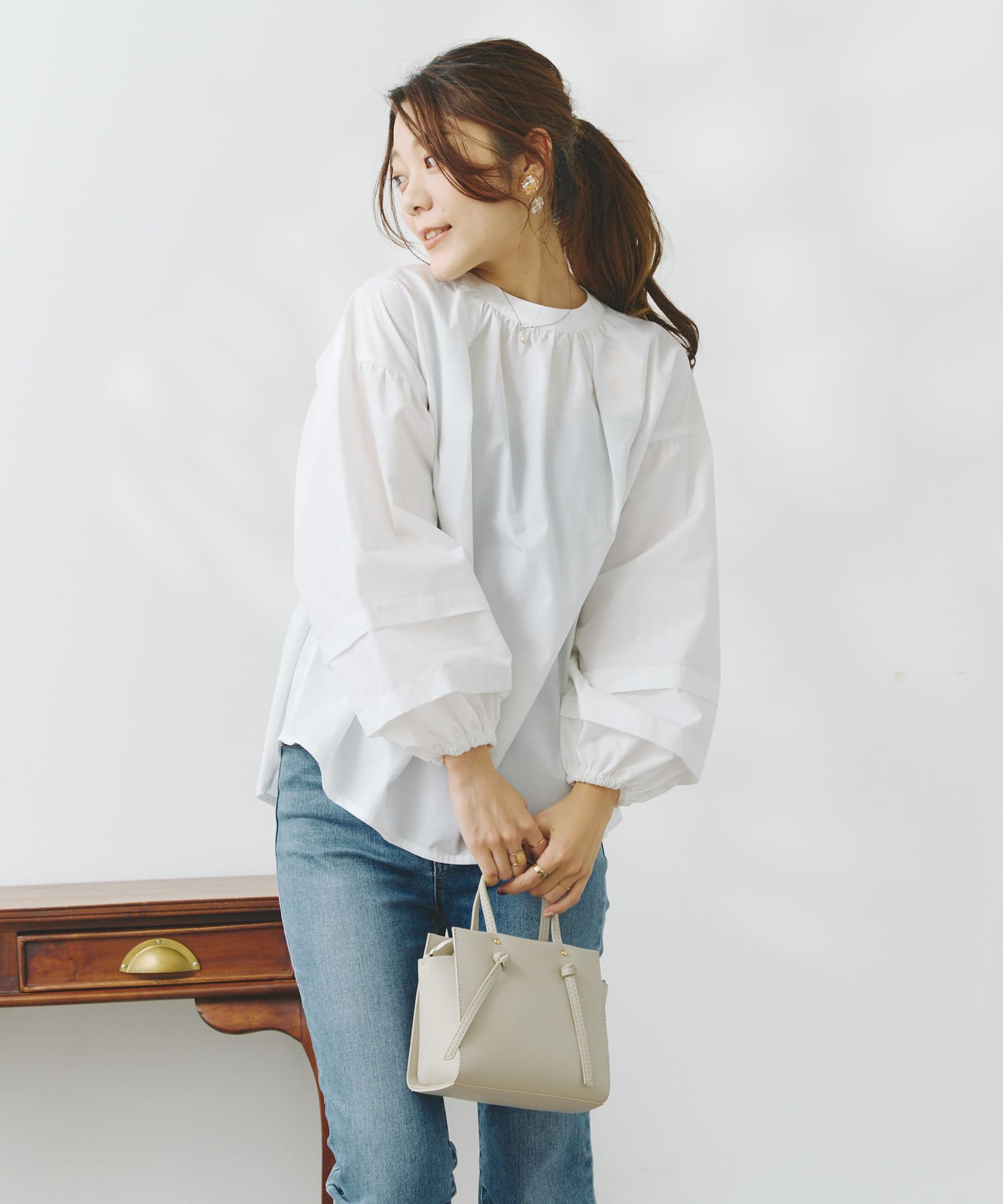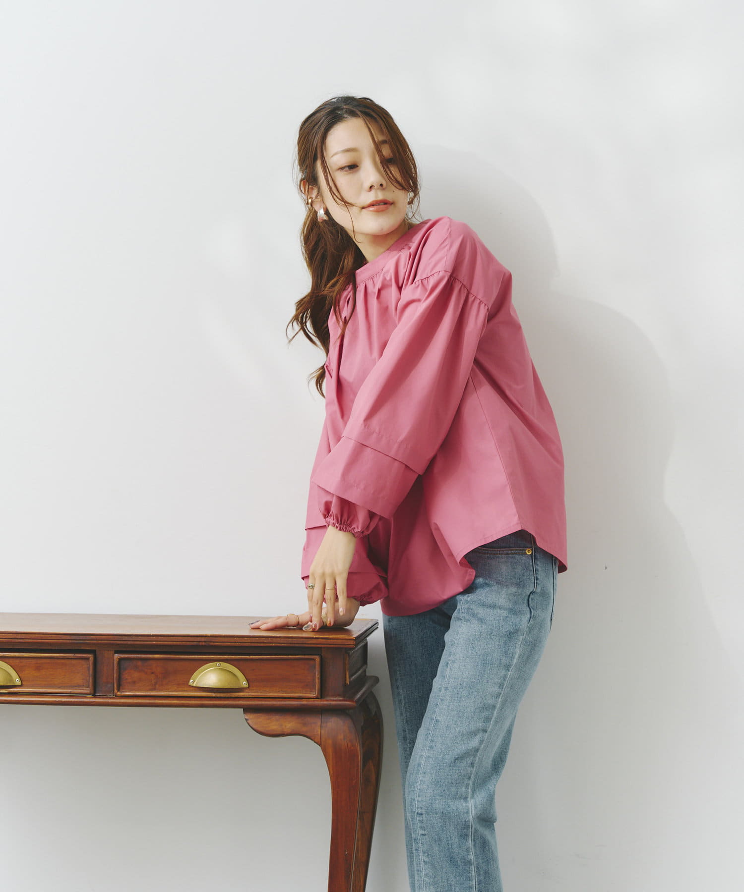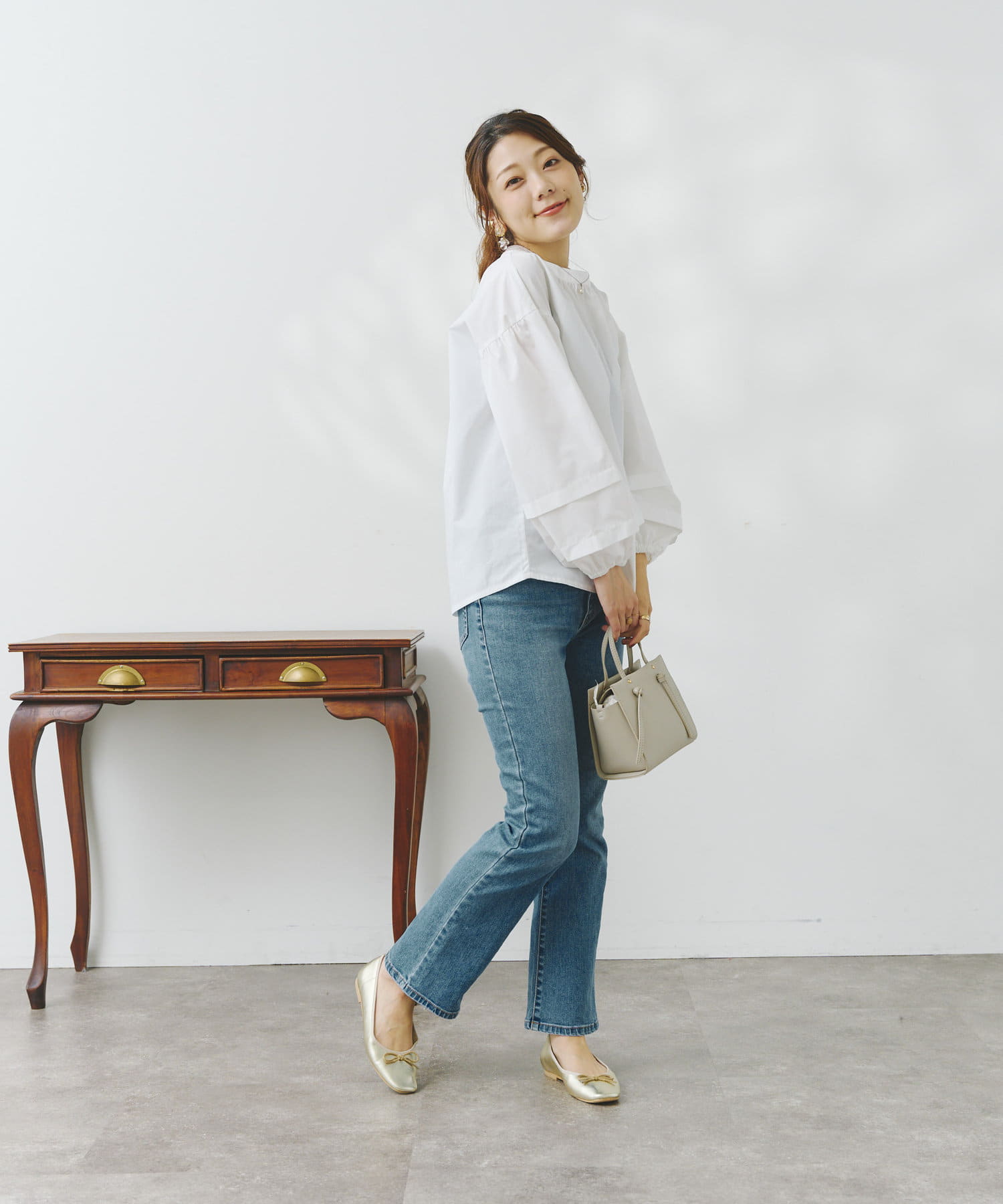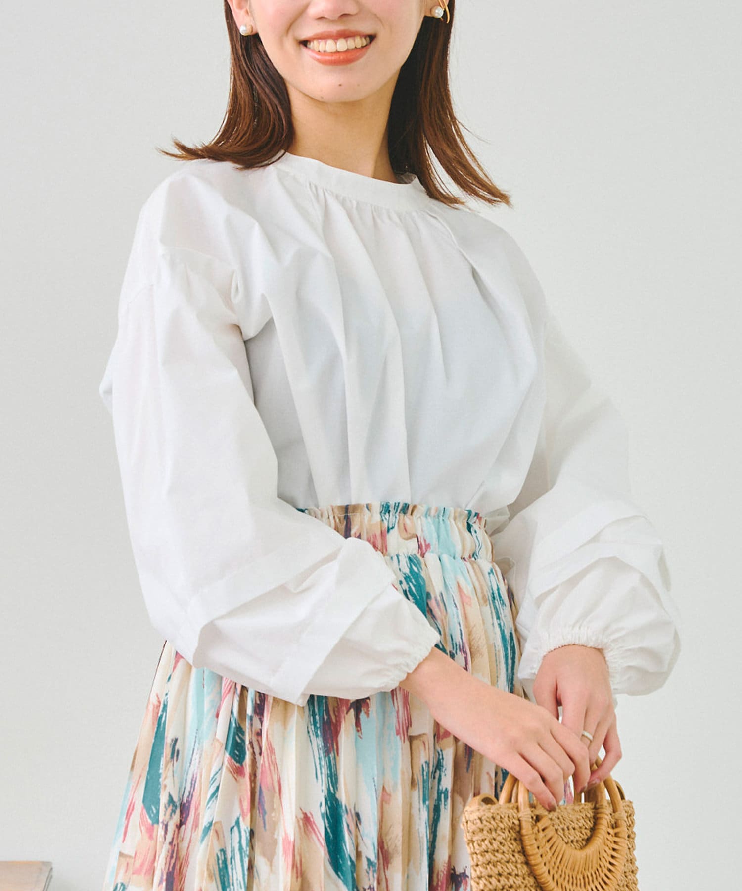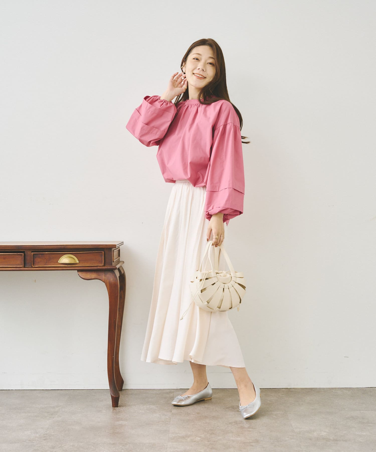 袖部分に入った2段のタックがシンプルなシルエットながらフェミニンさとこなれ感を出してくれます。