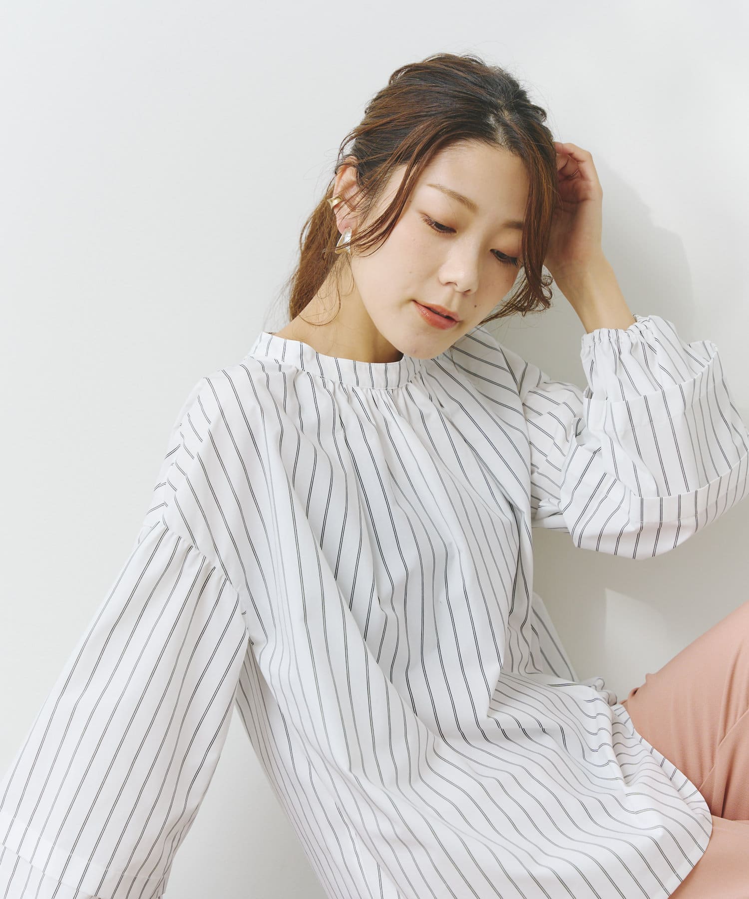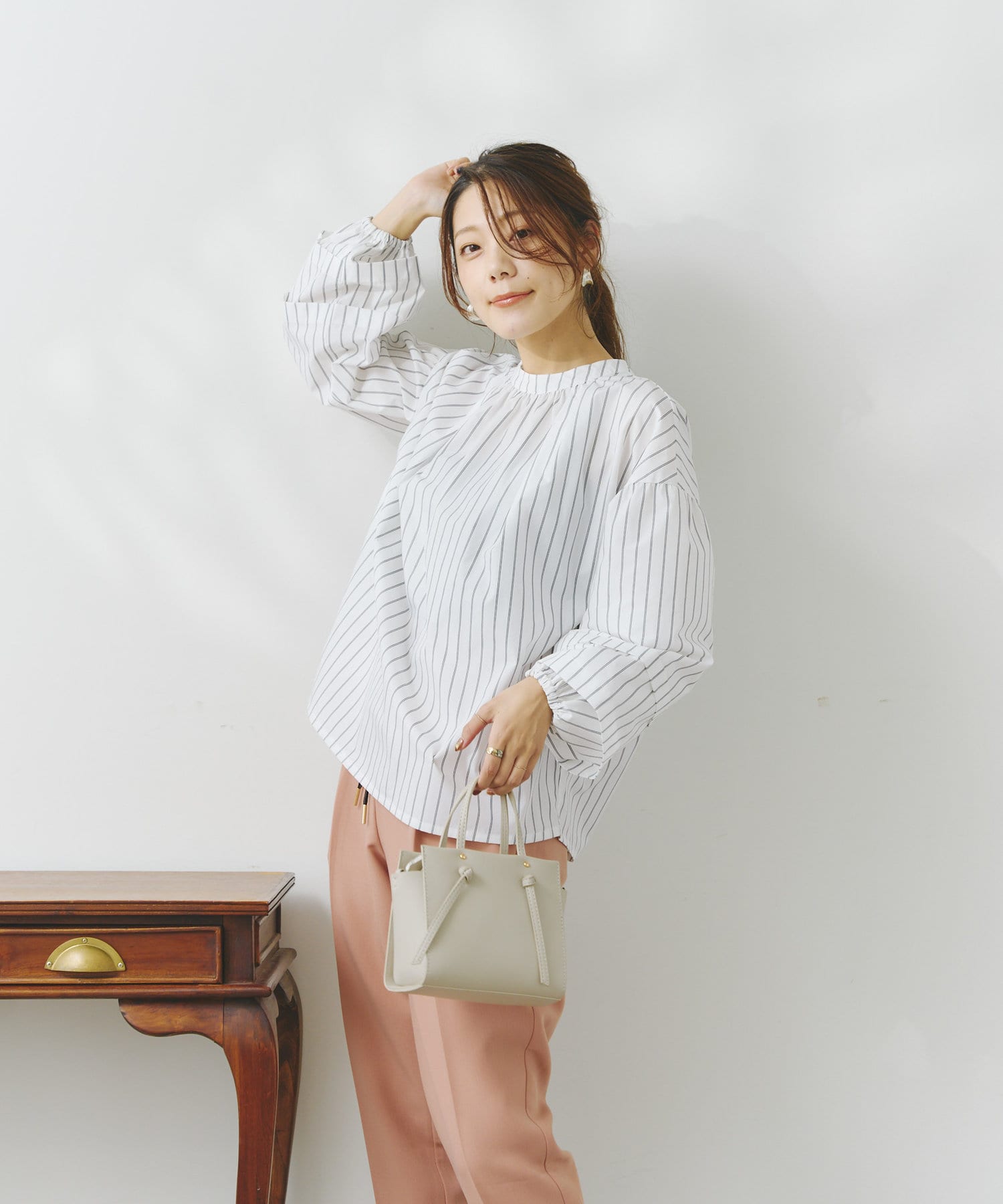 スタンドネックのフェミニンブラウス