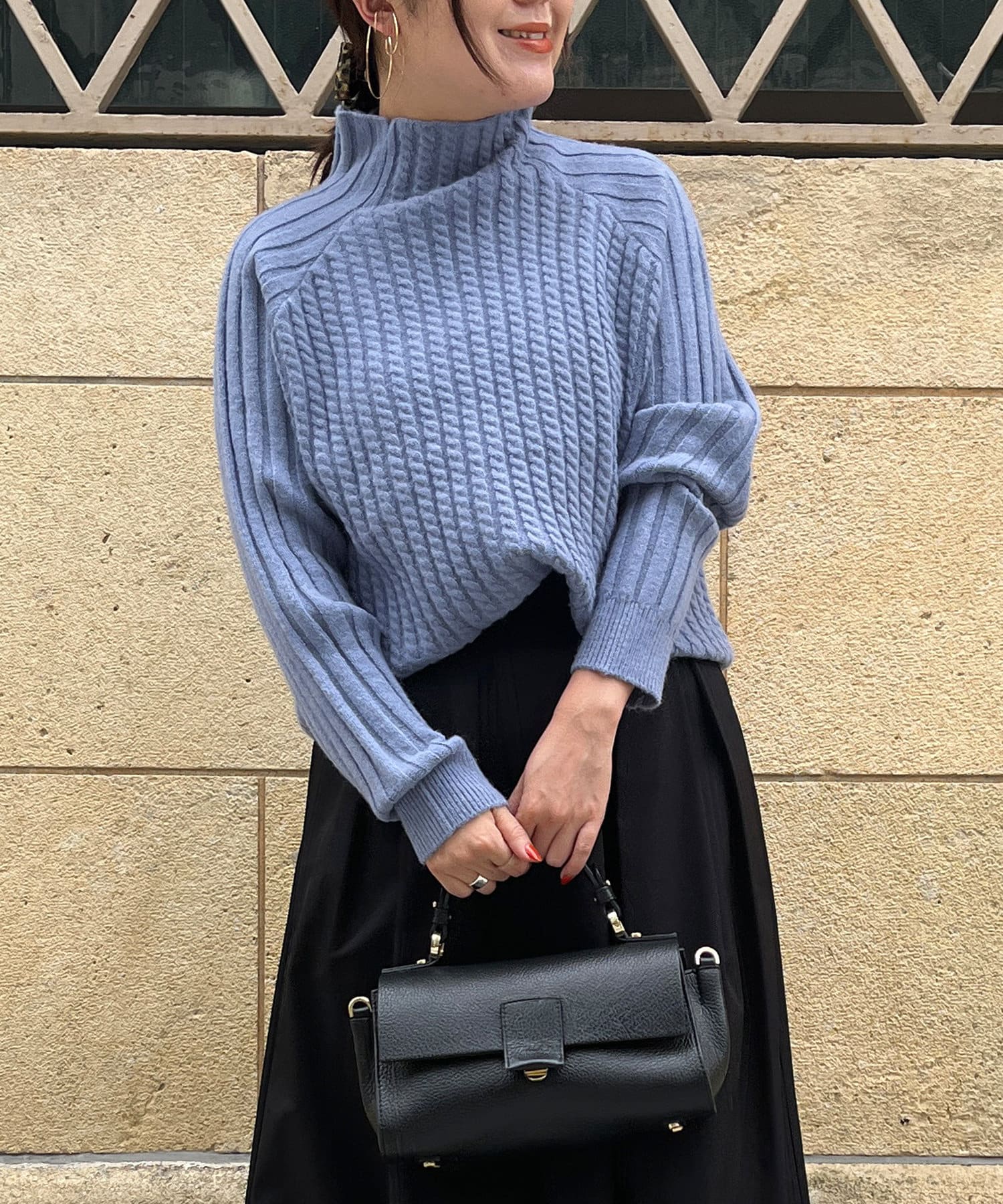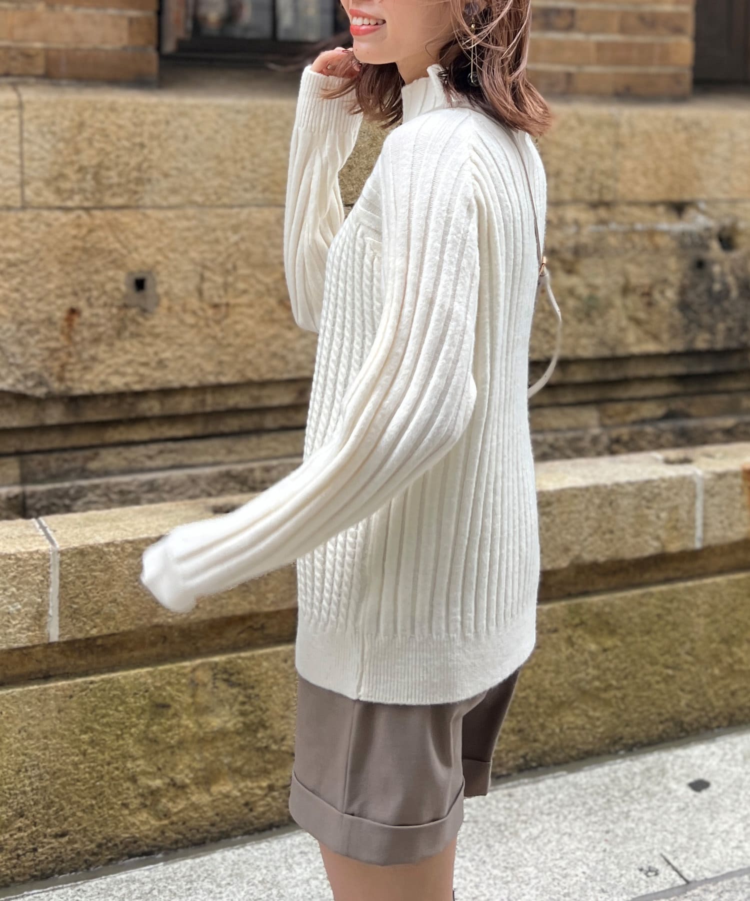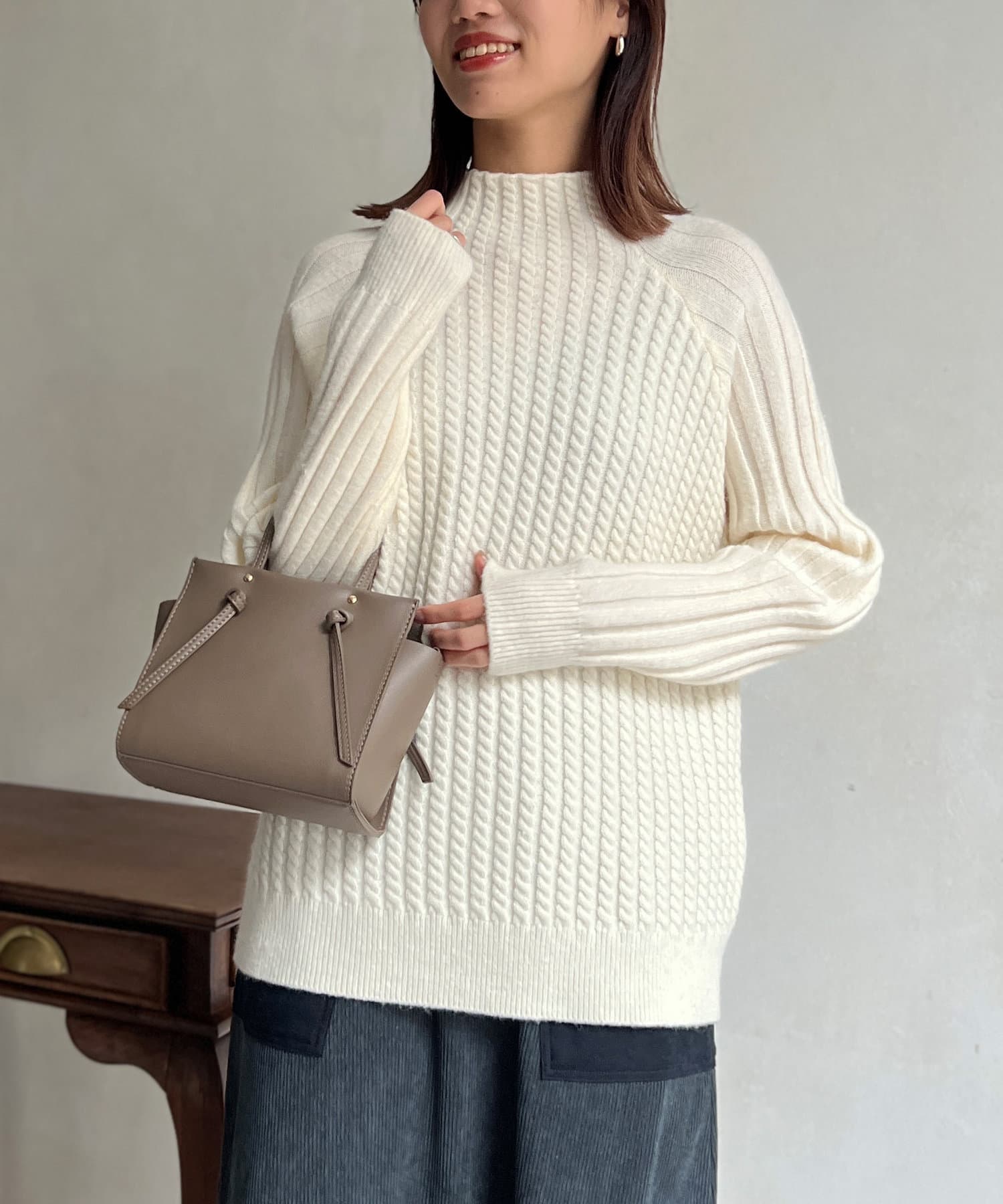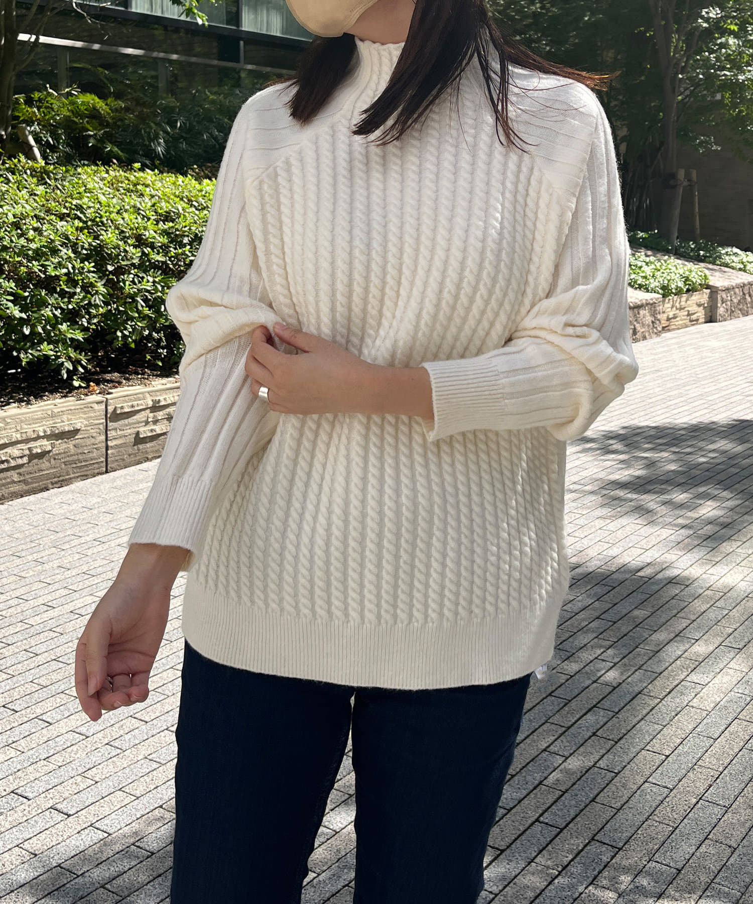 前身頃はケーブル編み、後ろはリブ編みの異なる編立がポイントのきれいめニット。
