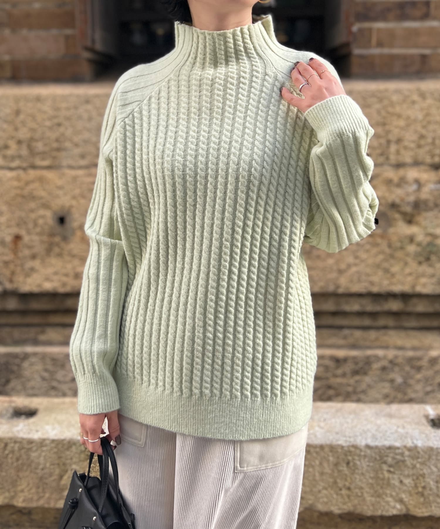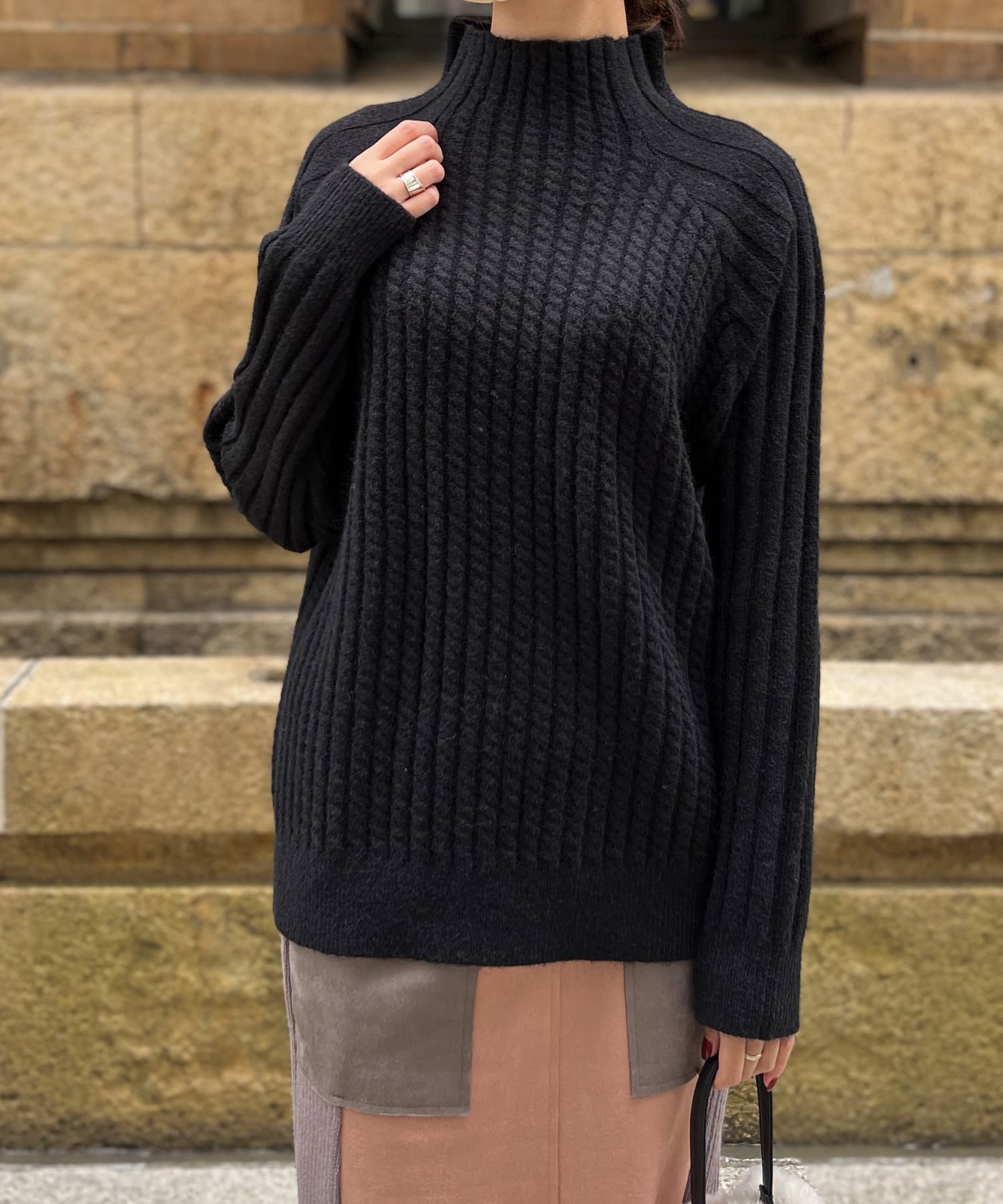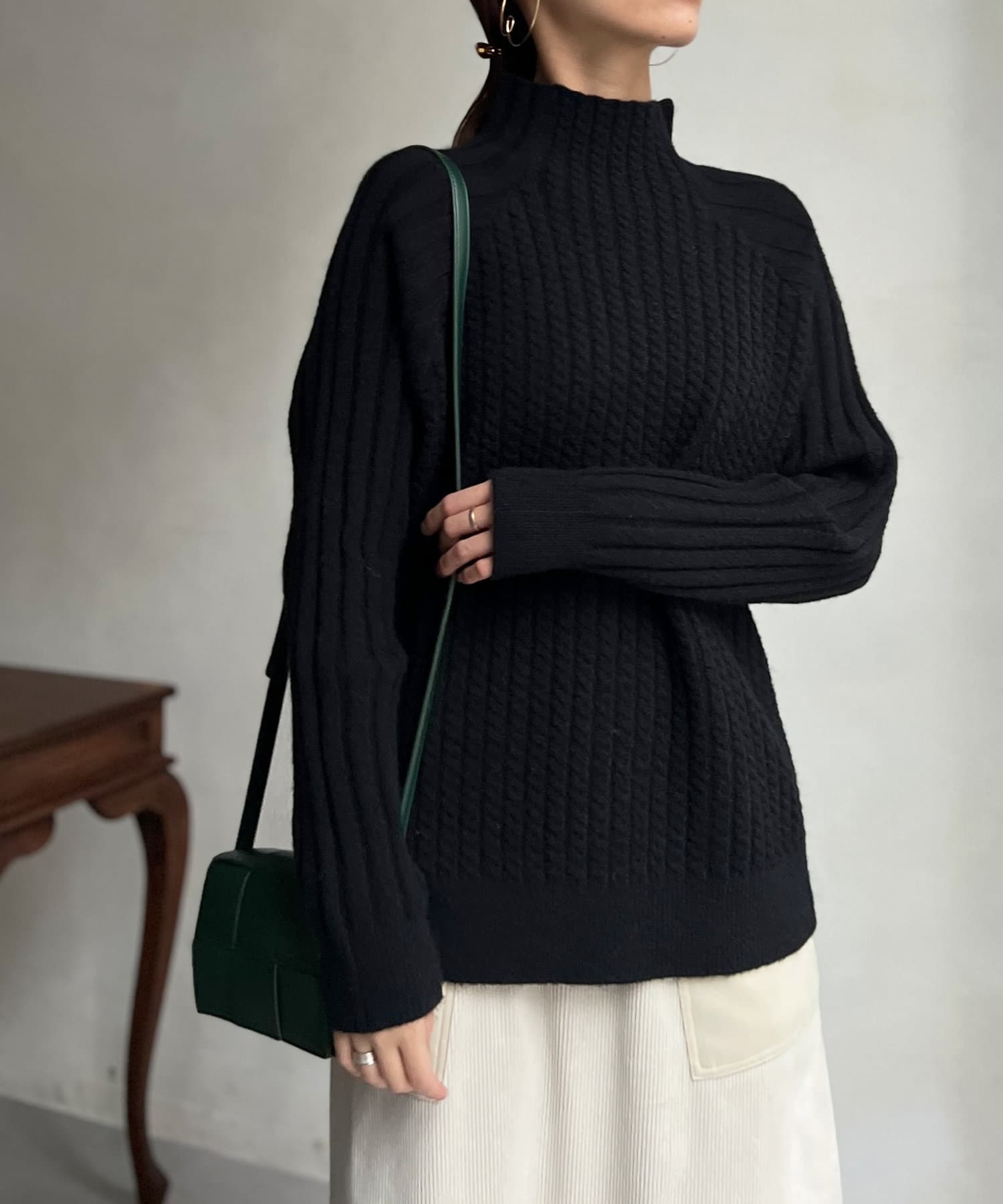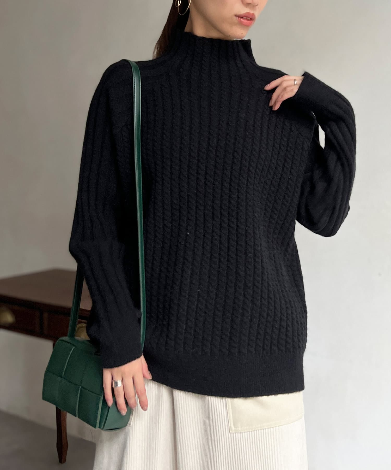 ケーブル編みスタンドネックプルオーバー