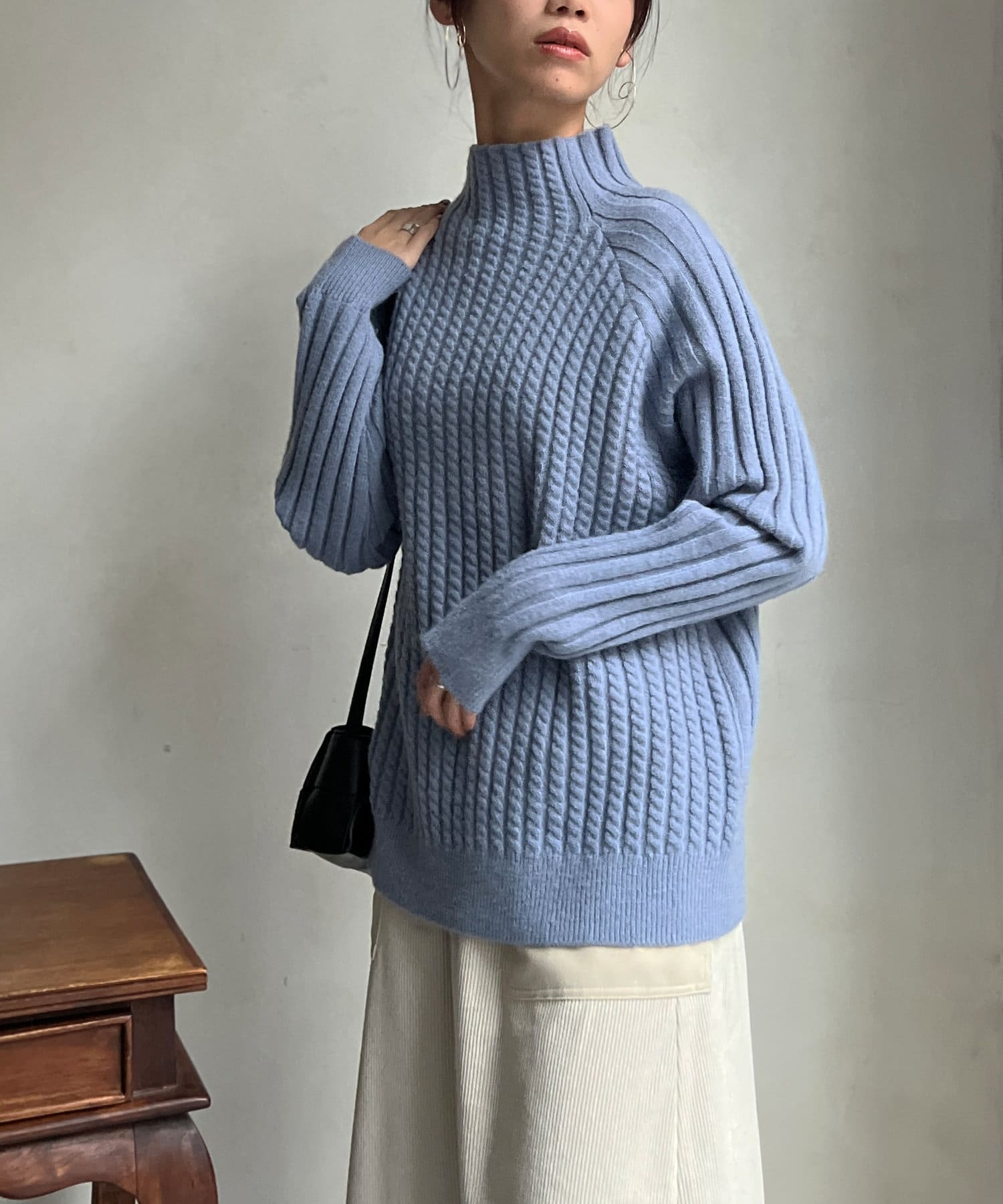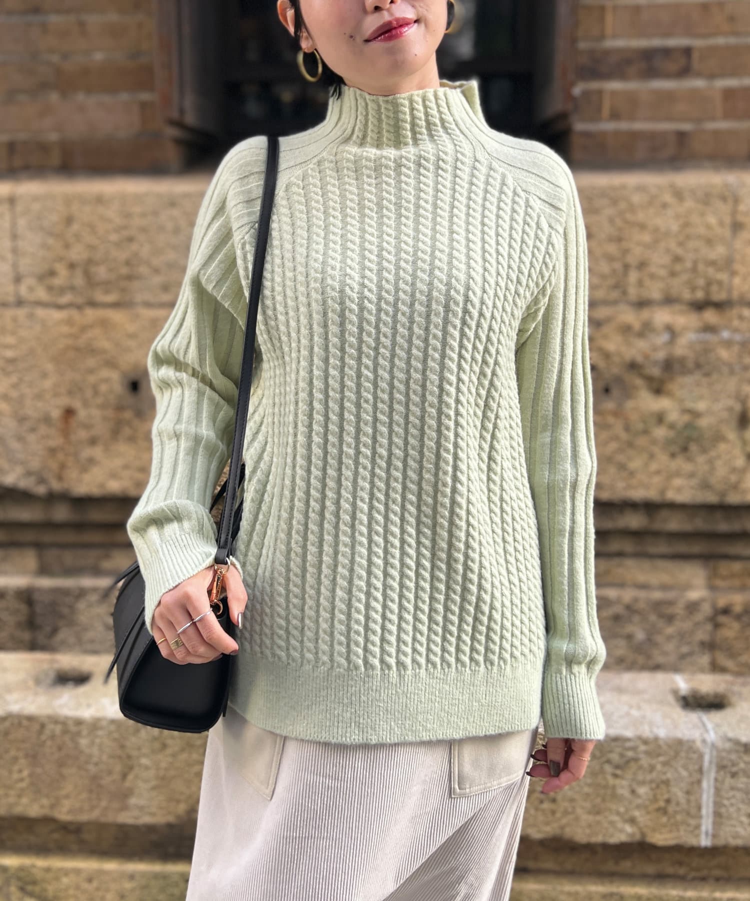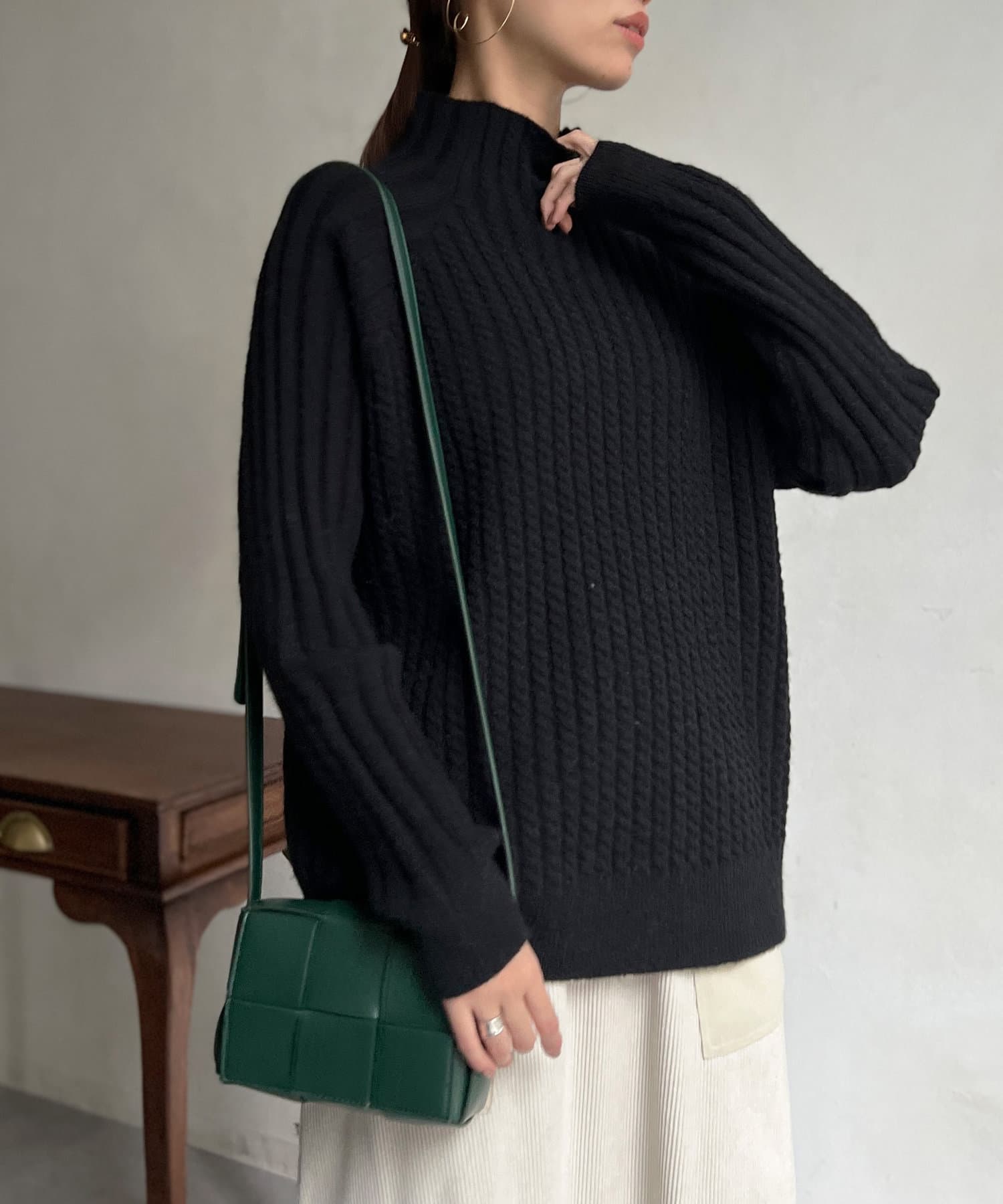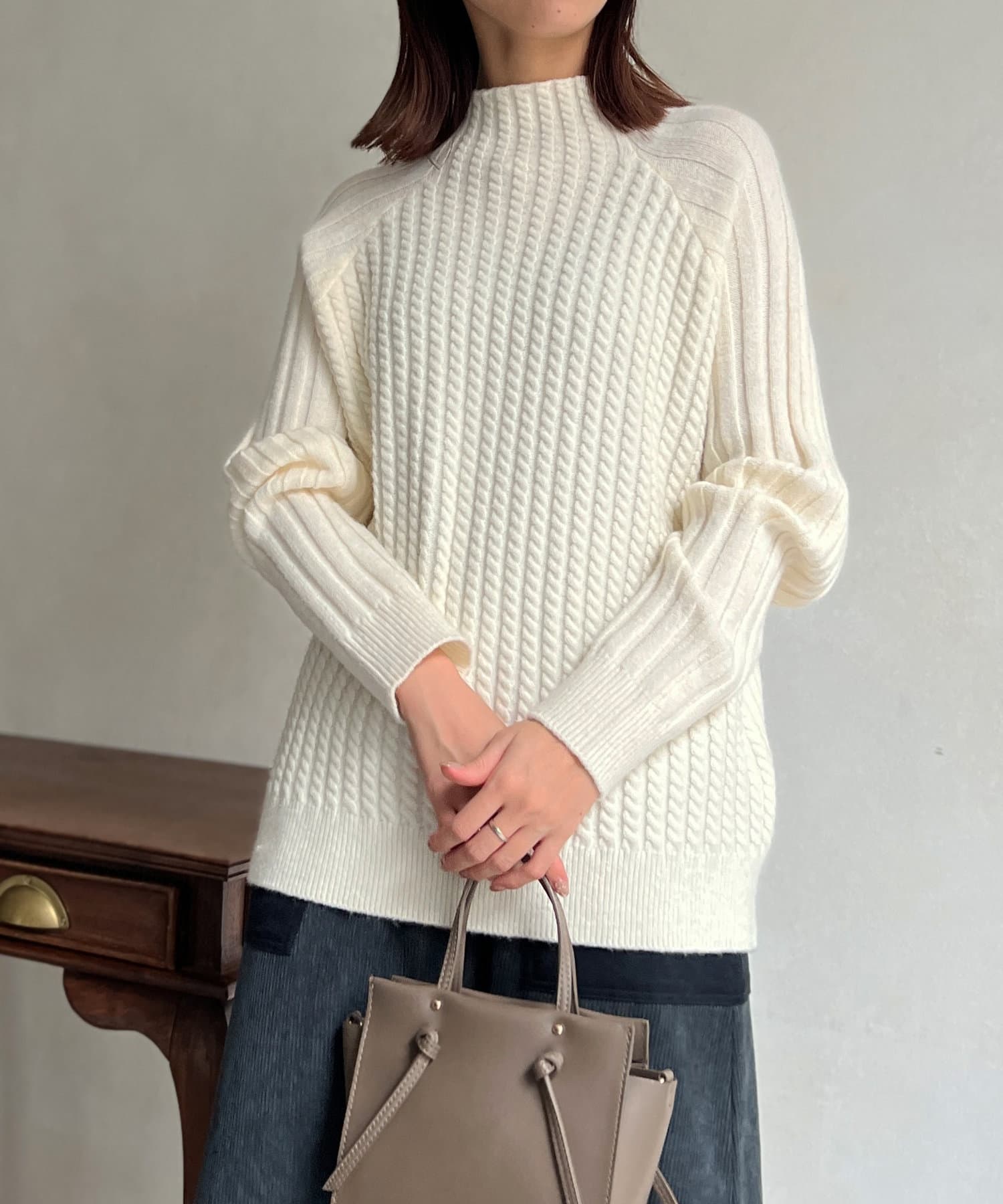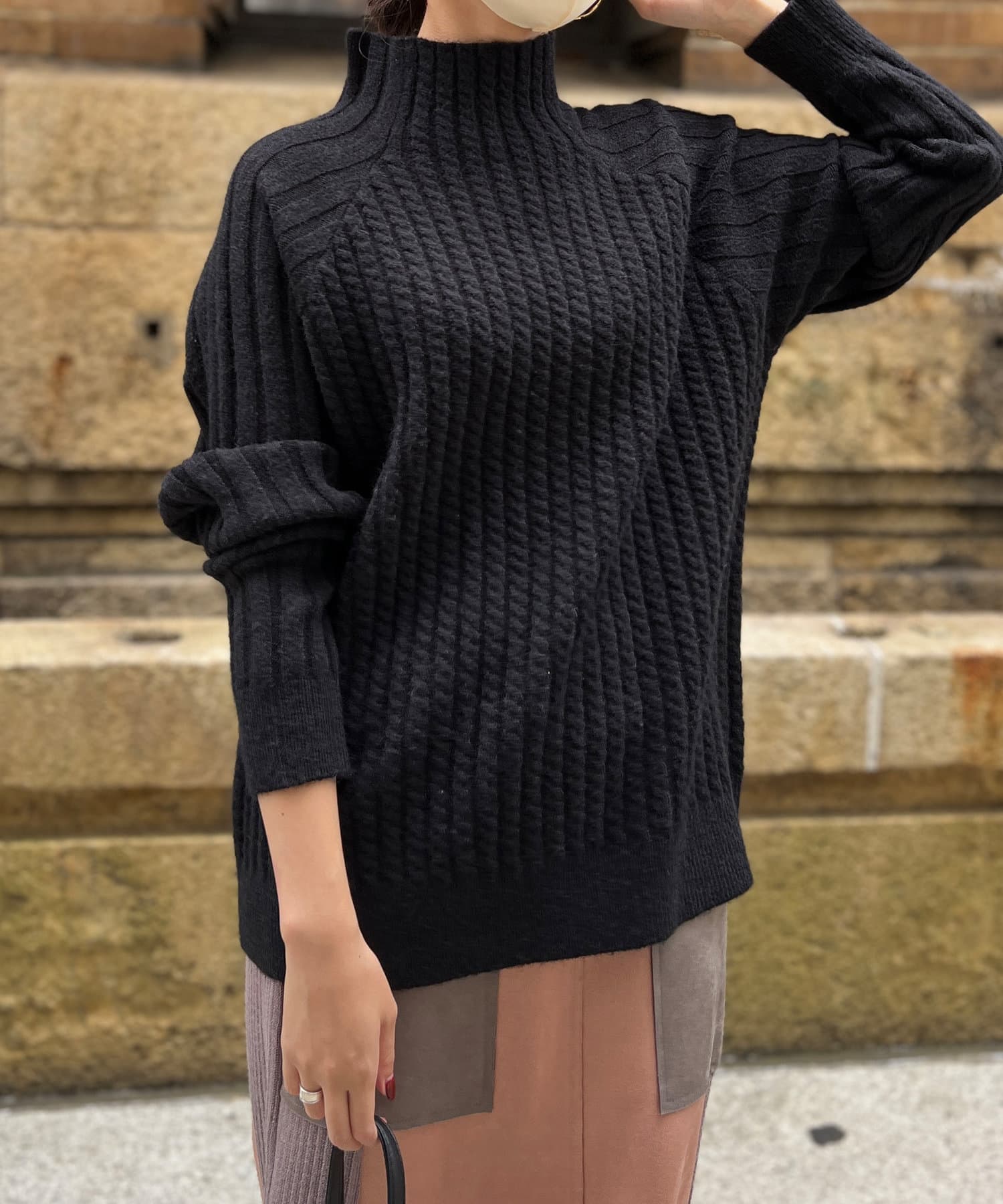 ケーブル編みスタンドネックプルオーバー