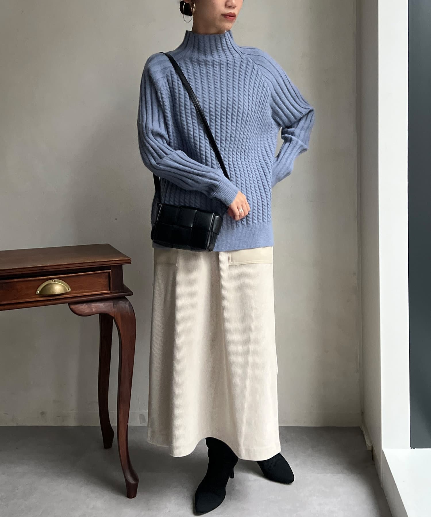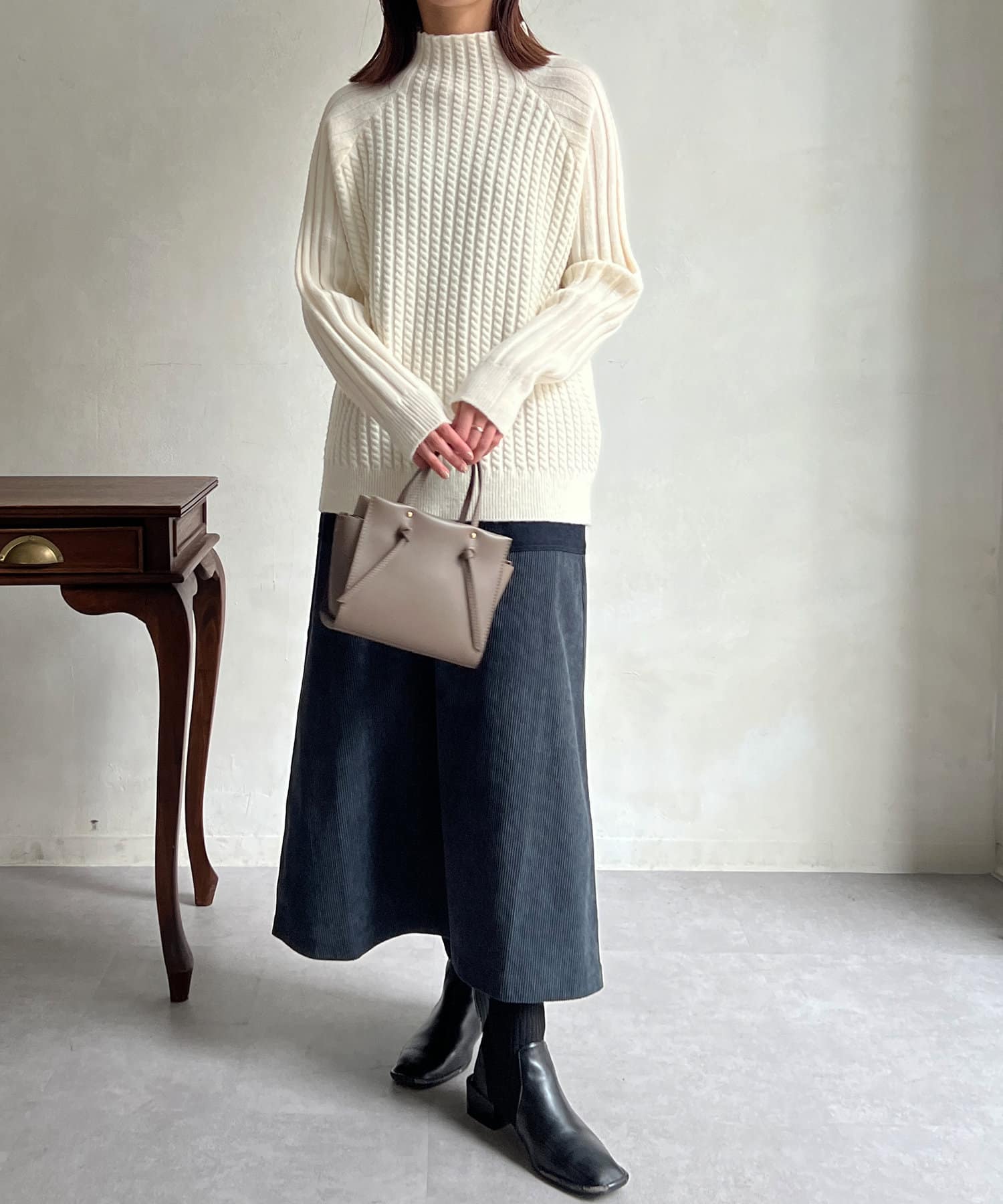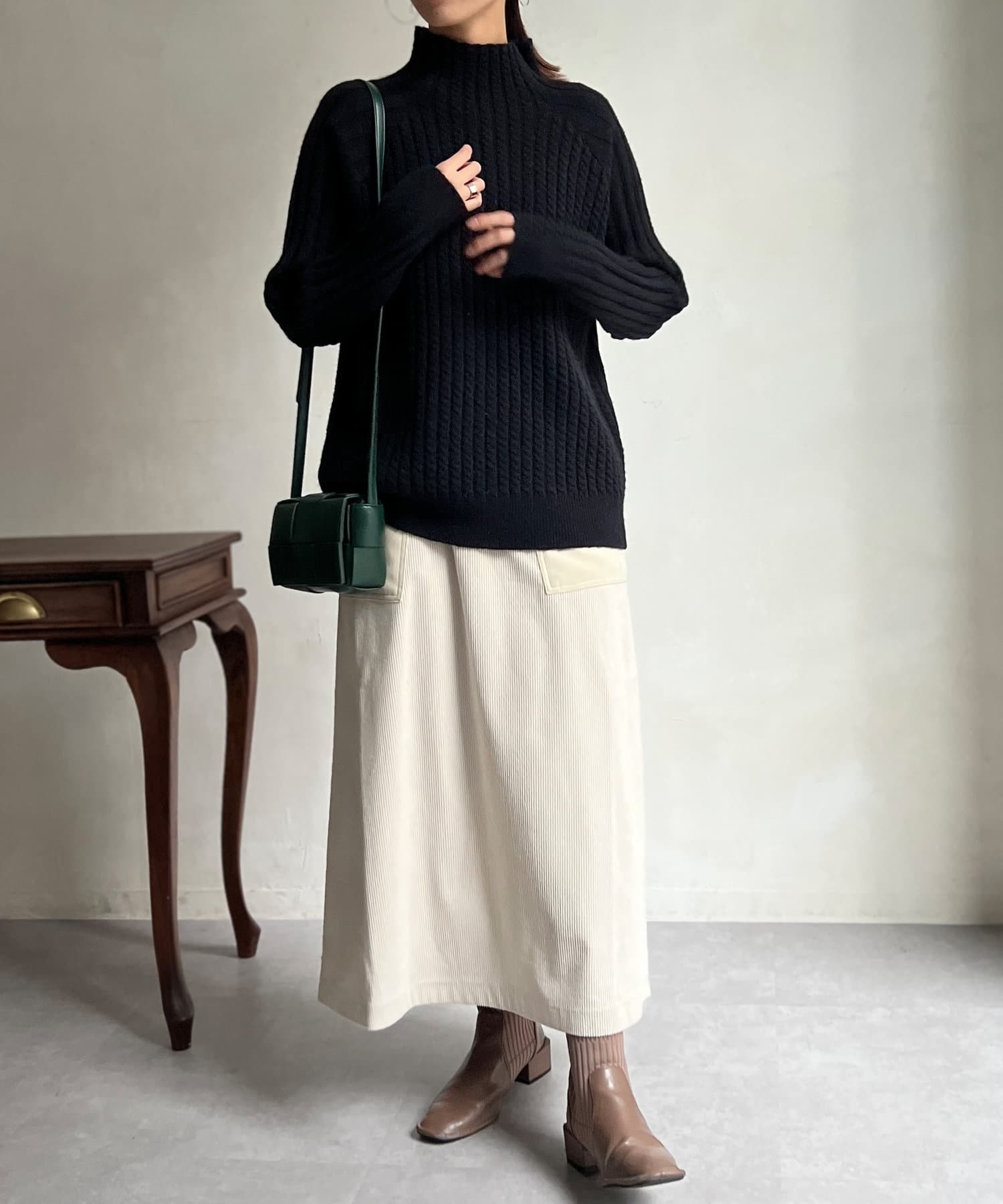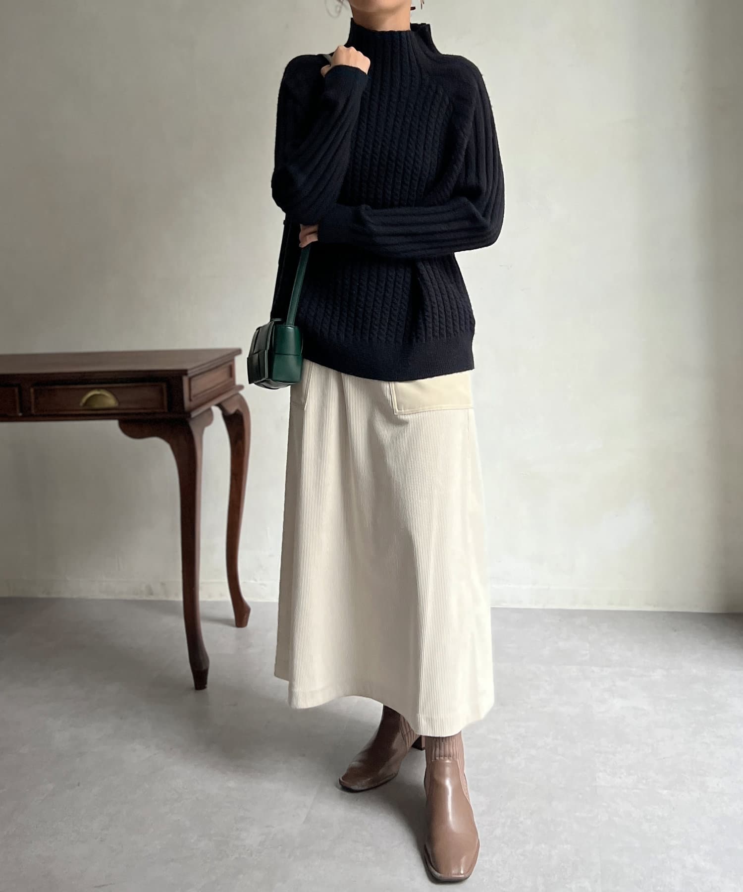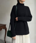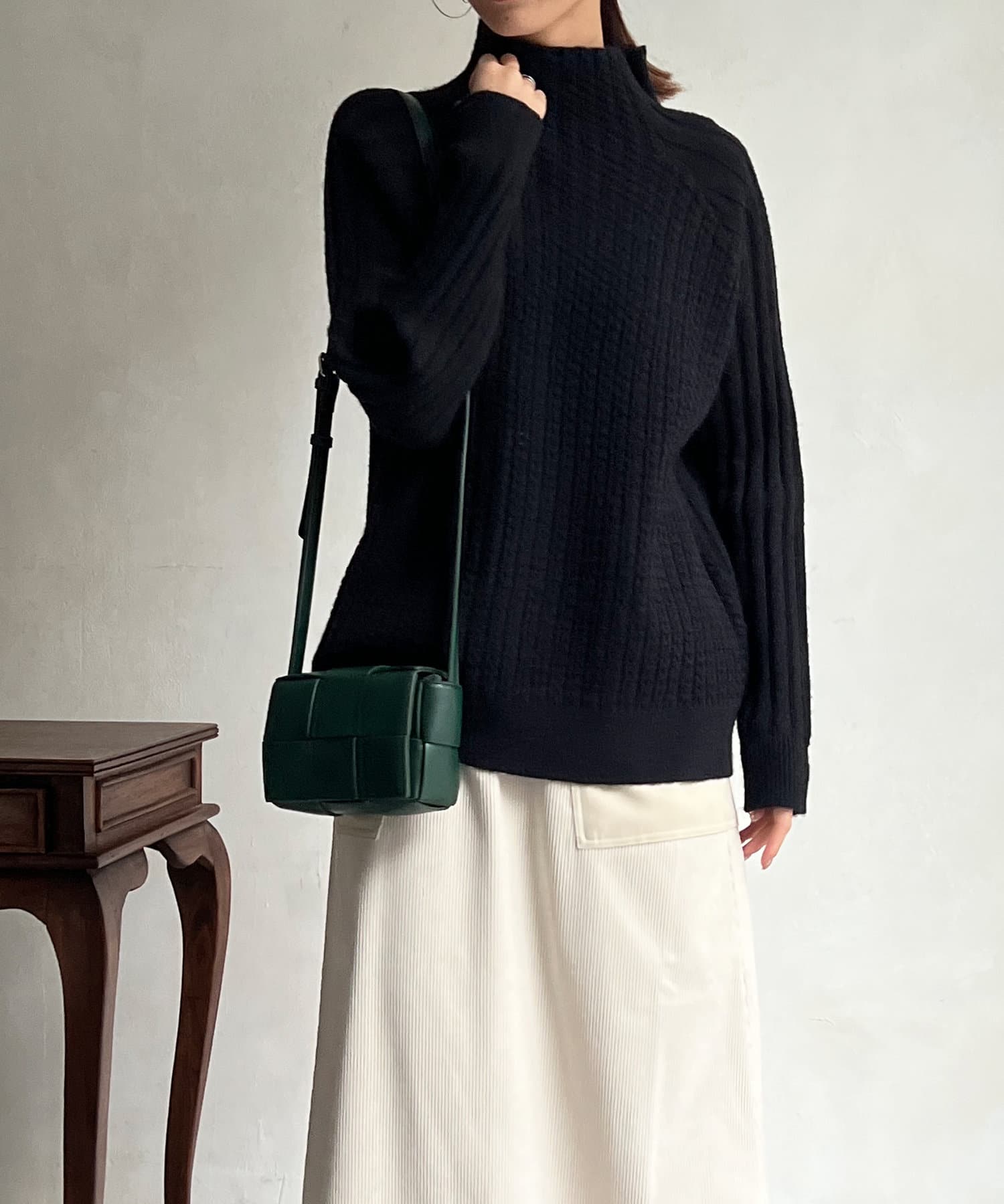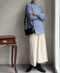 スタンドネックで首回りにポイントを持たせつつ、ハイネックほどのボリューム感がないのですっきりとした印象で合わせていただけます。