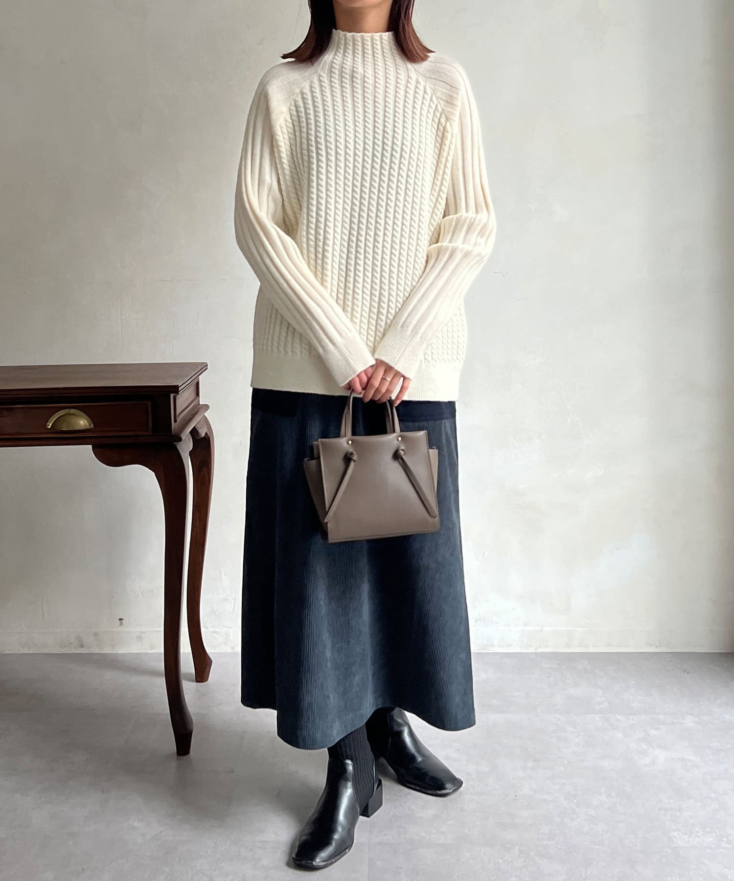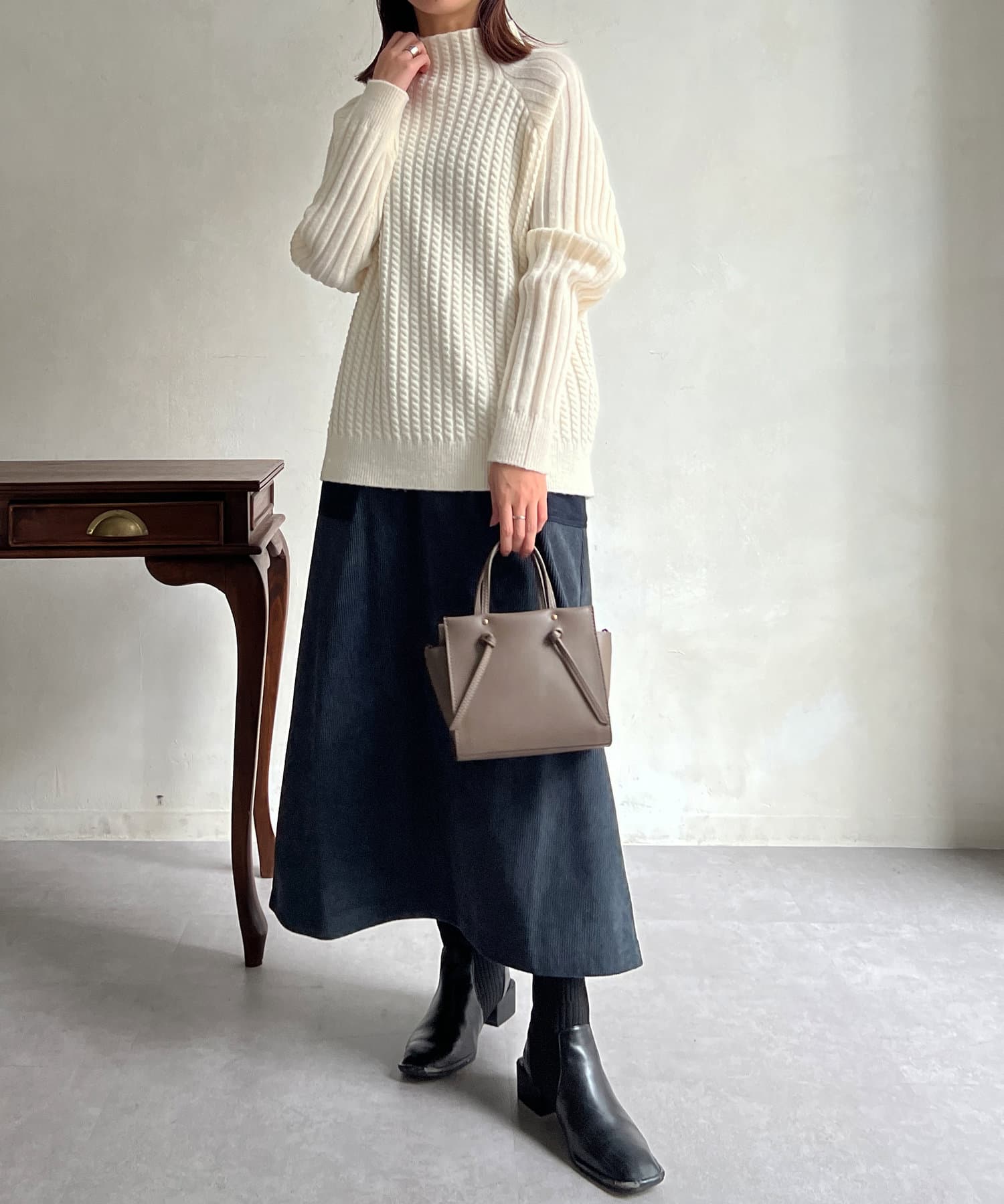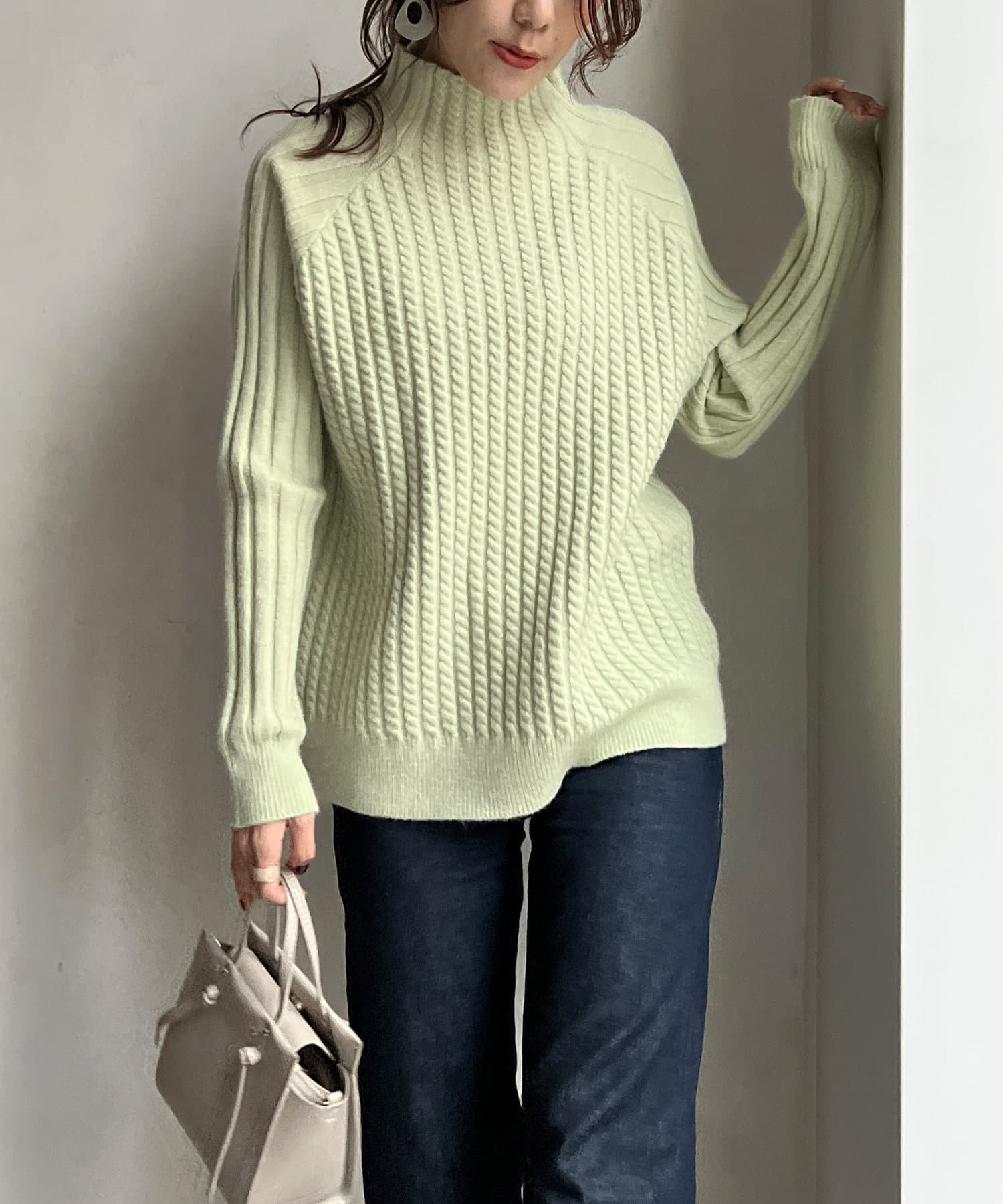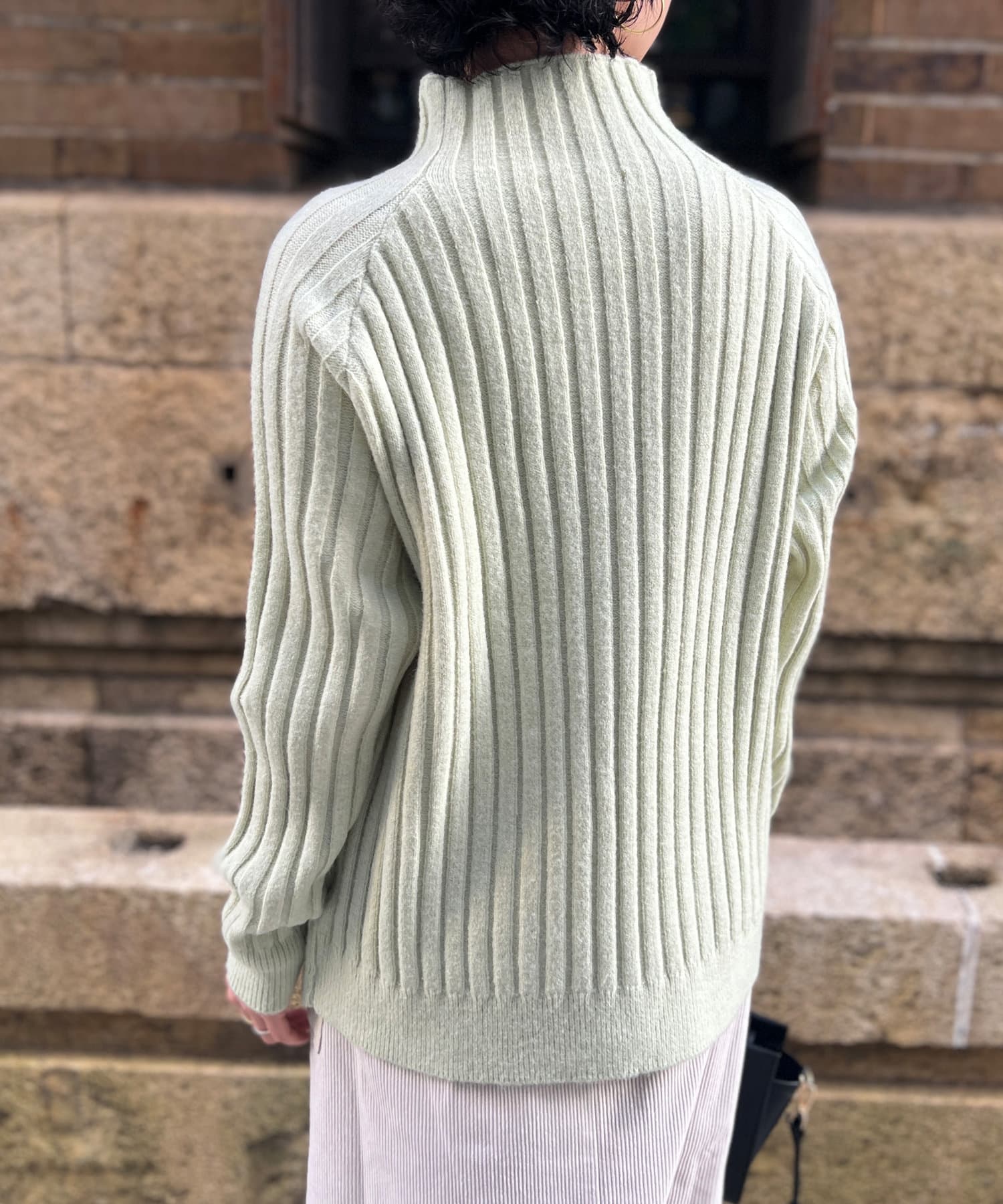スタンドネックで首回りにポイントを持たせつつ、ハイネックほどのボリューム感がないのですっきりとした印象で合わせていただけます。