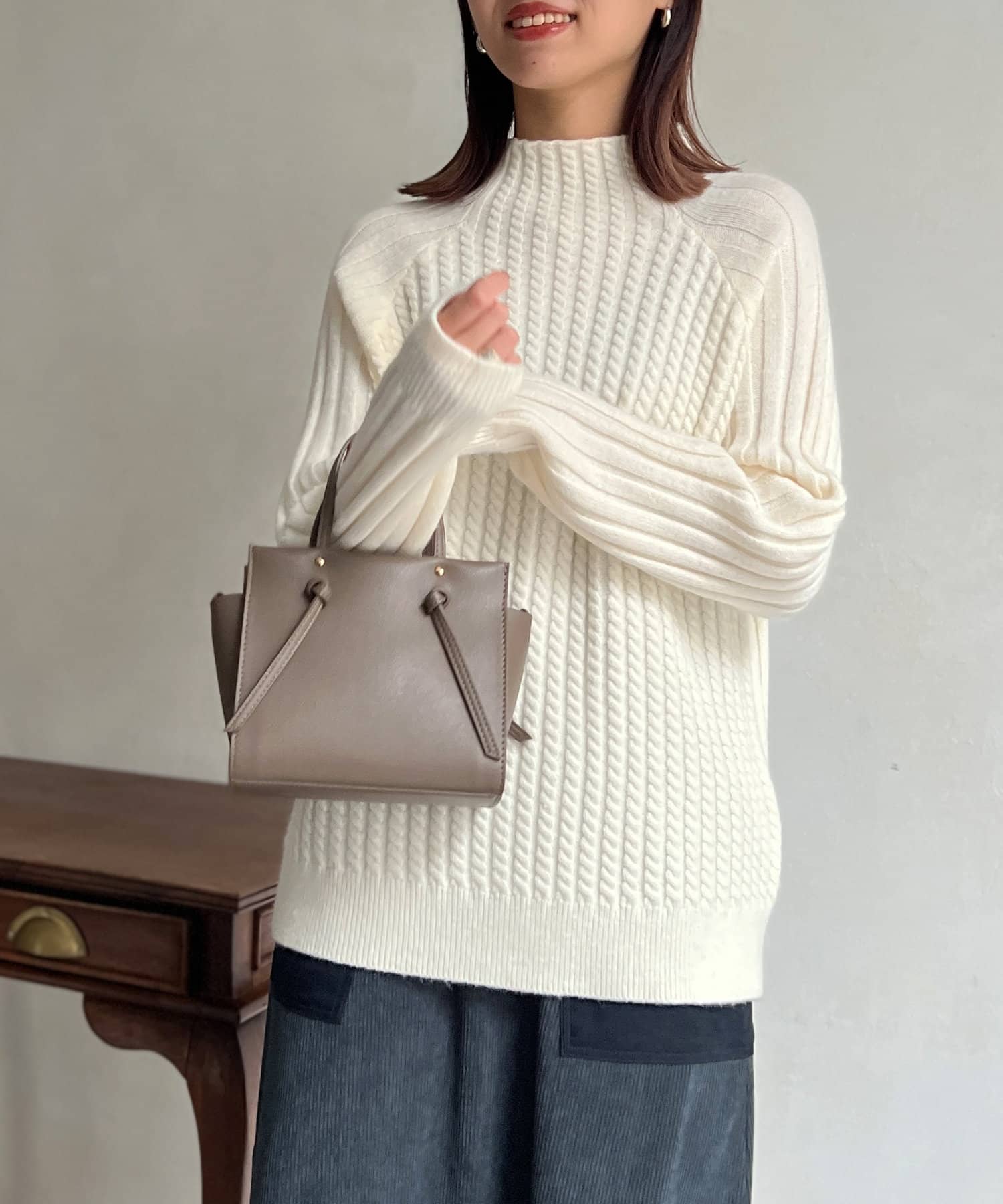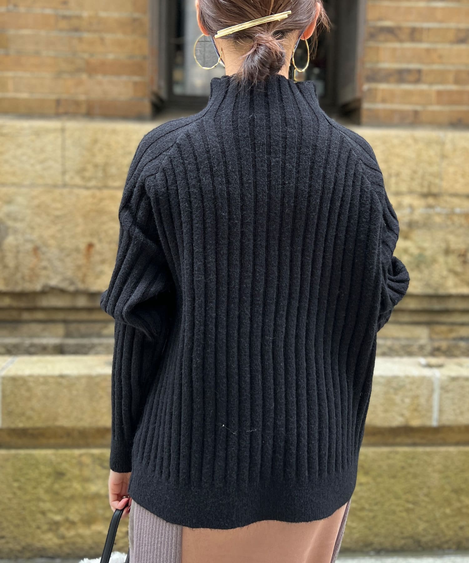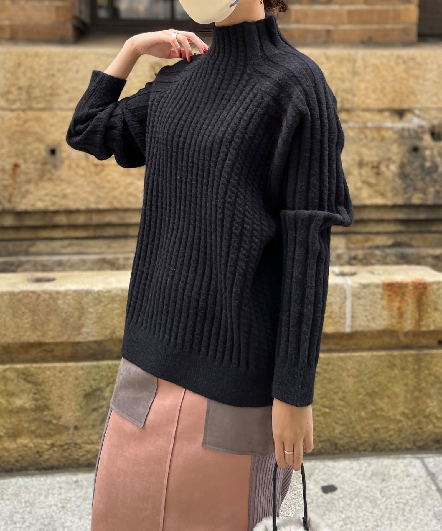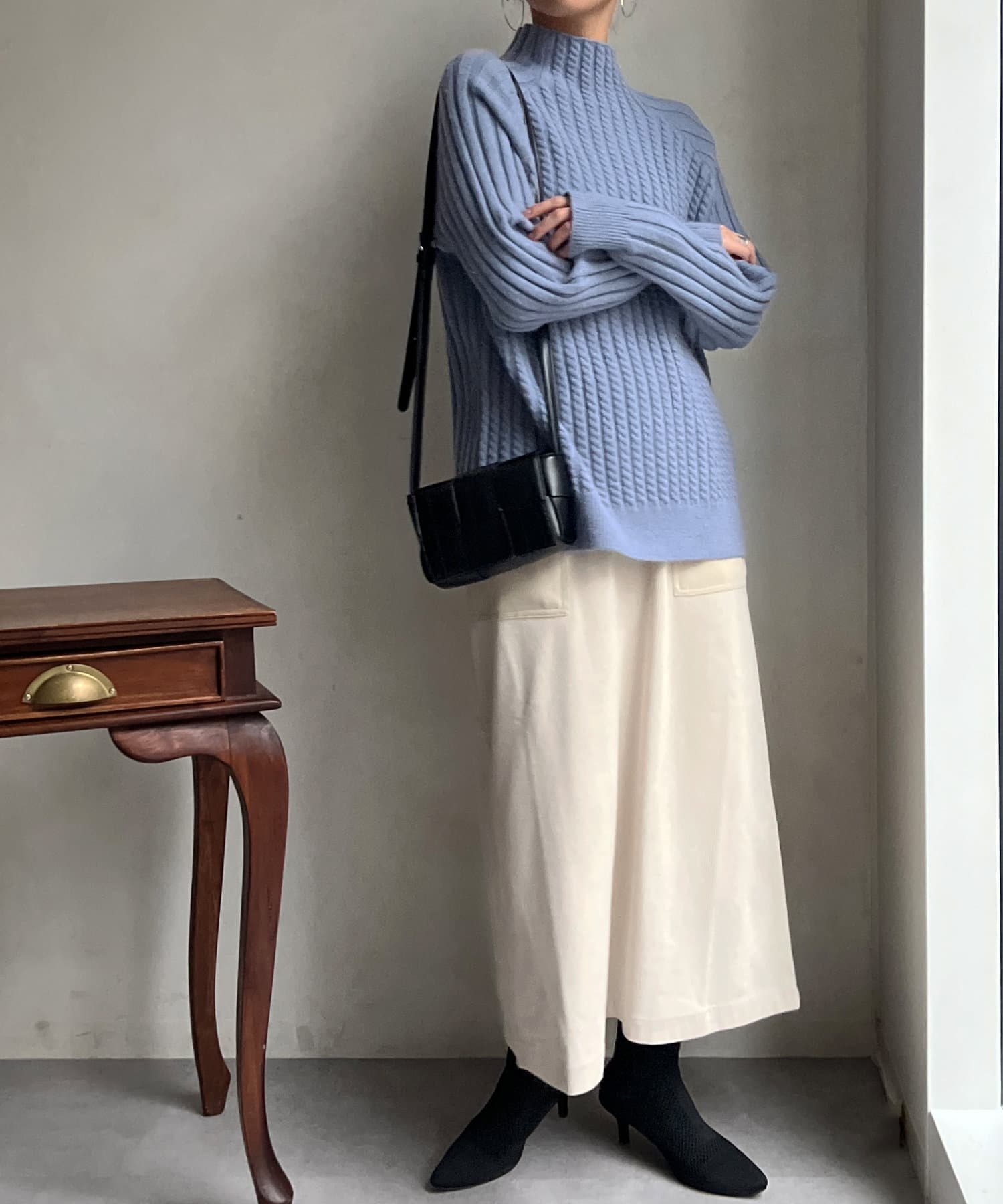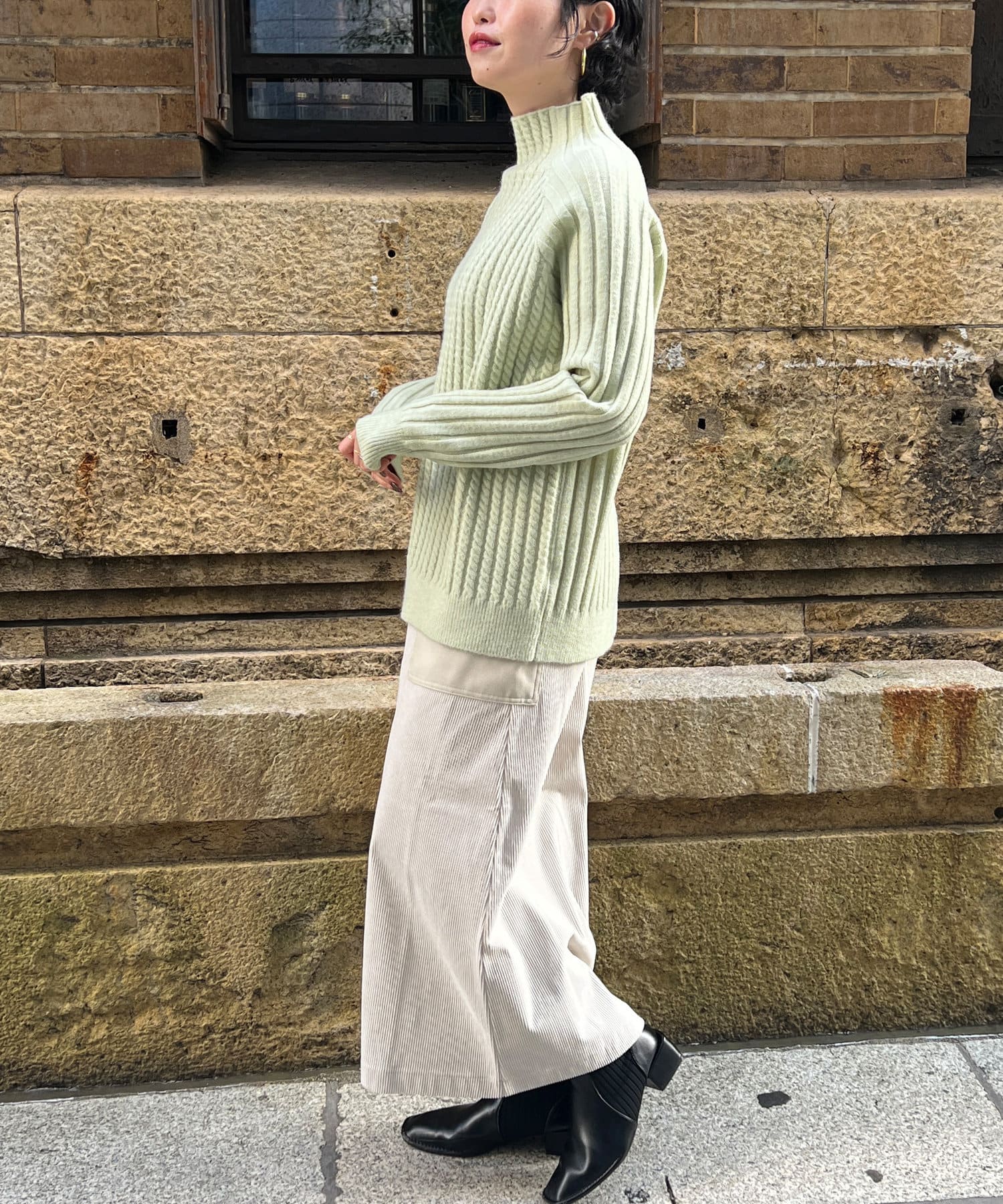 スタンドネックで首回りにポイントを持たせつつ、ハイネックほどのボリューム感がないのですっきりとした印象で合わせていただけます。