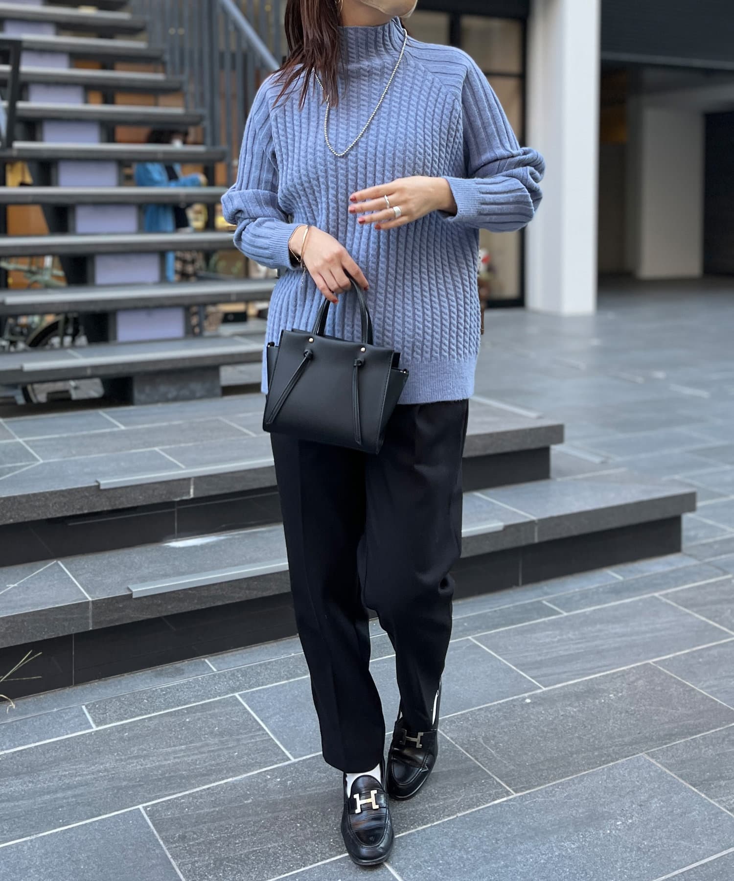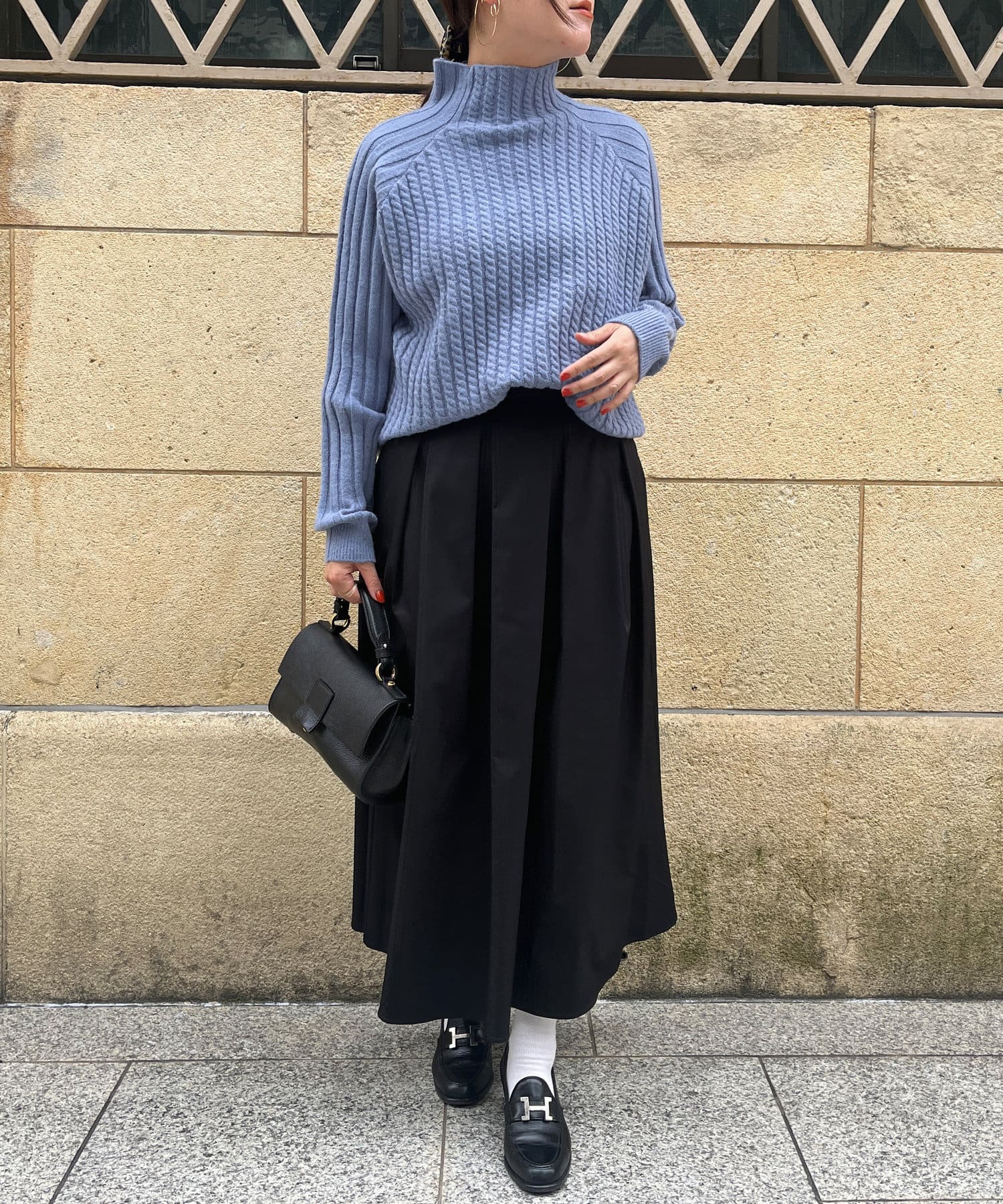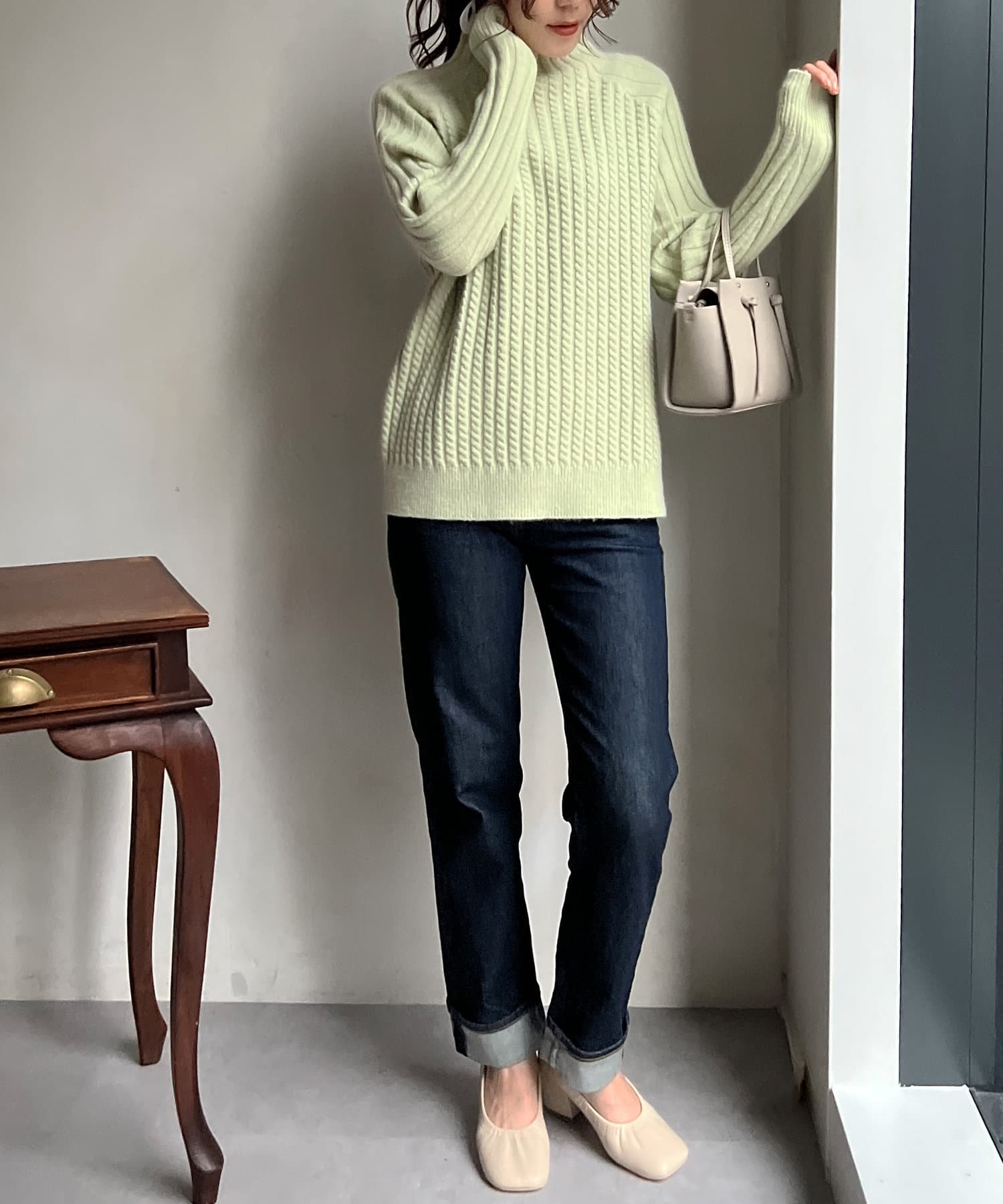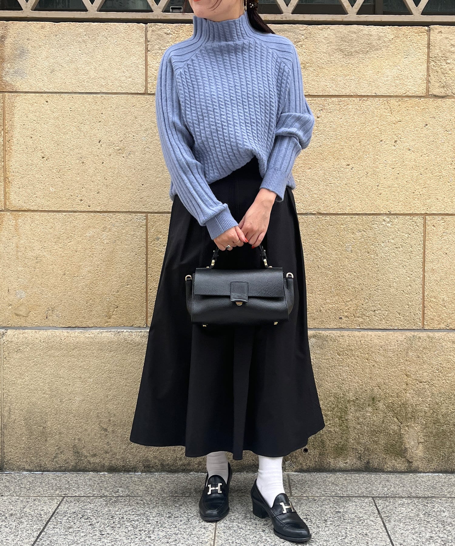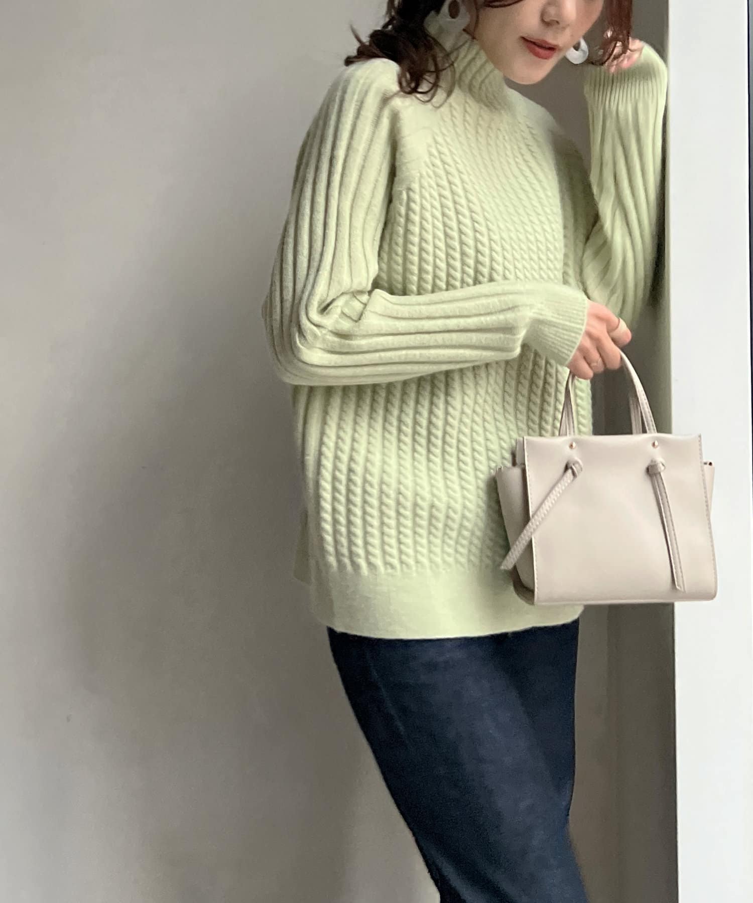 スタンドネックで首回りにポイントを持たせつつ、ハイネックほどのボリューム感がないのですっきりとした印象で合わせていただけます。