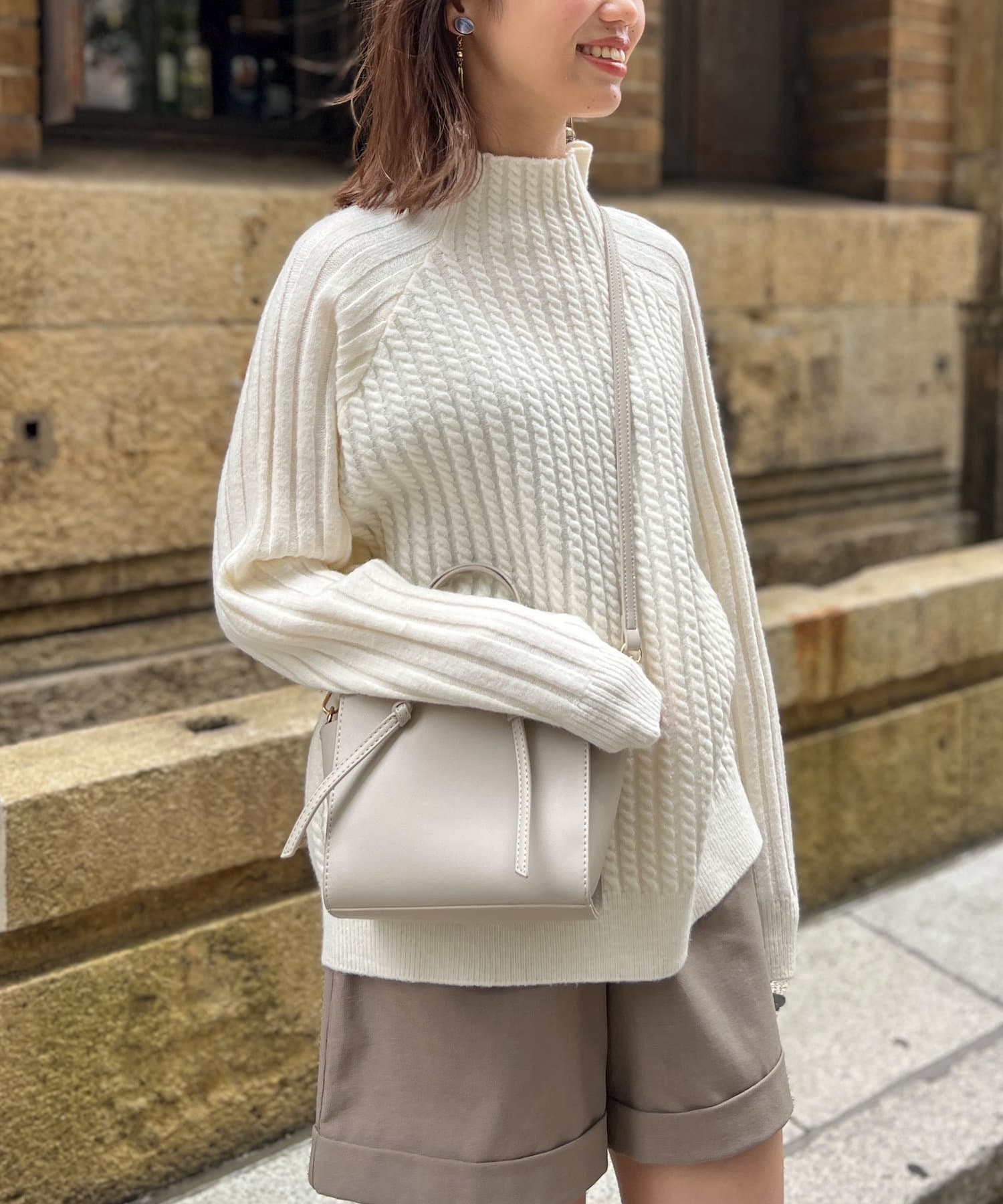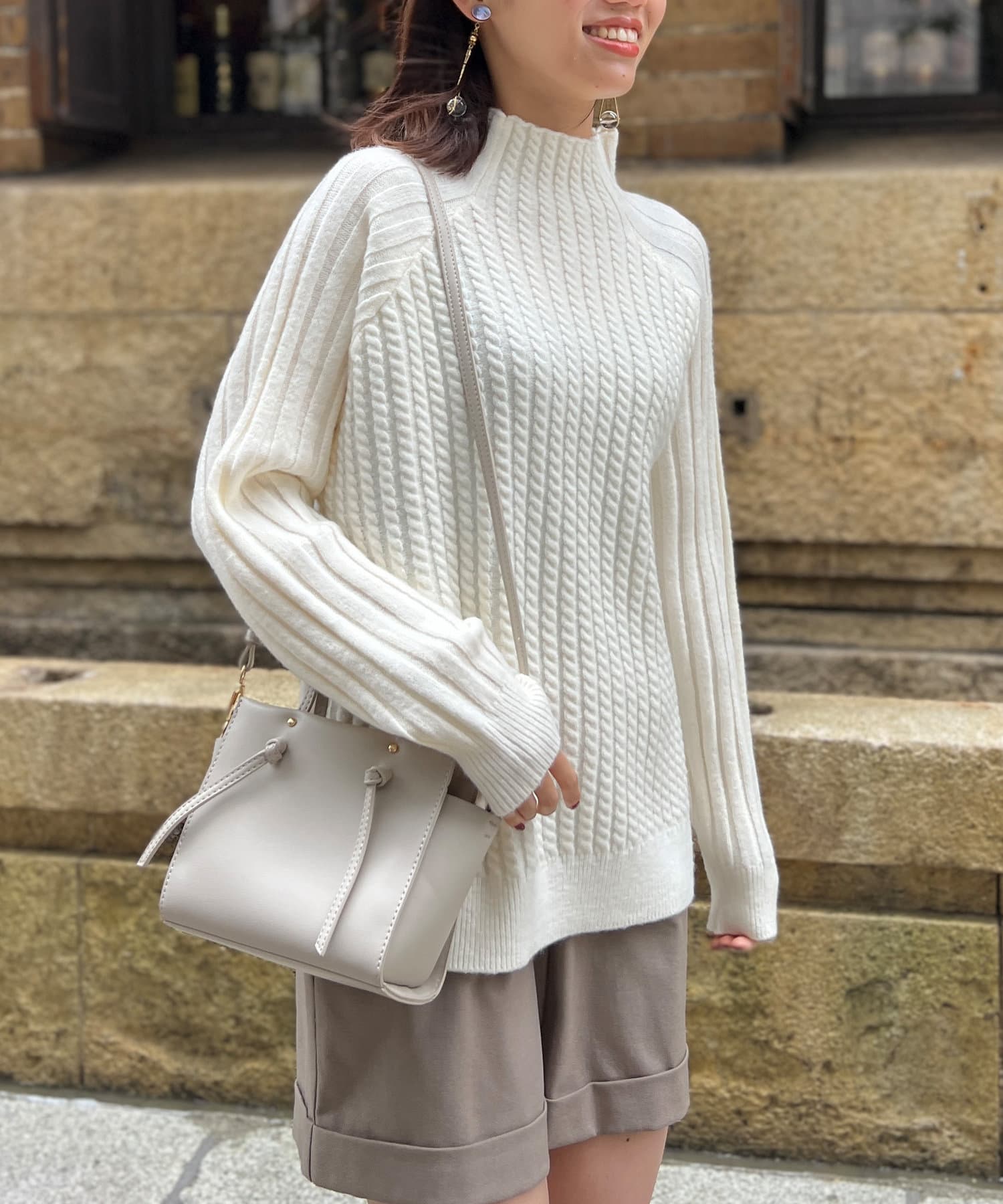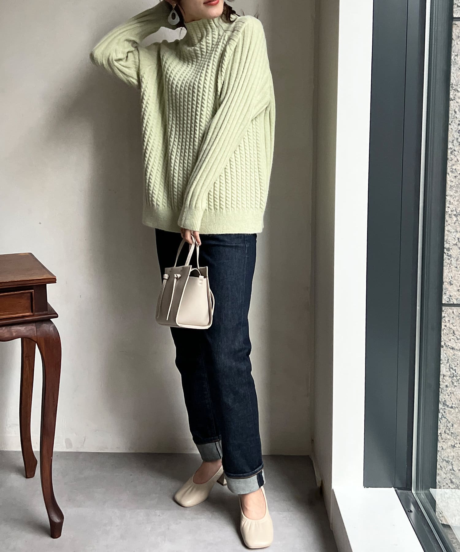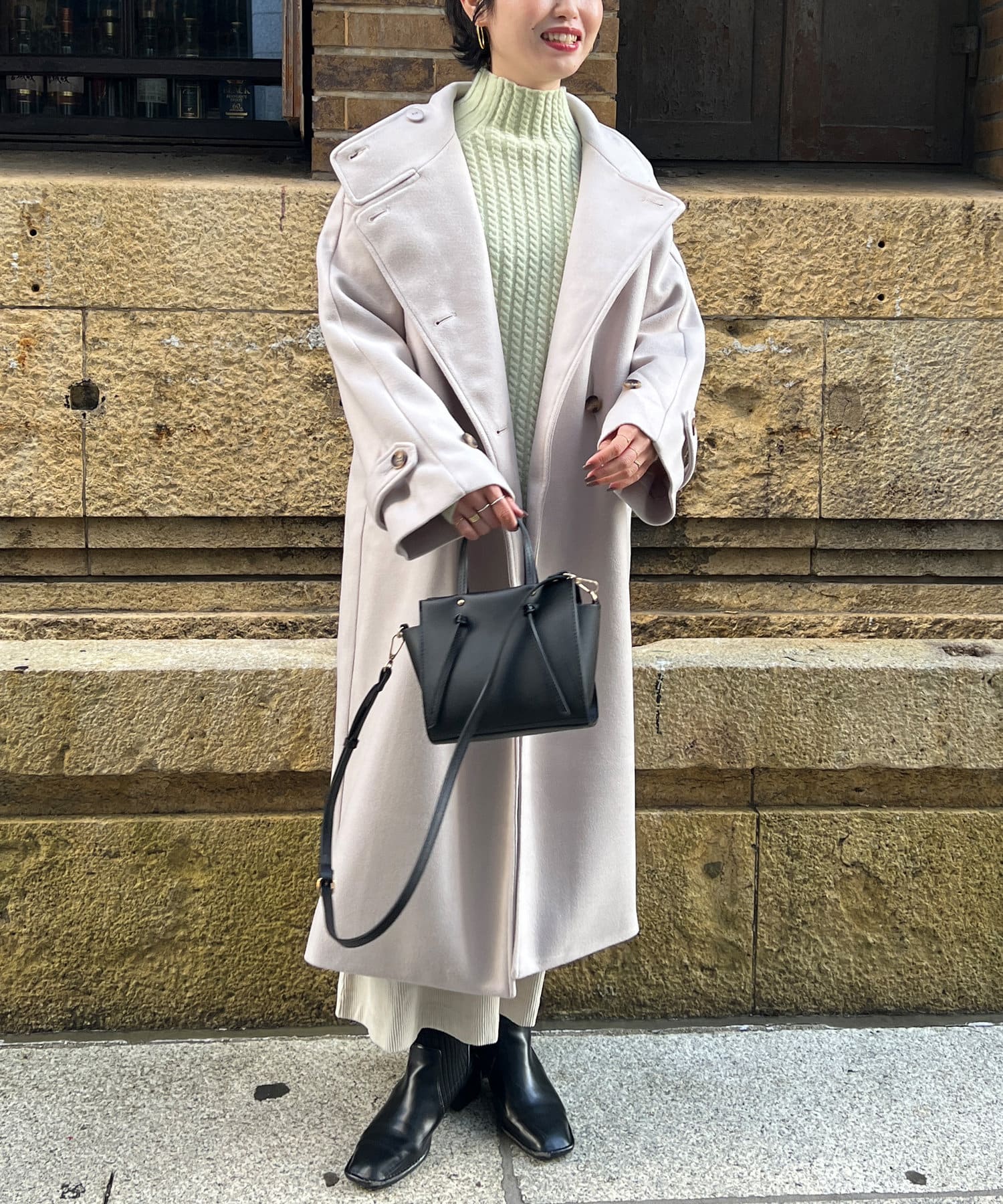 スタンドネックで首回りにポイントを持たせつつ、ハイネックほどのボリューム感がないのですっきりとした印象で合わせていただけます。