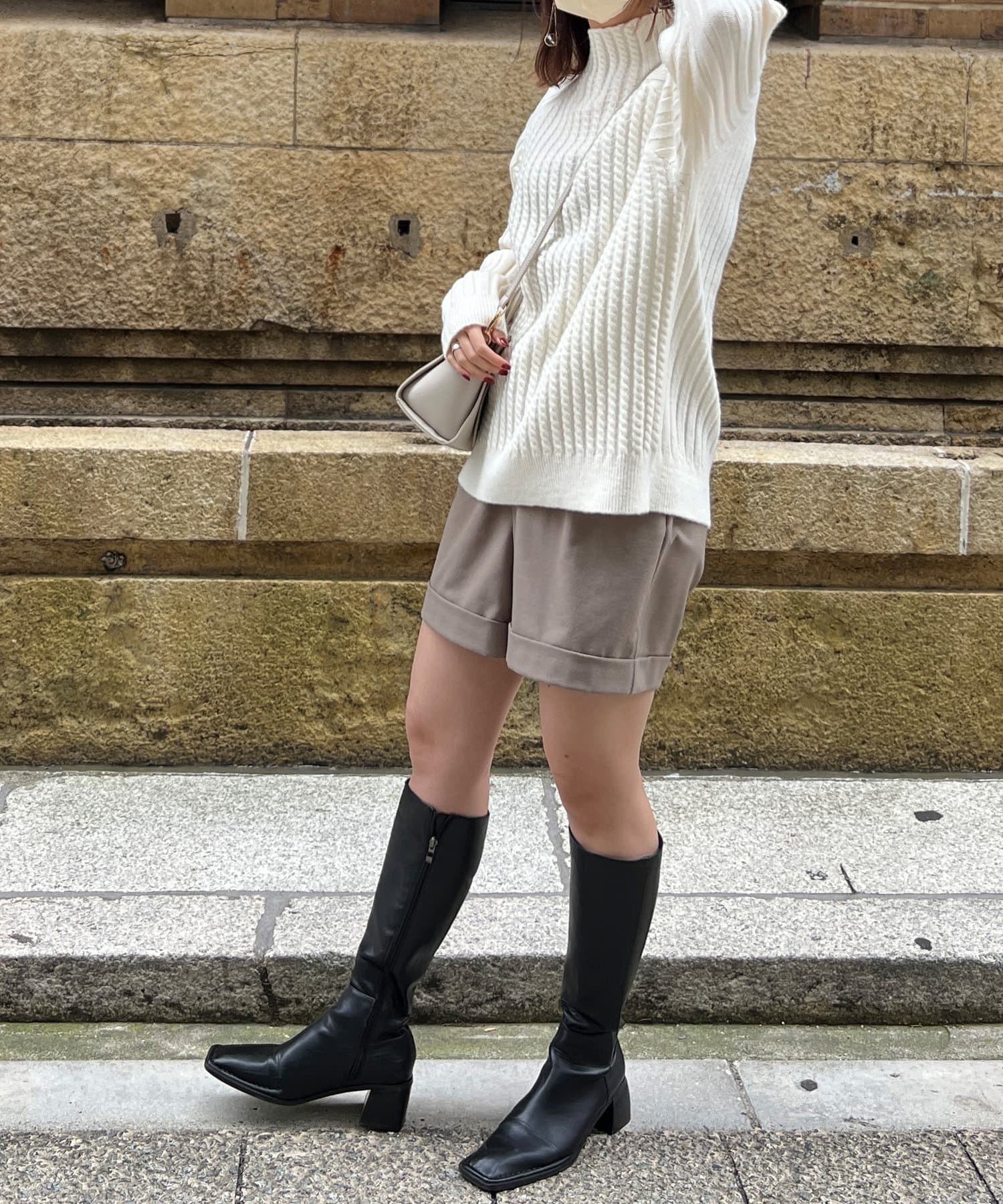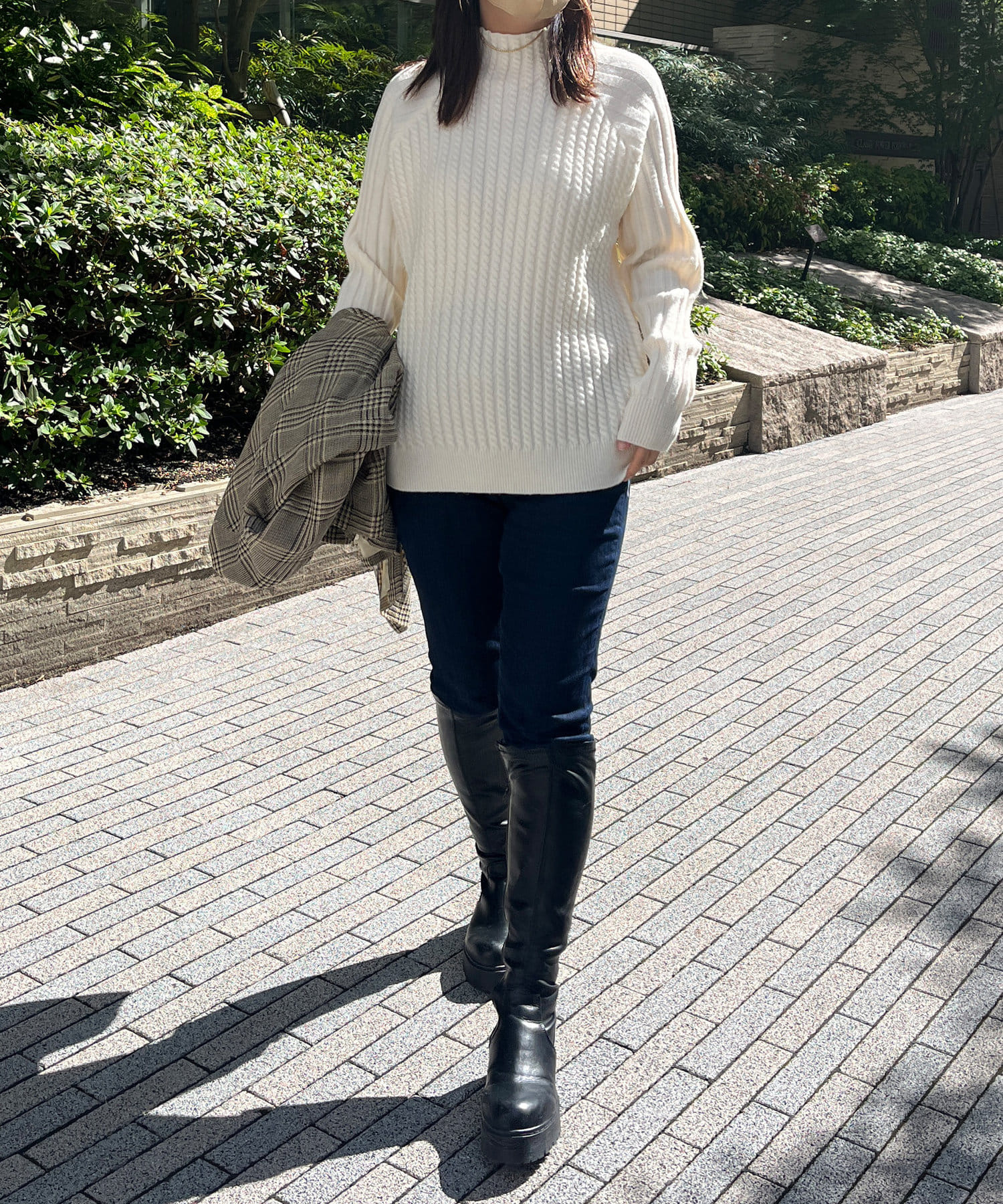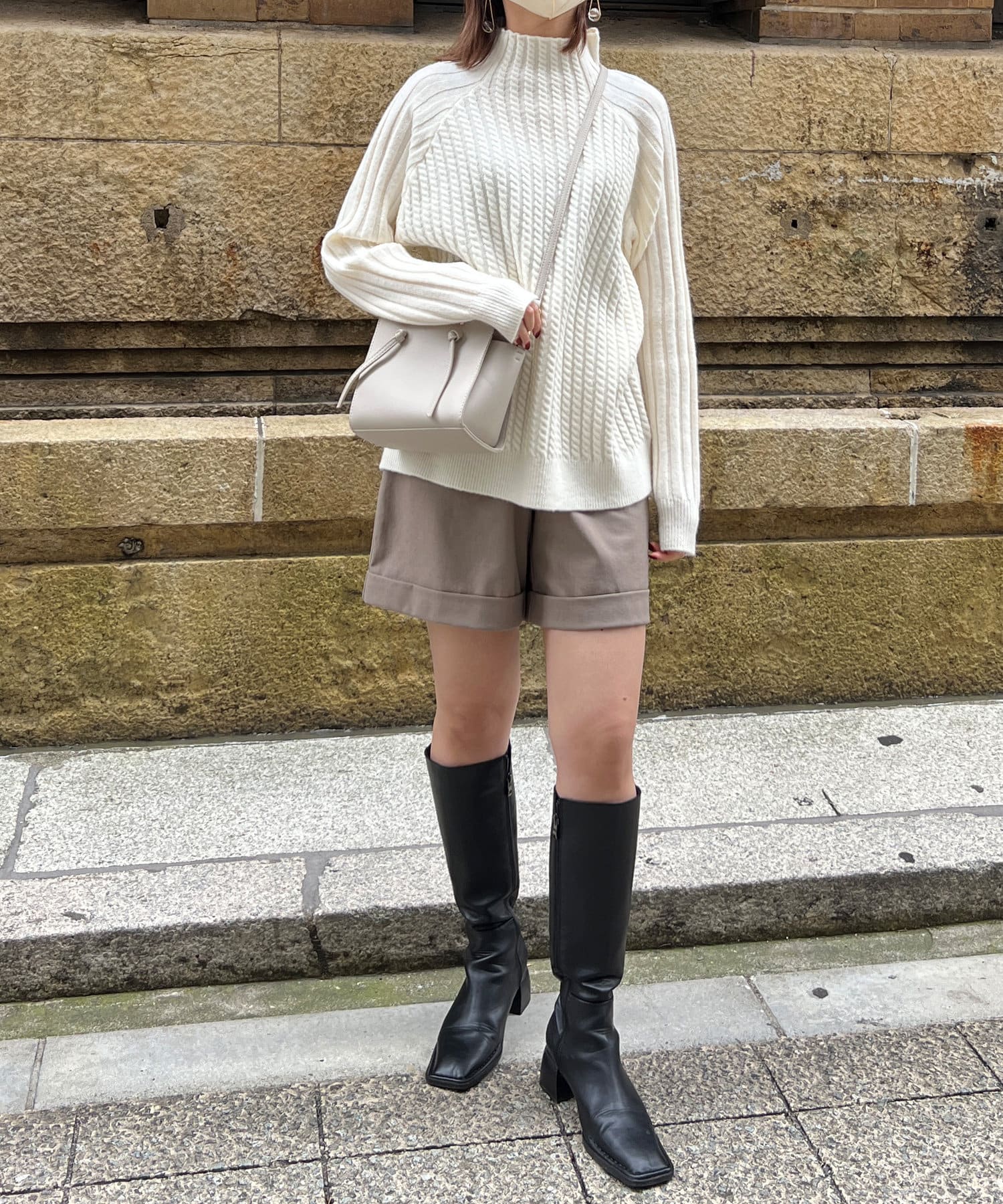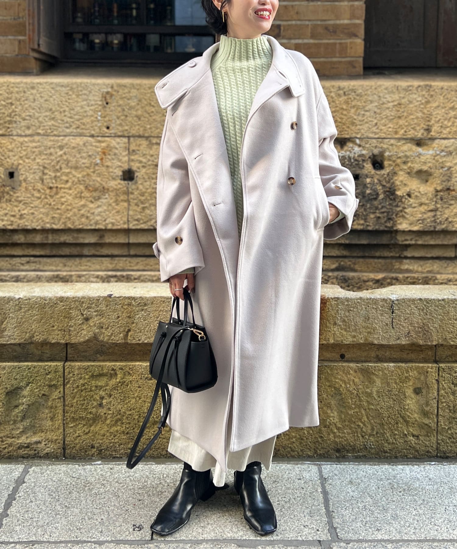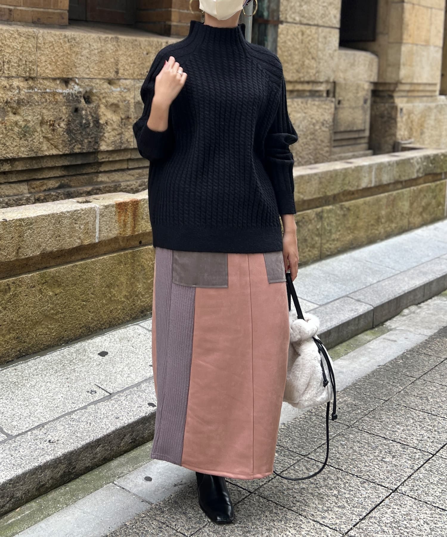 スタンドネックで首回りにポイントを持たせつつ、ハイネックほどのボリューム感がないのですっきりとした印象で合わせていただけます。