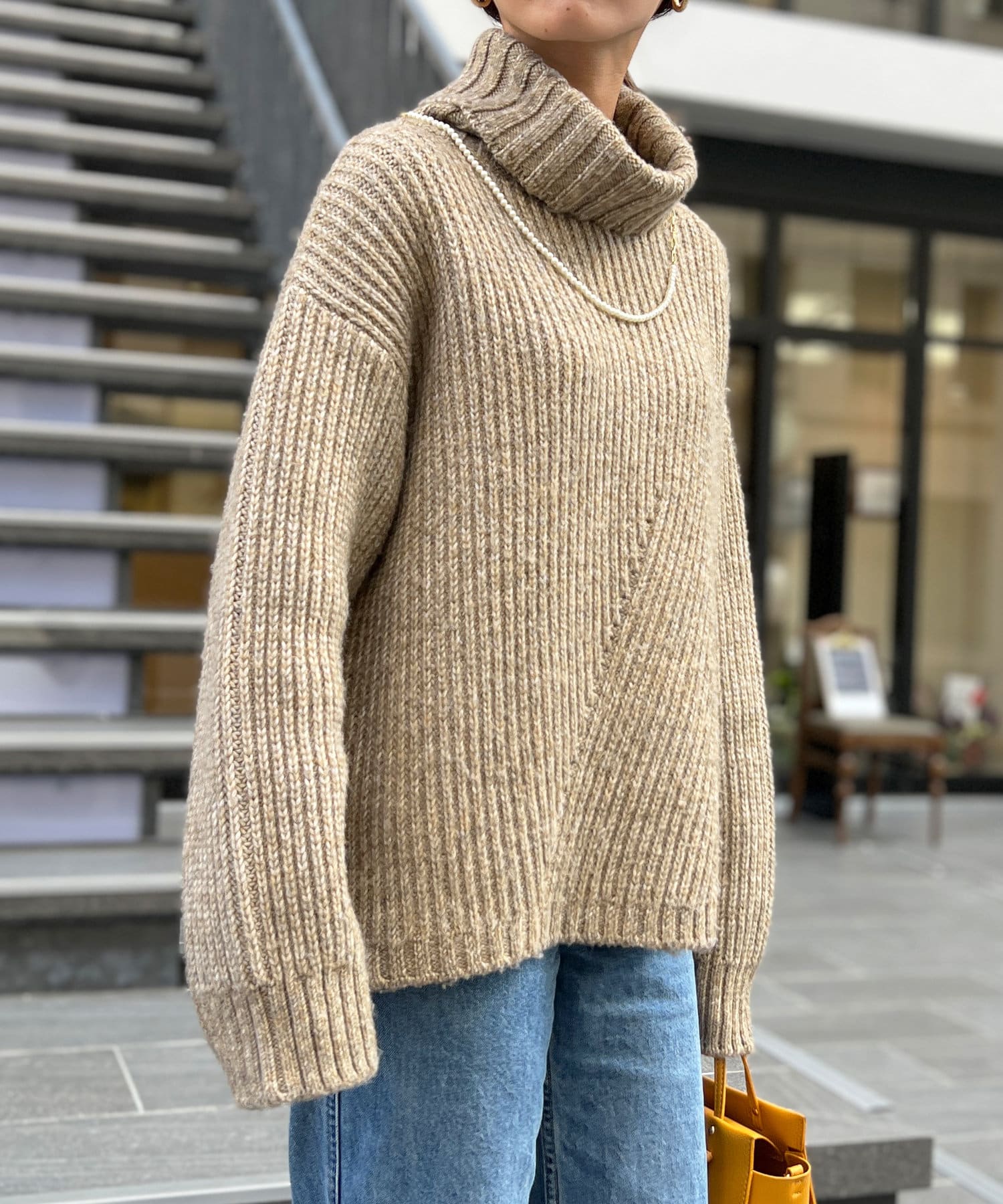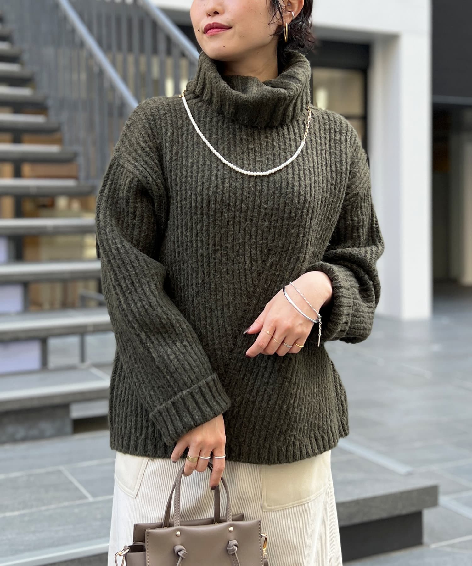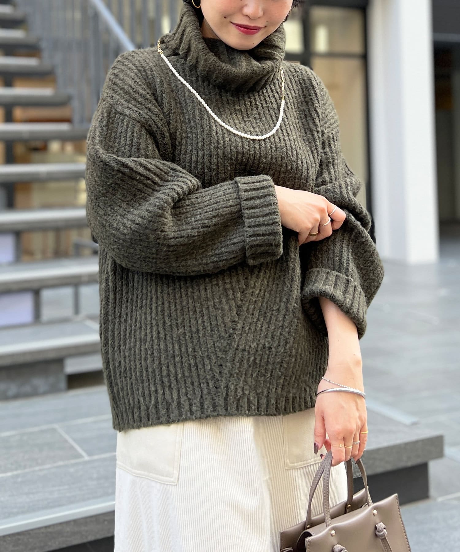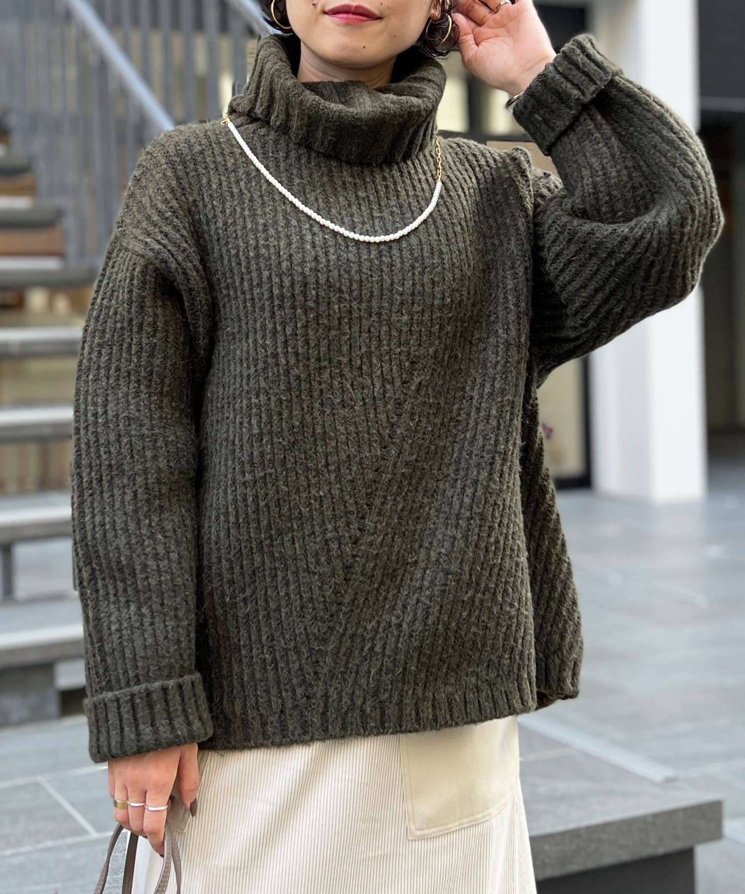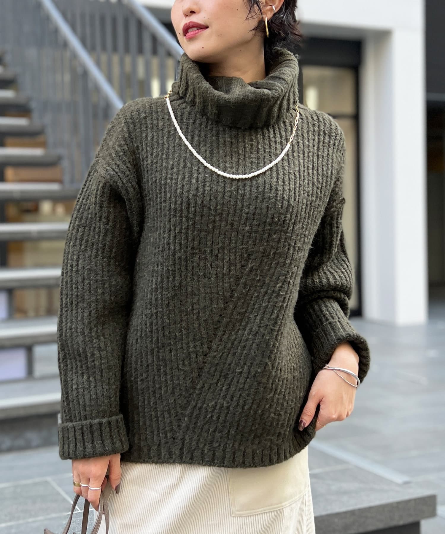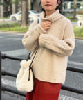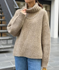 ボリューム感のあるオフタートルが特徴的なゆったりニット。