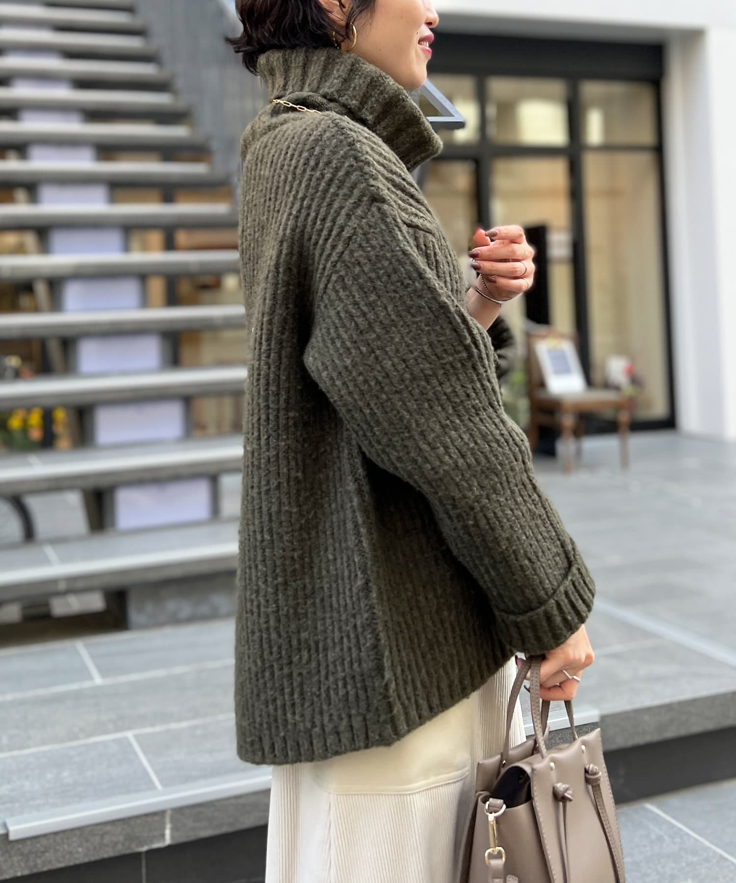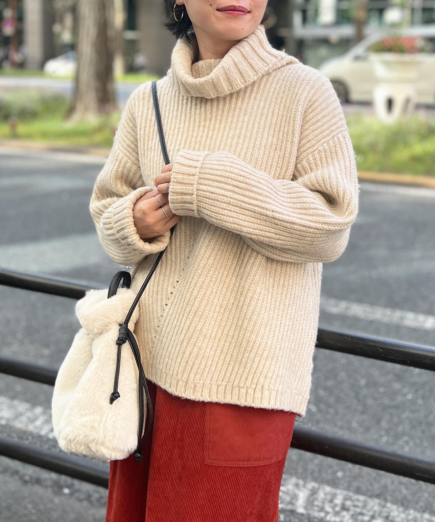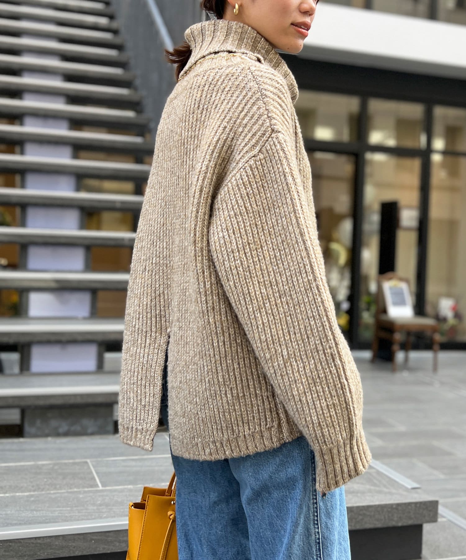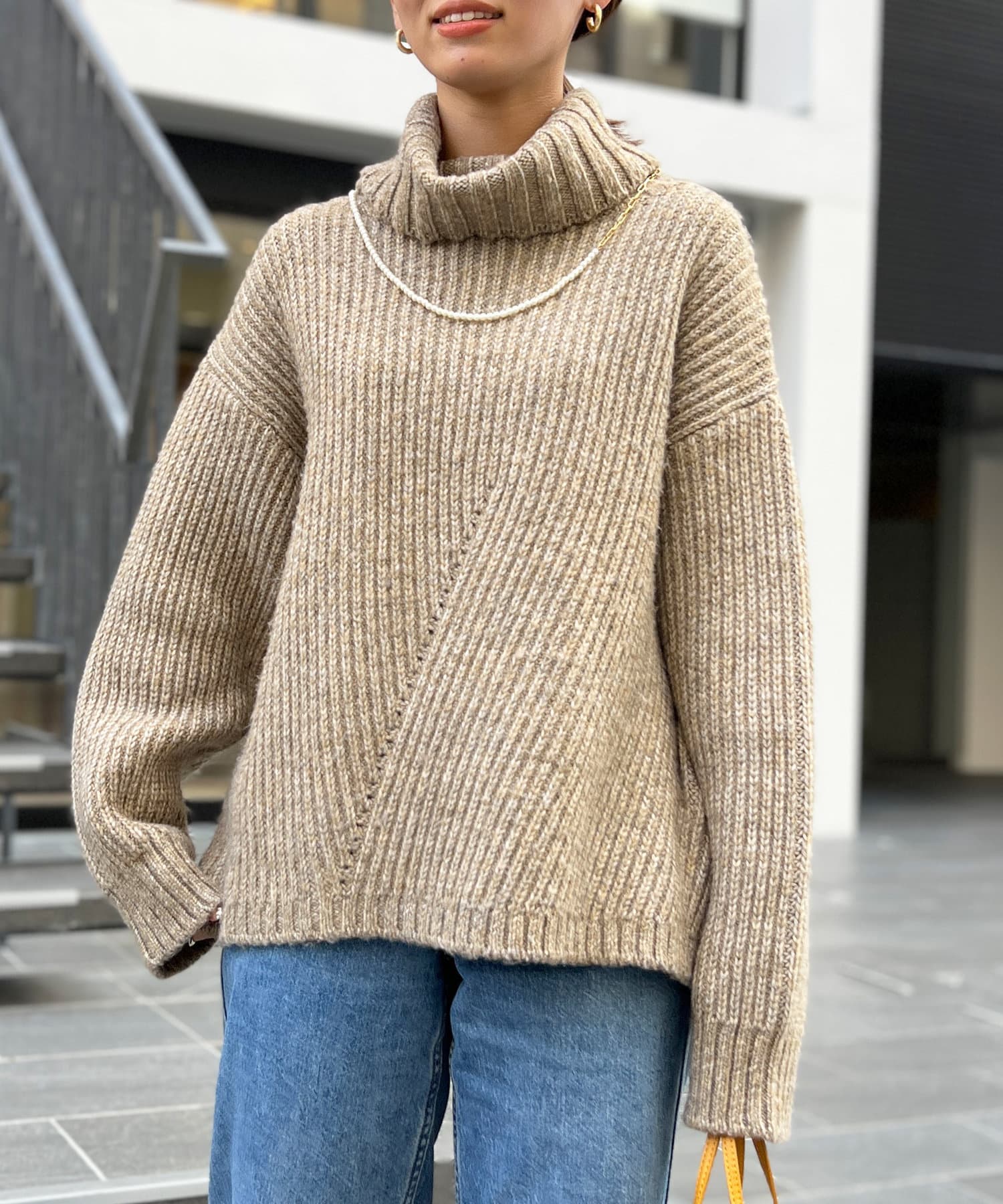 ボリューム感のあるオフタートルが特徴的なゆったりニット。