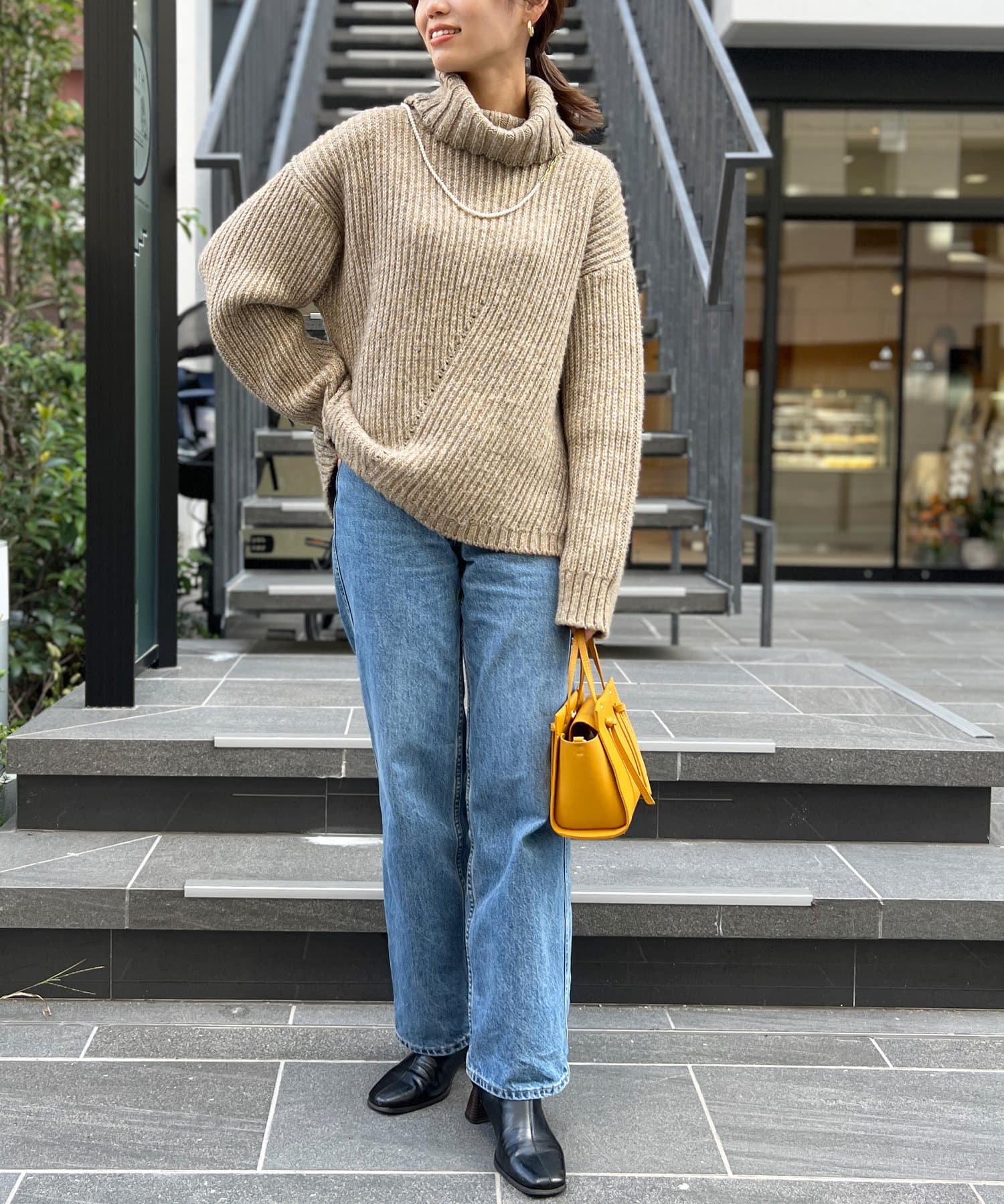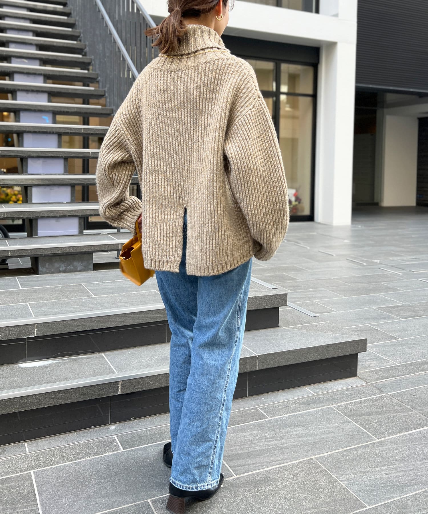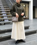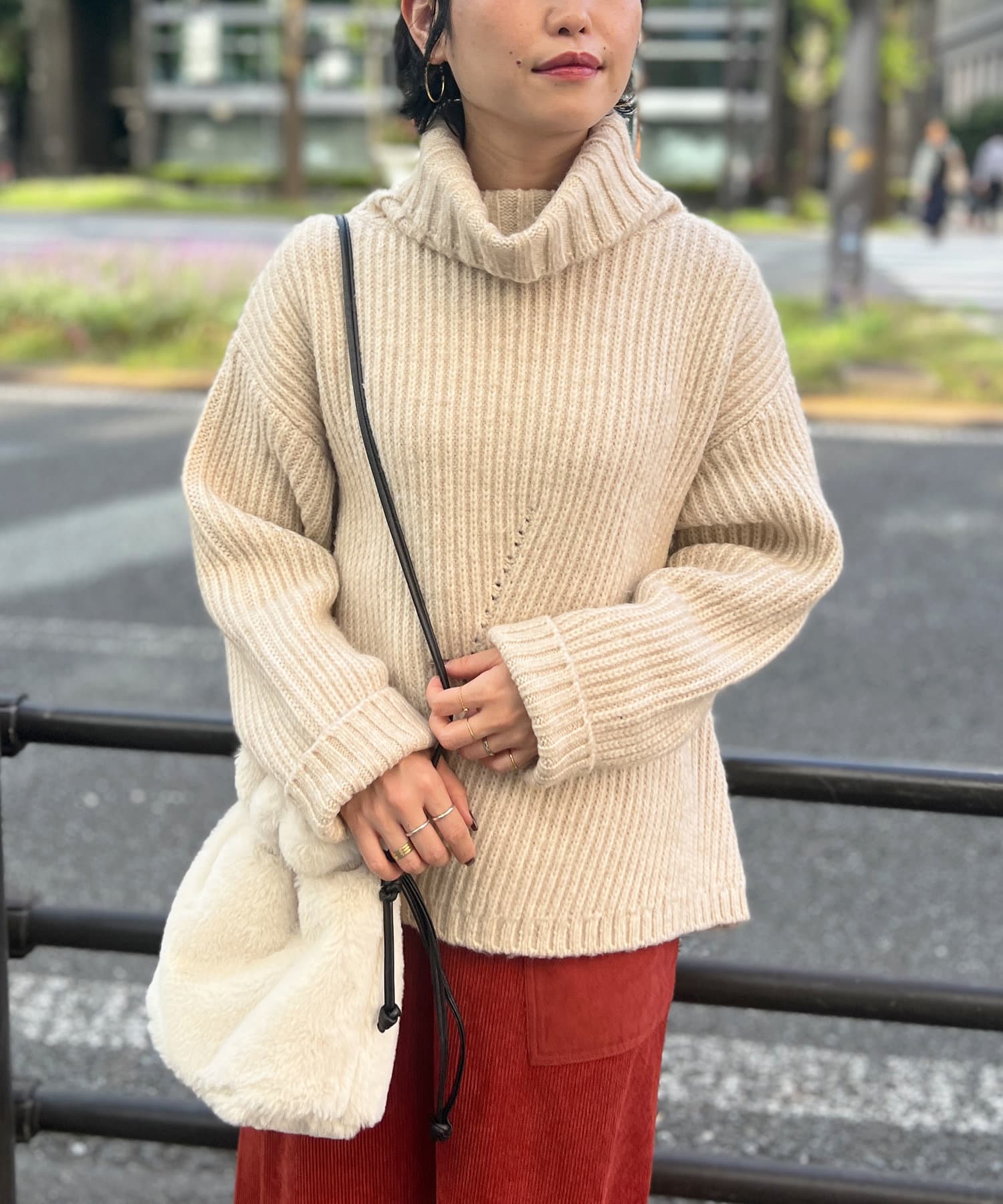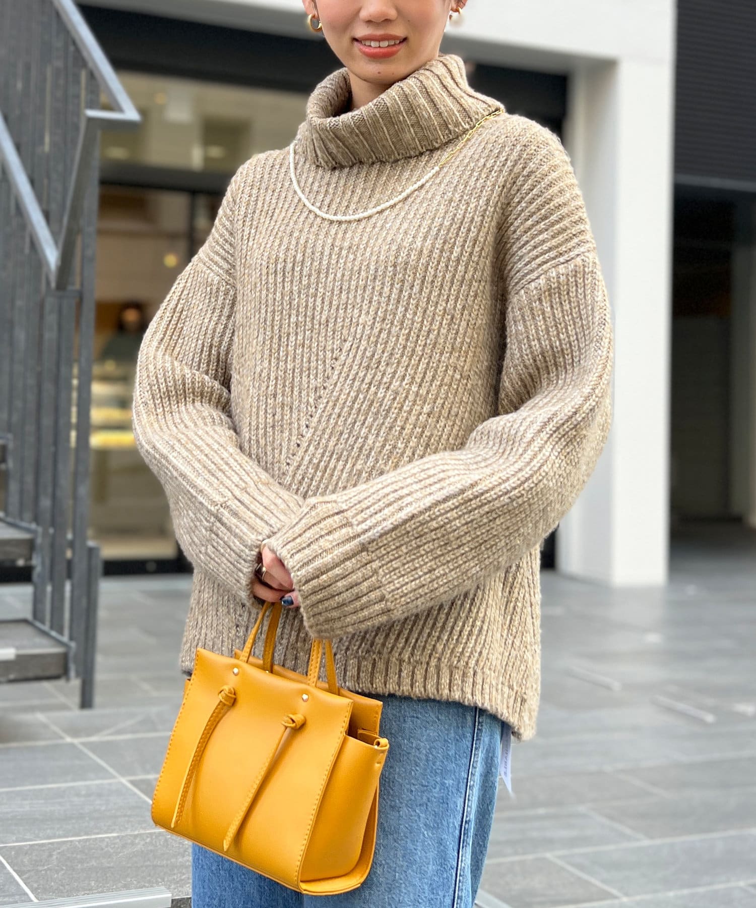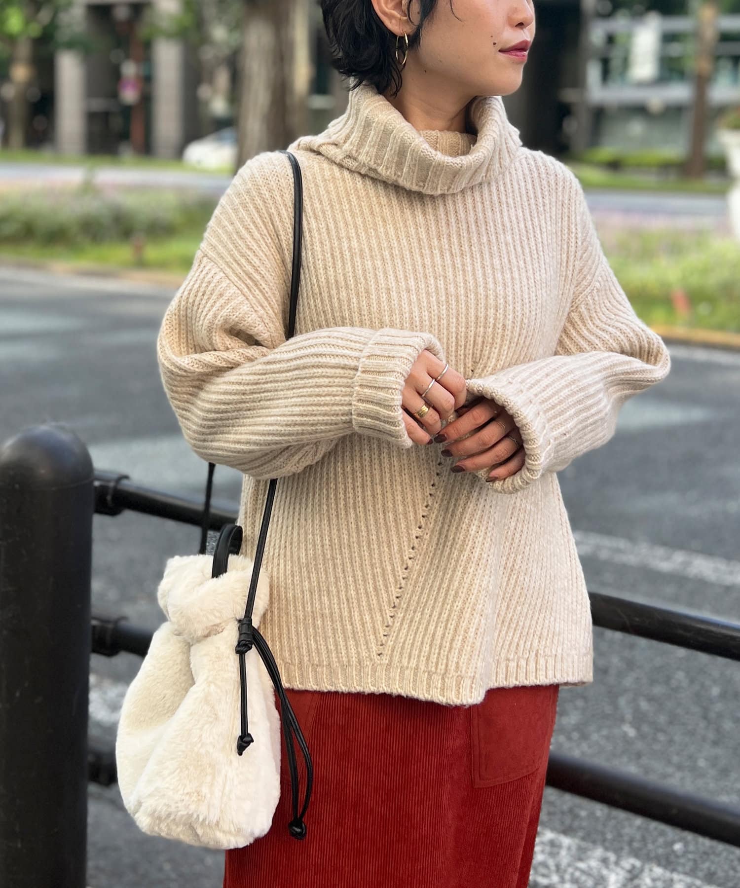 ボリューム感のあるオフタートルが特徴的なゆったりニット。