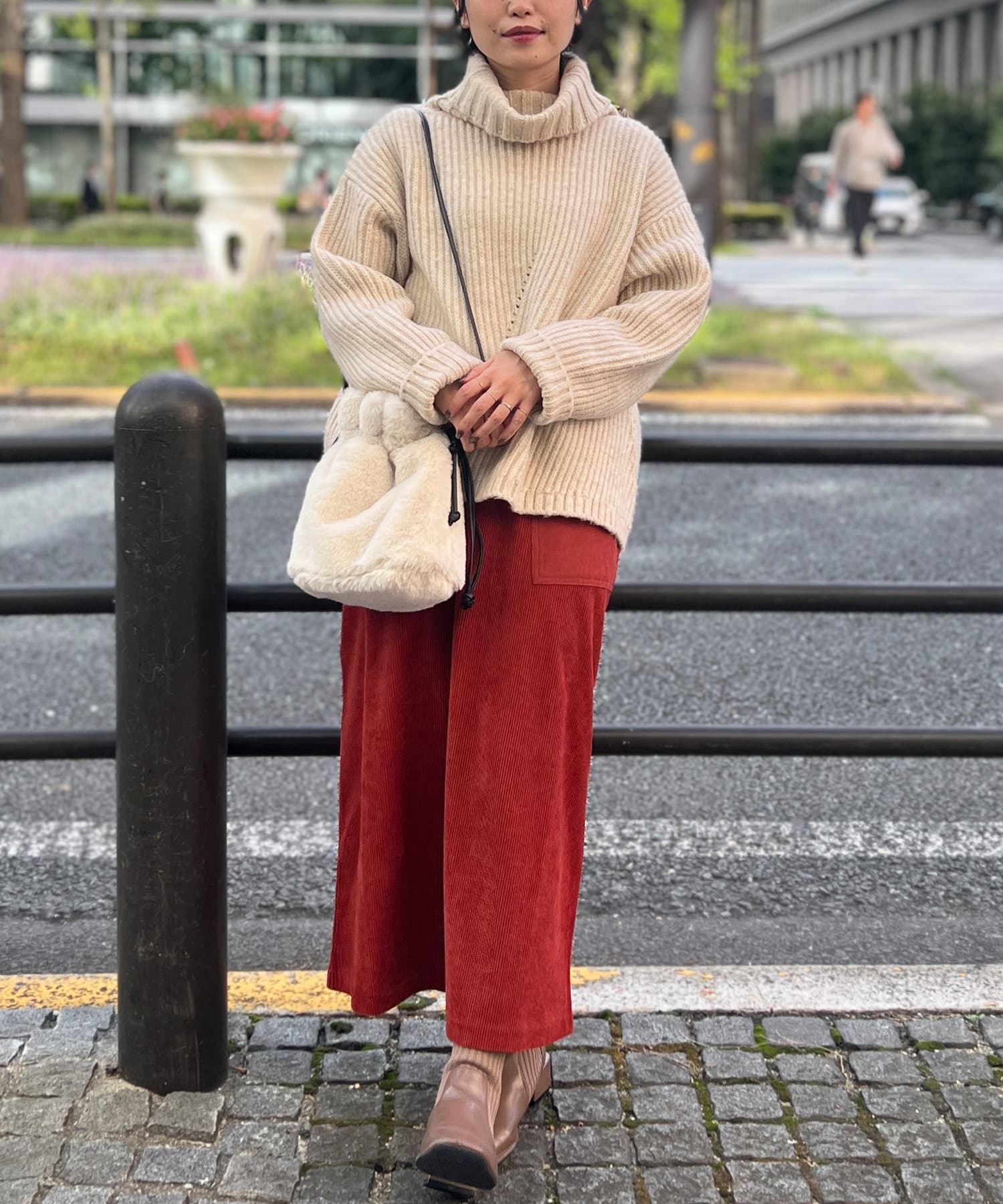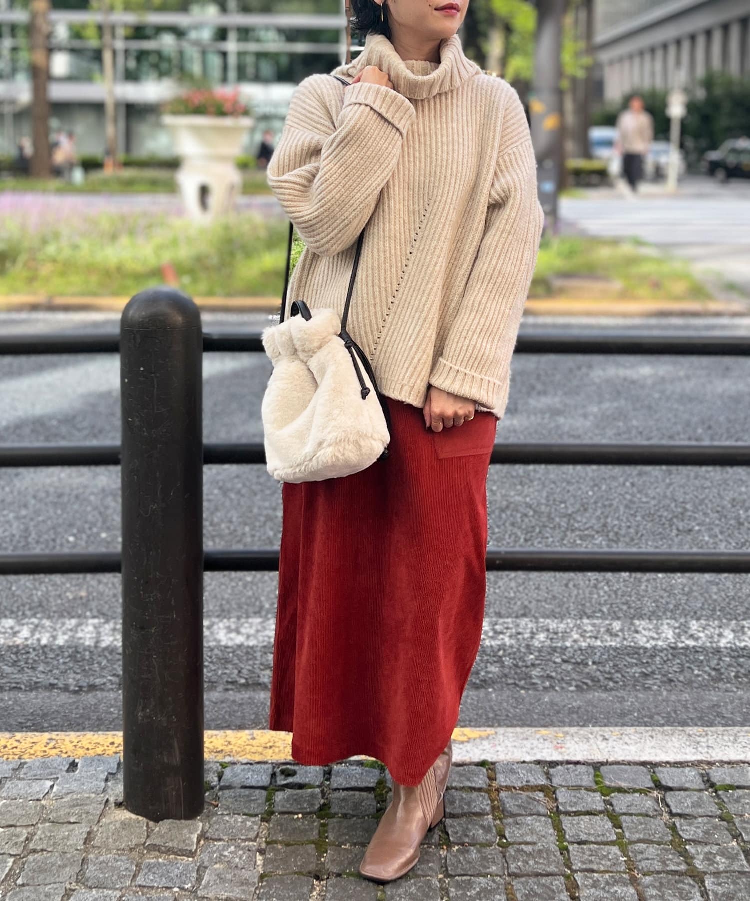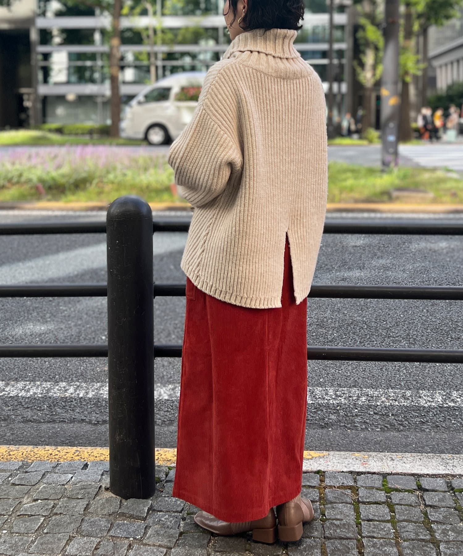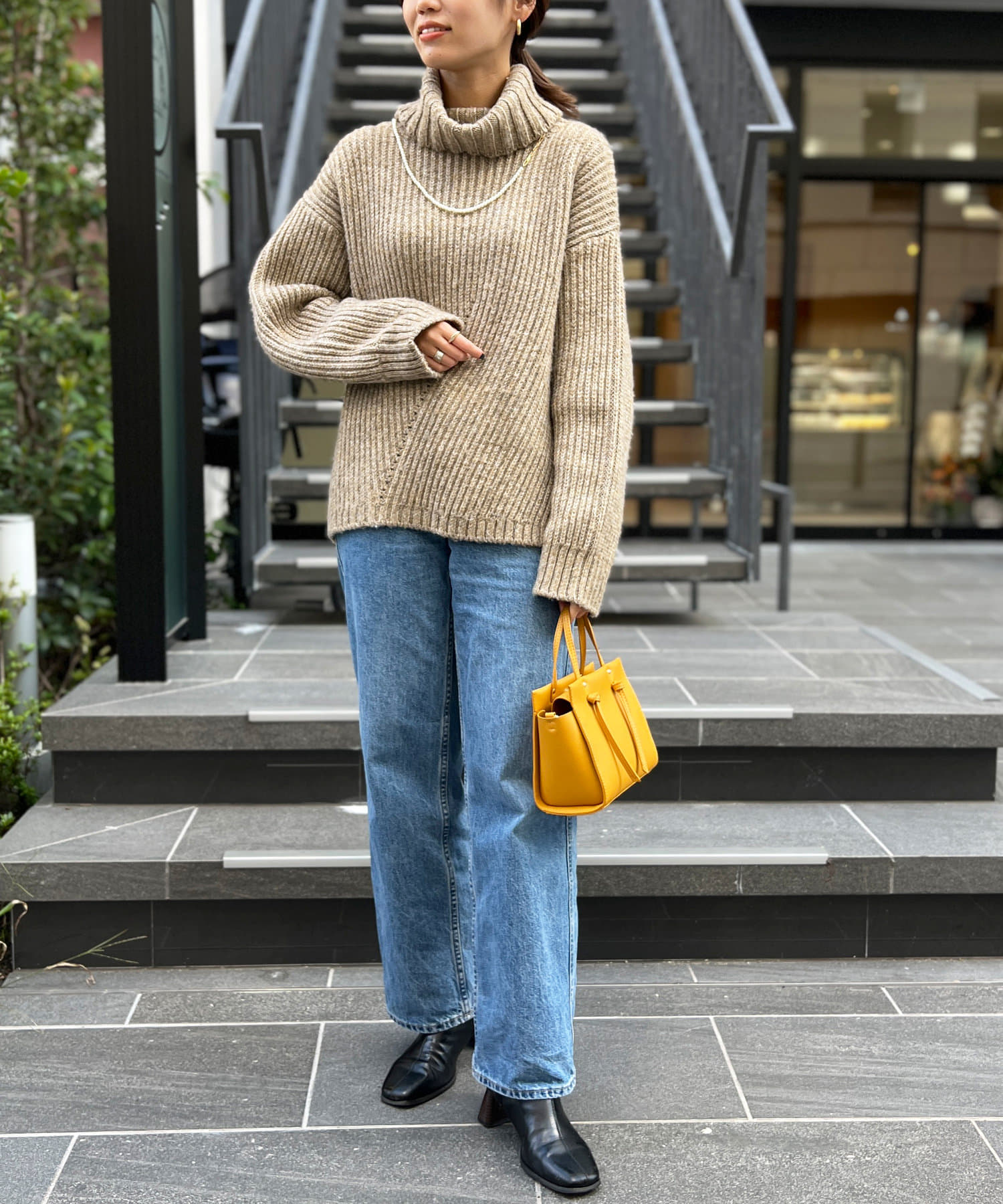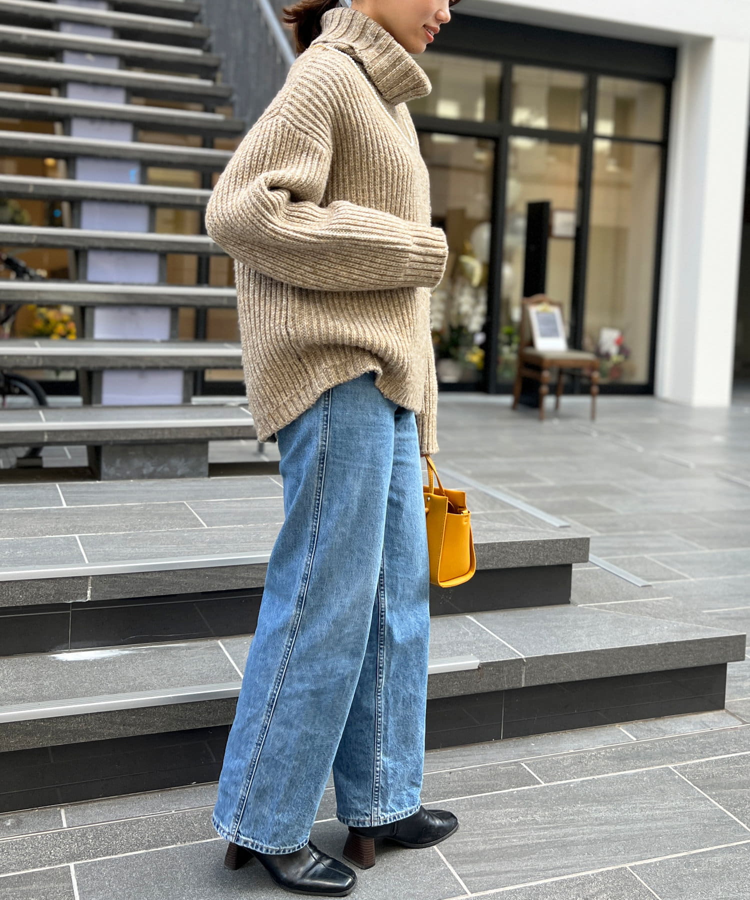 ボリューム感のあるオフタートルが特徴的なゆったりニット。