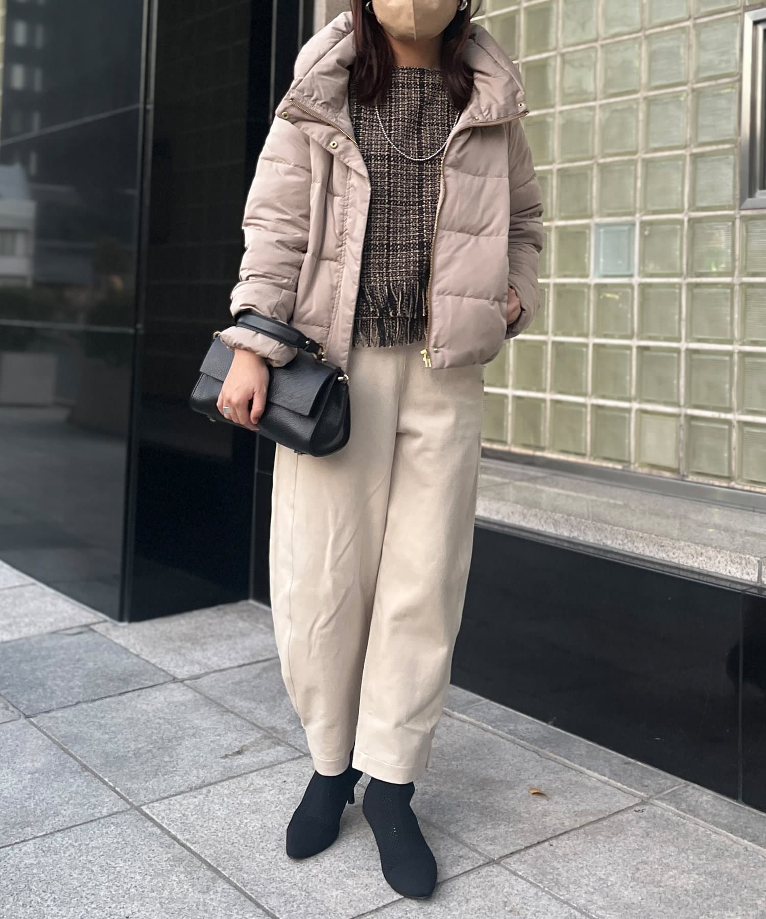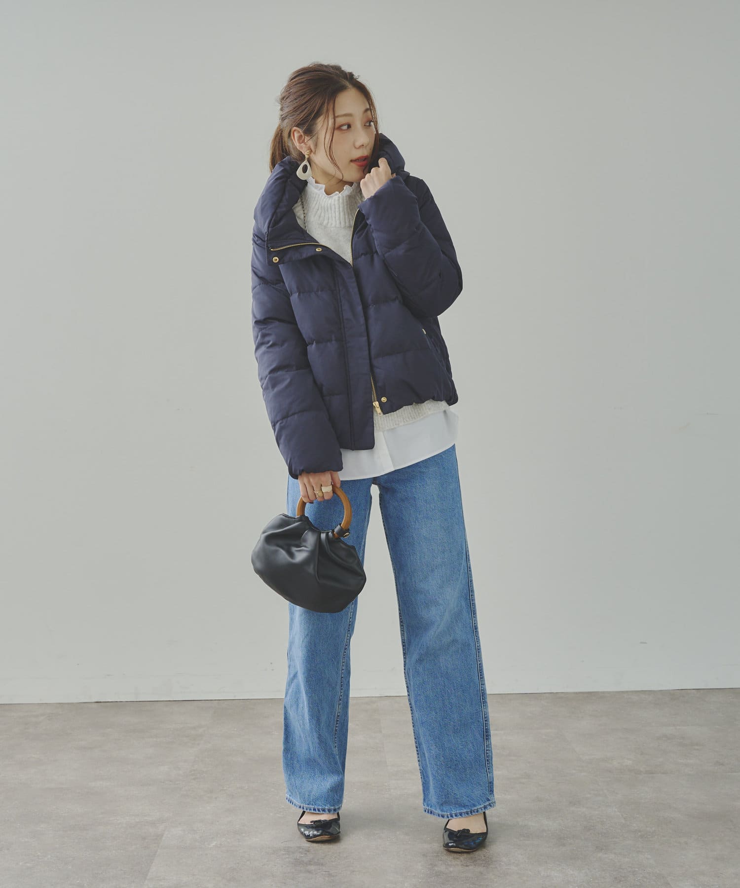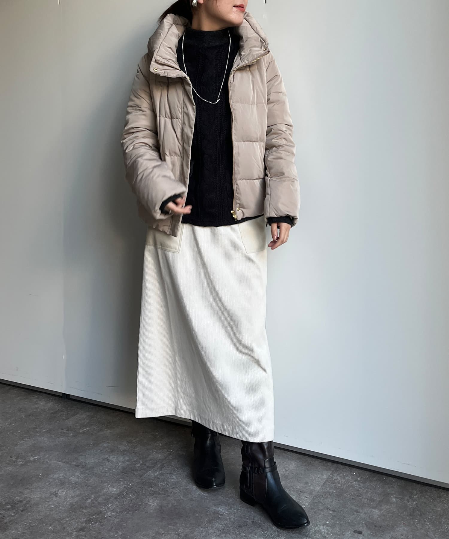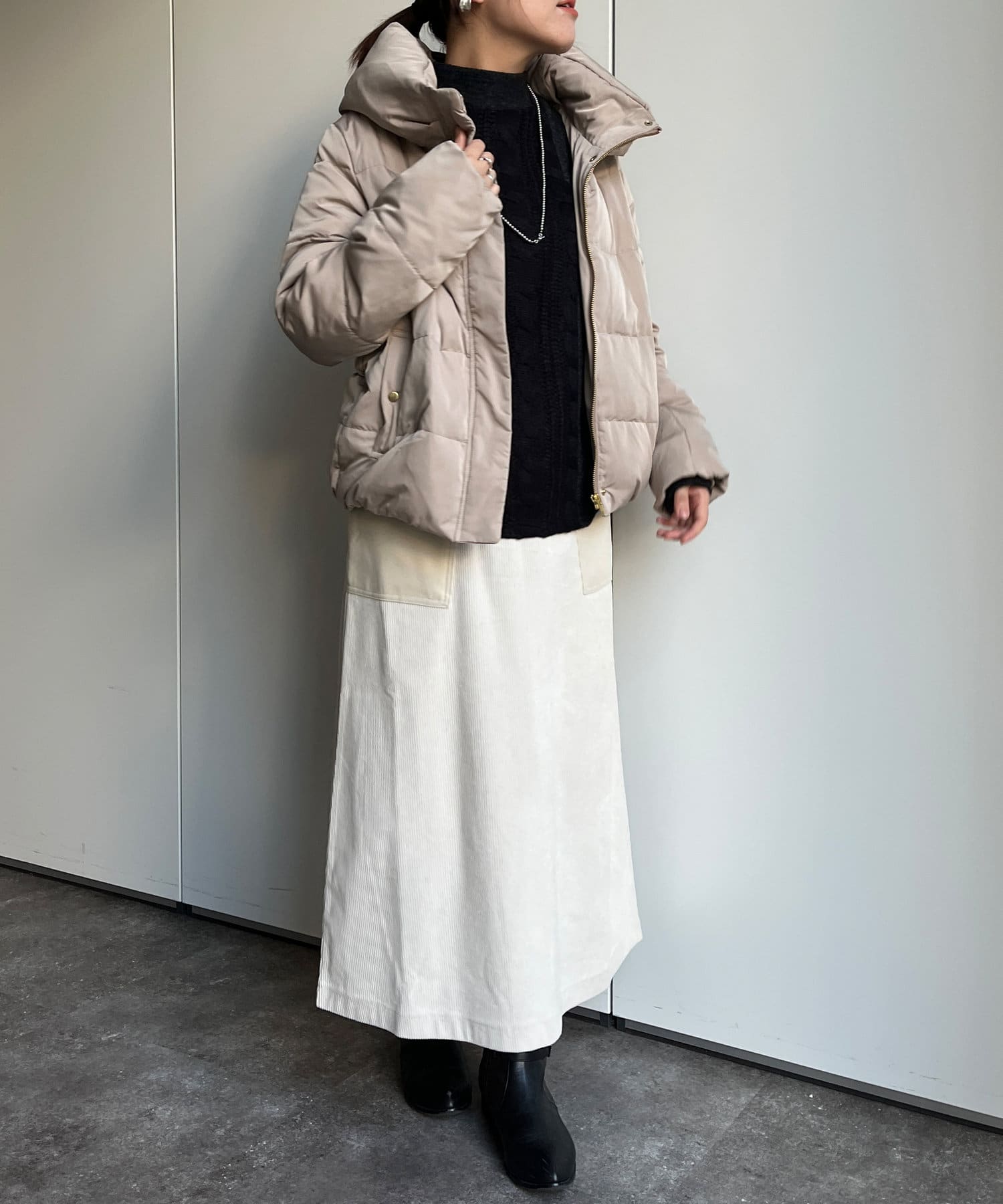 短めの着丈に首元でのボリューム感はロングボトムスやワイドシルエットのボトムスと相性抜群!