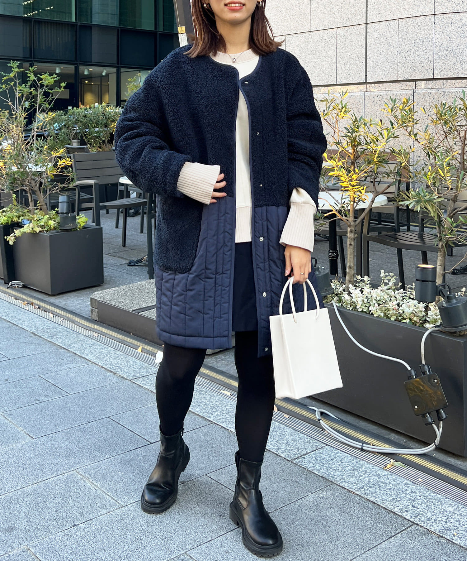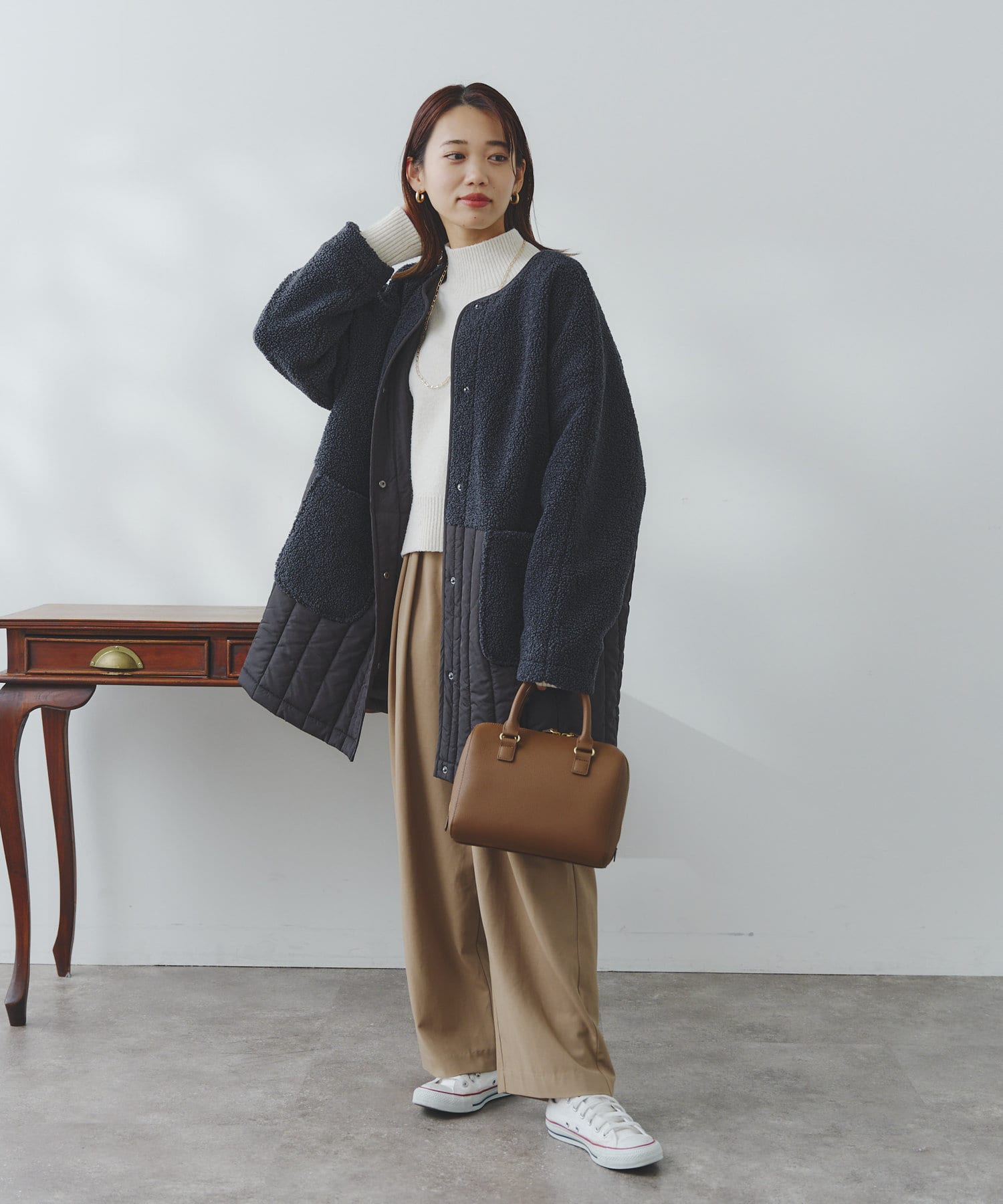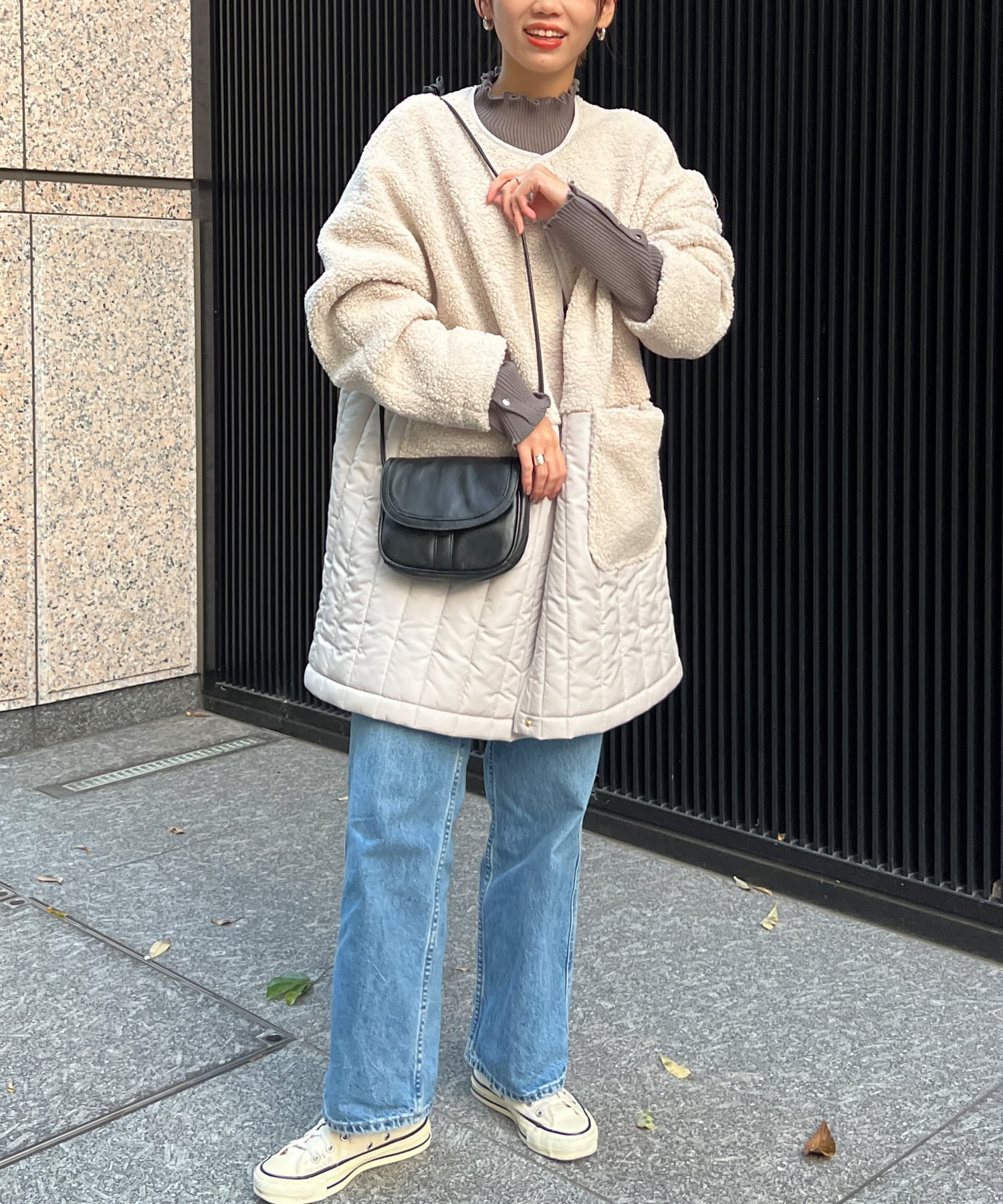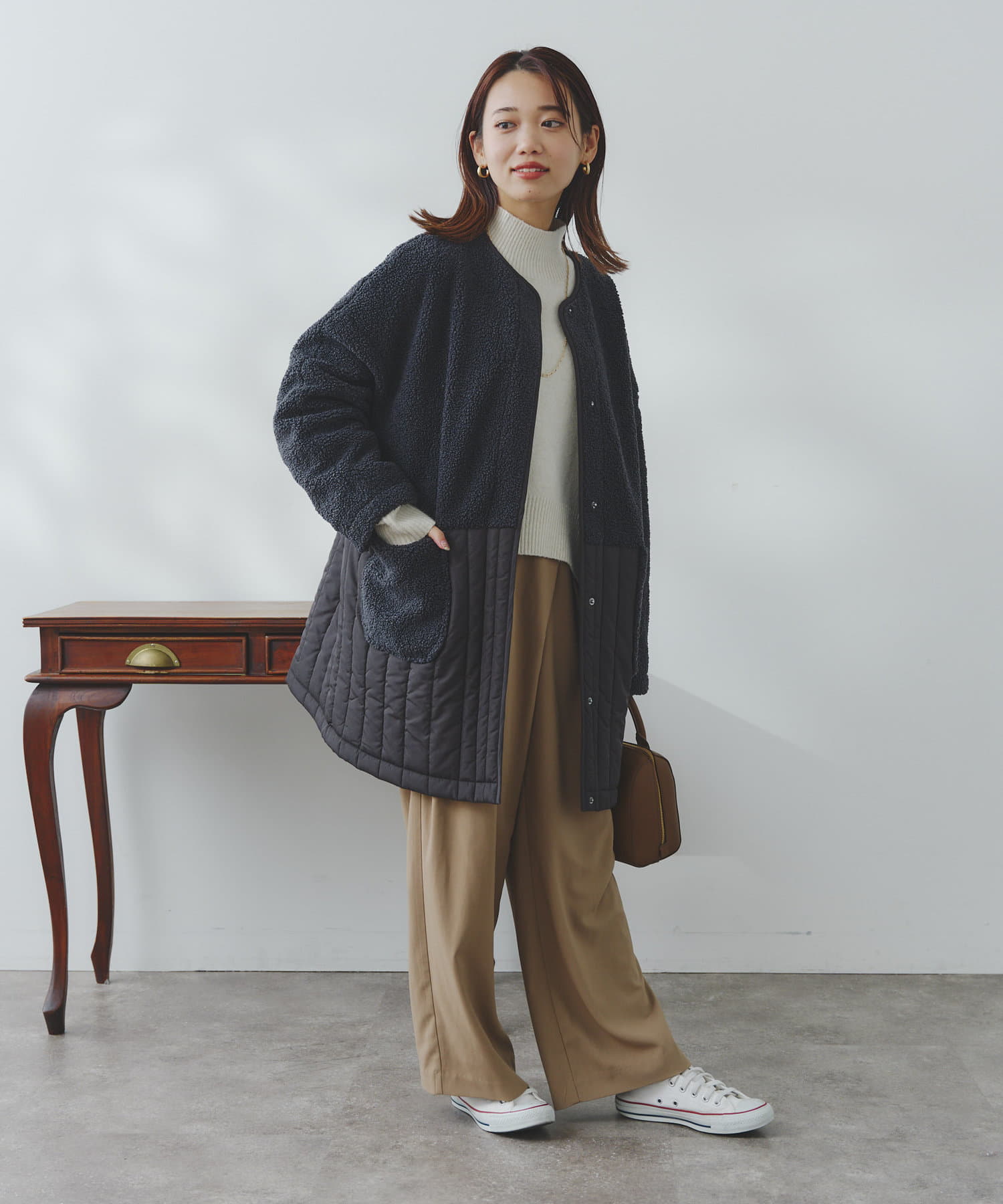 トレンドライクな異素材の組み合わせですが、同系色の微配色の為コーディネートに使いやすく、デイリーに活躍する1着です。
