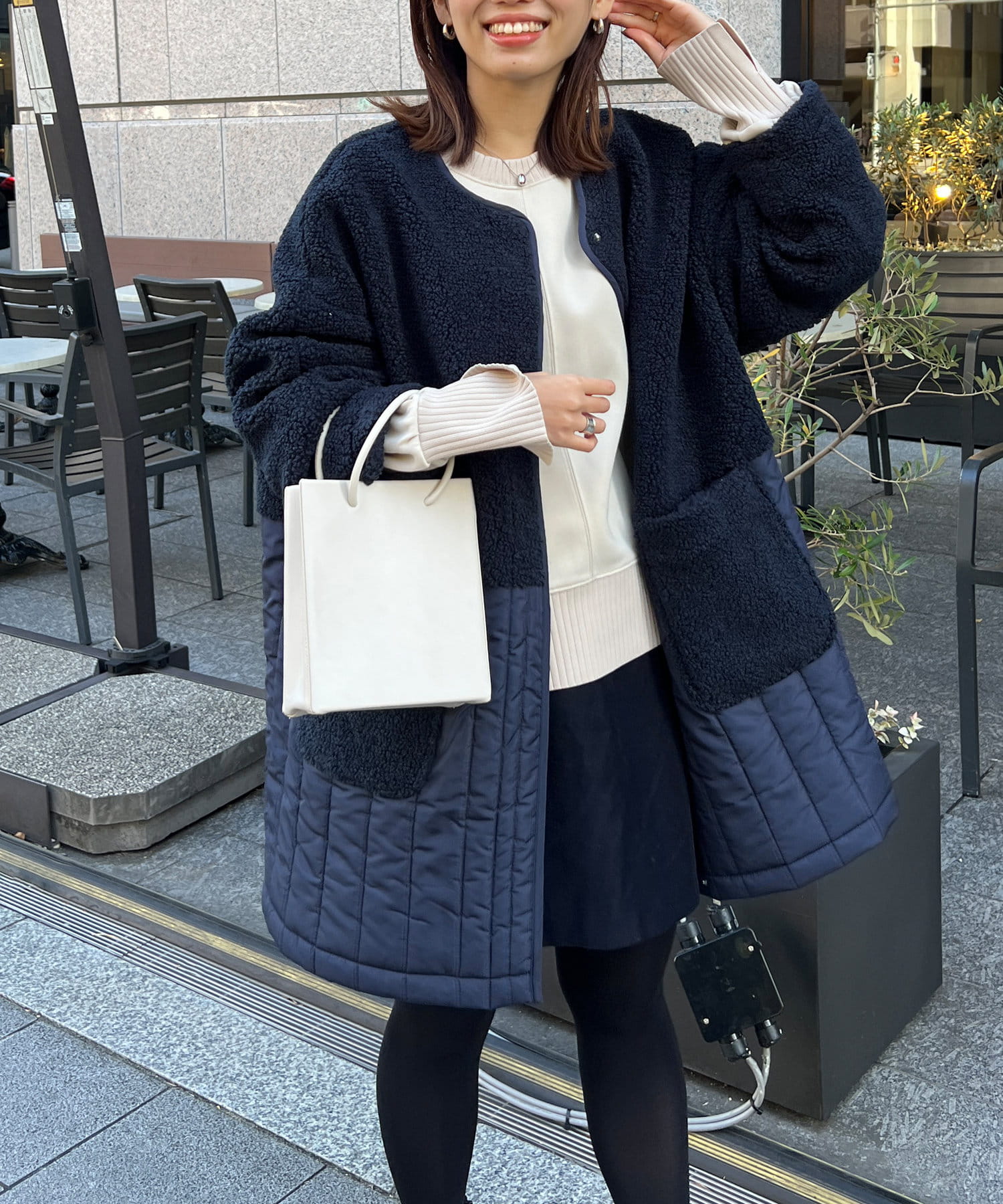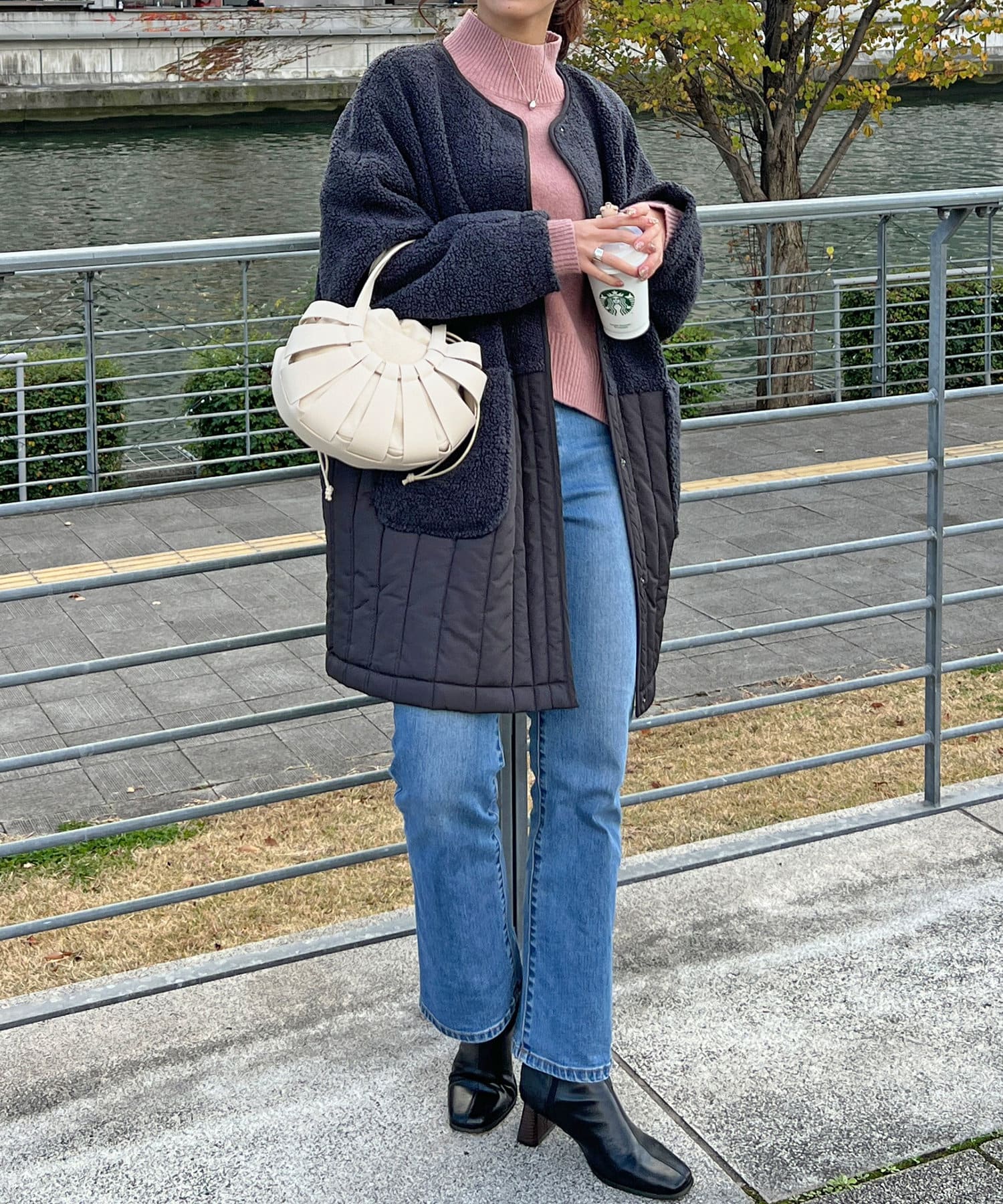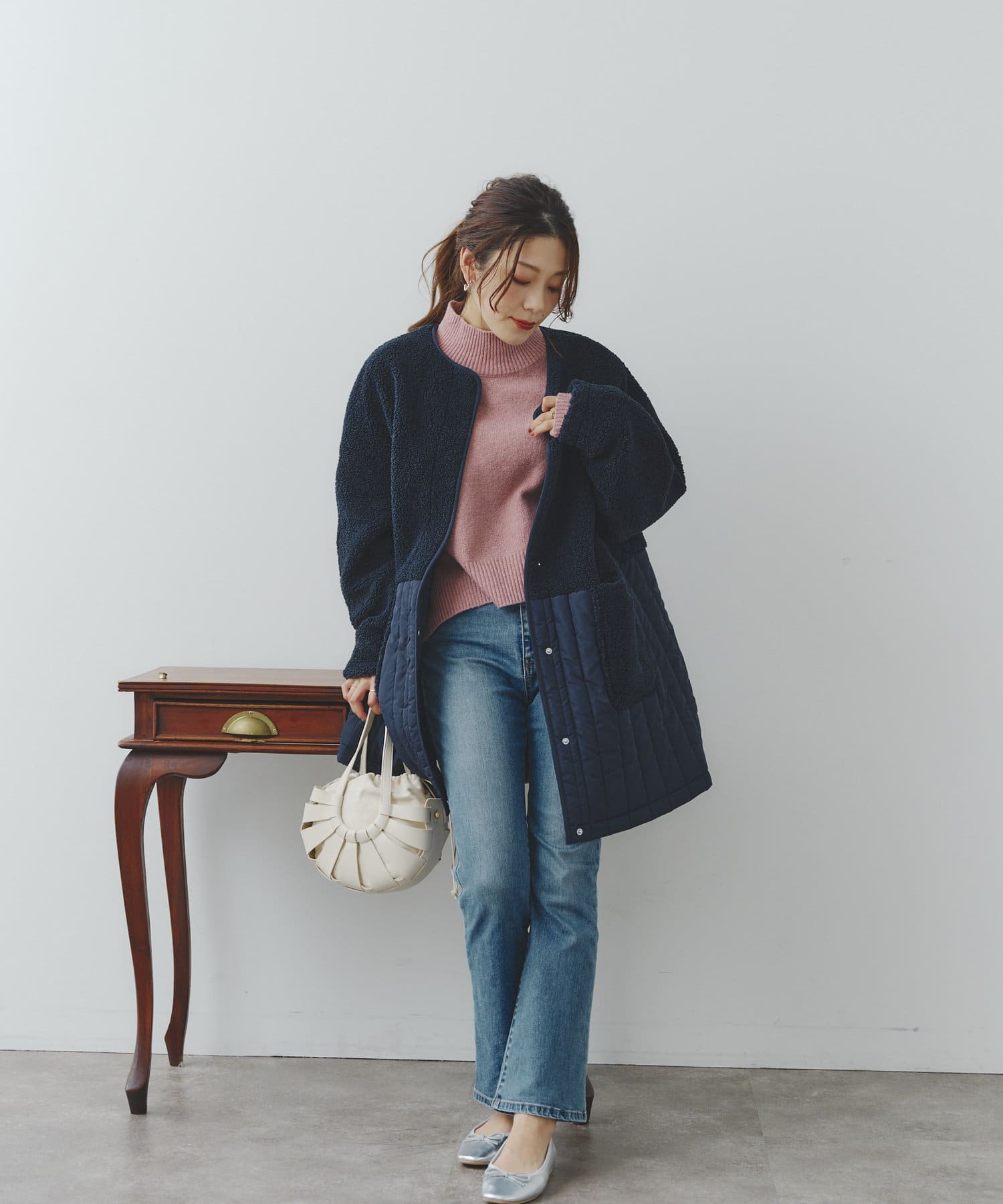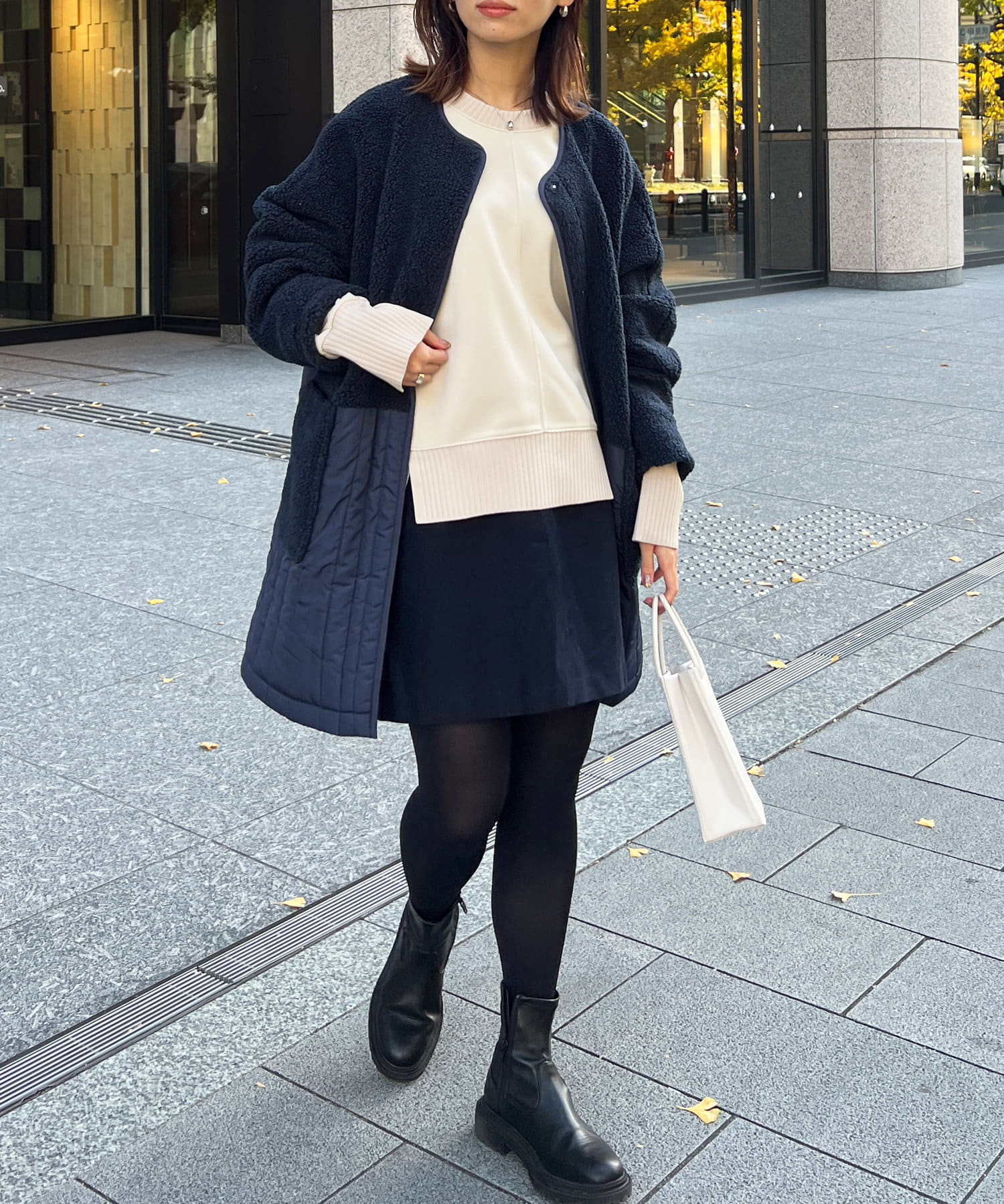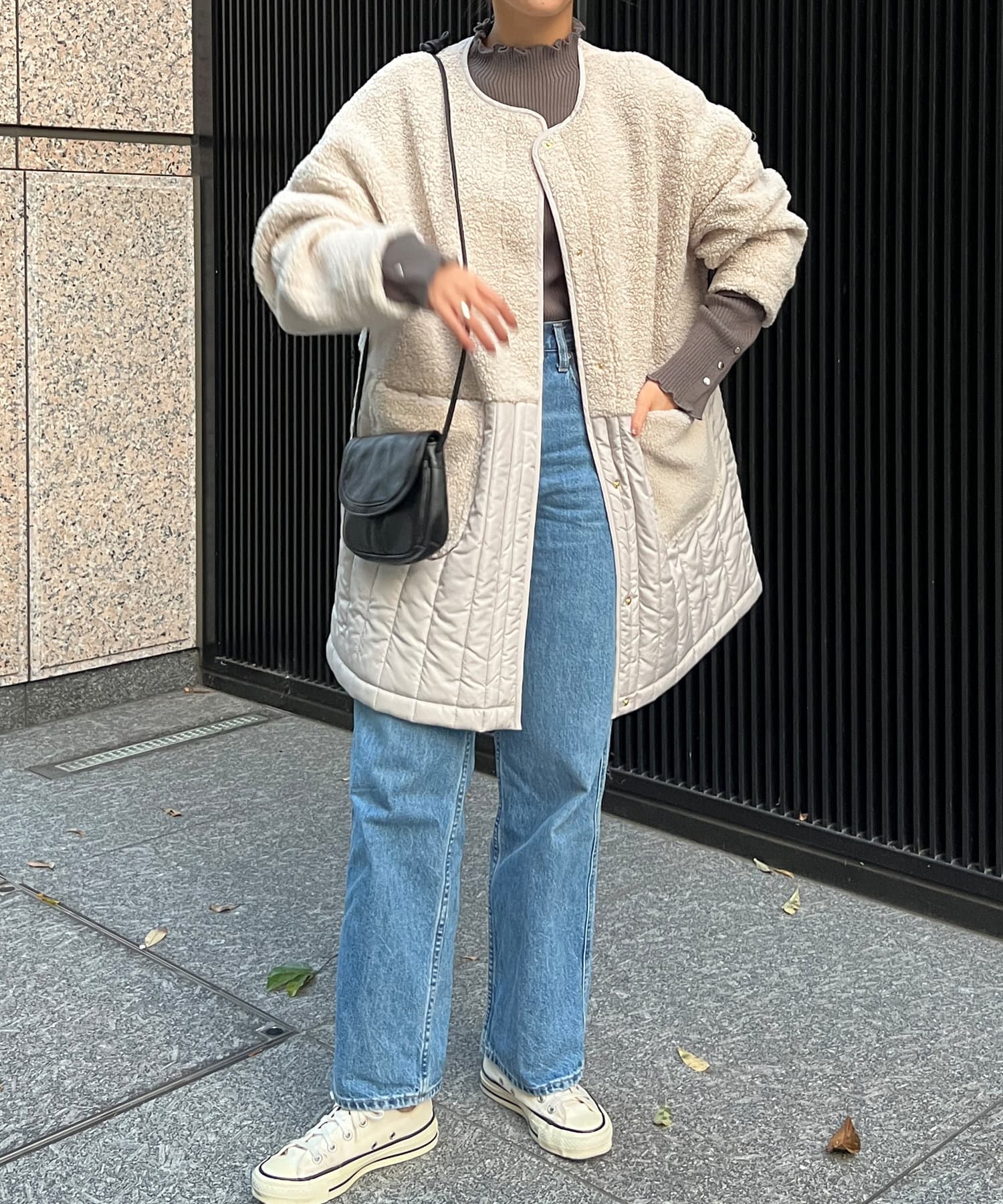 トレンドライクな異素材の組み合わせですが、同系色の微配色の為コーディネートに使いやすく、デイリーに活躍する1着です。