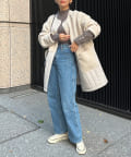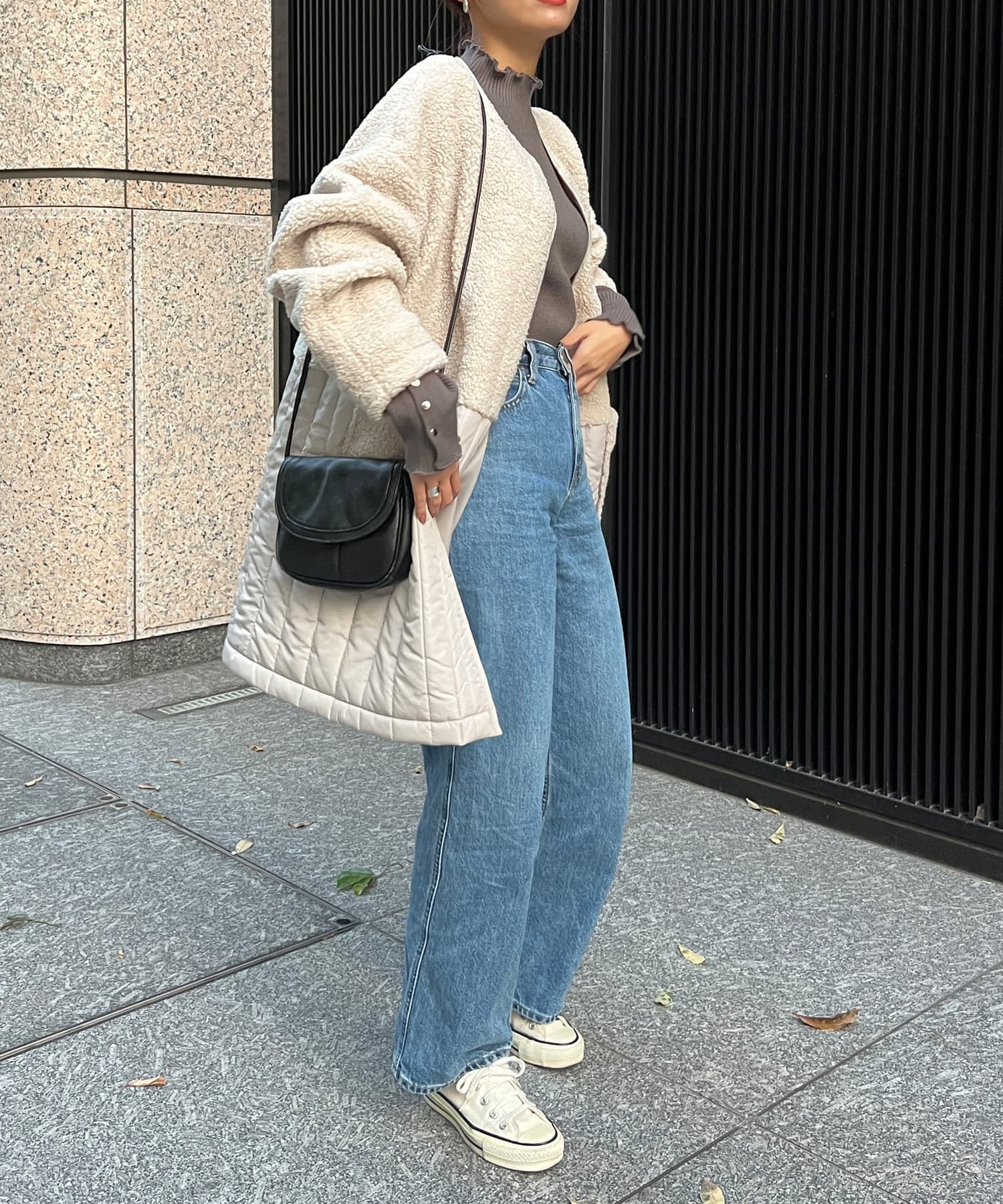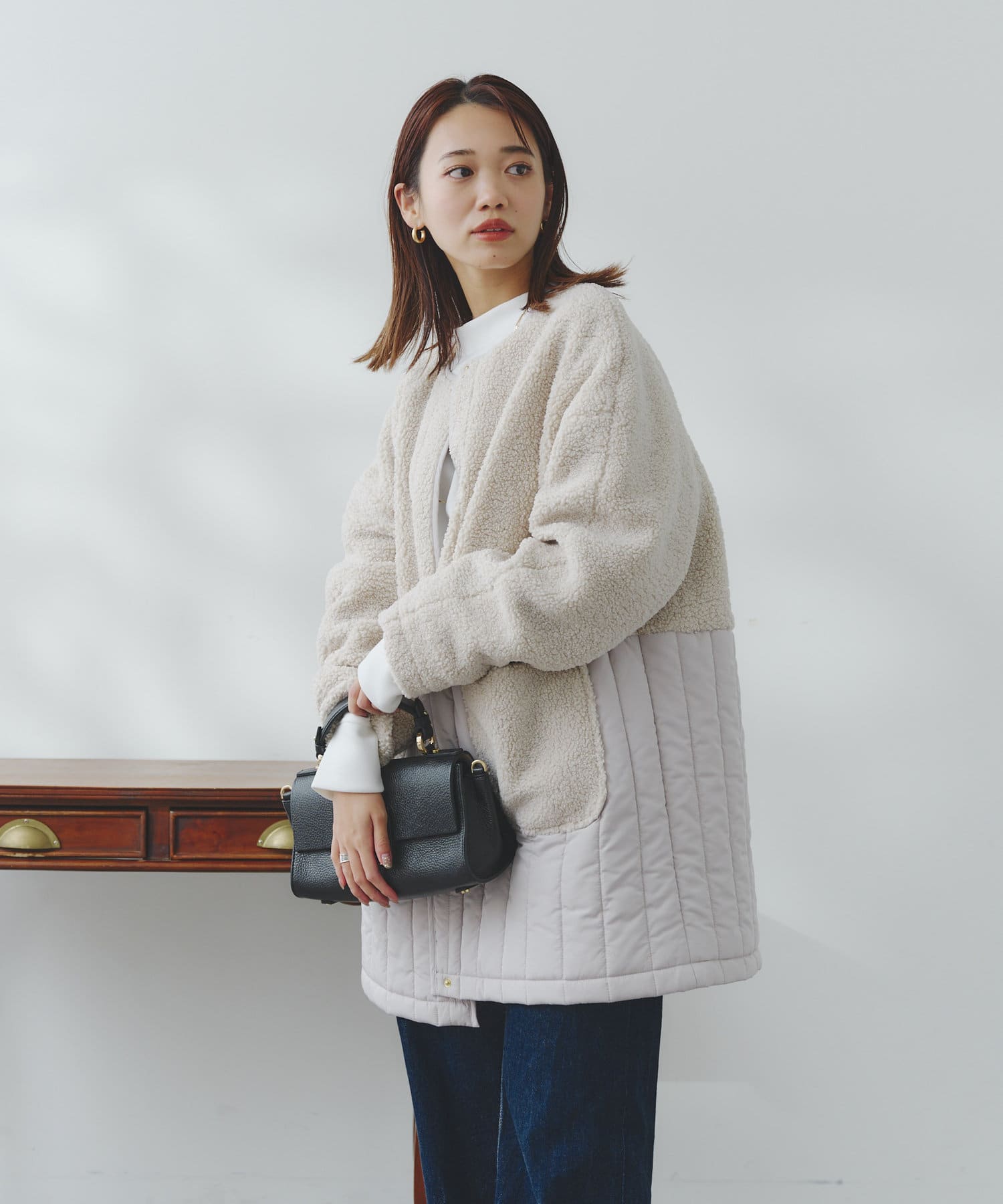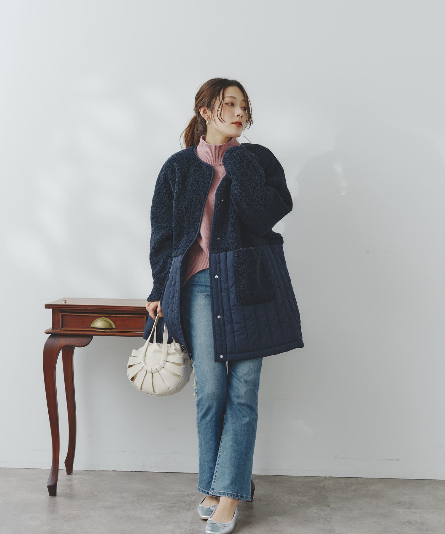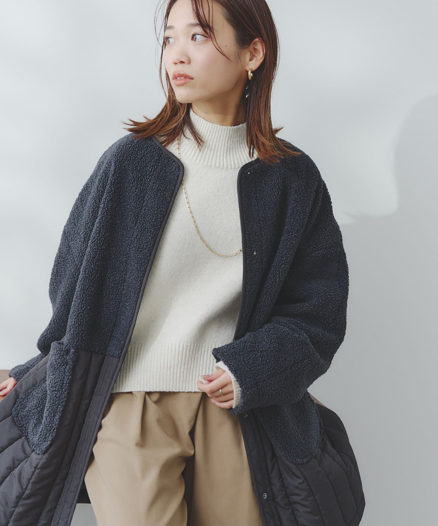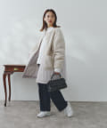 トレンドライクな異素材の組み合わせですが、同系色の微配色の為コーディネートに使いやすく、デイリーに活躍する1着です。