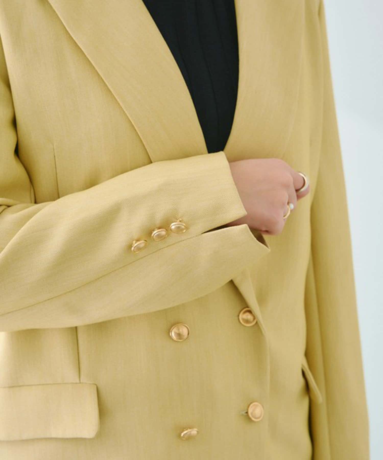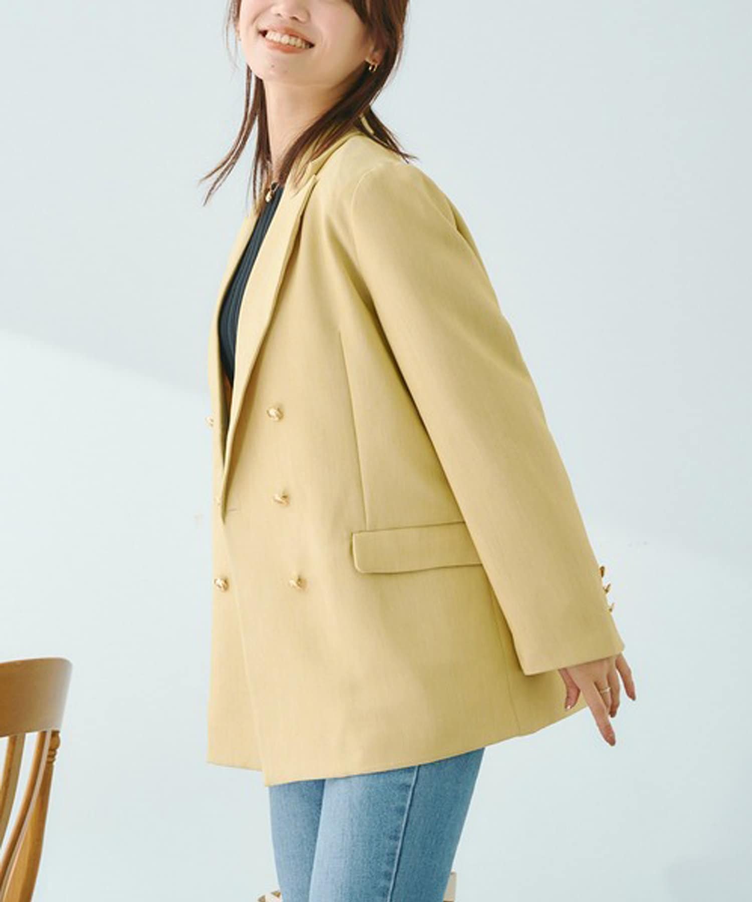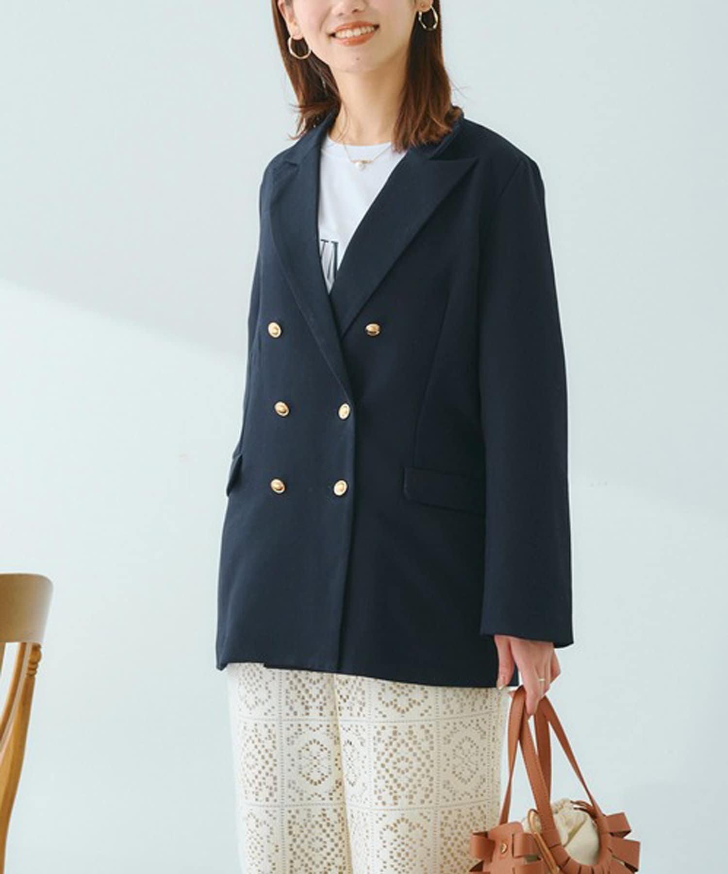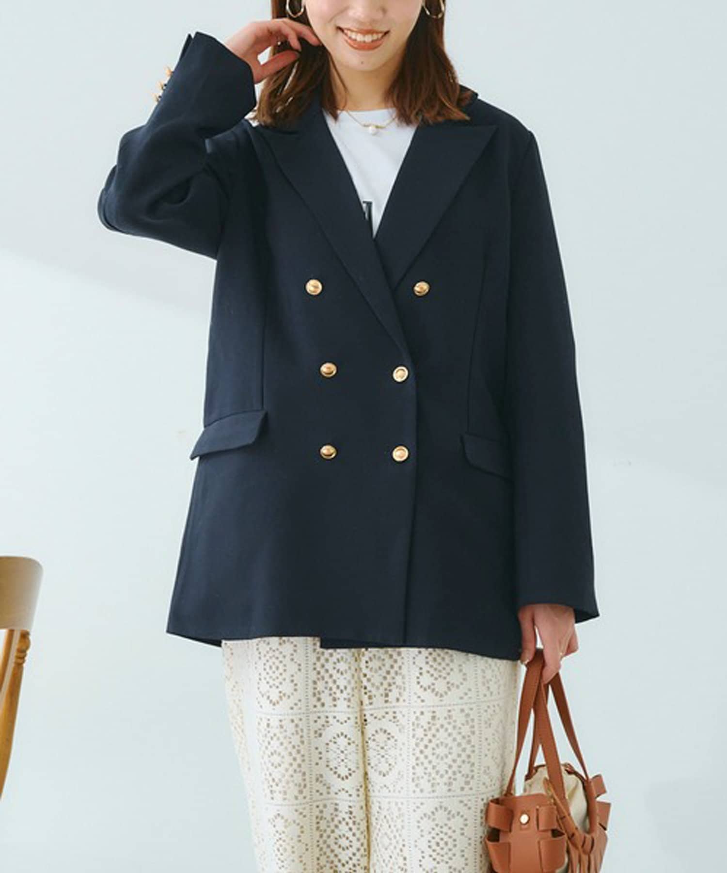 ゴールドボタンがアクセントになるダブルテーラードジャケット。
