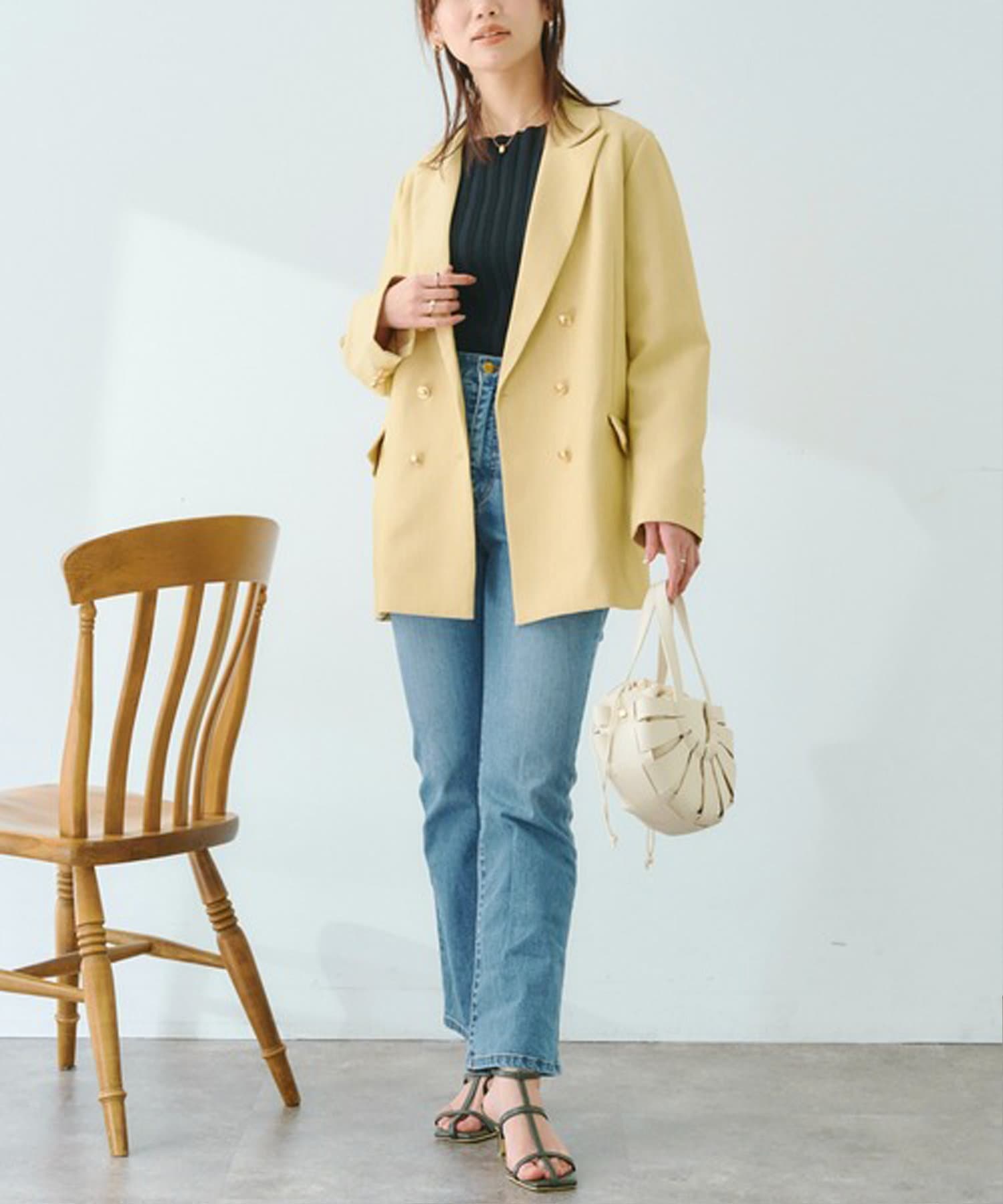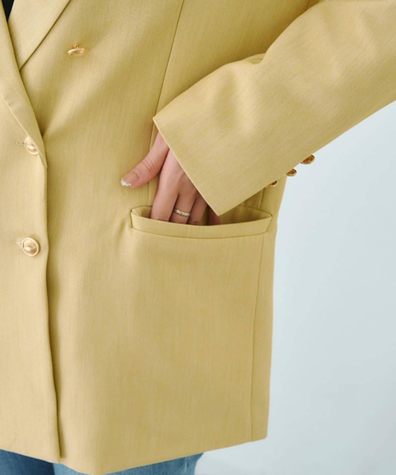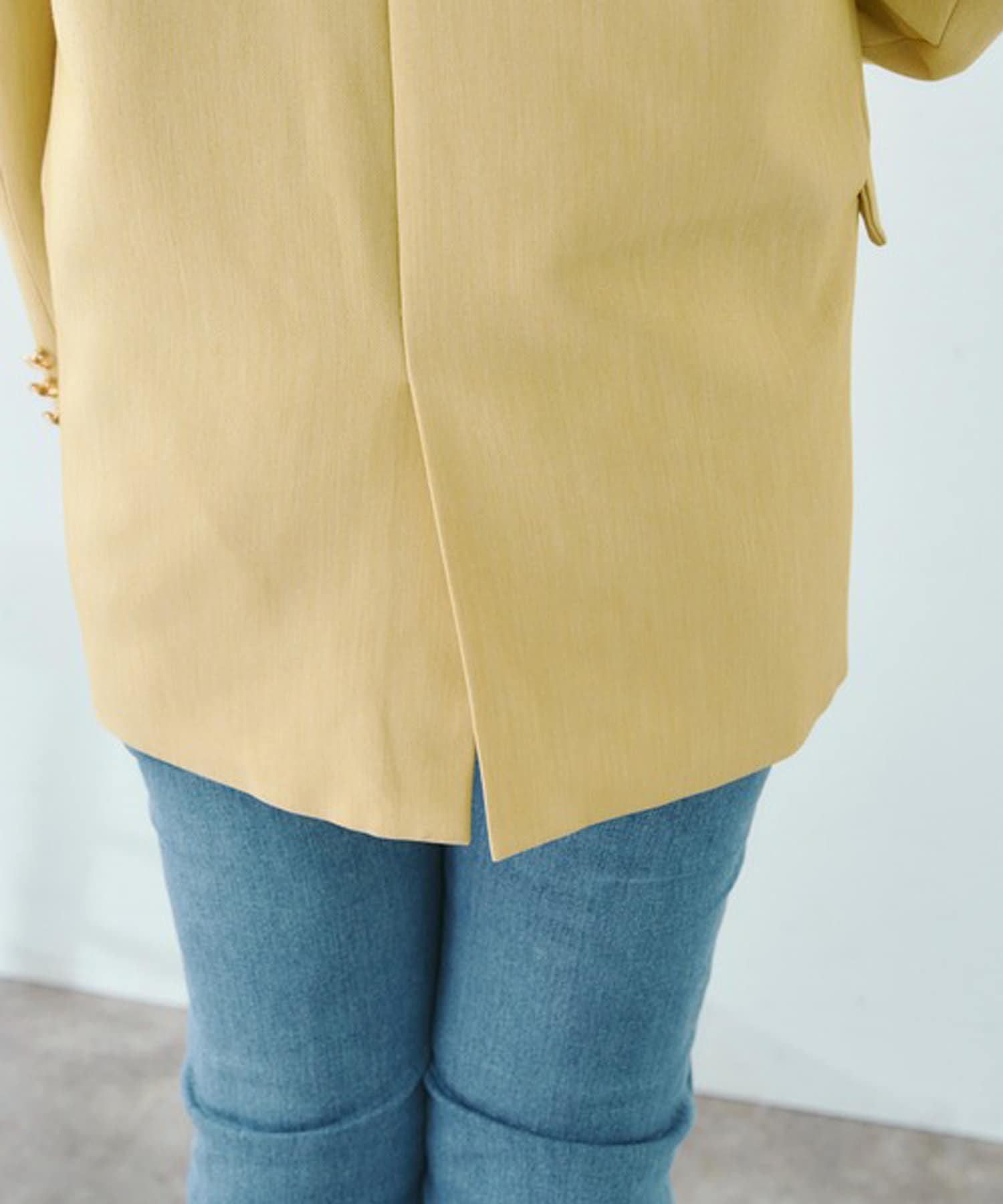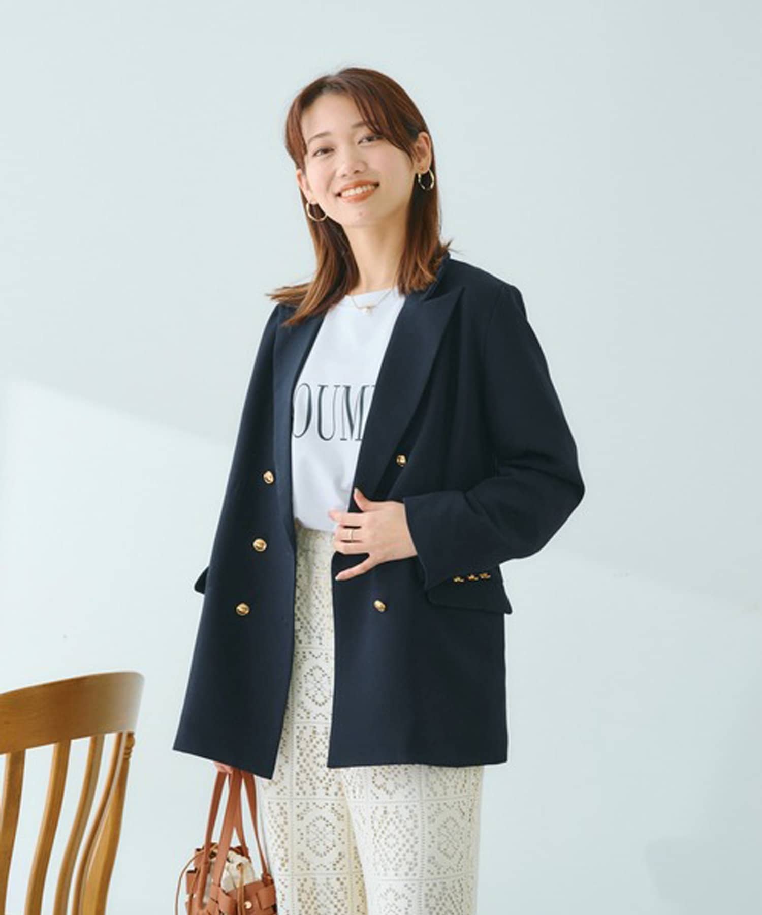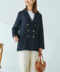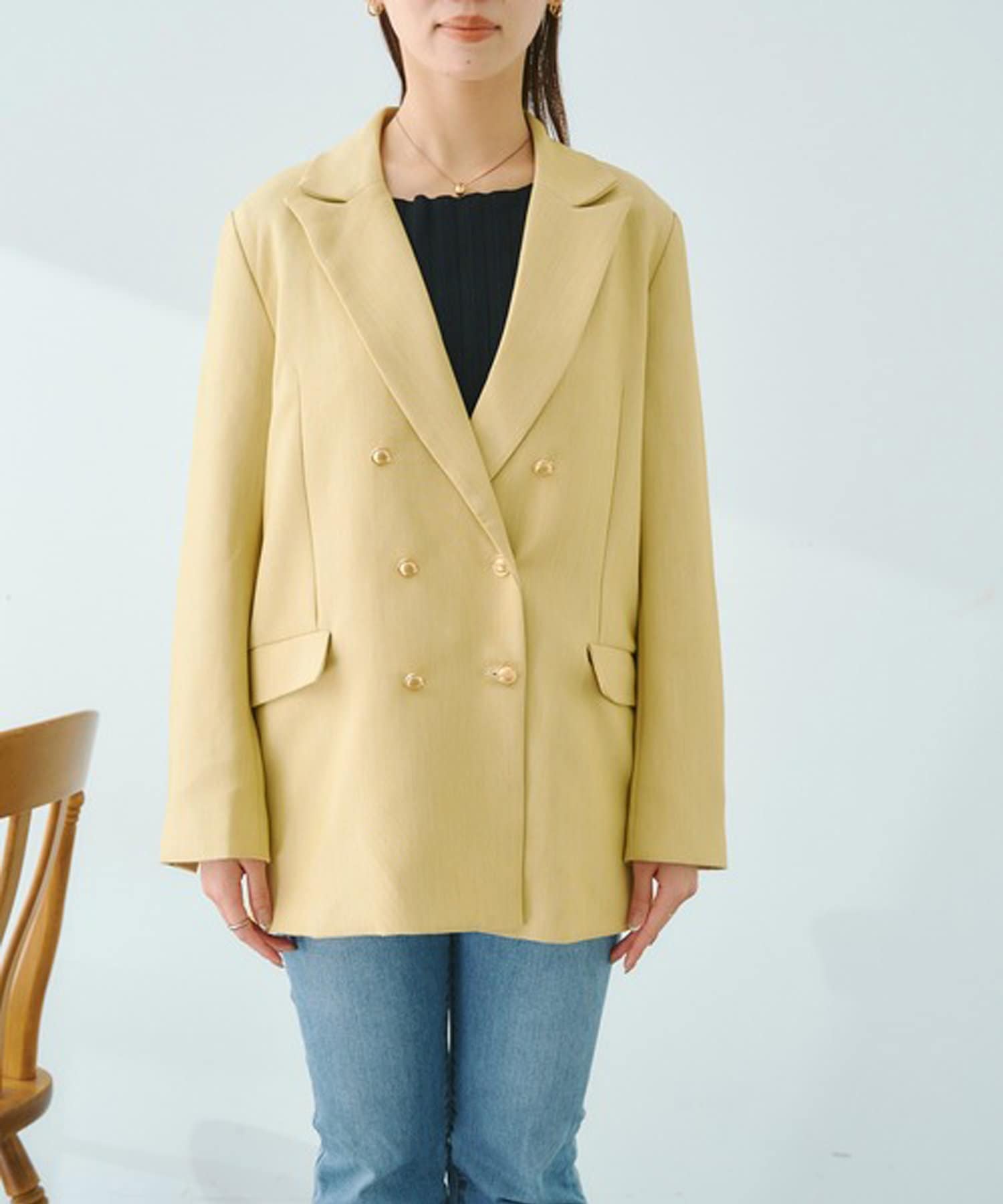 ゴールドボタンがアクセントになるダブルテーラードジャケット。
