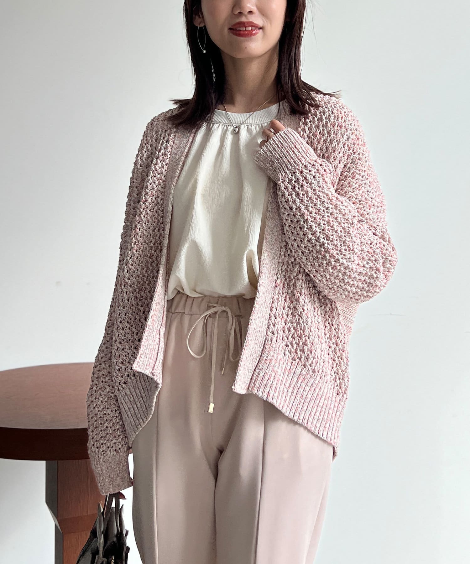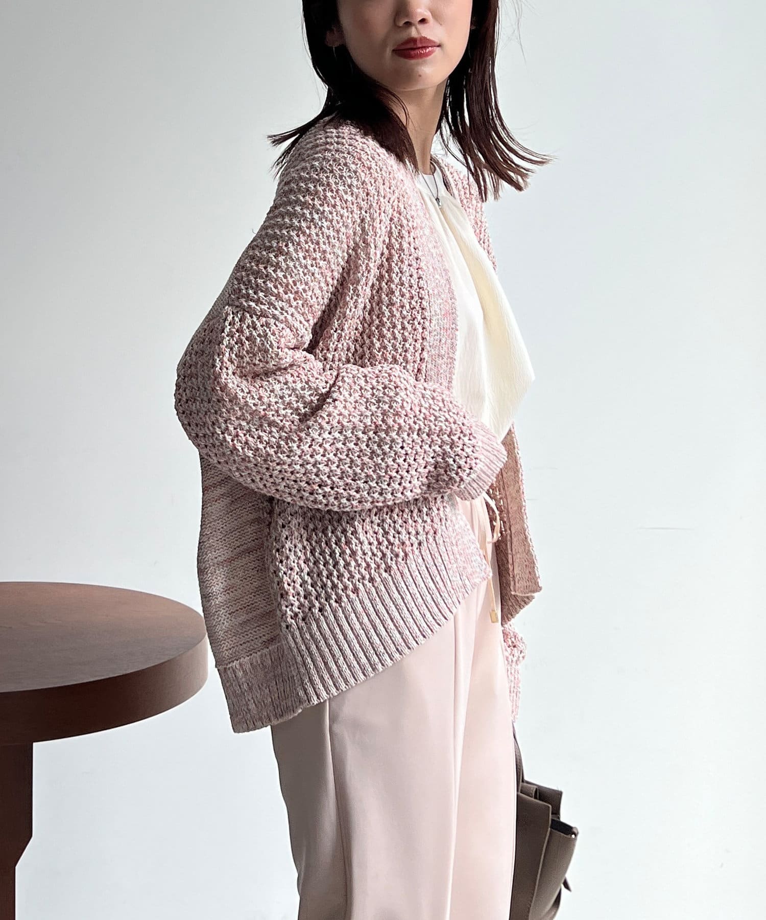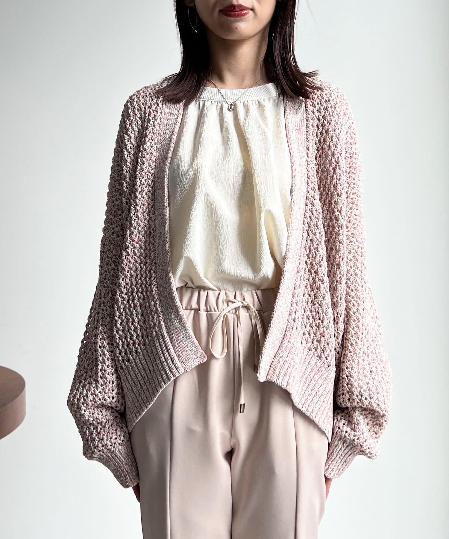 ボタンの無いショールタイプのざっくりとしたシルエットで、ナチュラルな雰囲気で合わせていただけます。