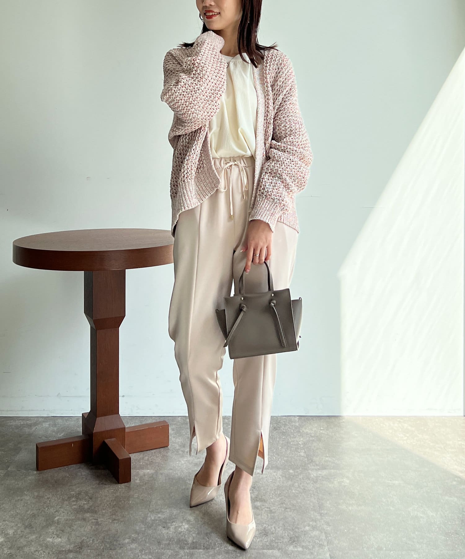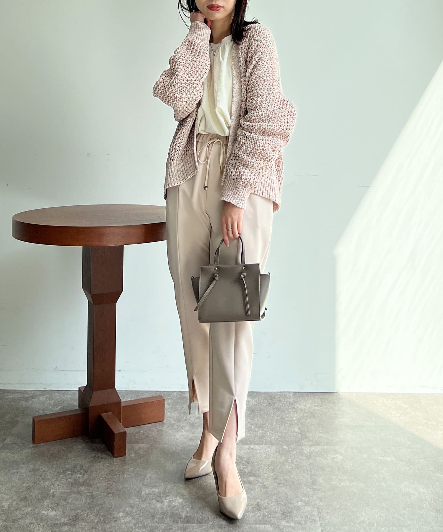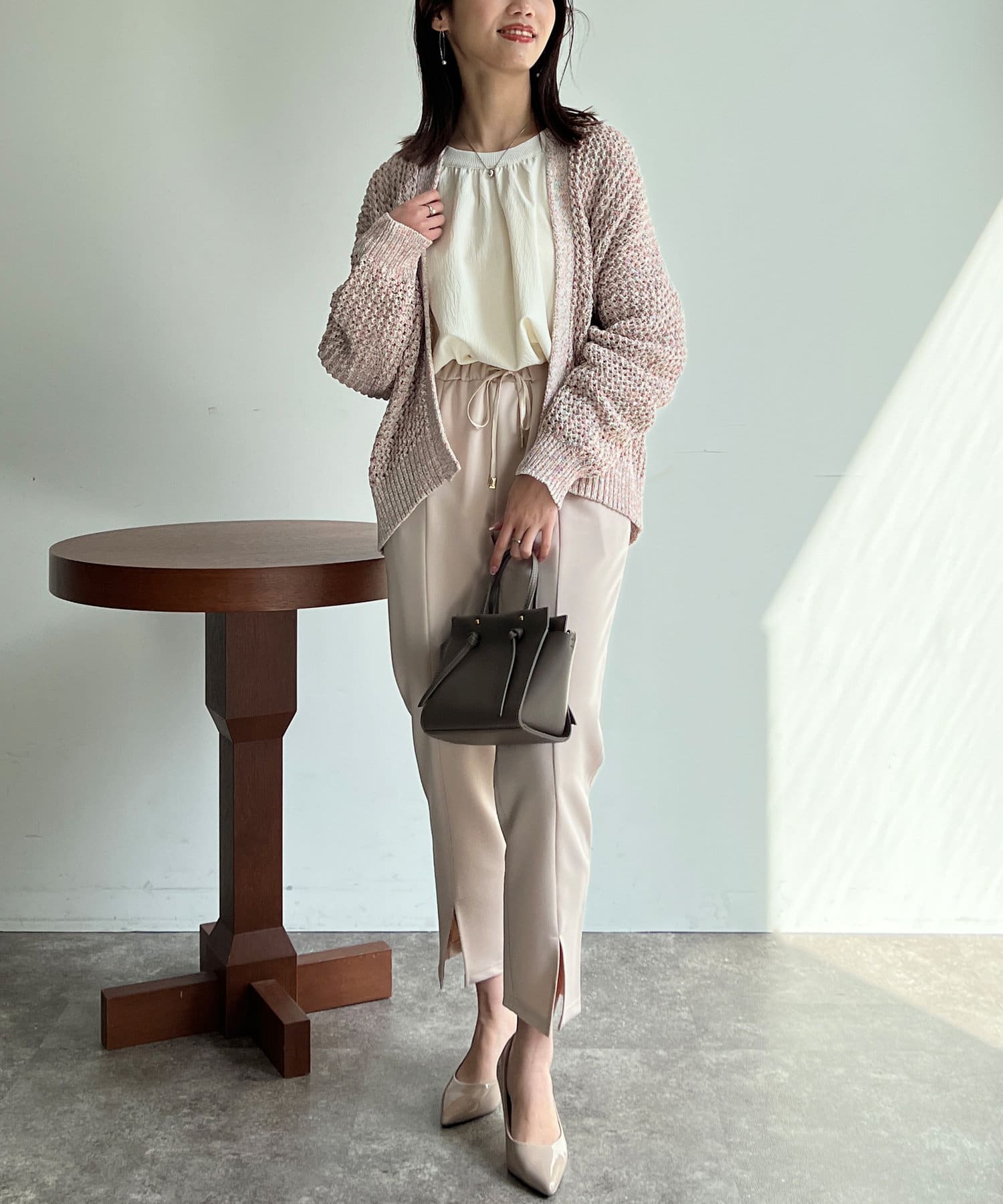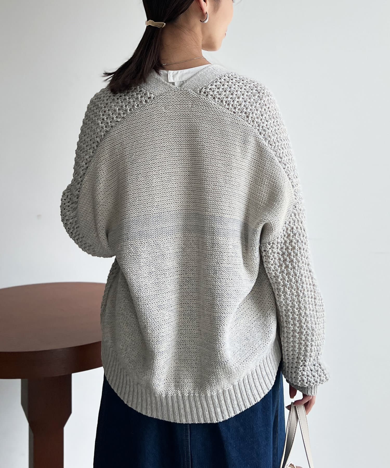 ボタンの無いショールタイプのざっくりとしたシルエットで、ナチュラルな雰囲気で合わせていただけます。