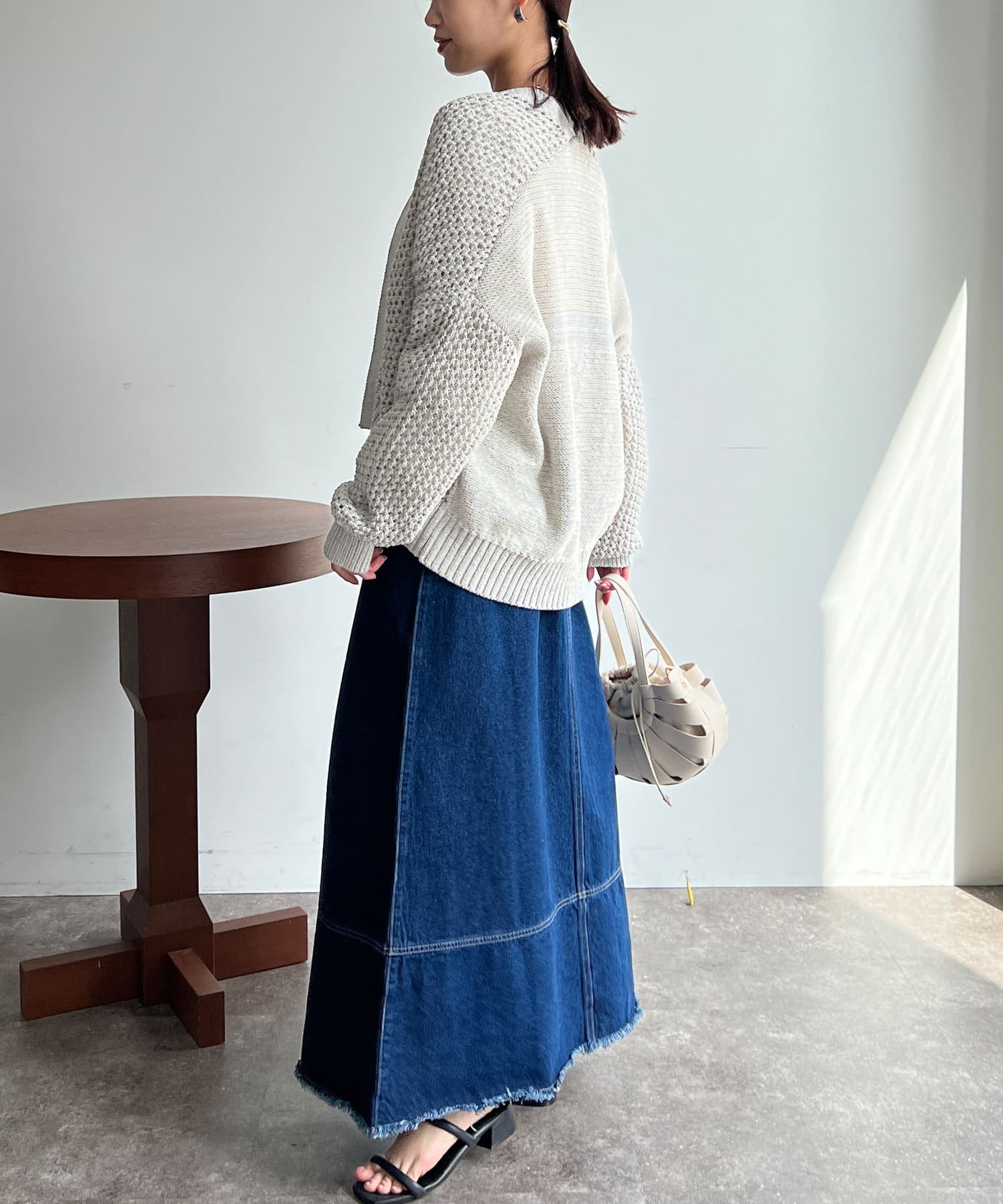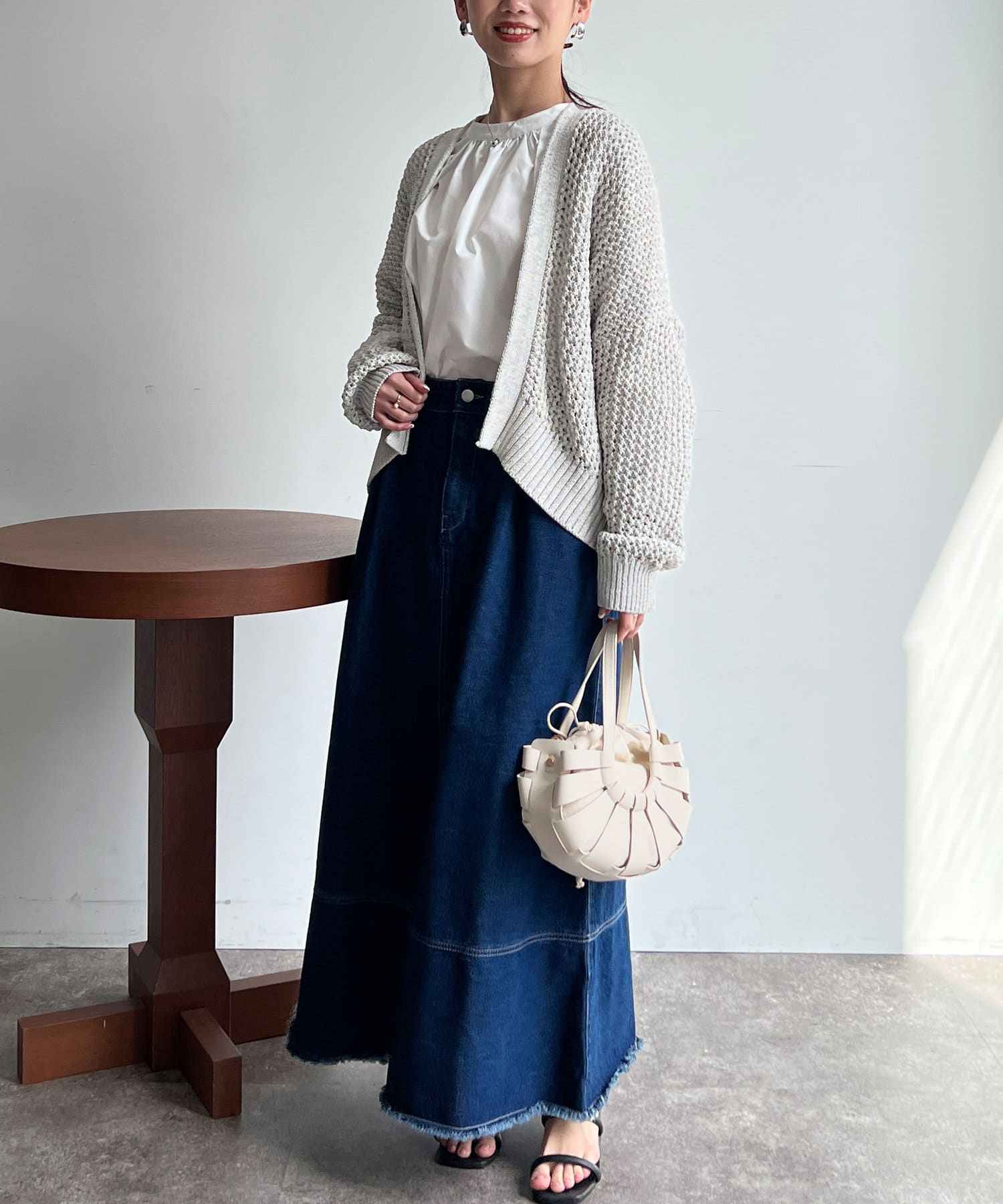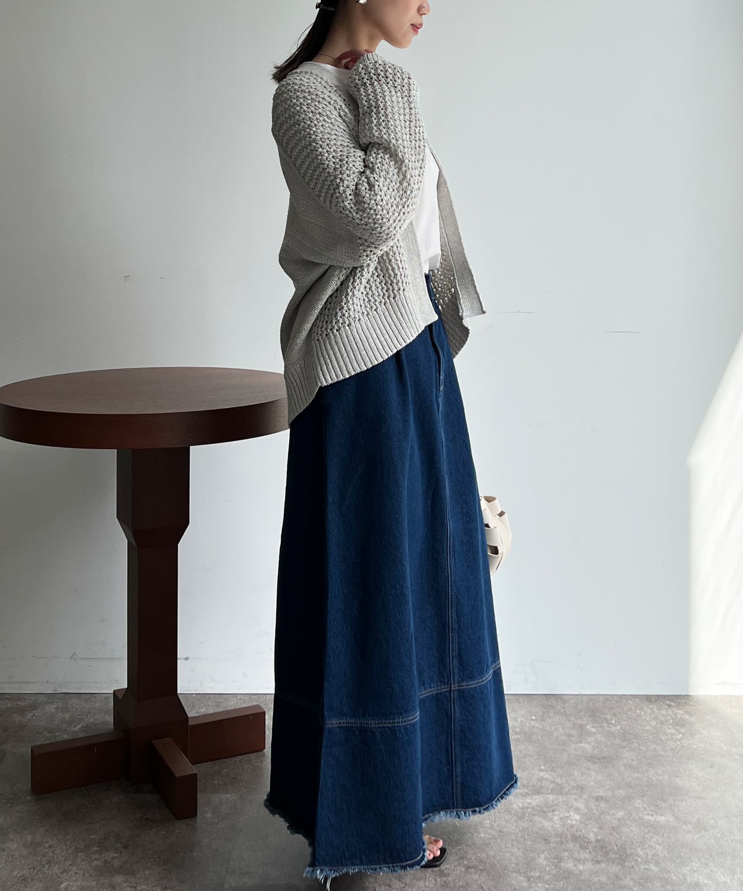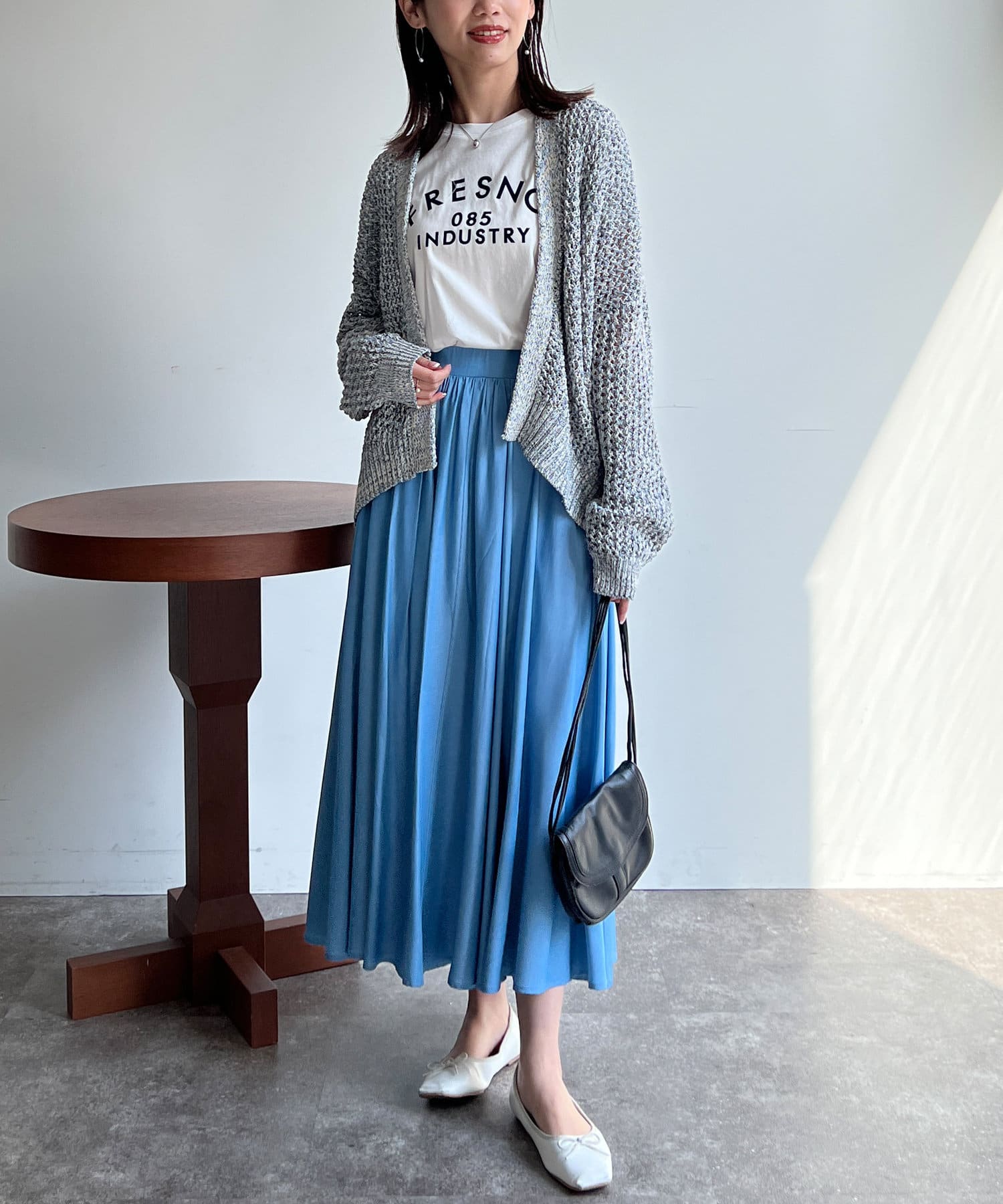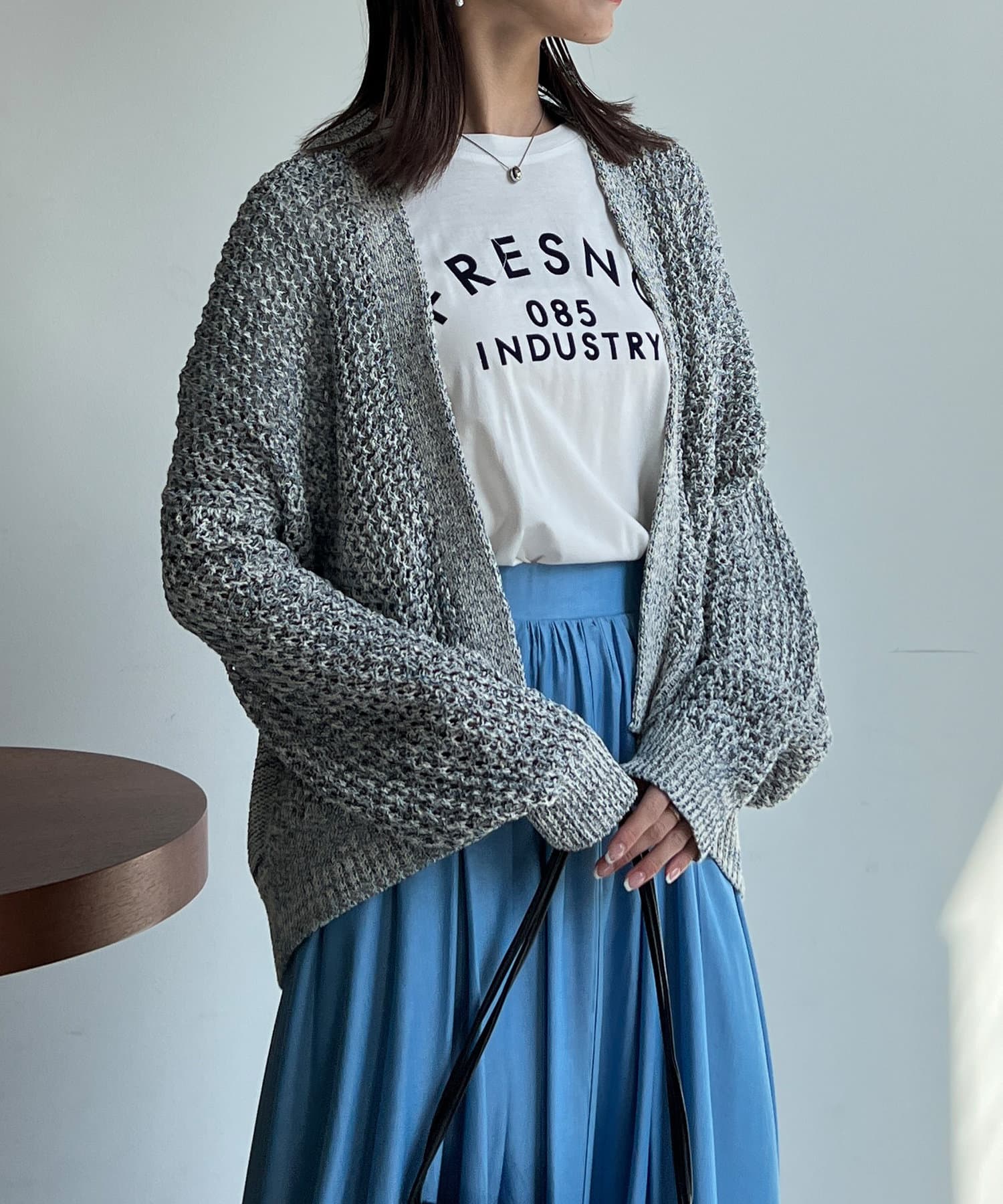 Tシャツやブラウスにざっくりと合わせるのがオススです。