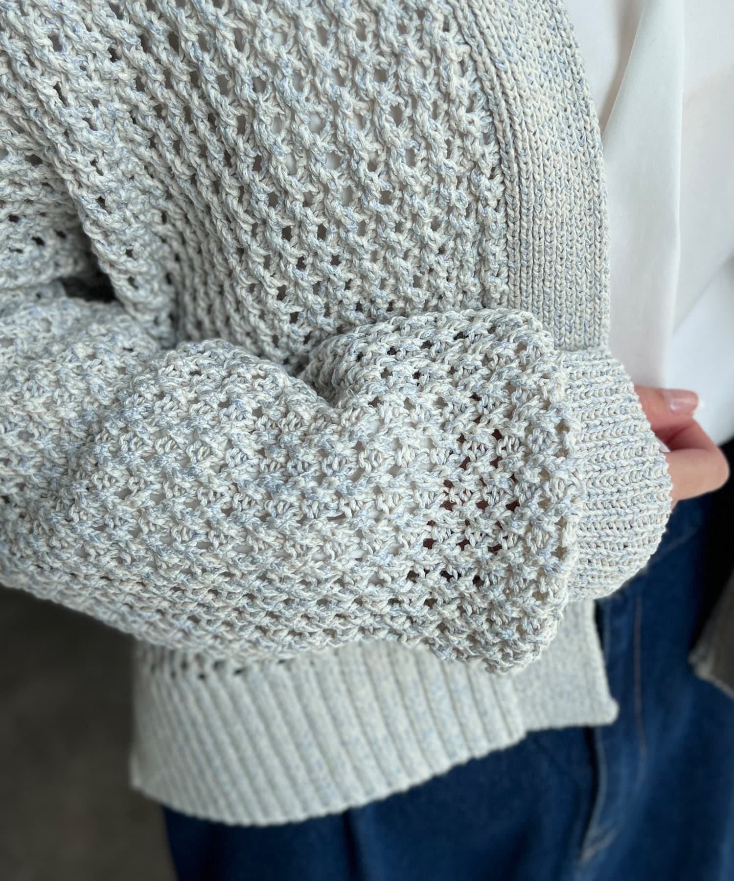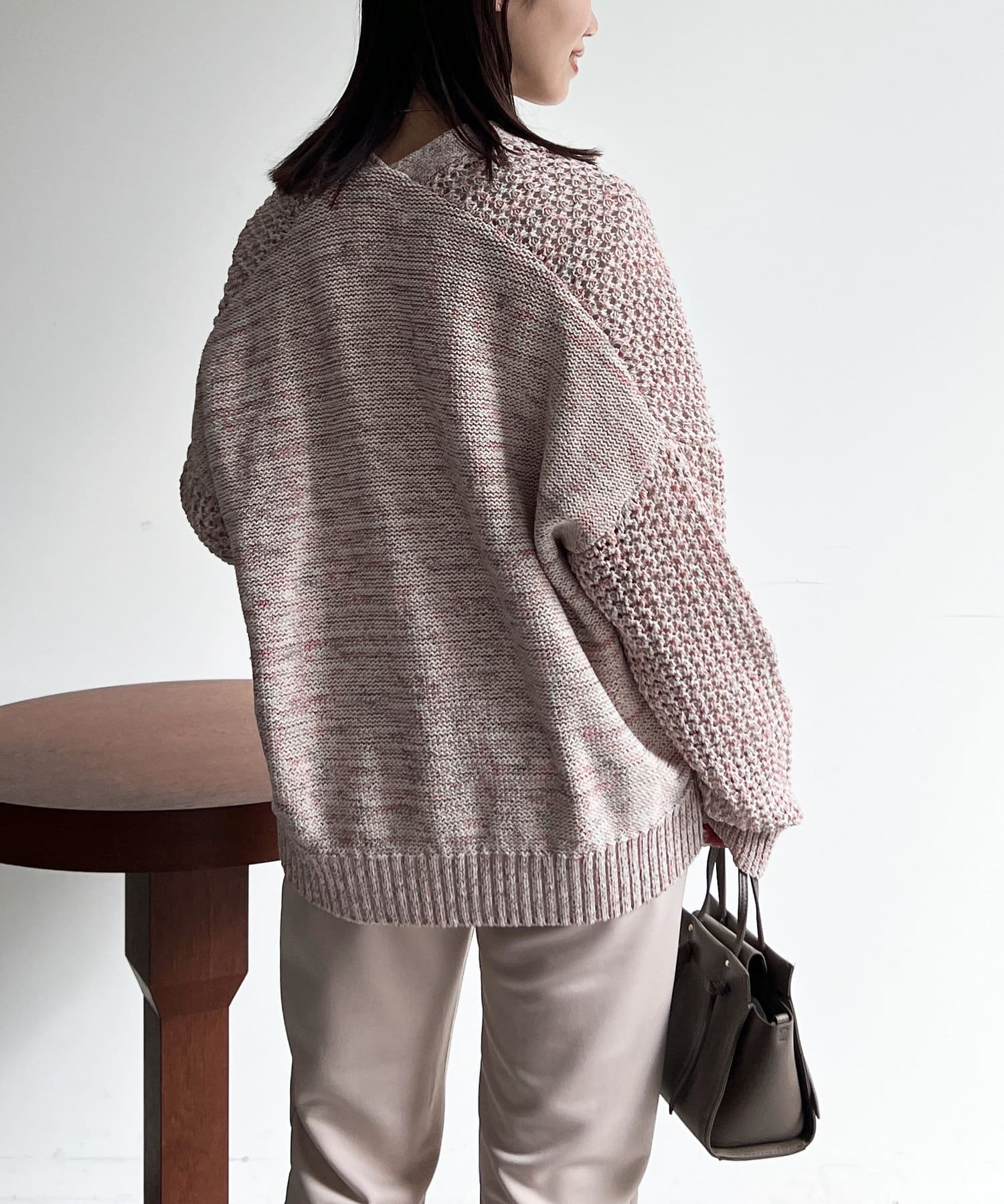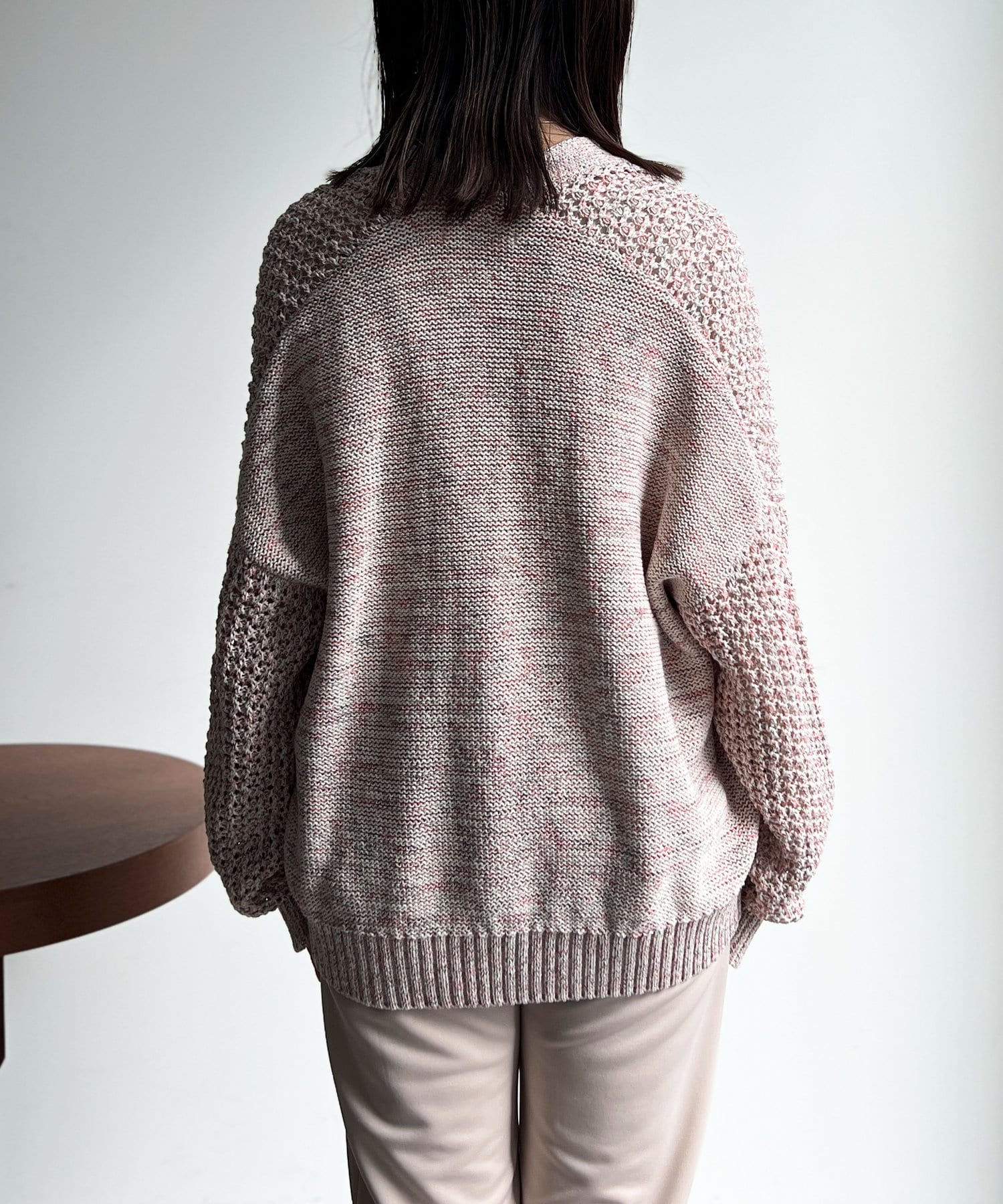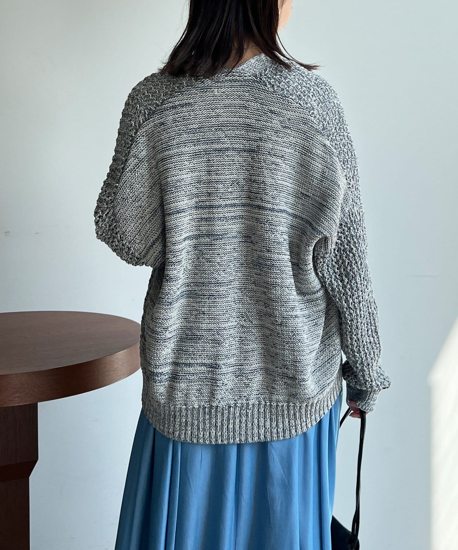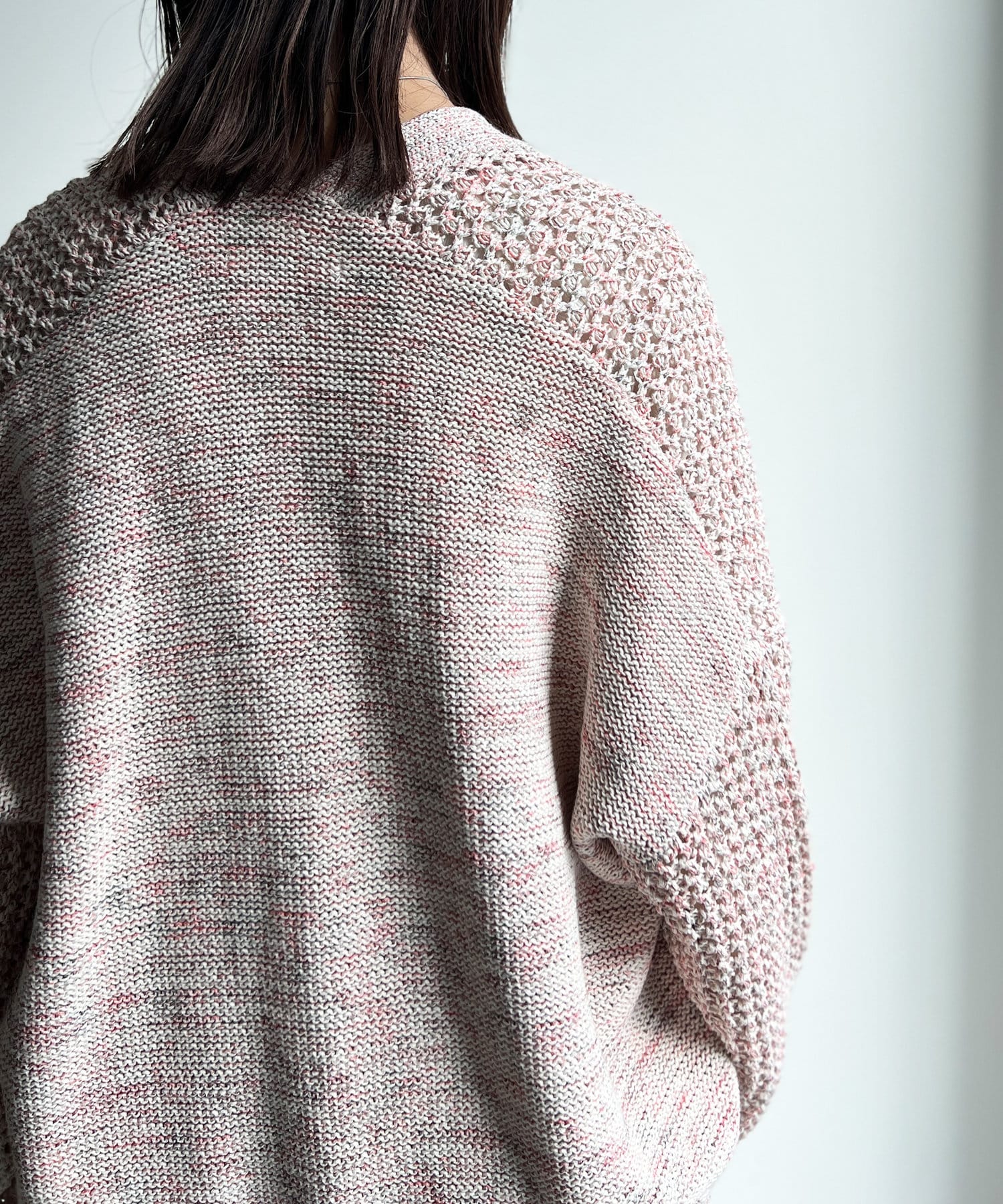 杢のテープヤーンの糸を使用したカーディガン。