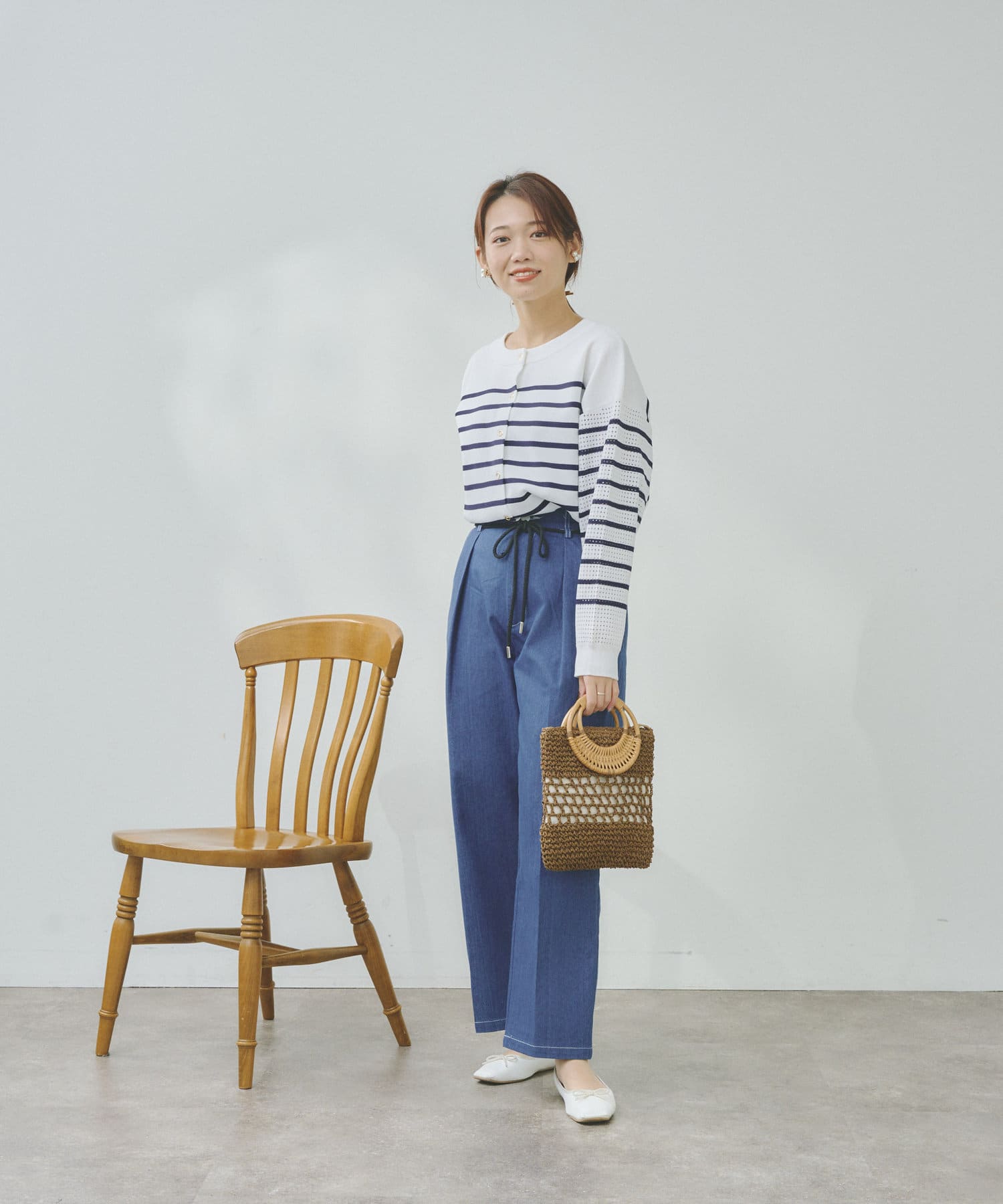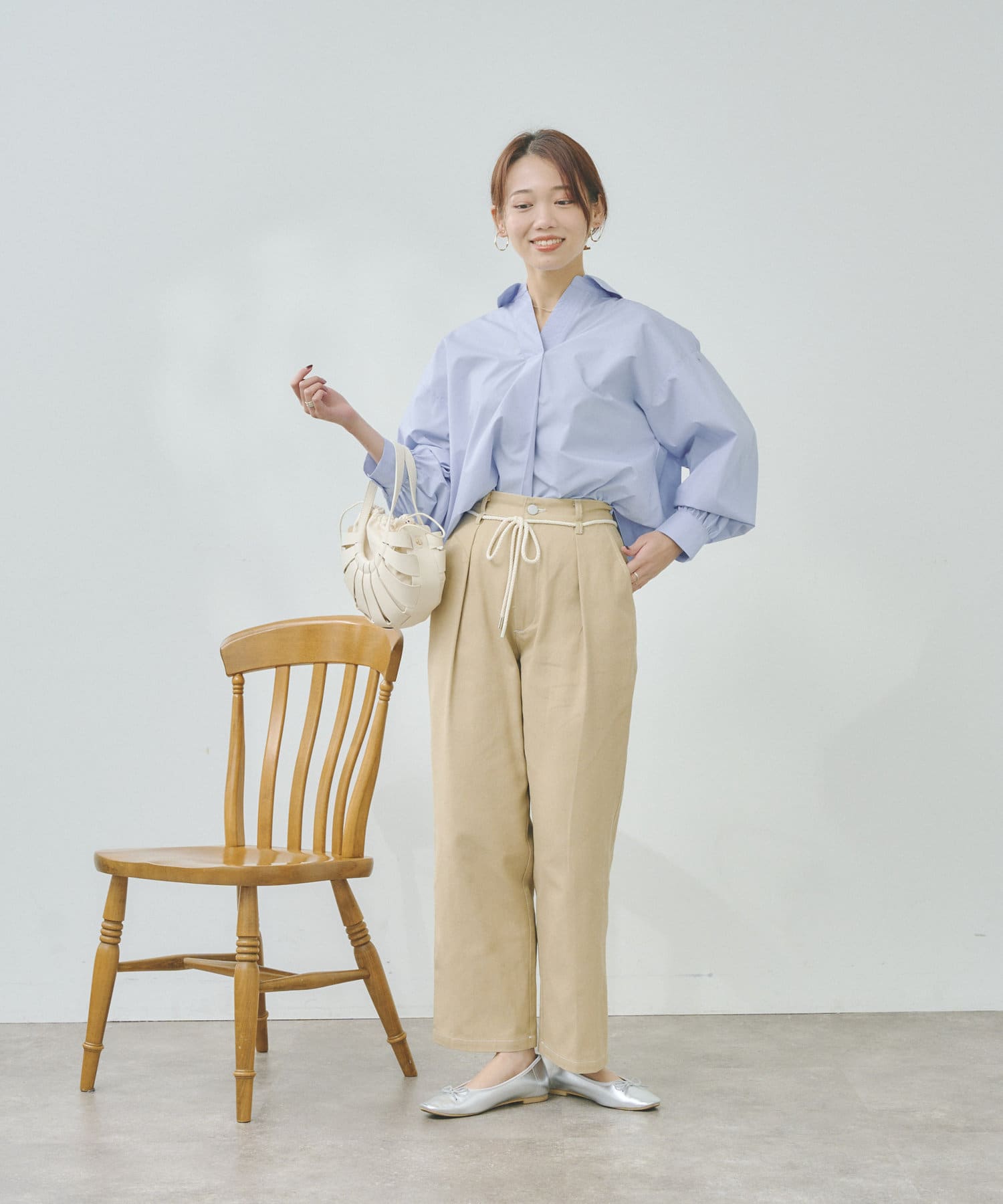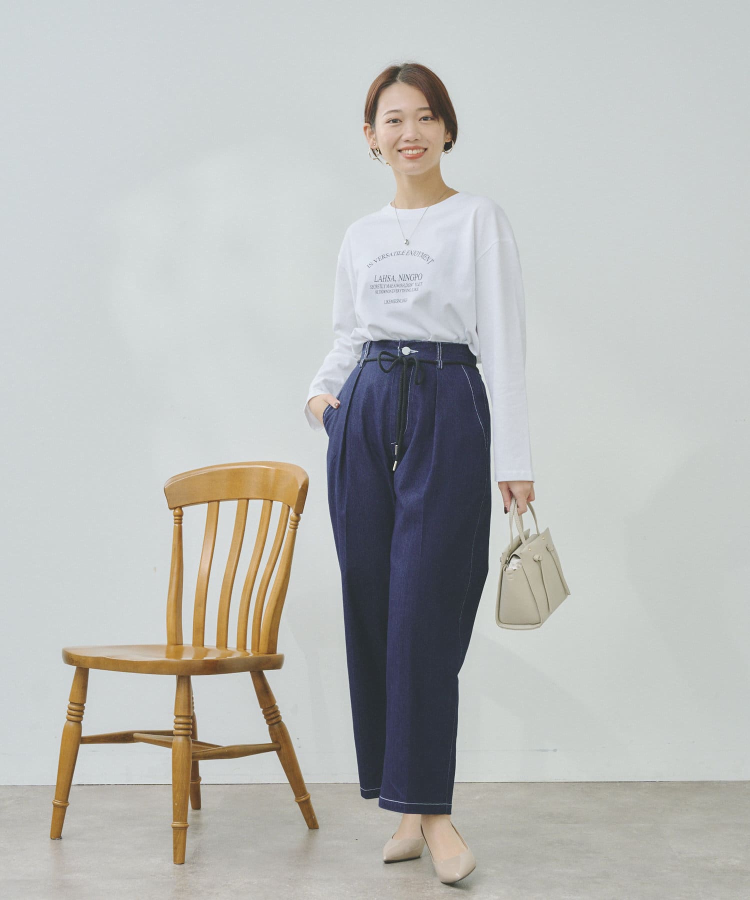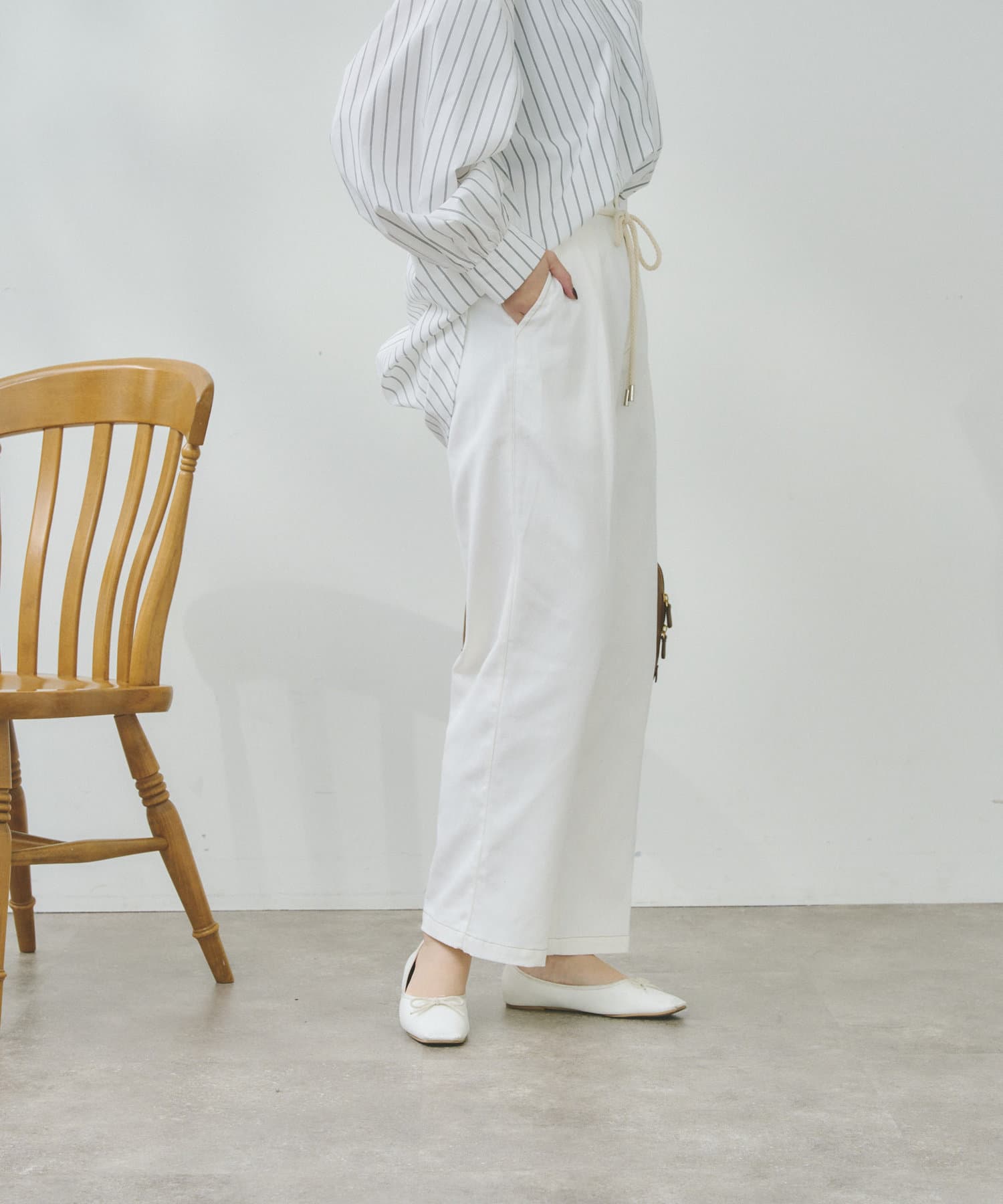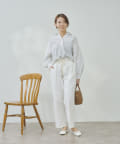 Tシャツや薄手のニットをインして、ウエストのロープベルトを見せたスタイルアップコーディネートがおすすめ。