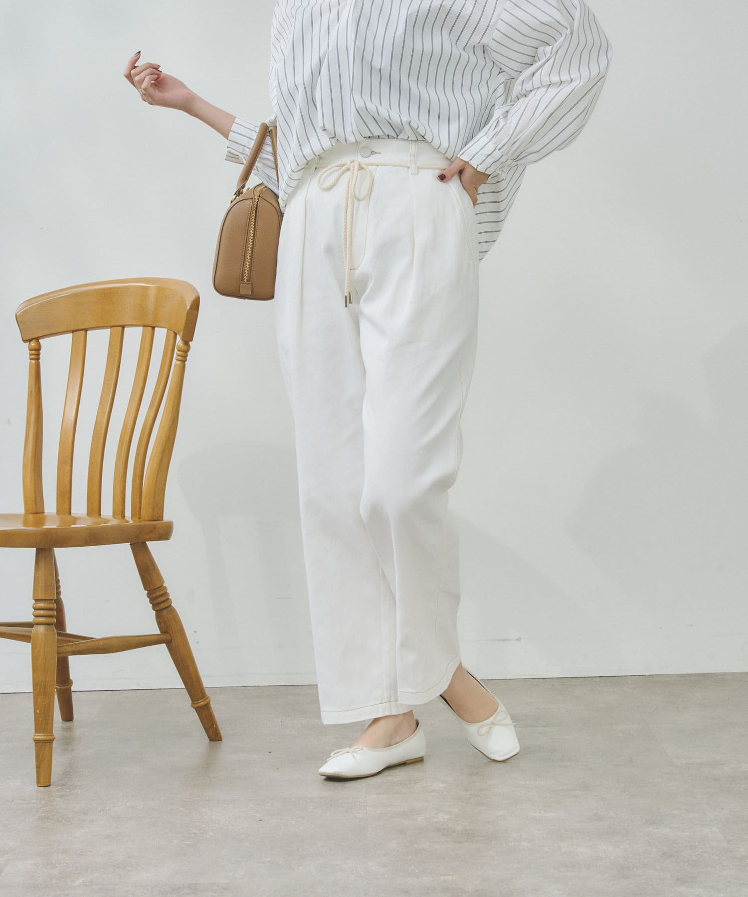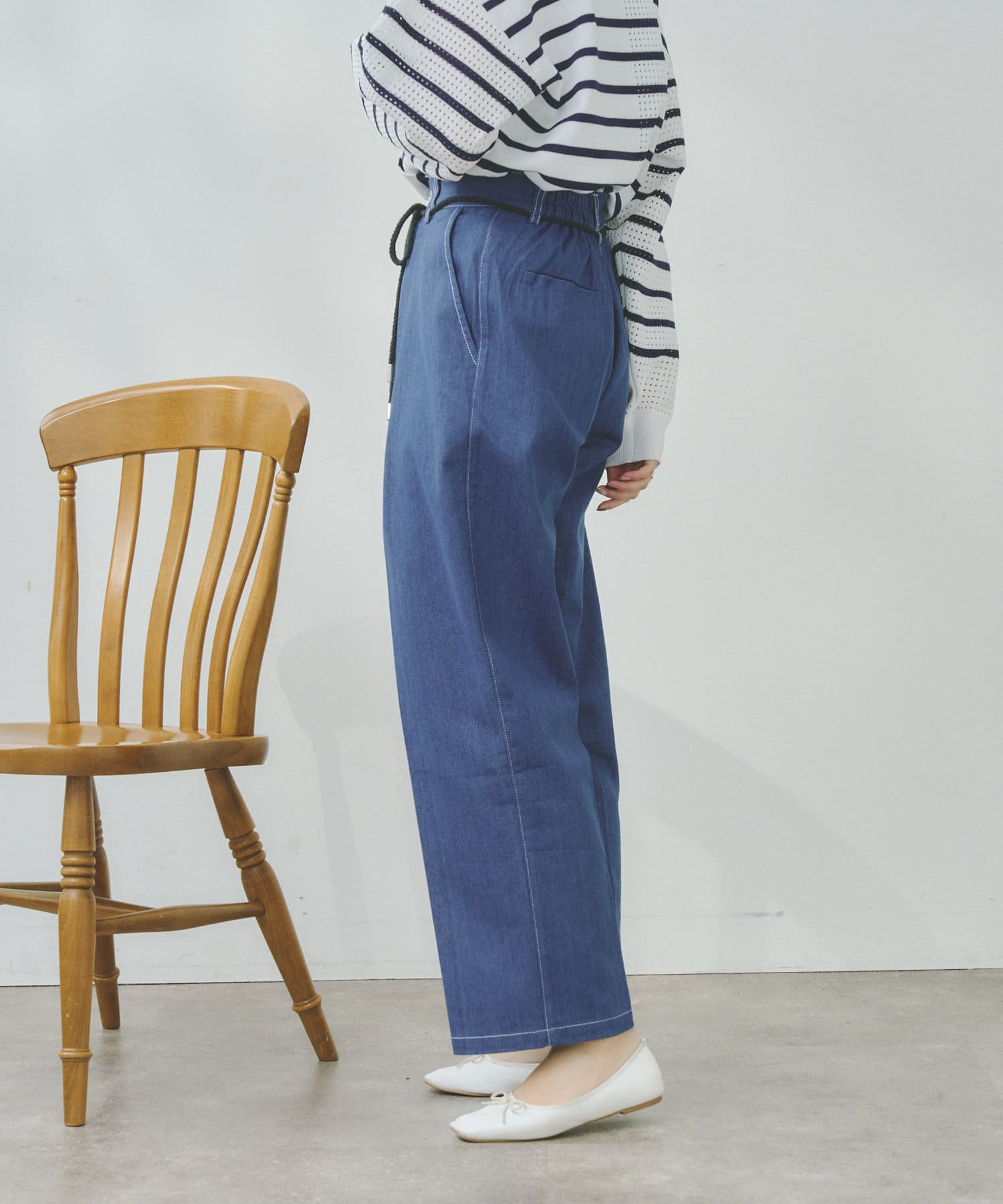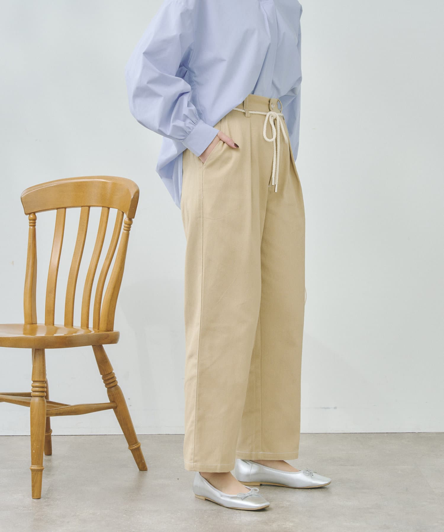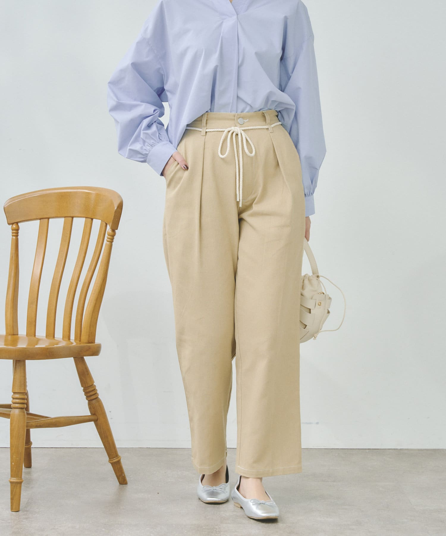 ロープベルトがアクセントになるタックパンツ