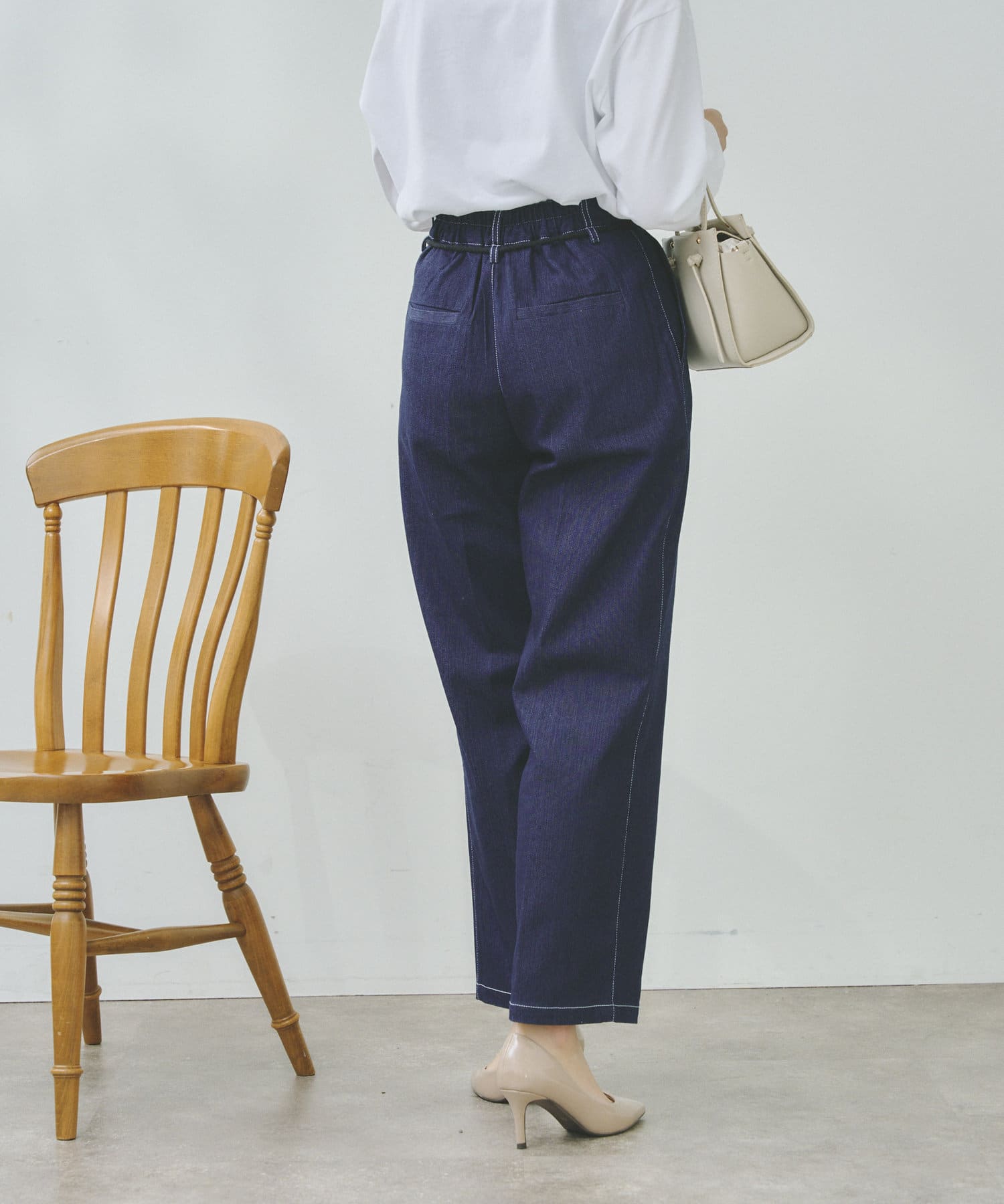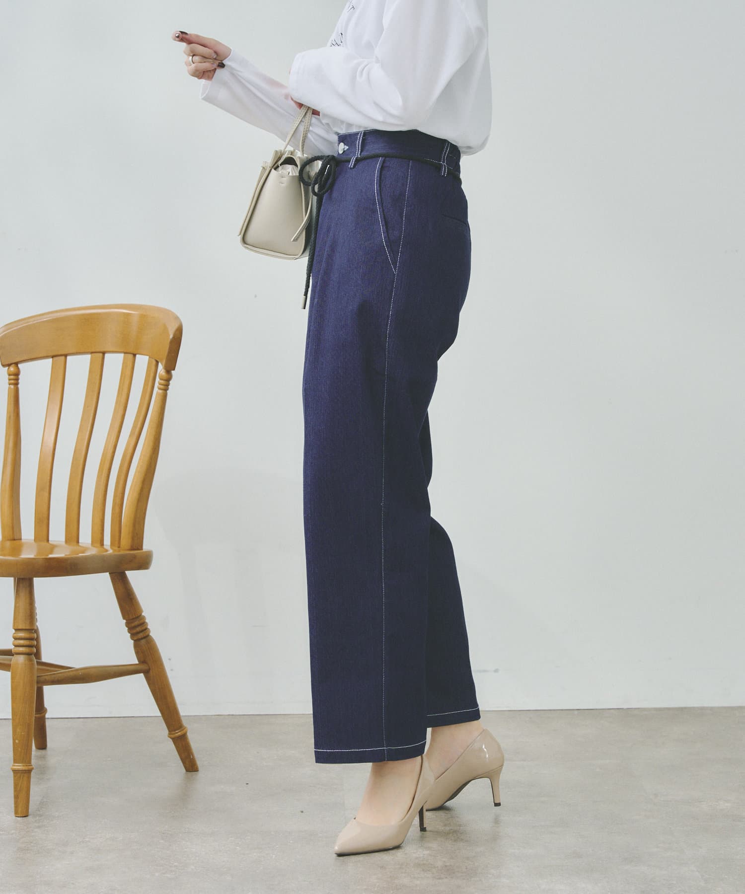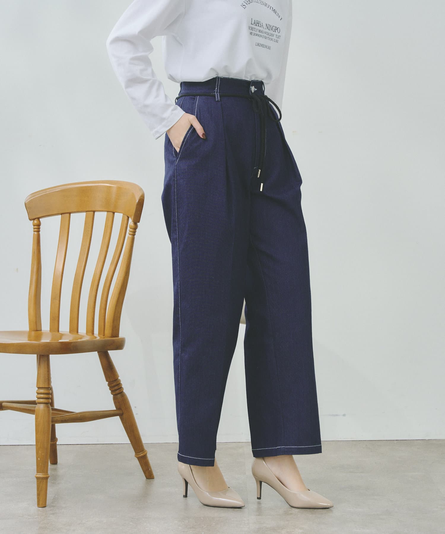 ロープベルト付配色ステッチタックパンツ
