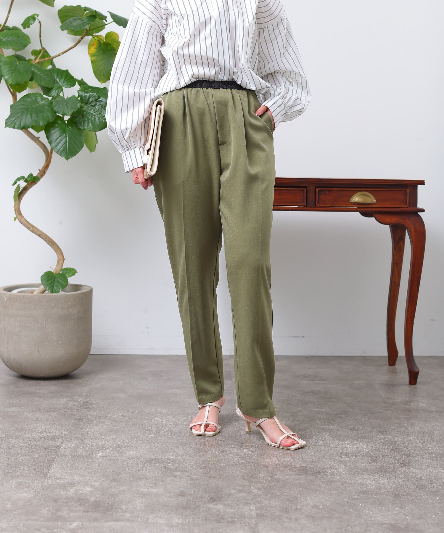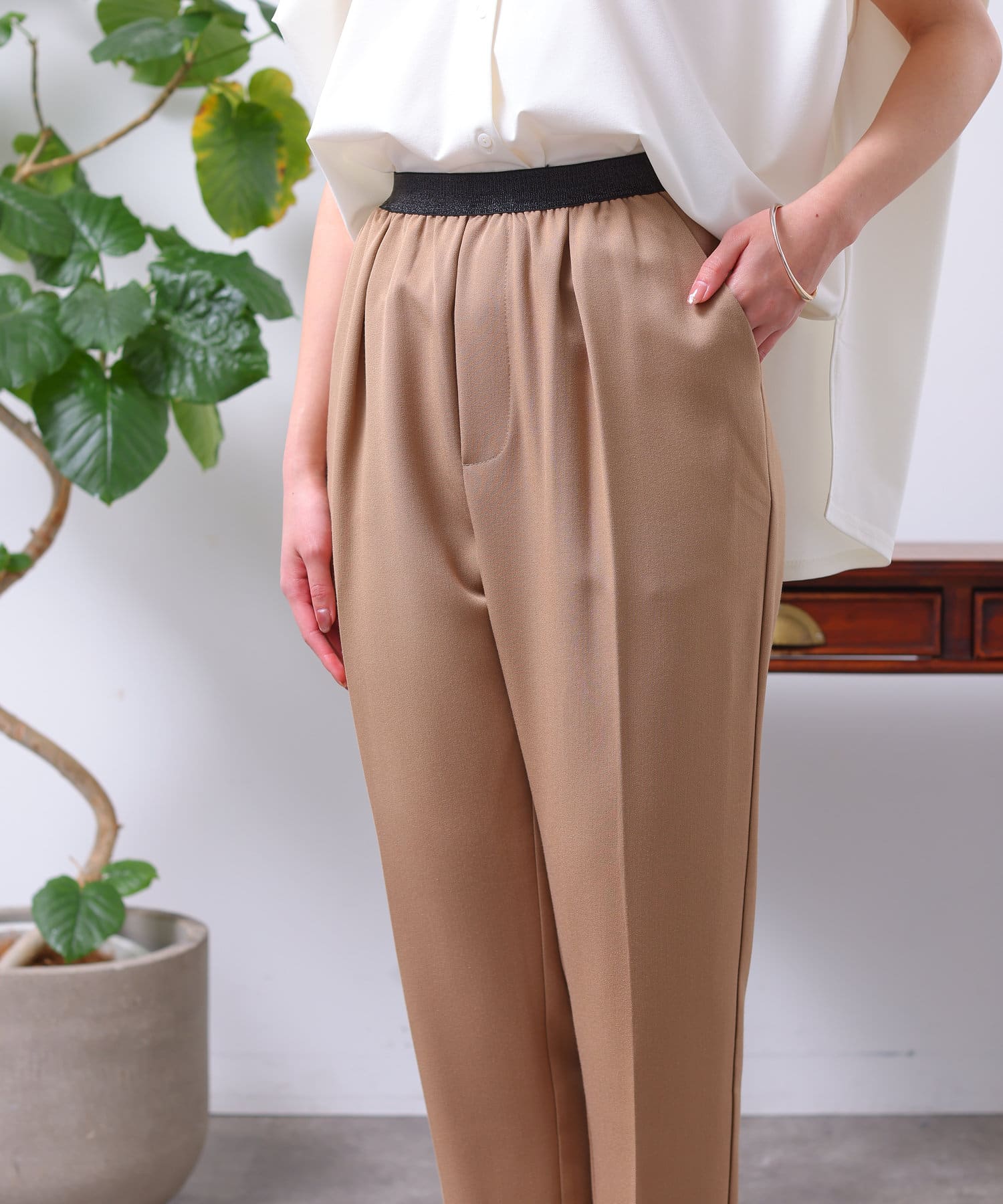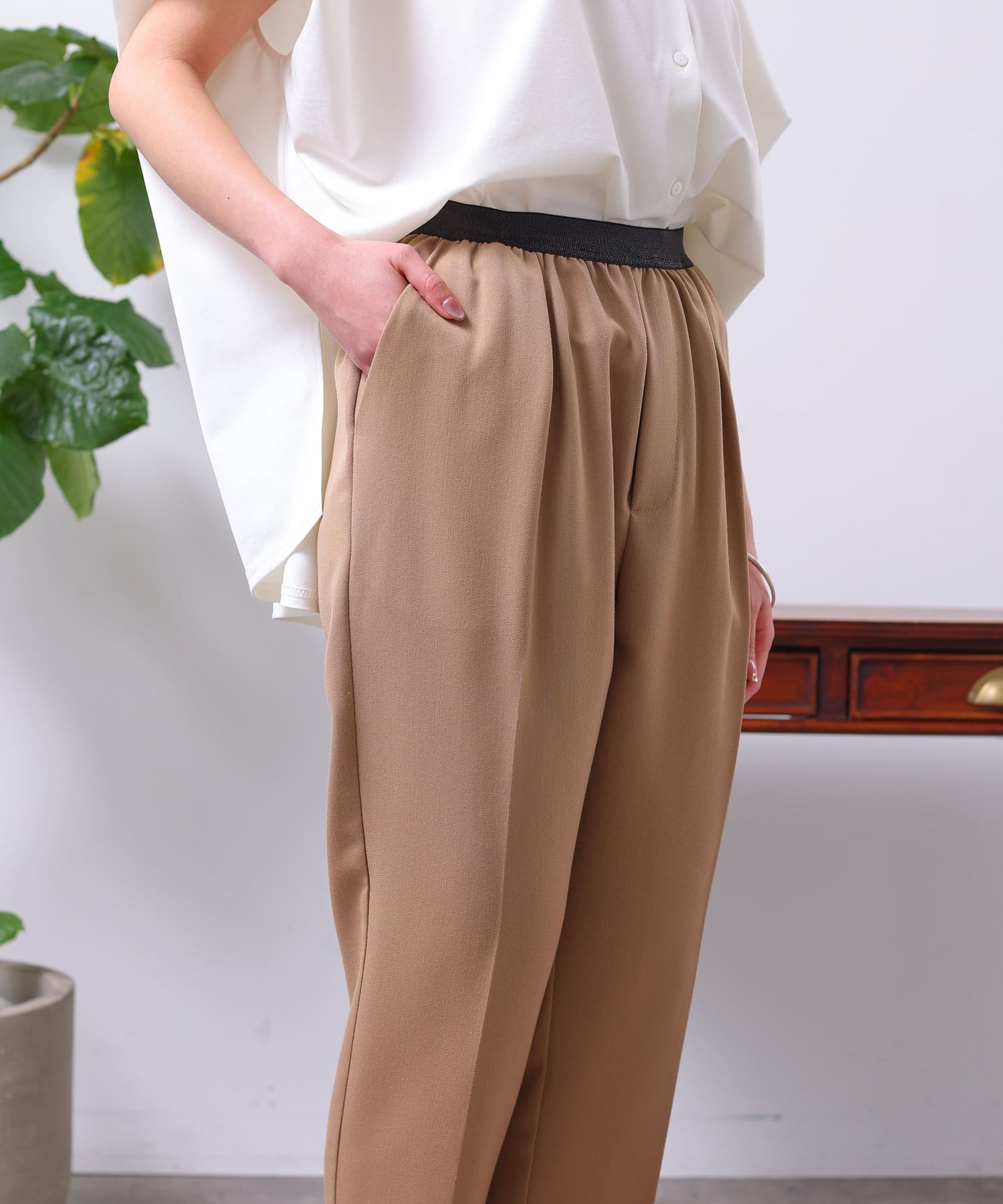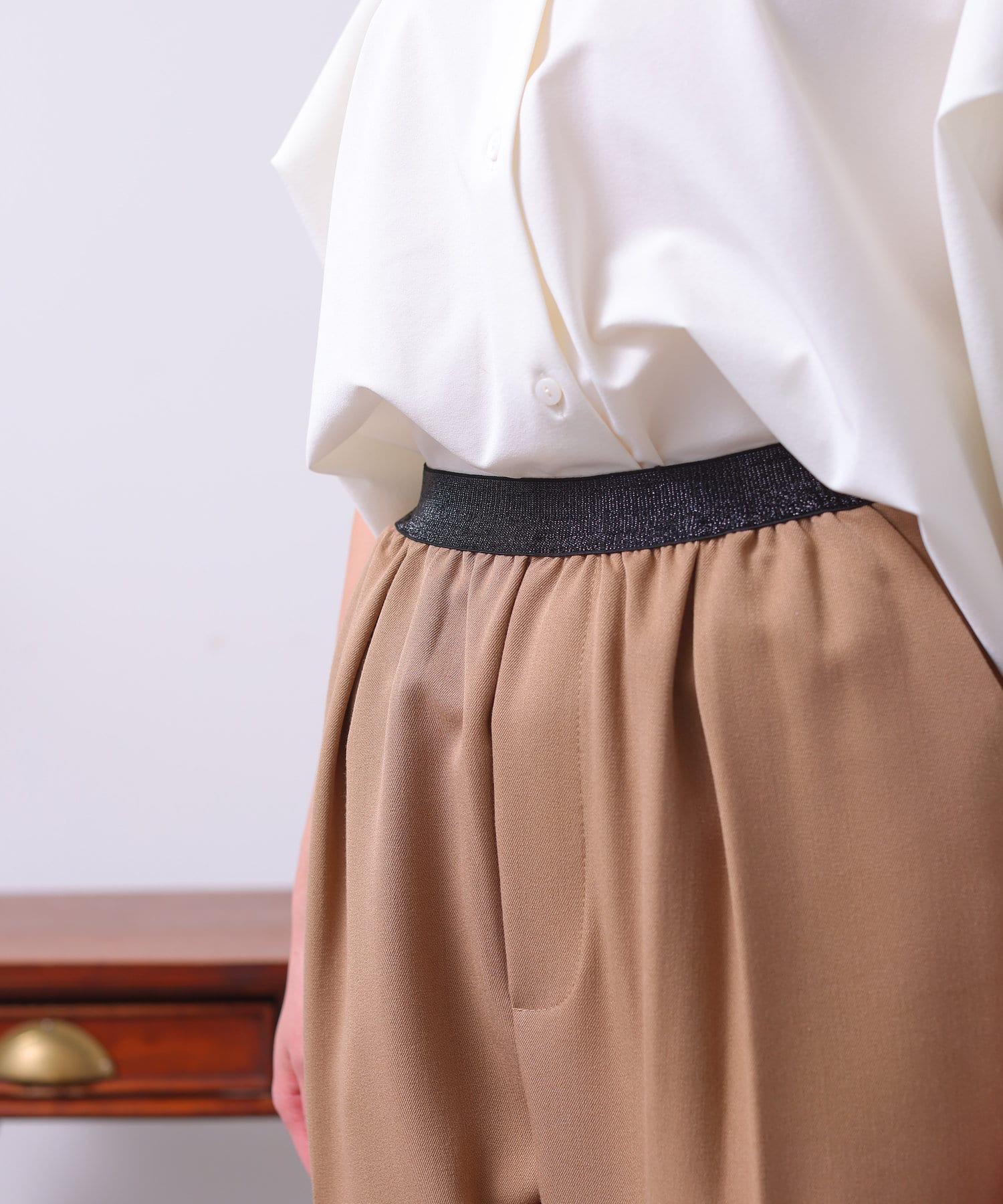 ベーシックなテーパードパンツをウエストゴム部分にラメ糸を入れてアップデートさせました。