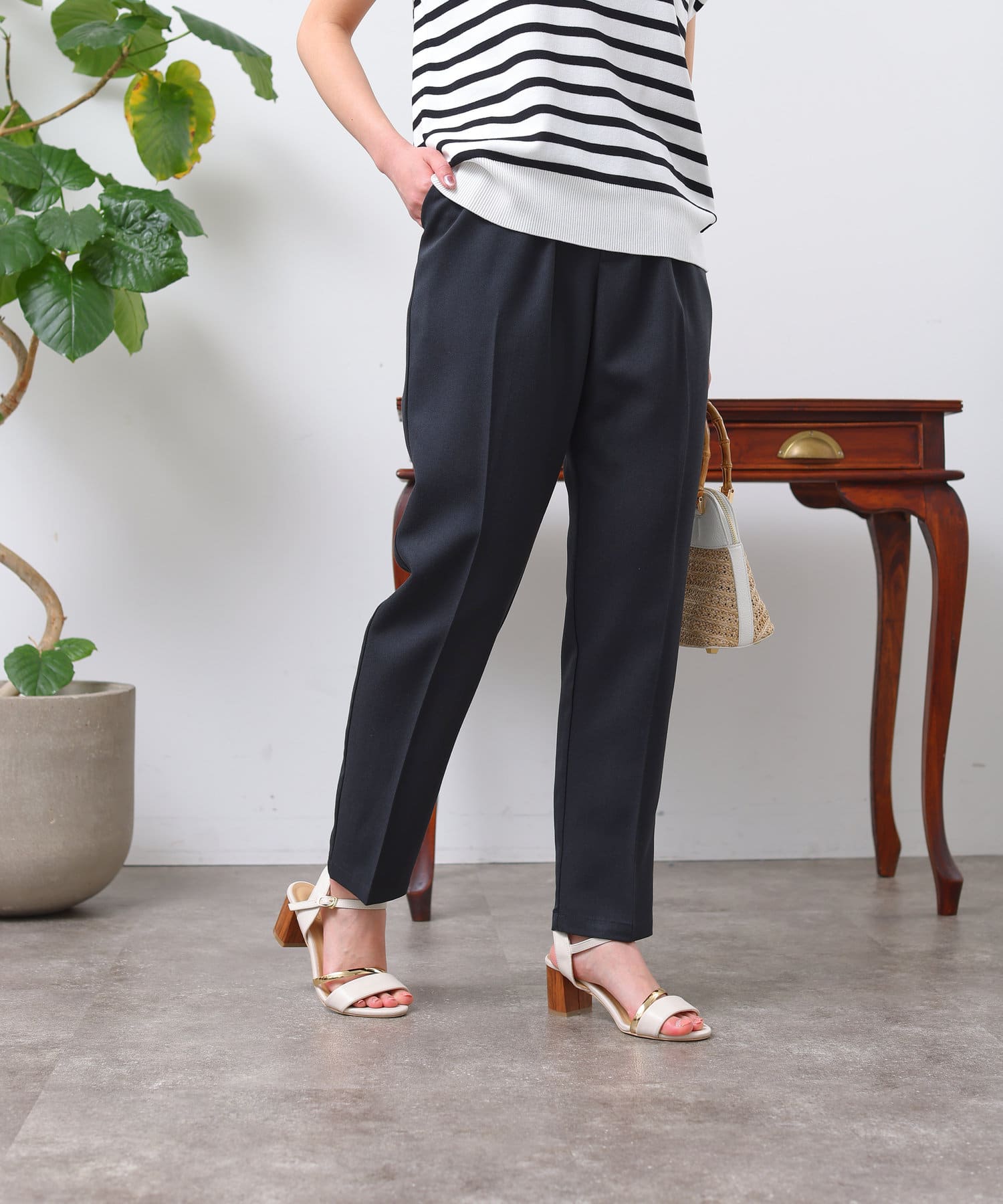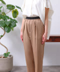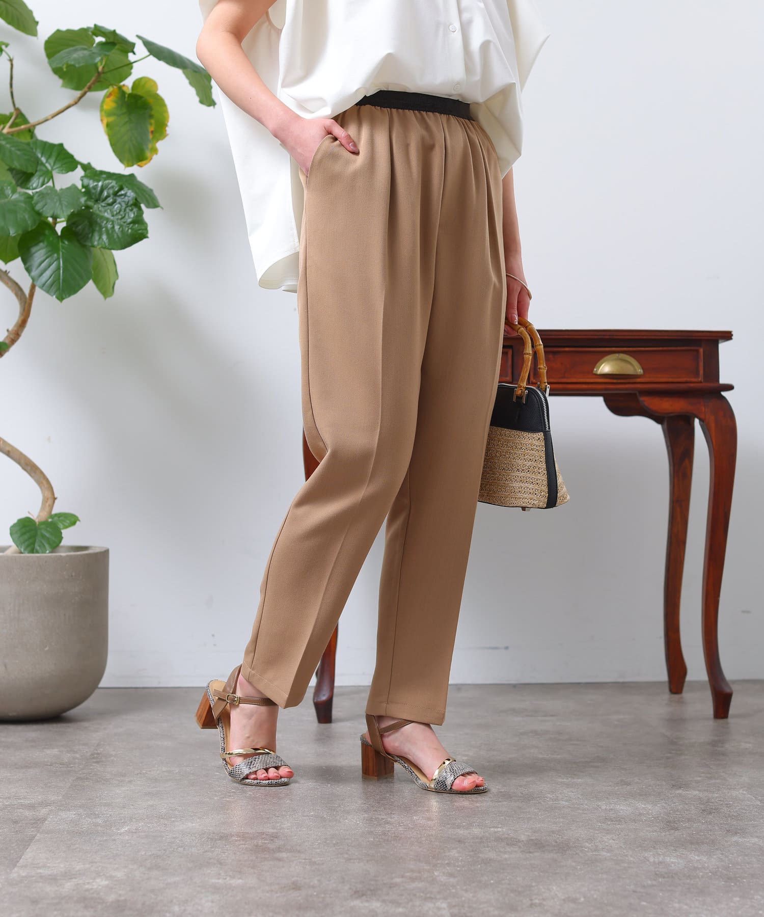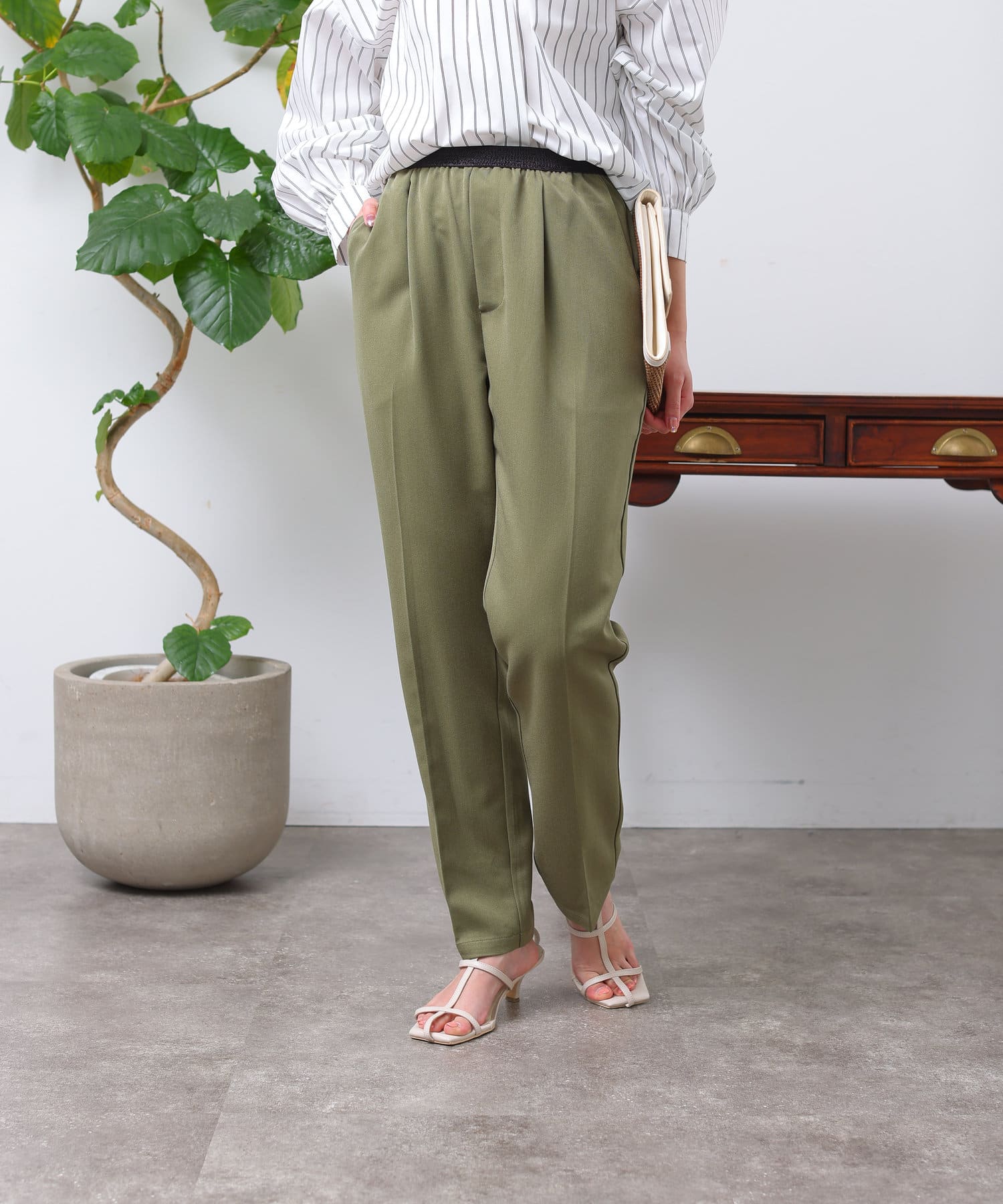 ベーシックなテーパードパンツをウエストゴム部分にラメ糸を入れてアップデートさせました。