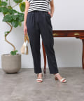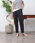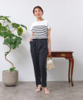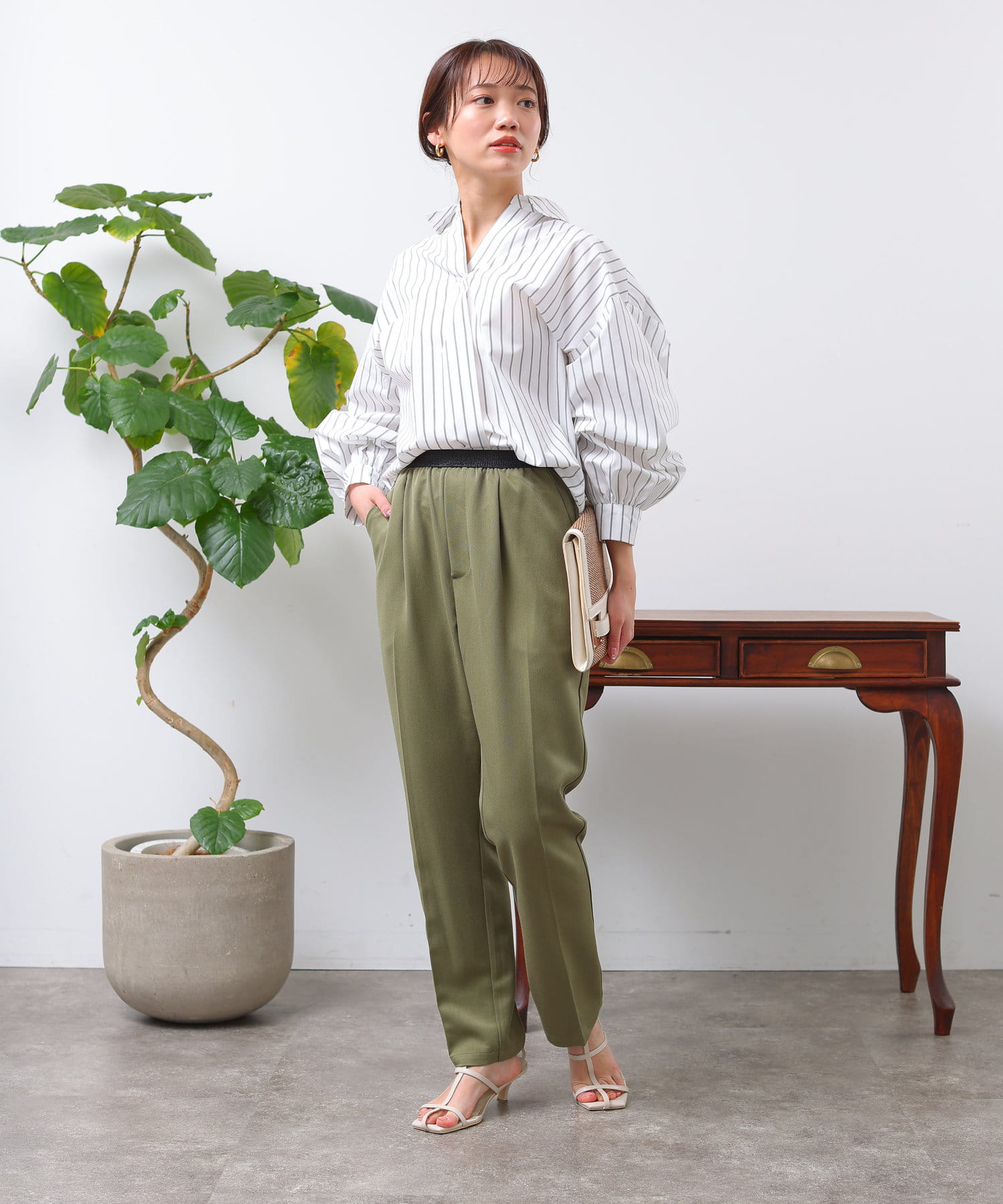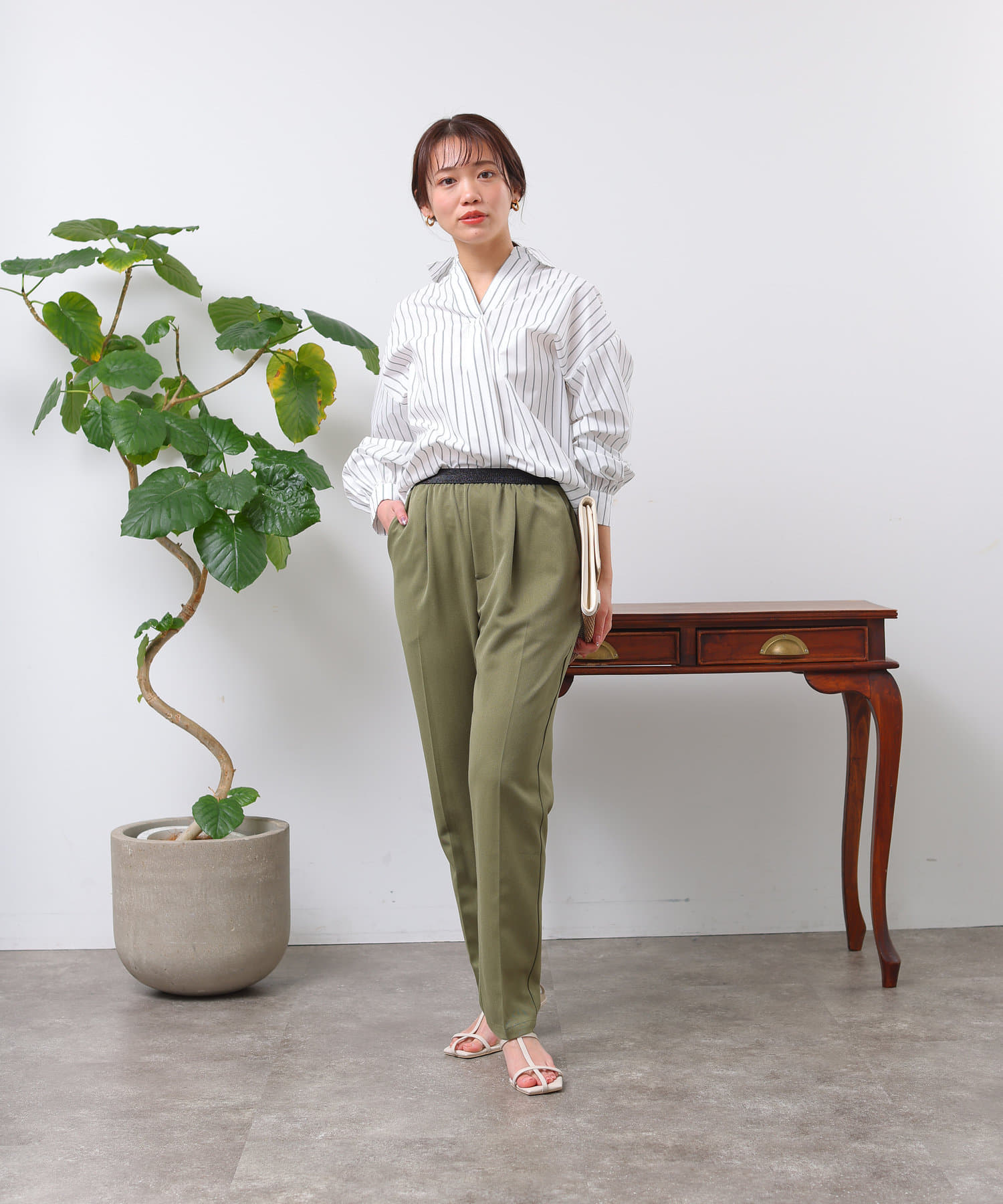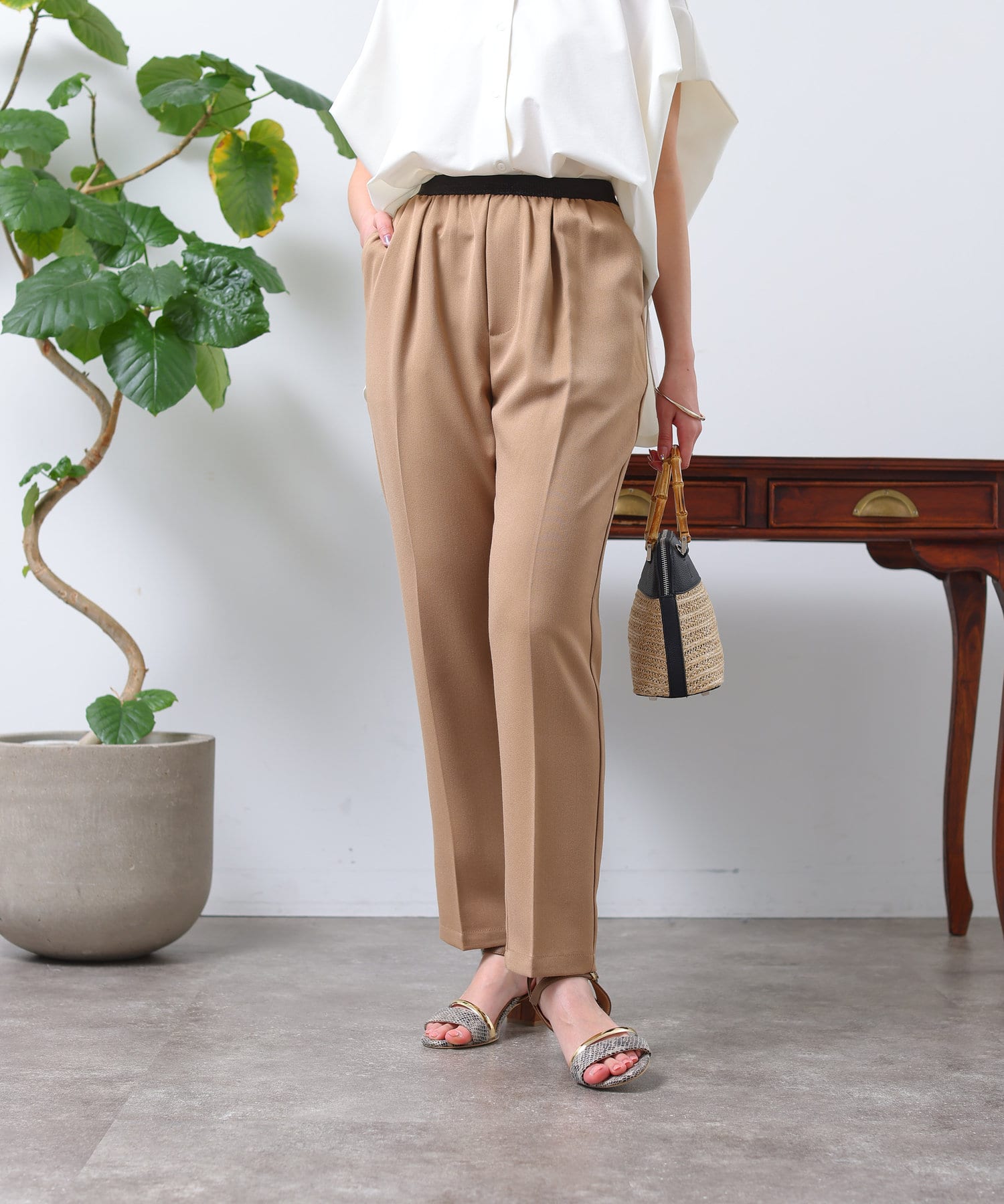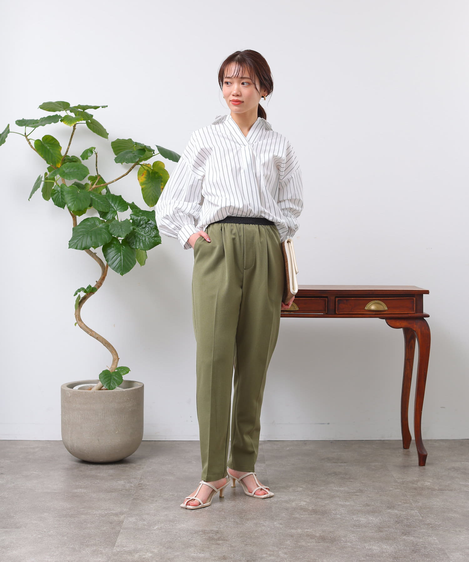 ベーシックなテーパードパンツをウエストゴム部分にラメ糸を入れてアップデートさせました。