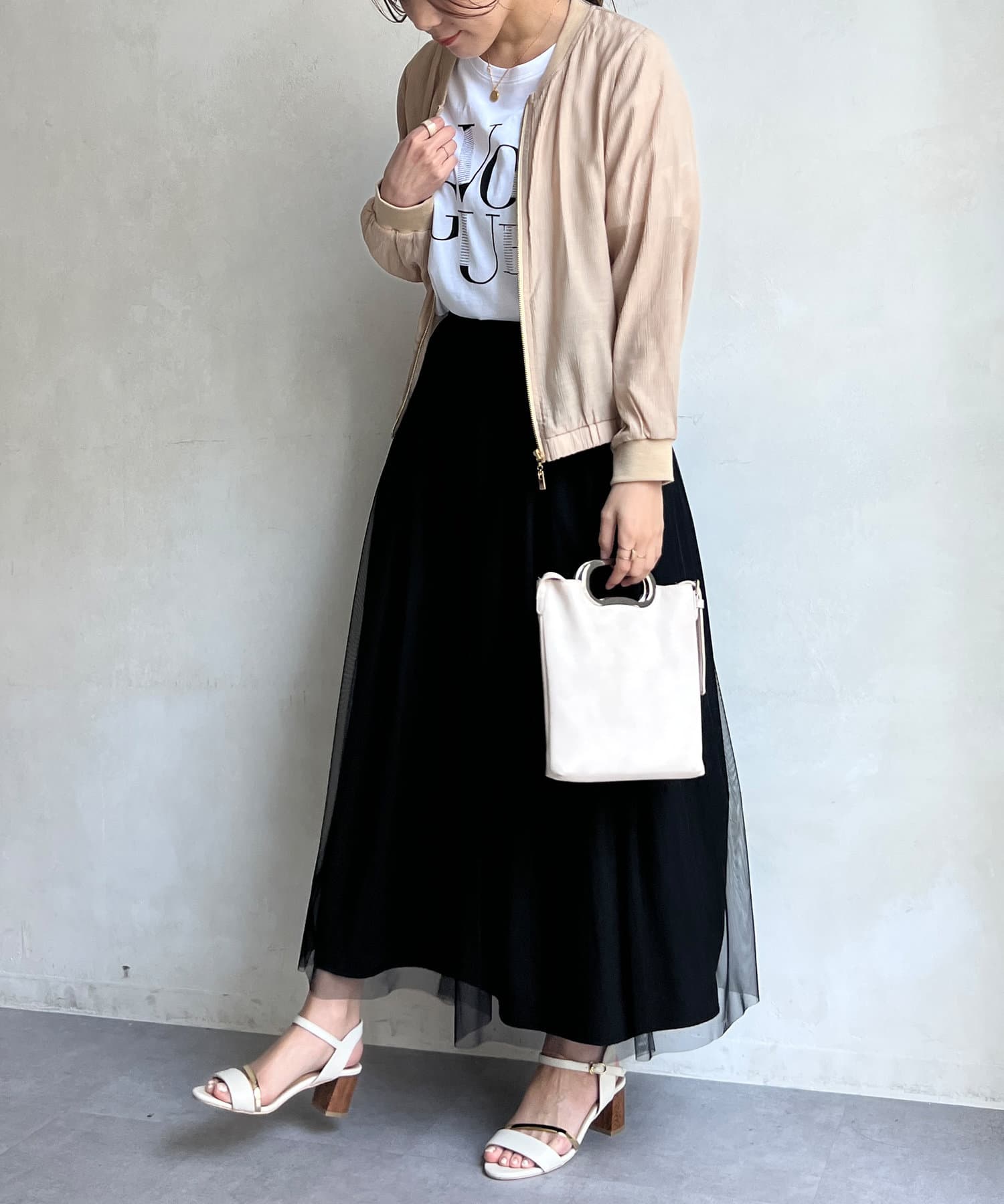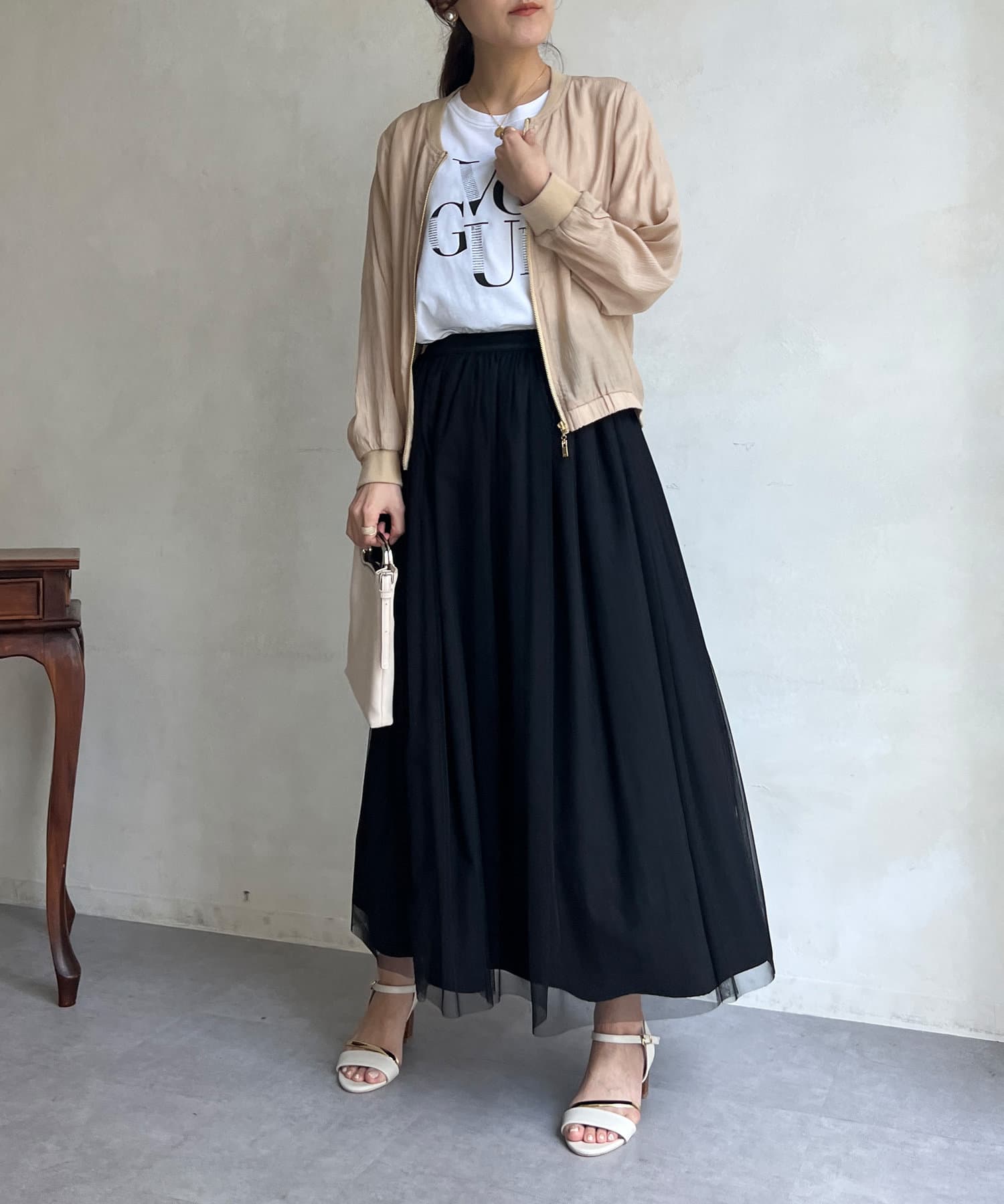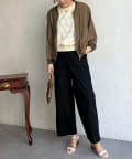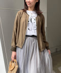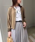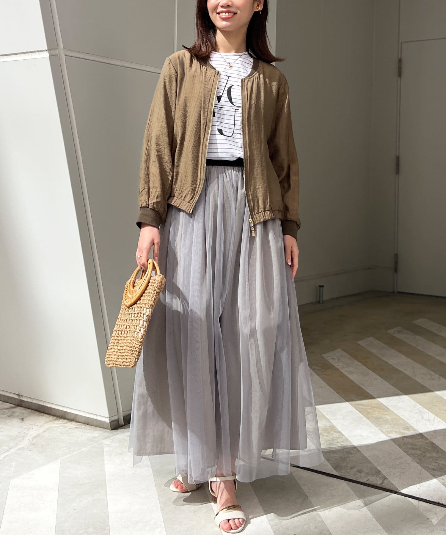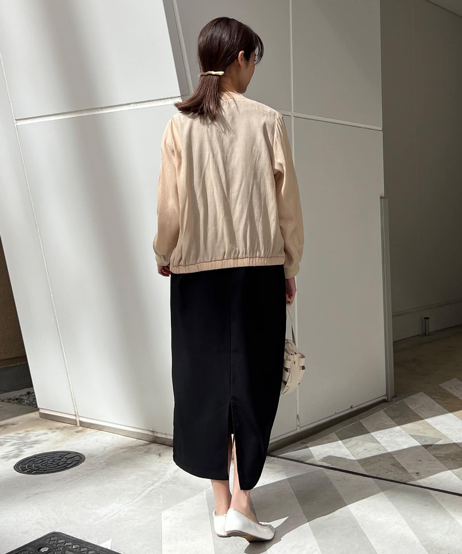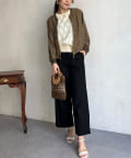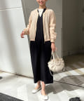 シンプルなパンツで合わせるとオフィスシーンでも活躍するブルゾン。