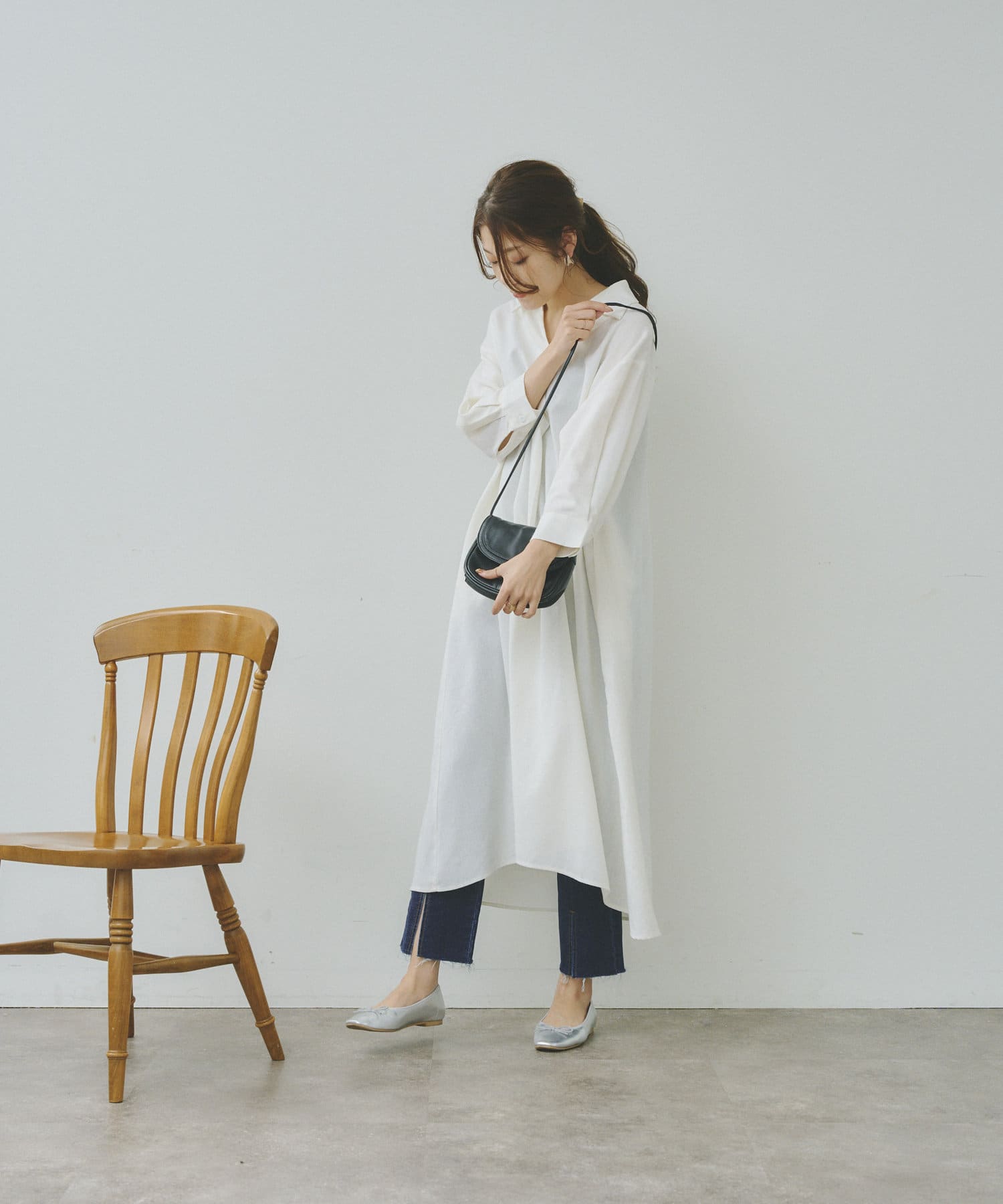 透け感のあるオフホワイトはデニムやイージーパンツと