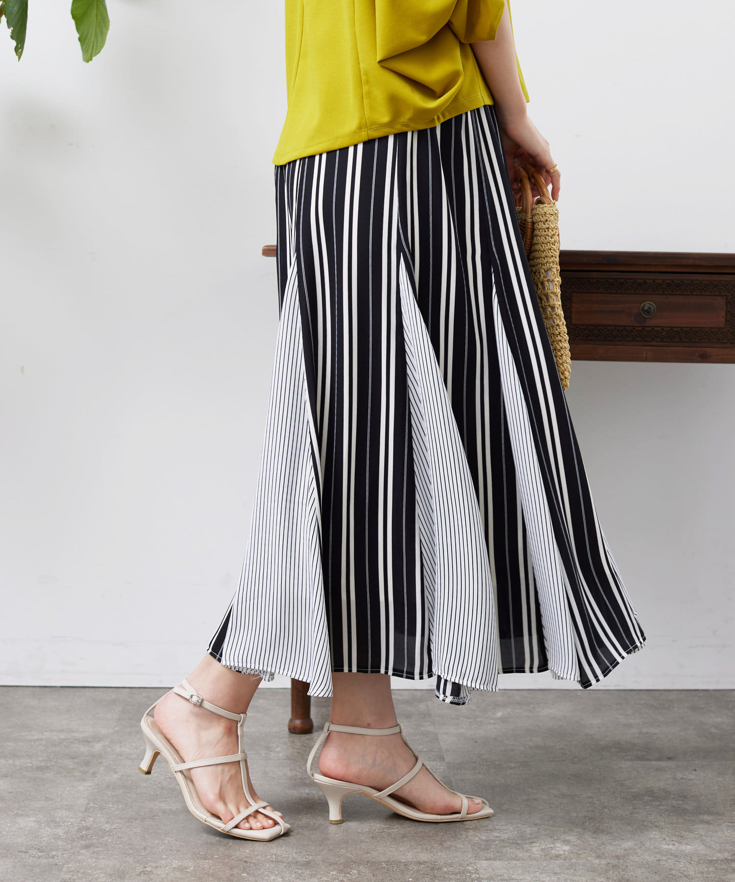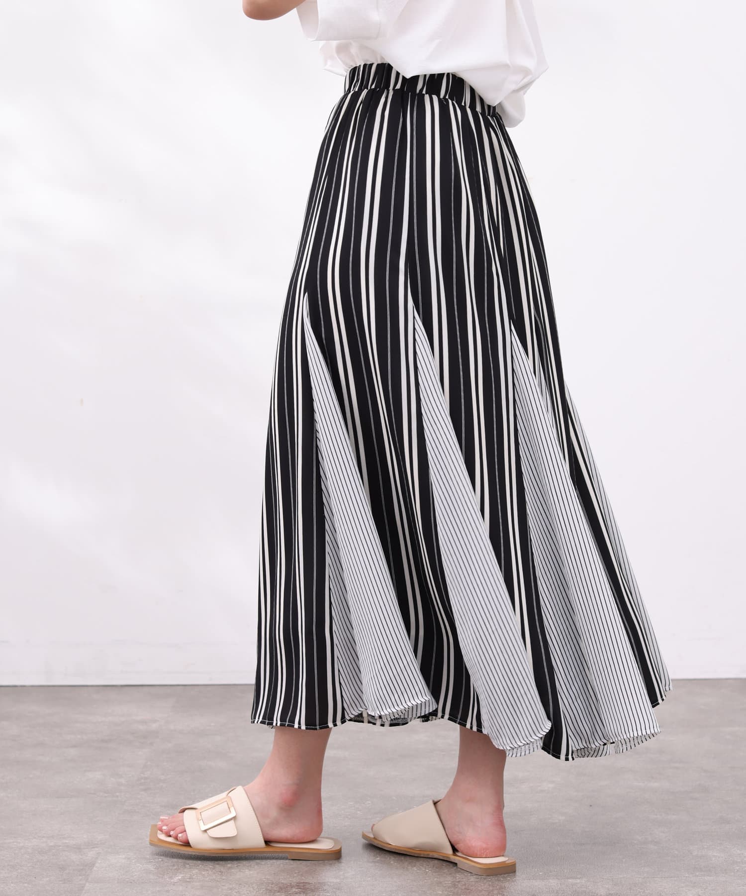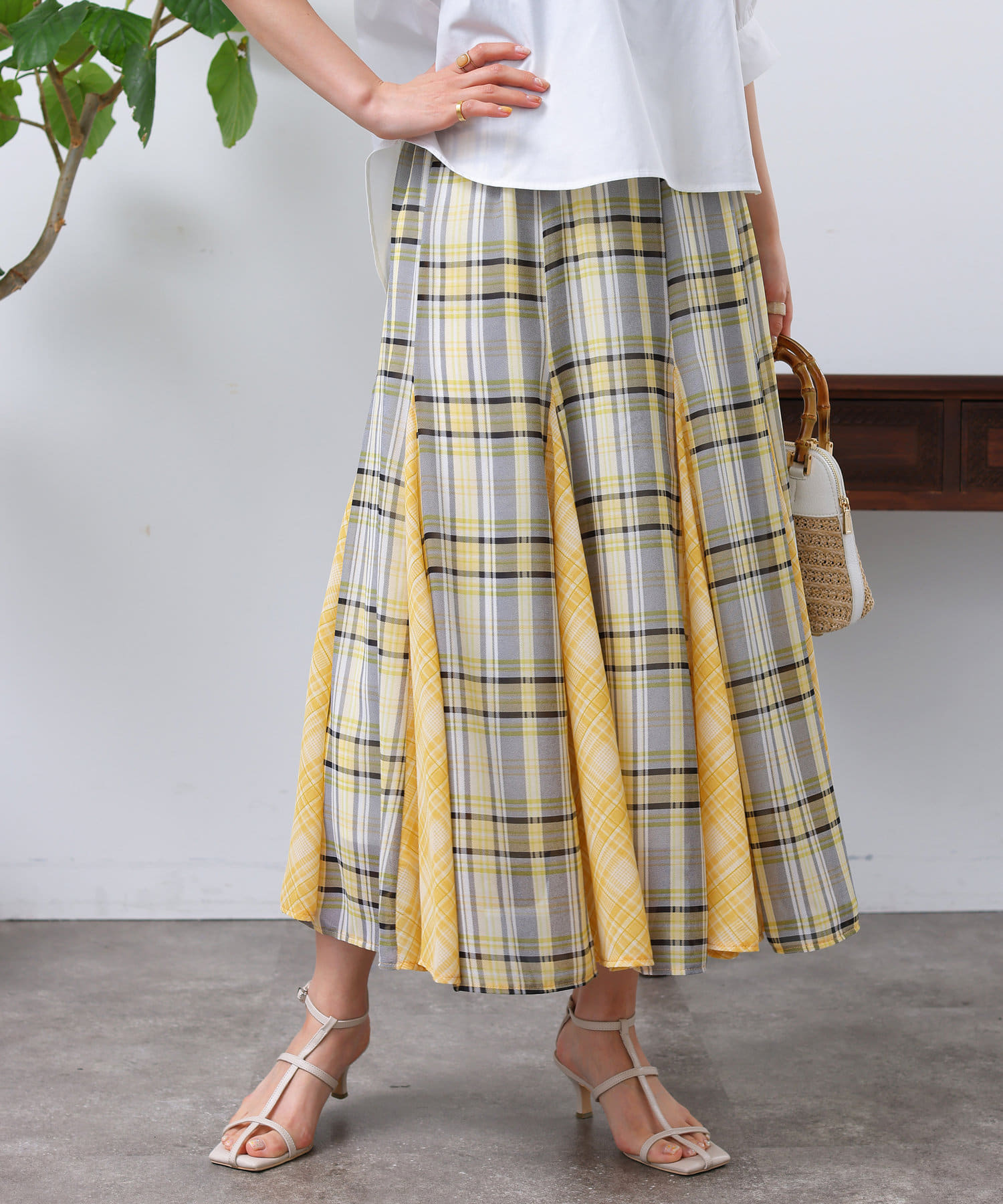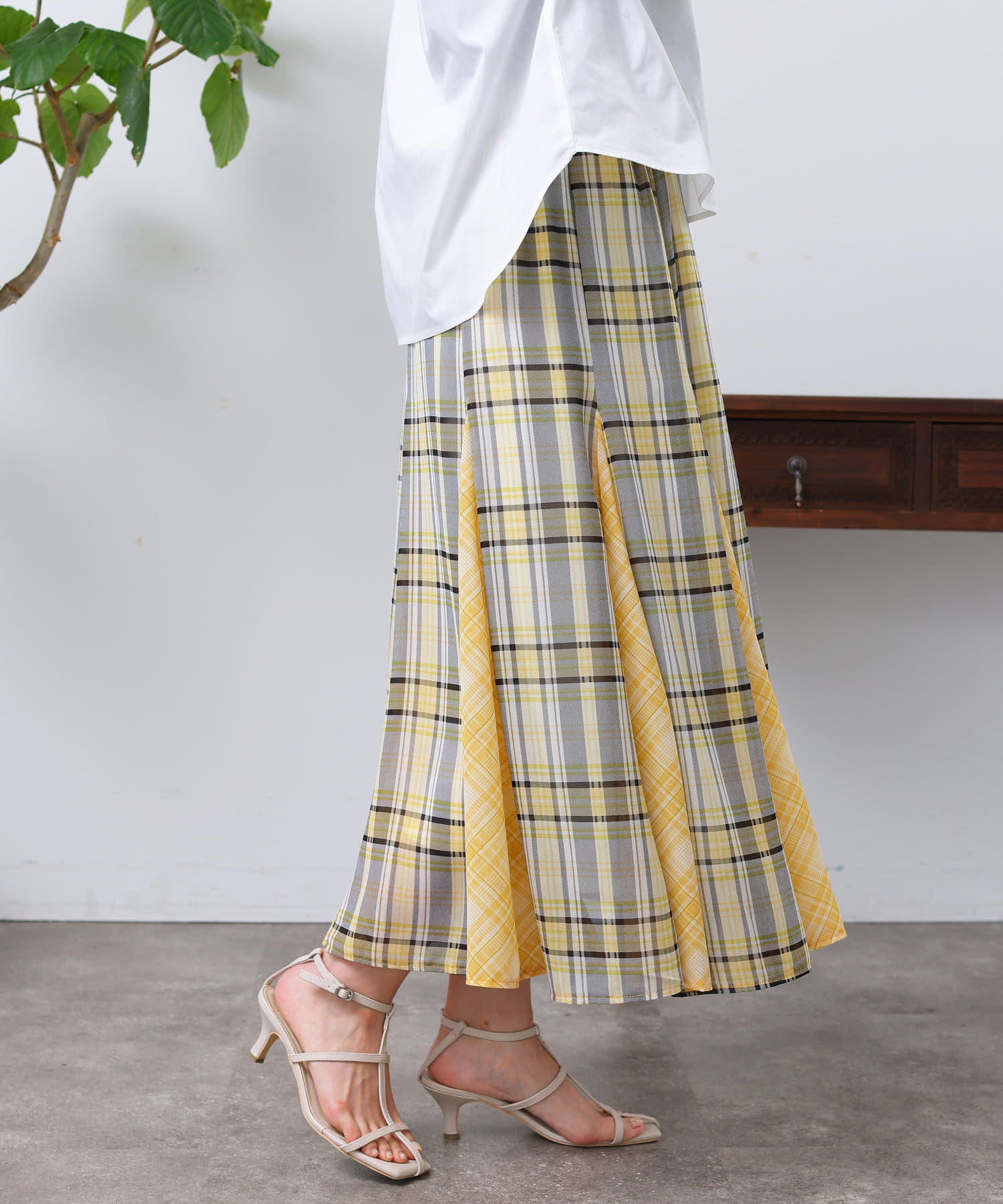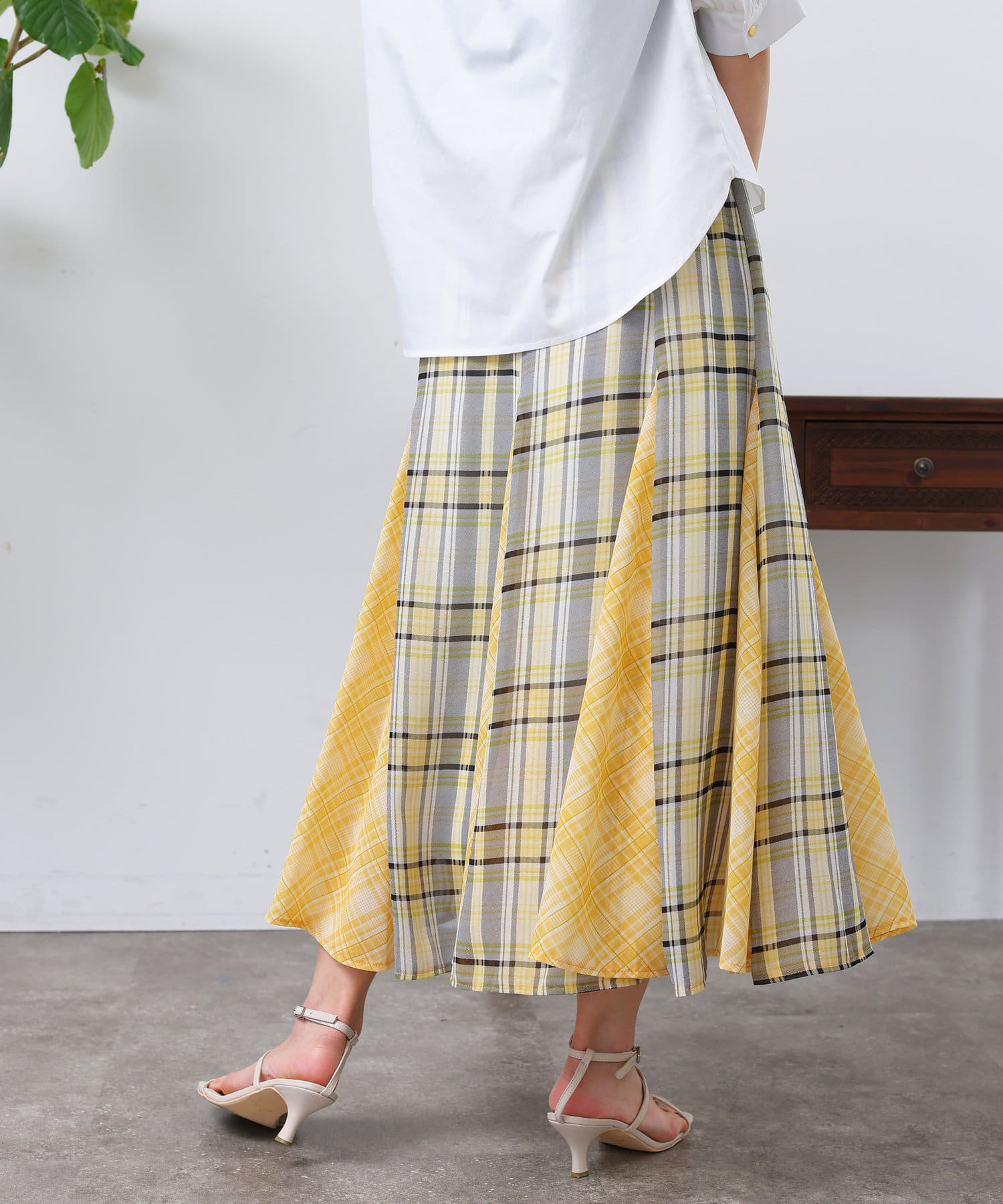 異なる柄同士のはぎデザインが特徴的なフレアスカートです。