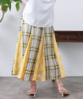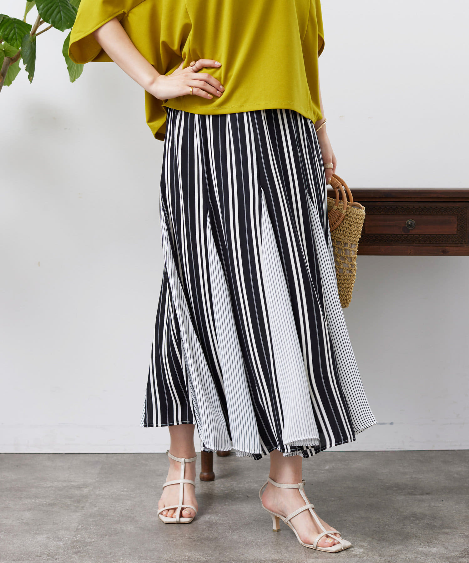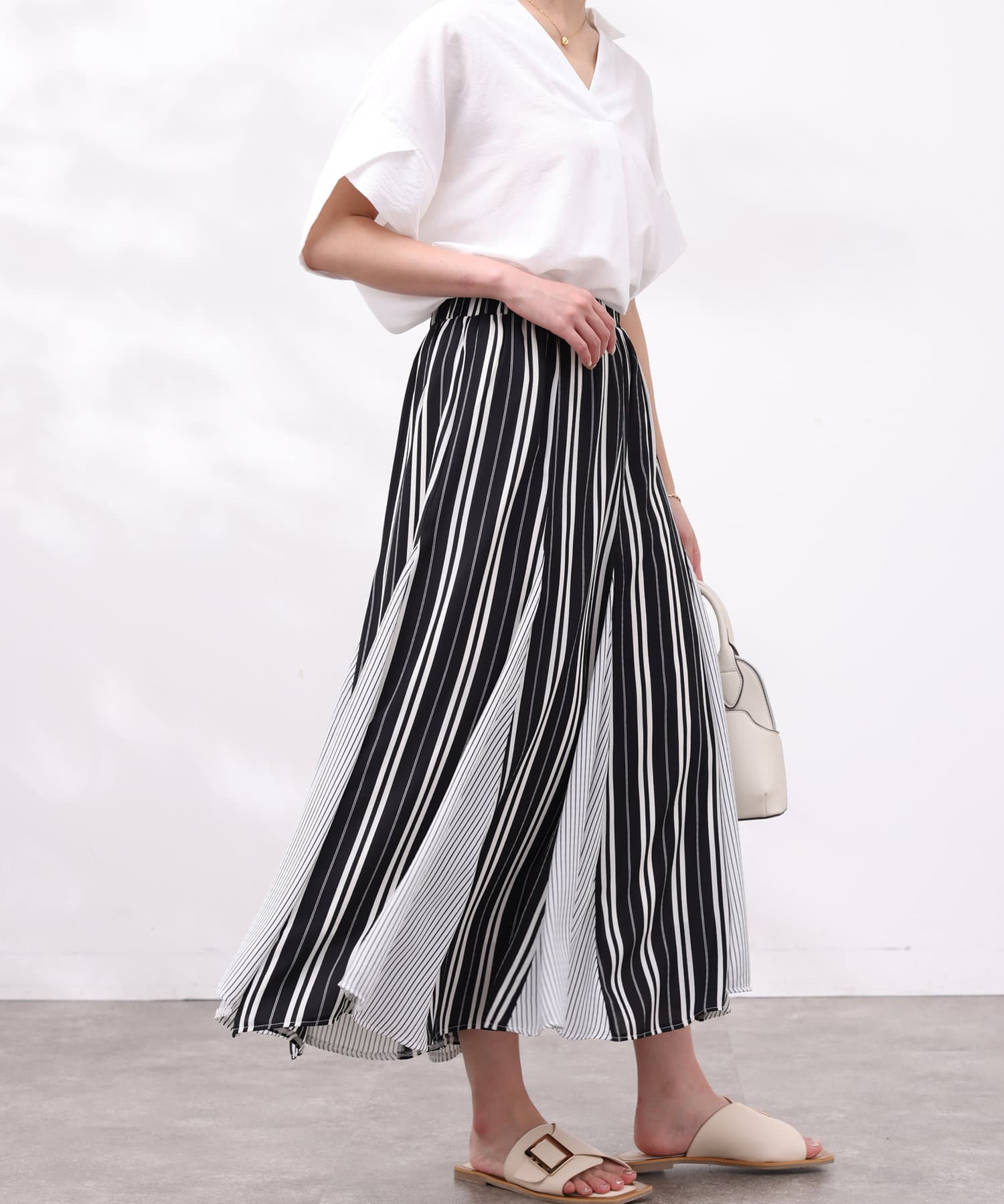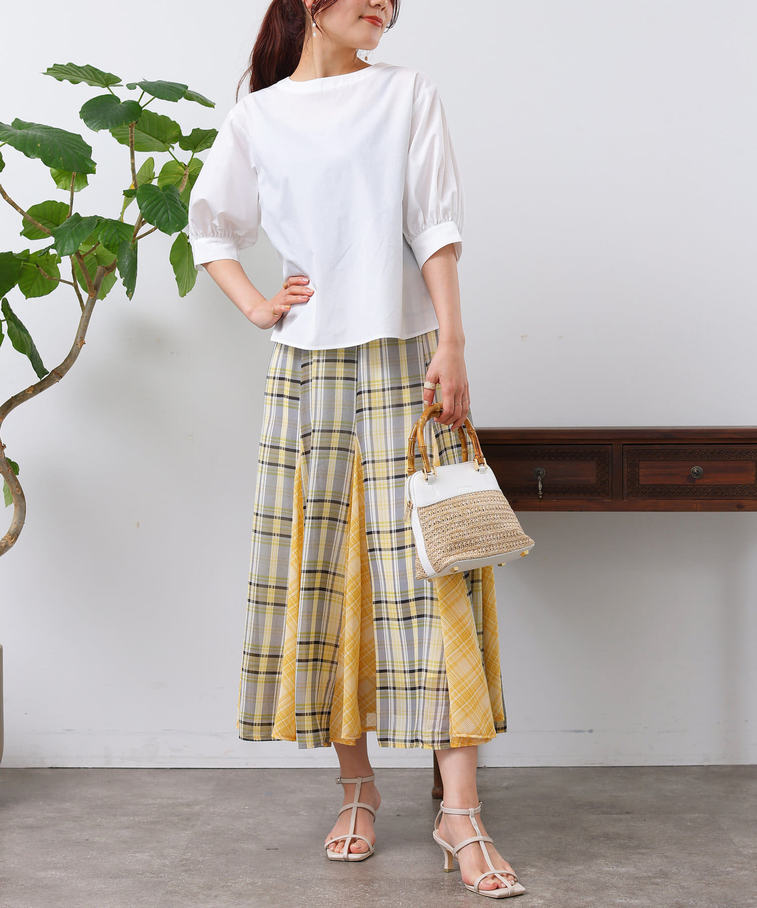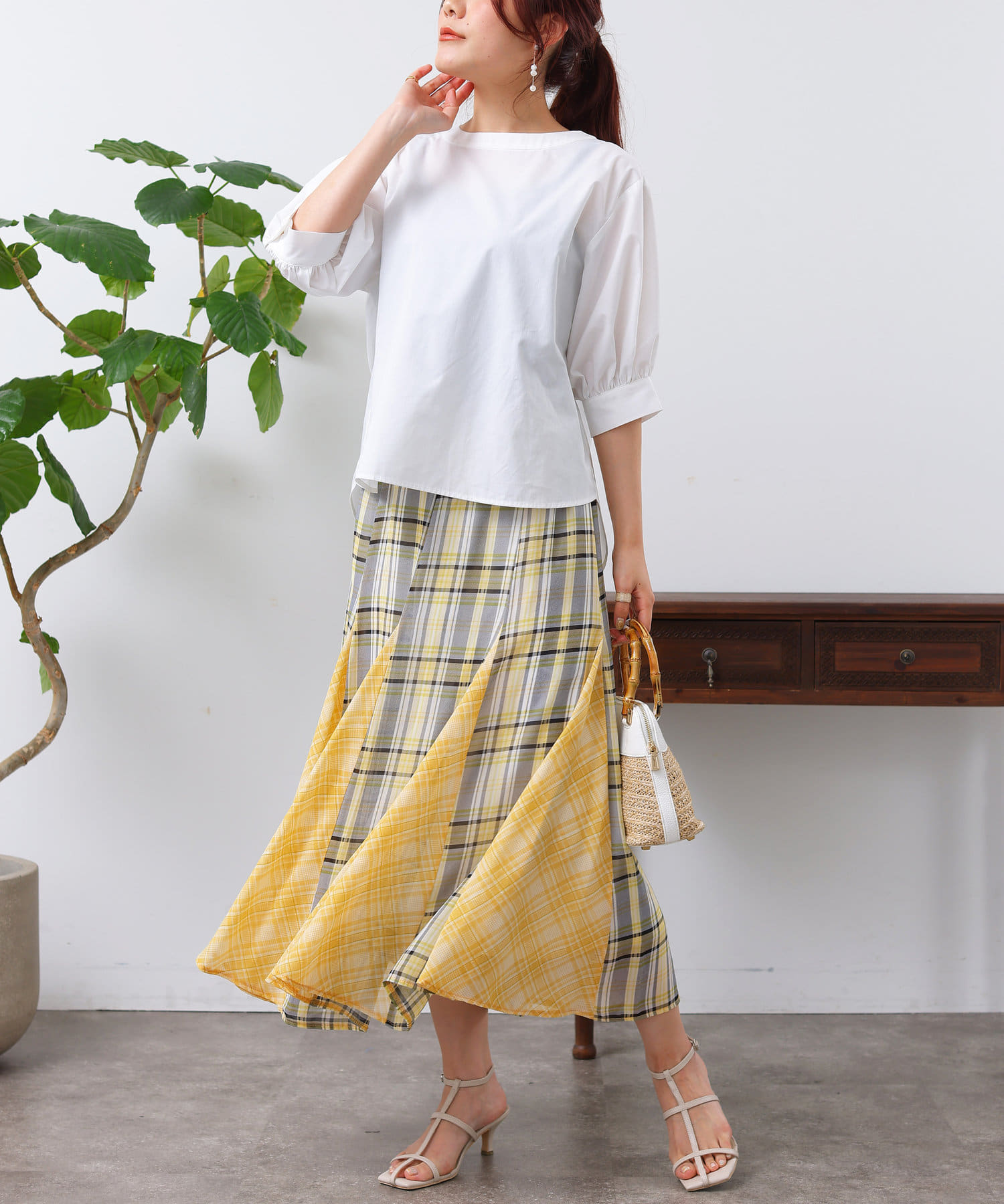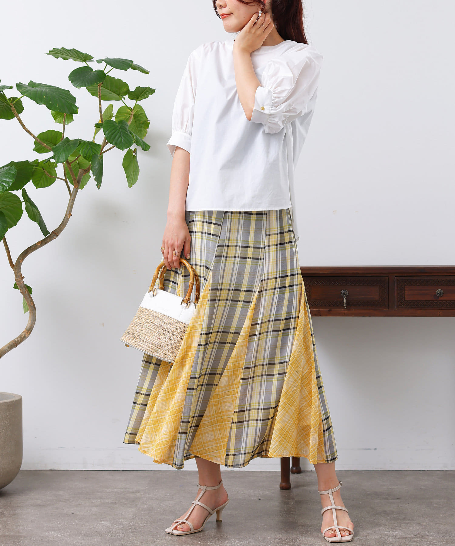 異なる柄同士のはぎデザインが特徴的なフレアスカートです。