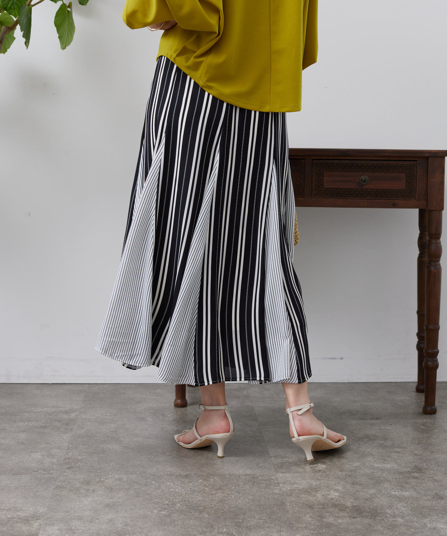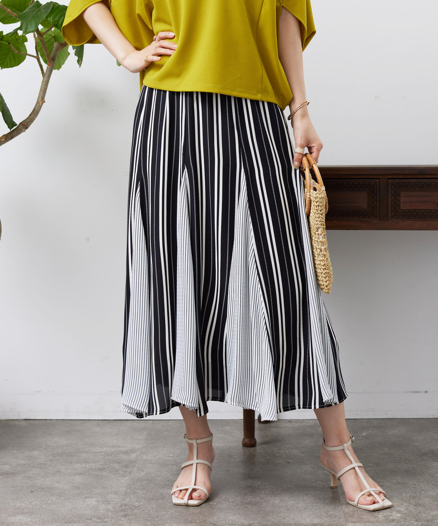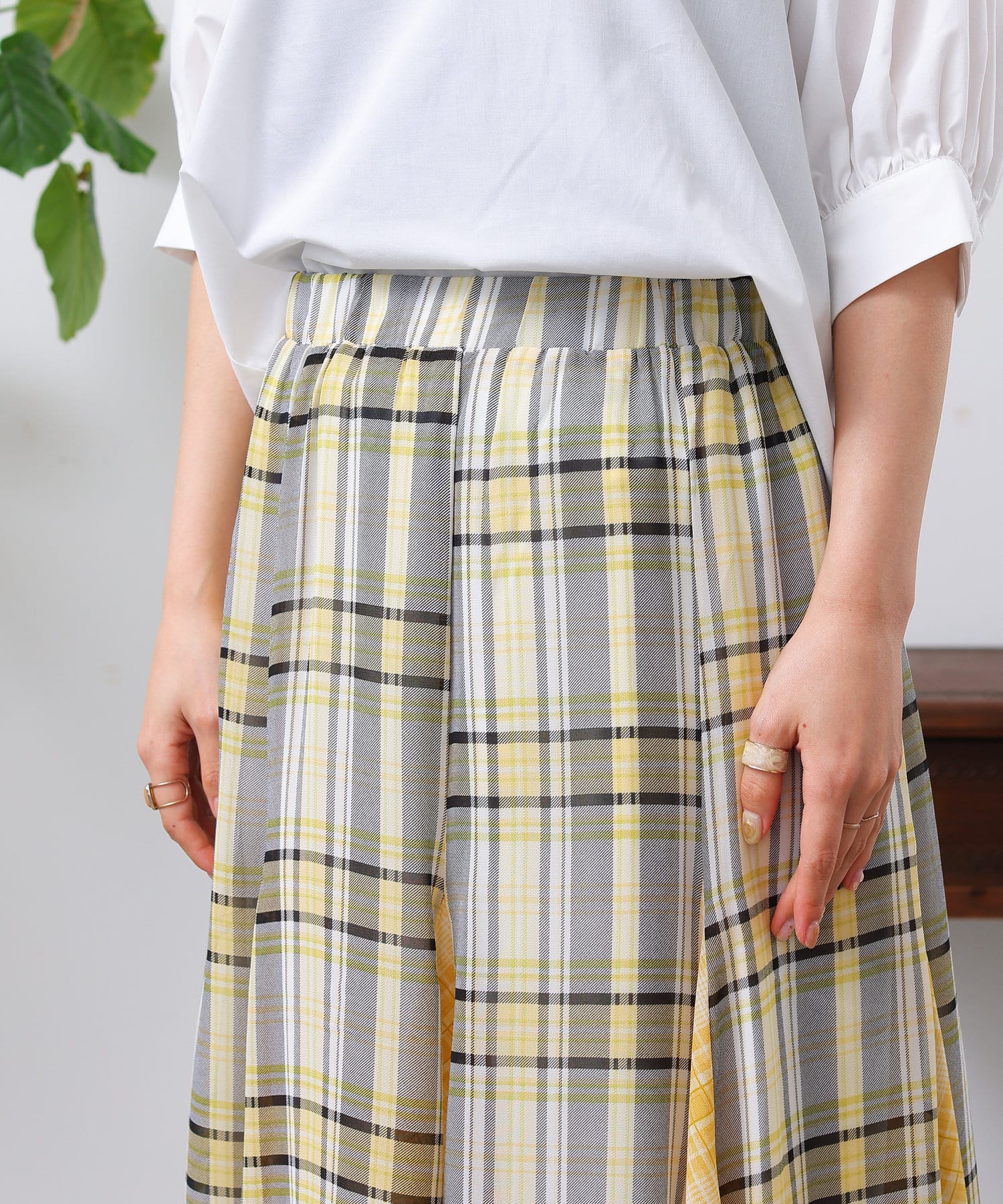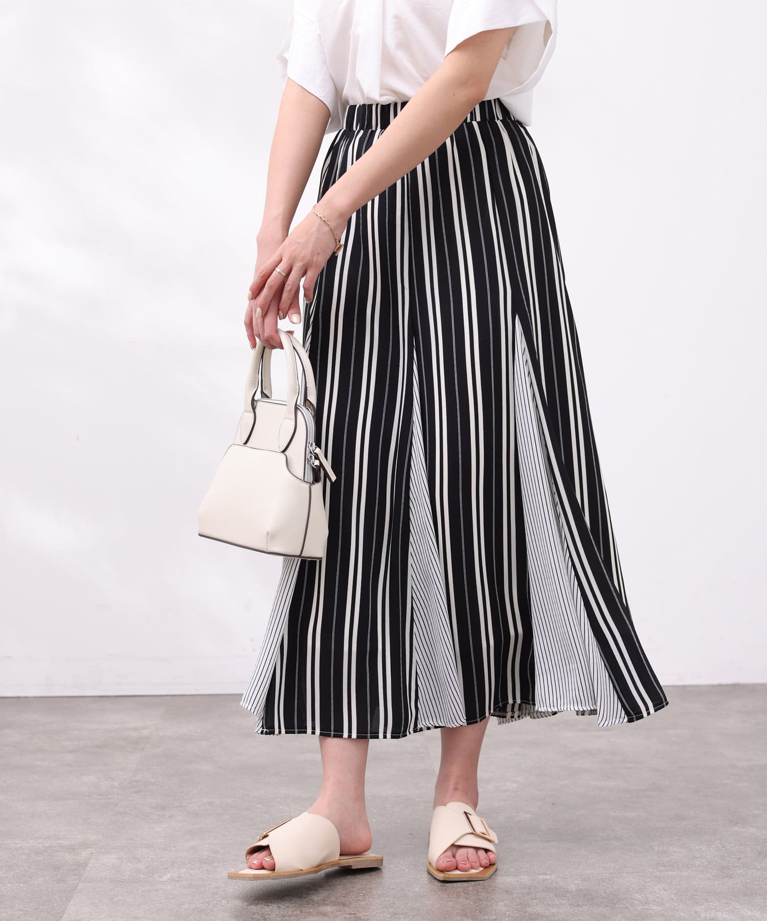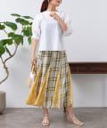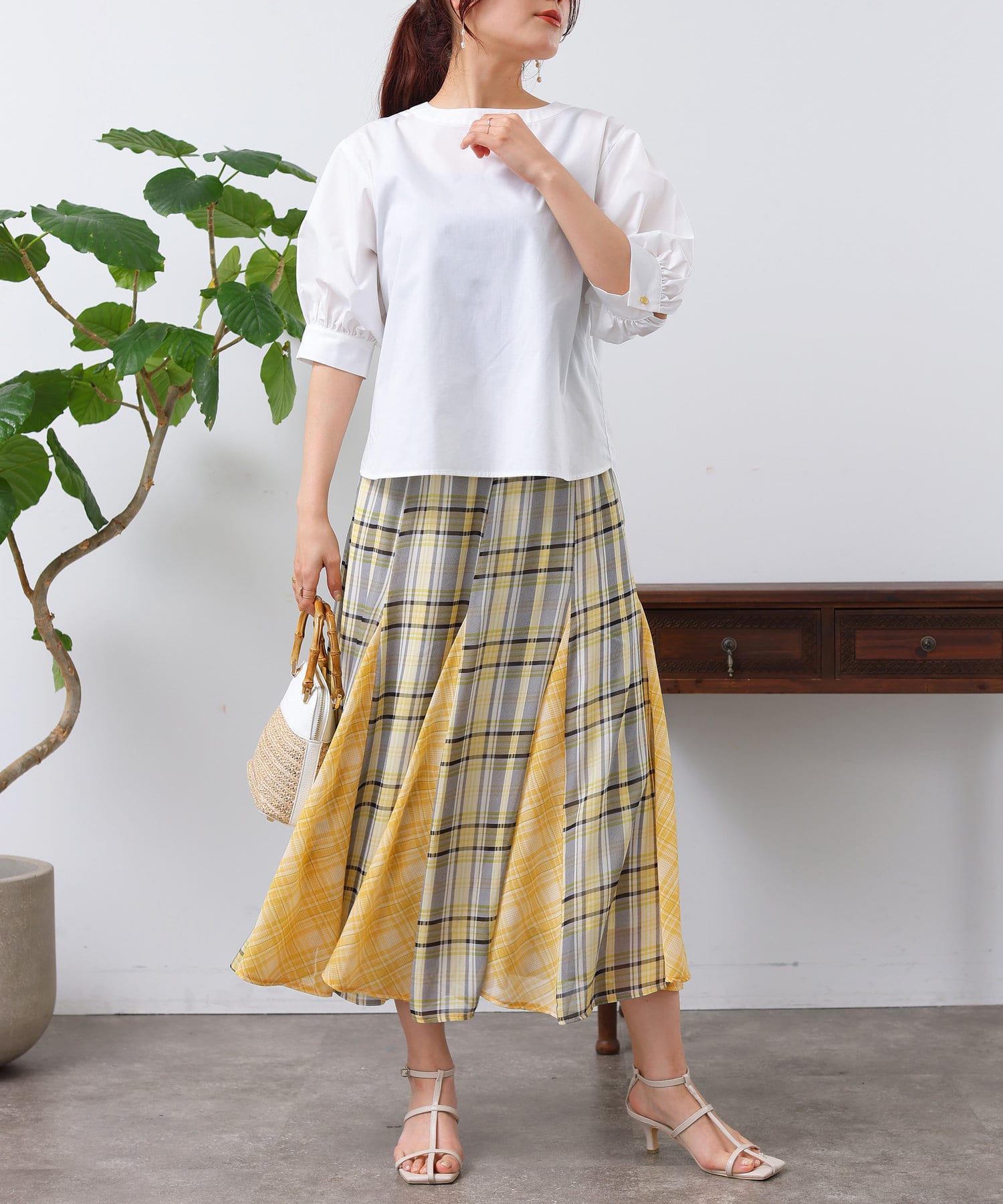 異なる柄同士のはぎデザインが特徴的なフレアスカートです。