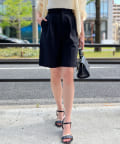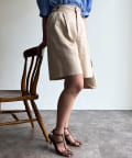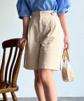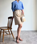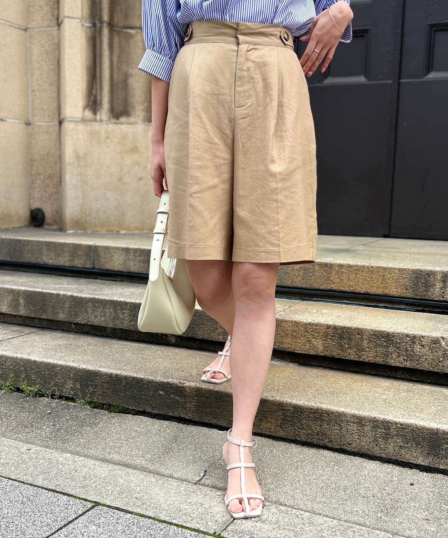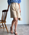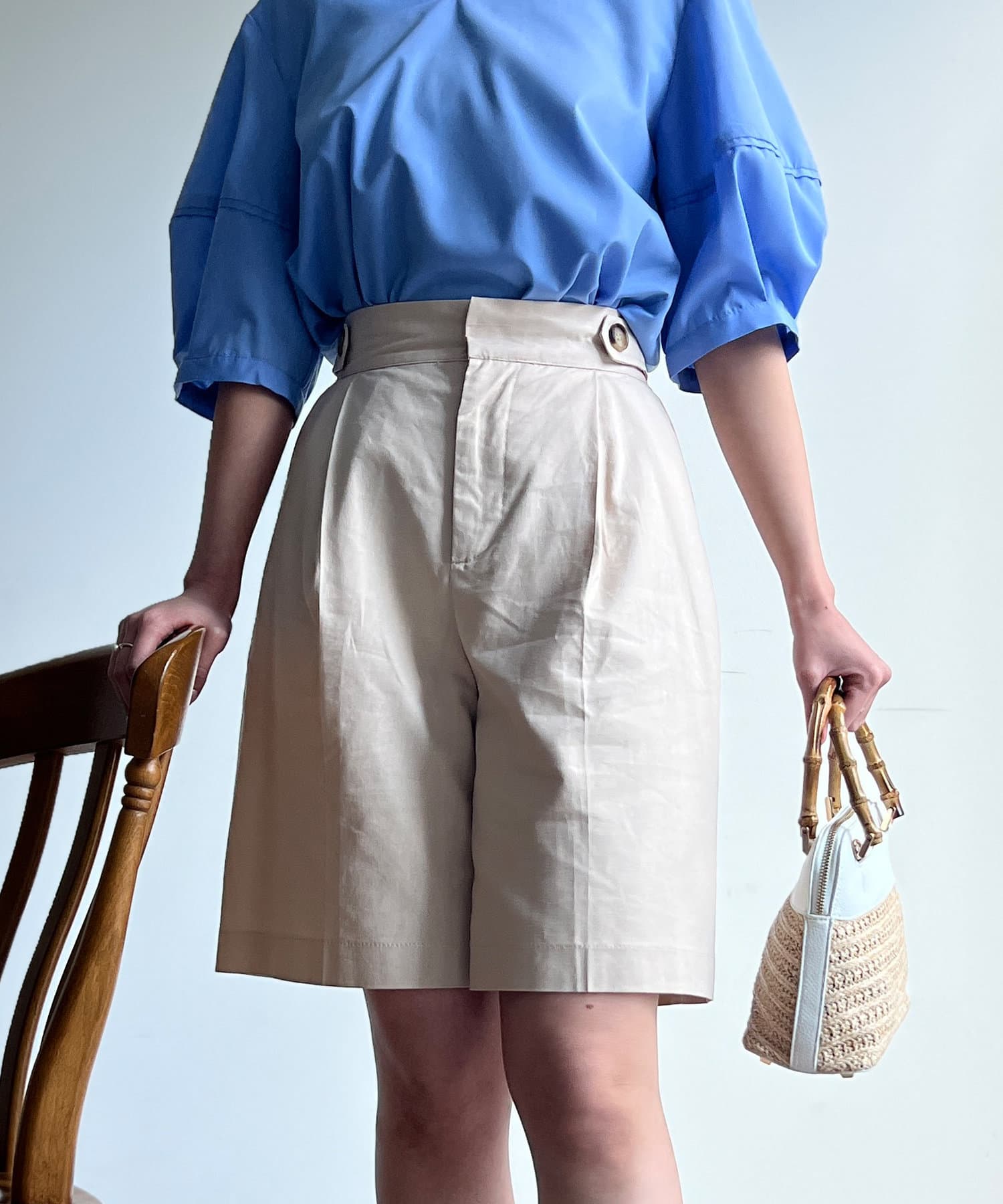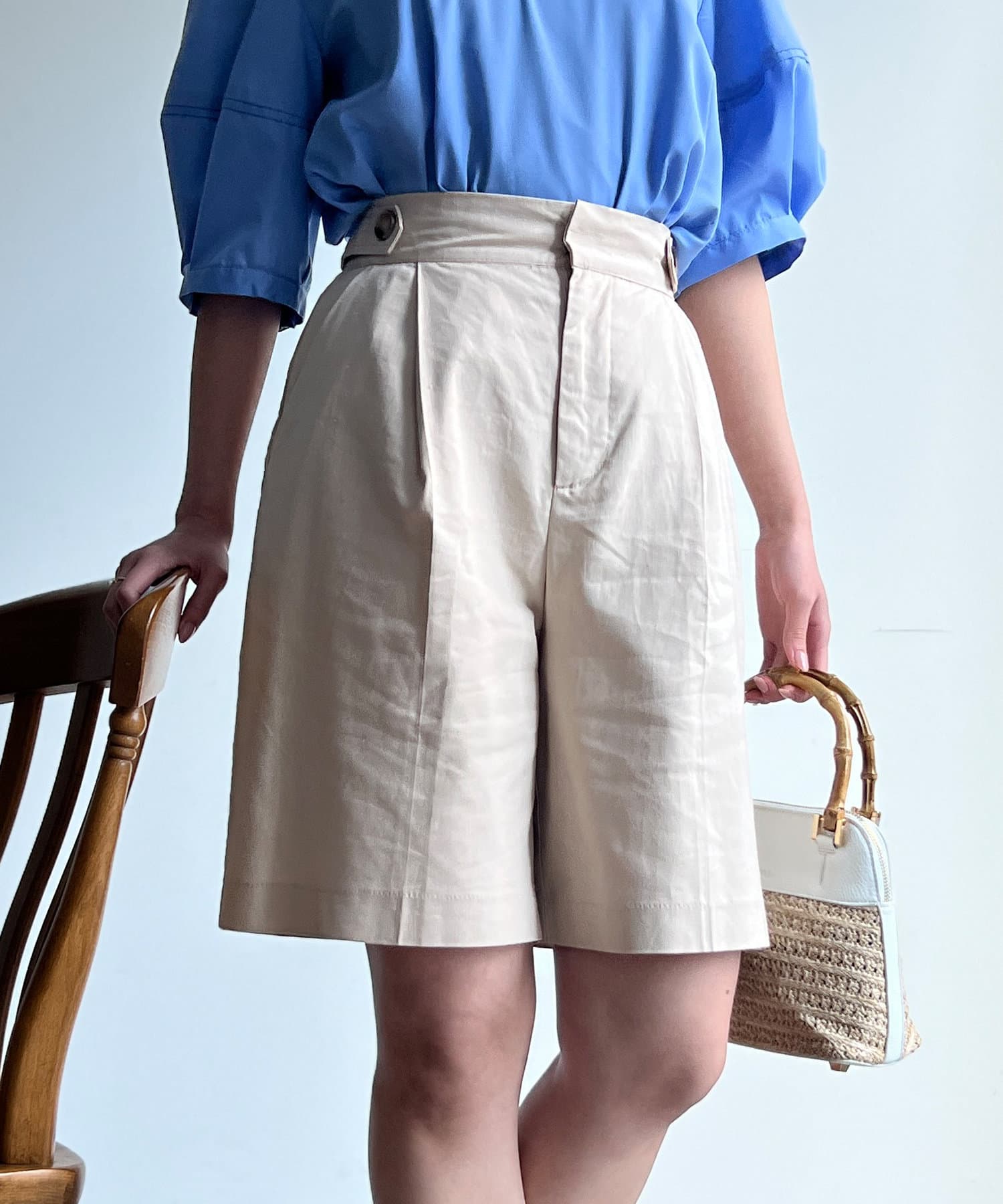 縦ラインをさり気なく強調してくれるセンタープレスとウエストサイドについたマーブルボタンがポイントのハーフパンツ。