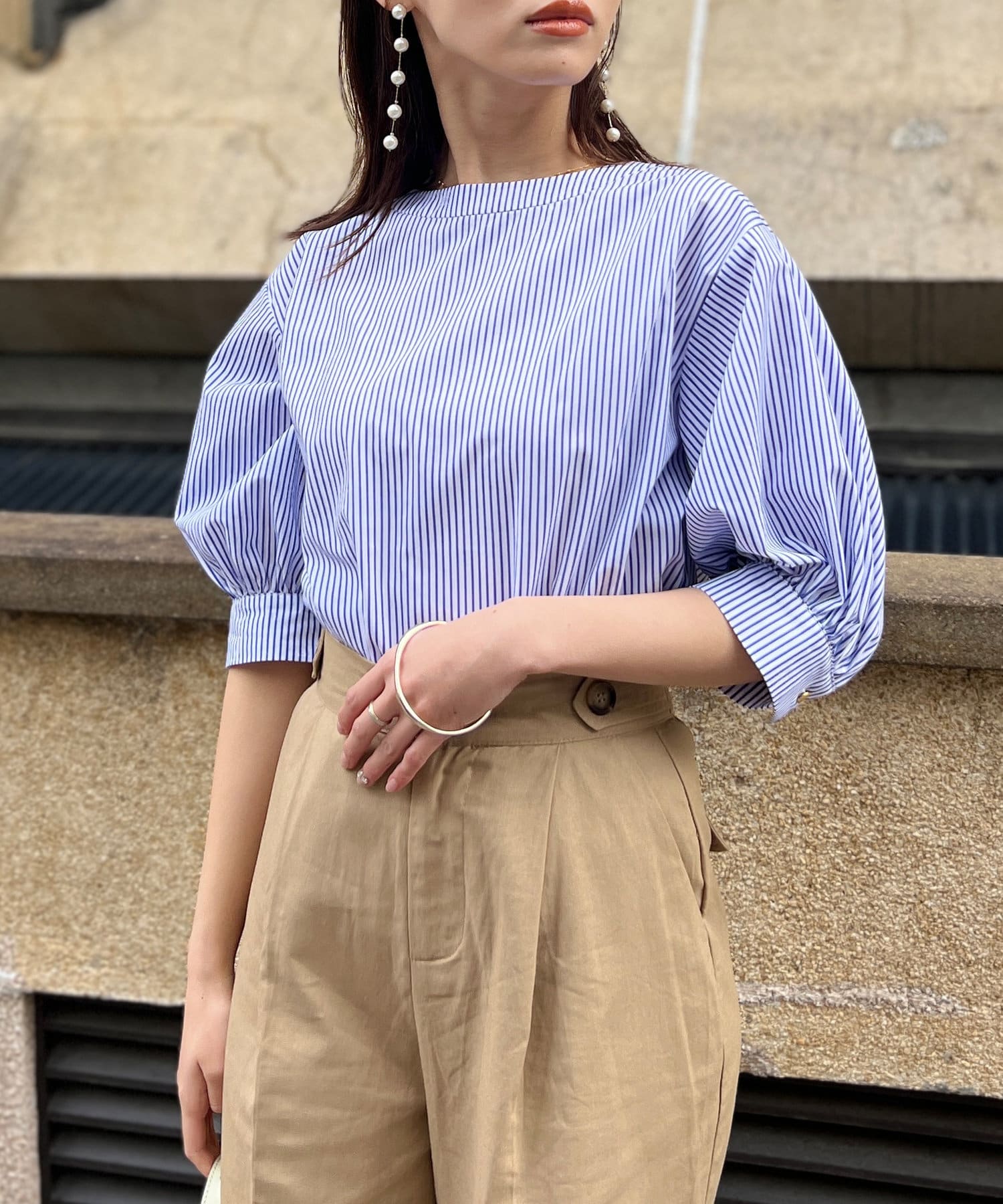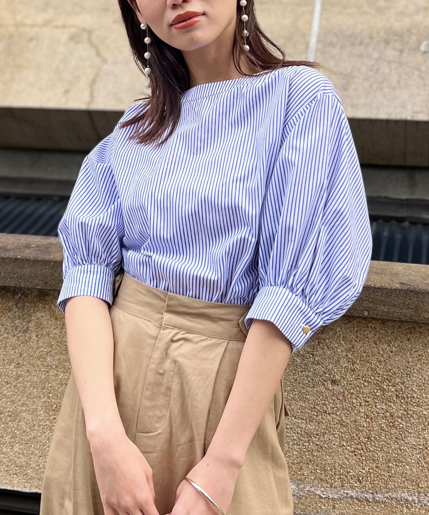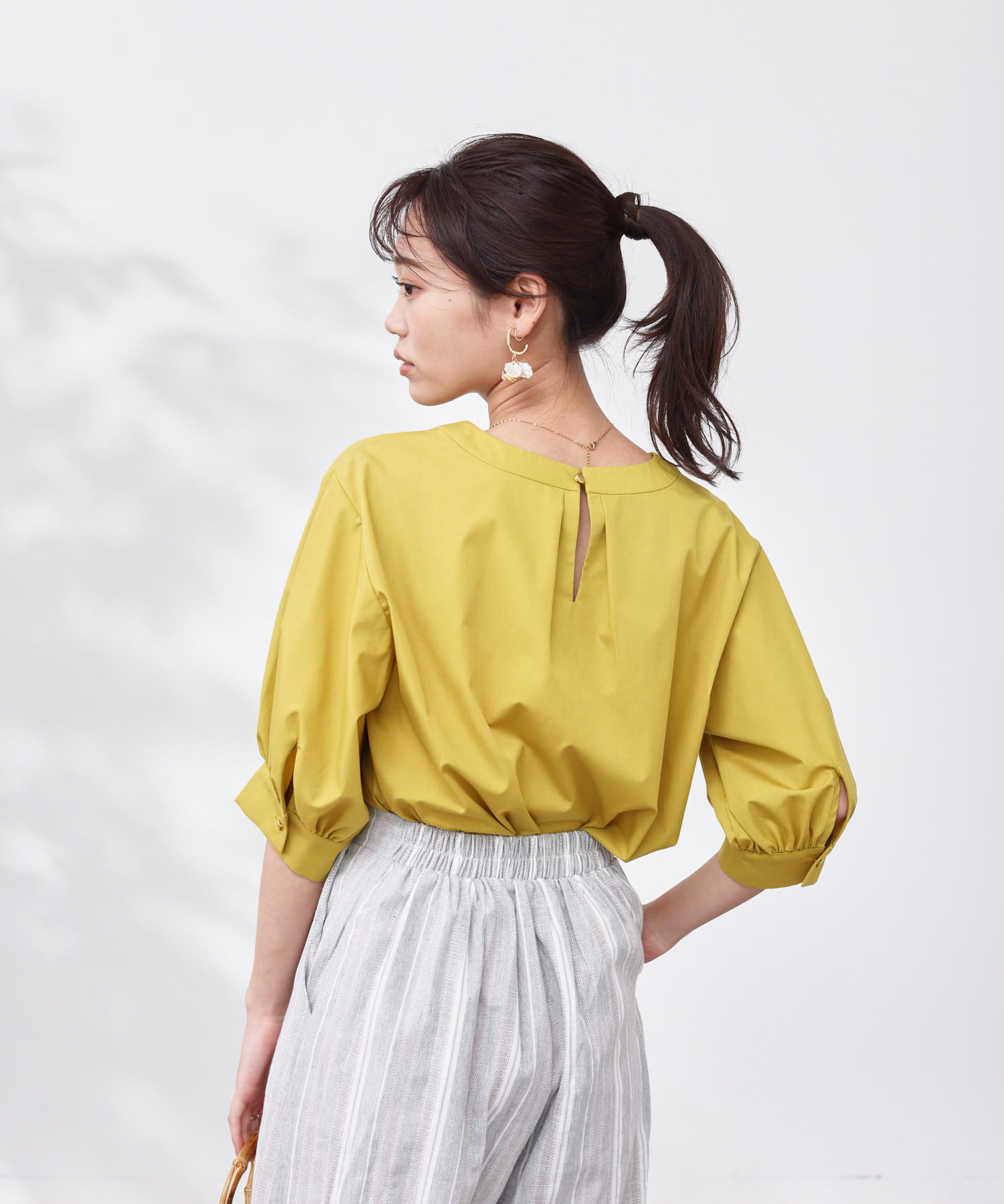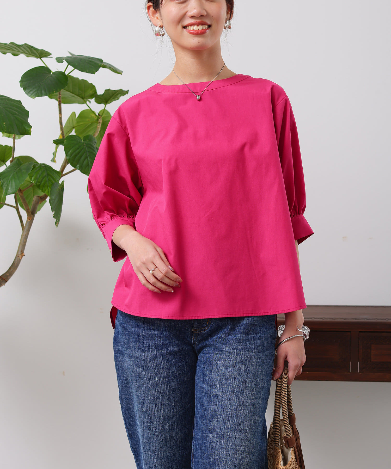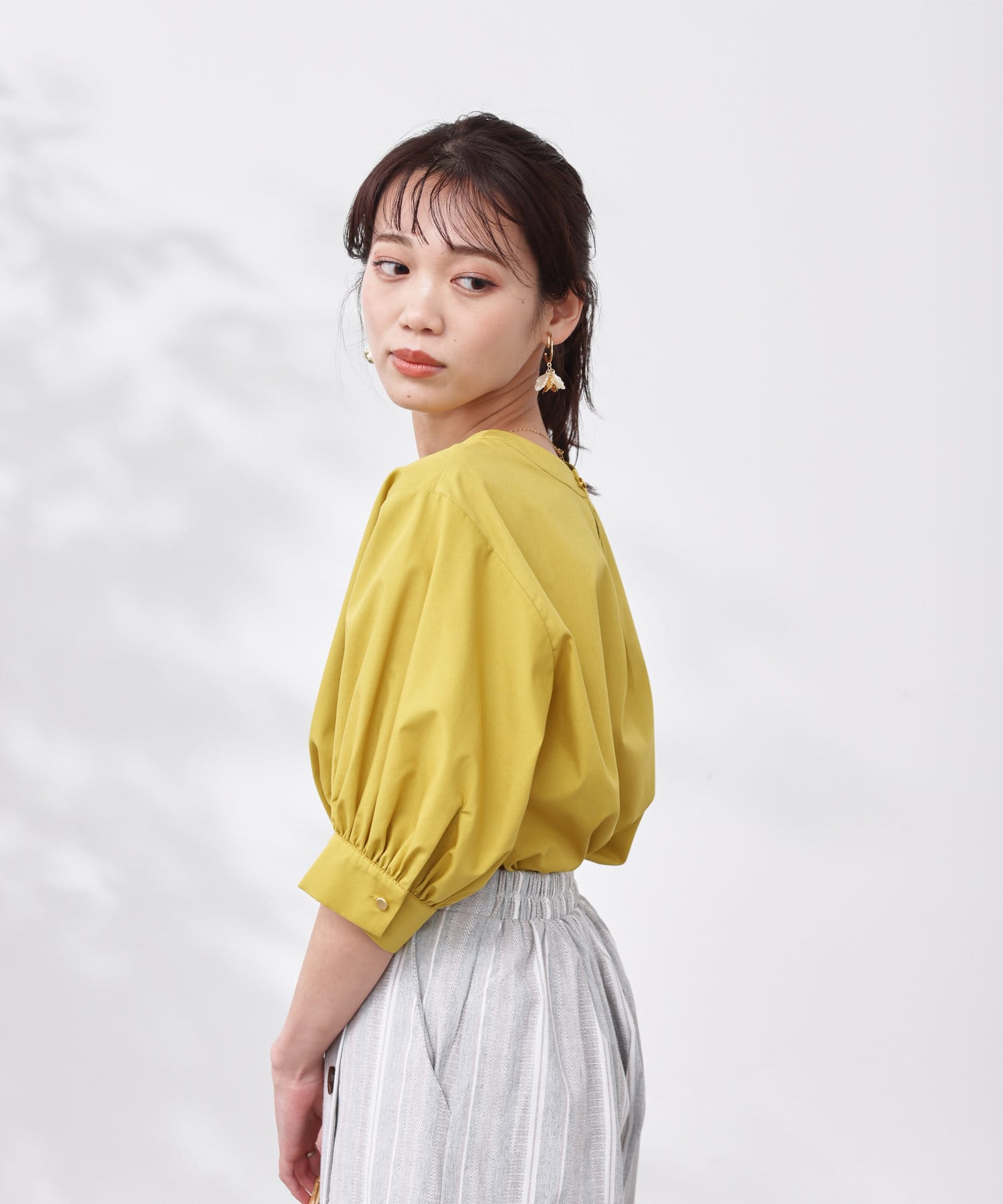清涼感のある綿素材と5分袖のボリューム感がトレンドライクな1枚