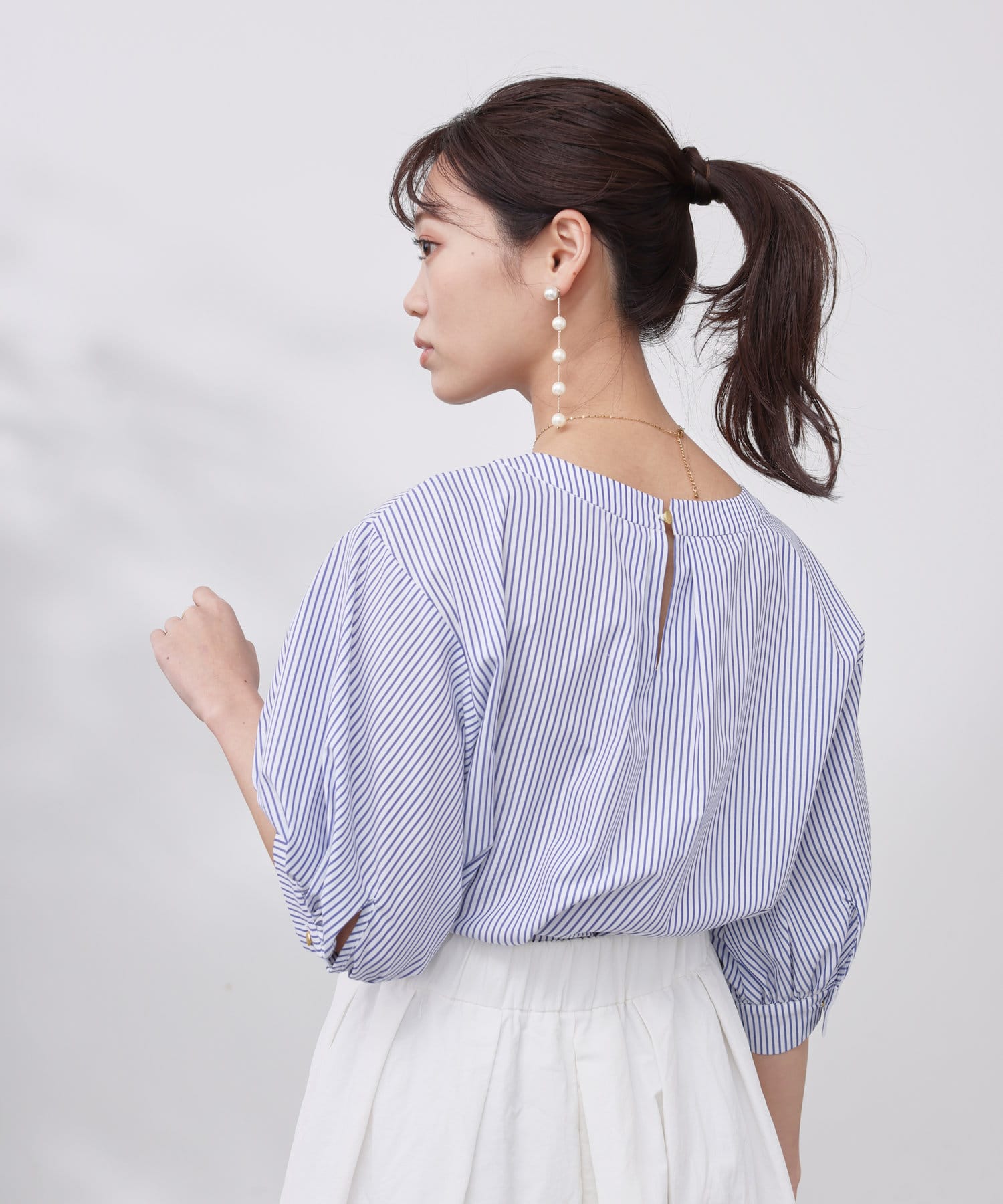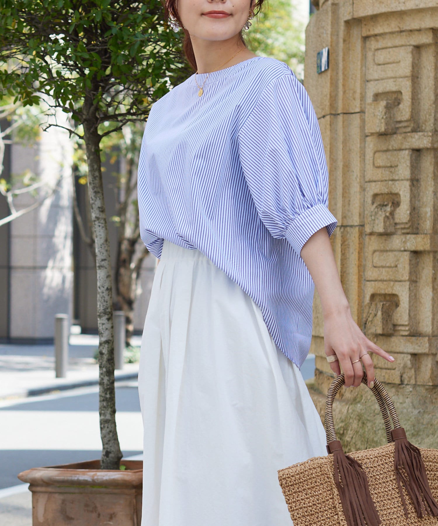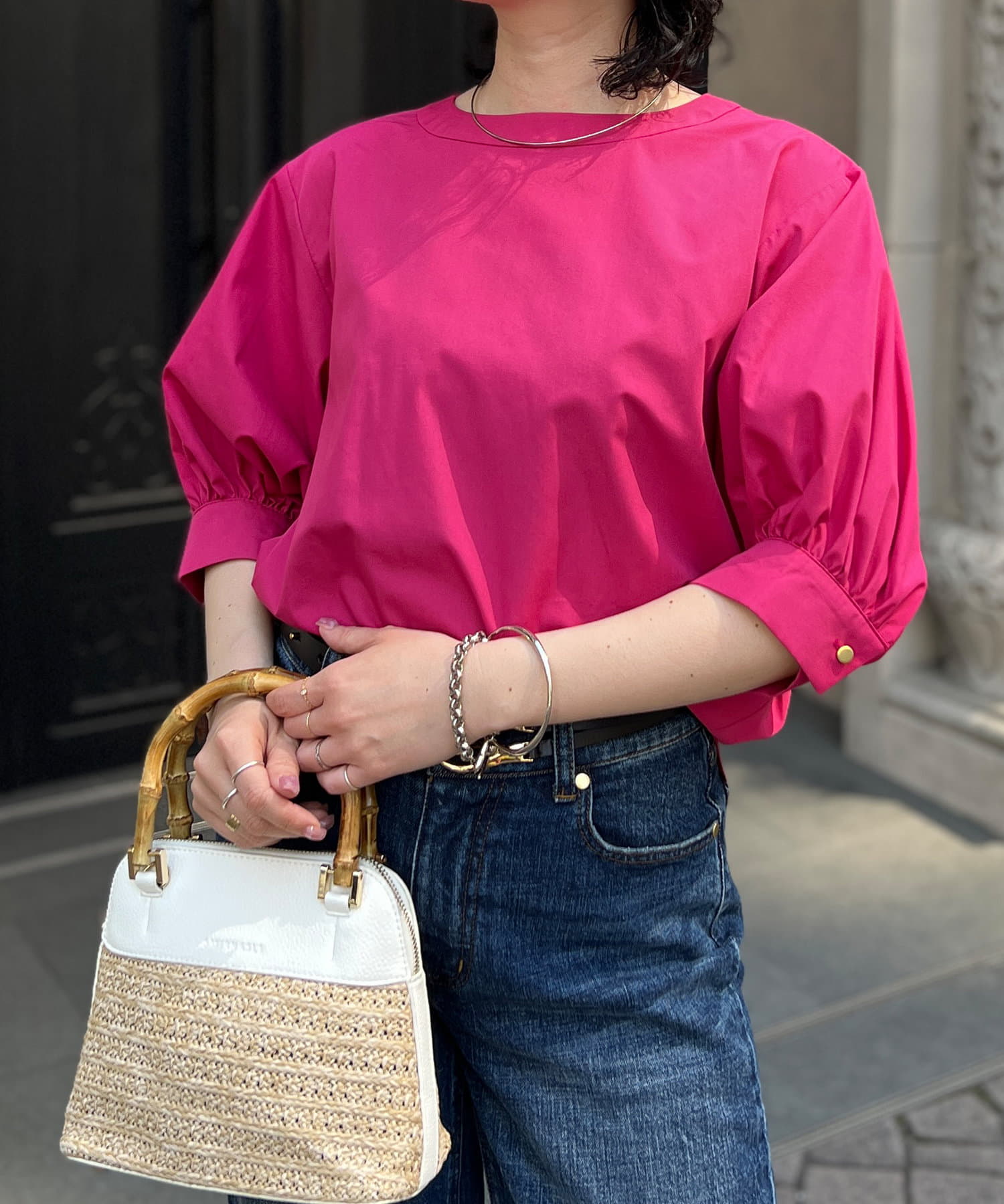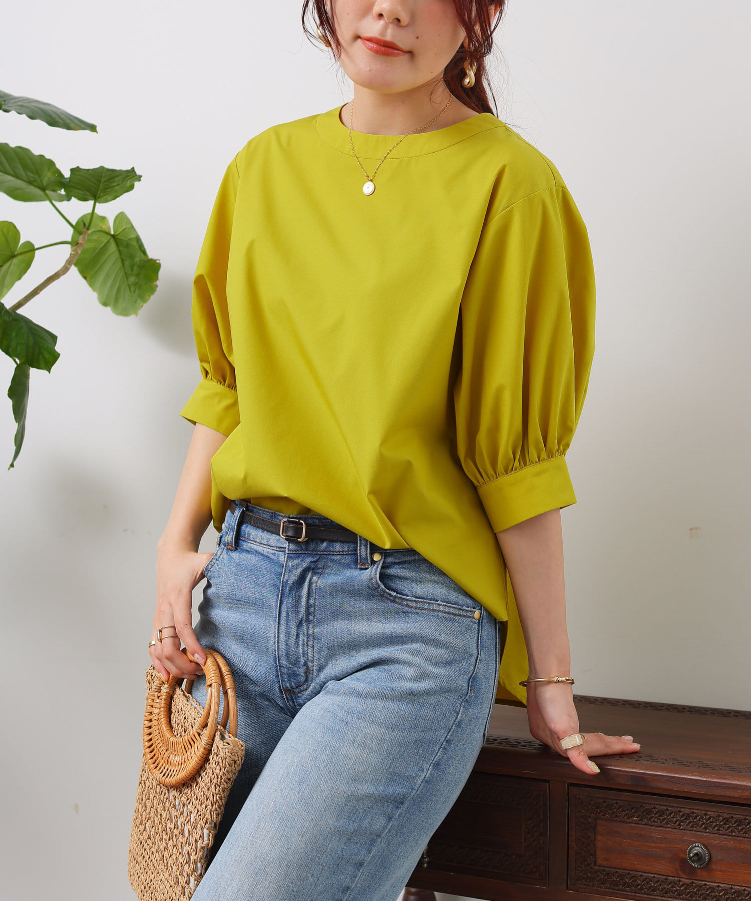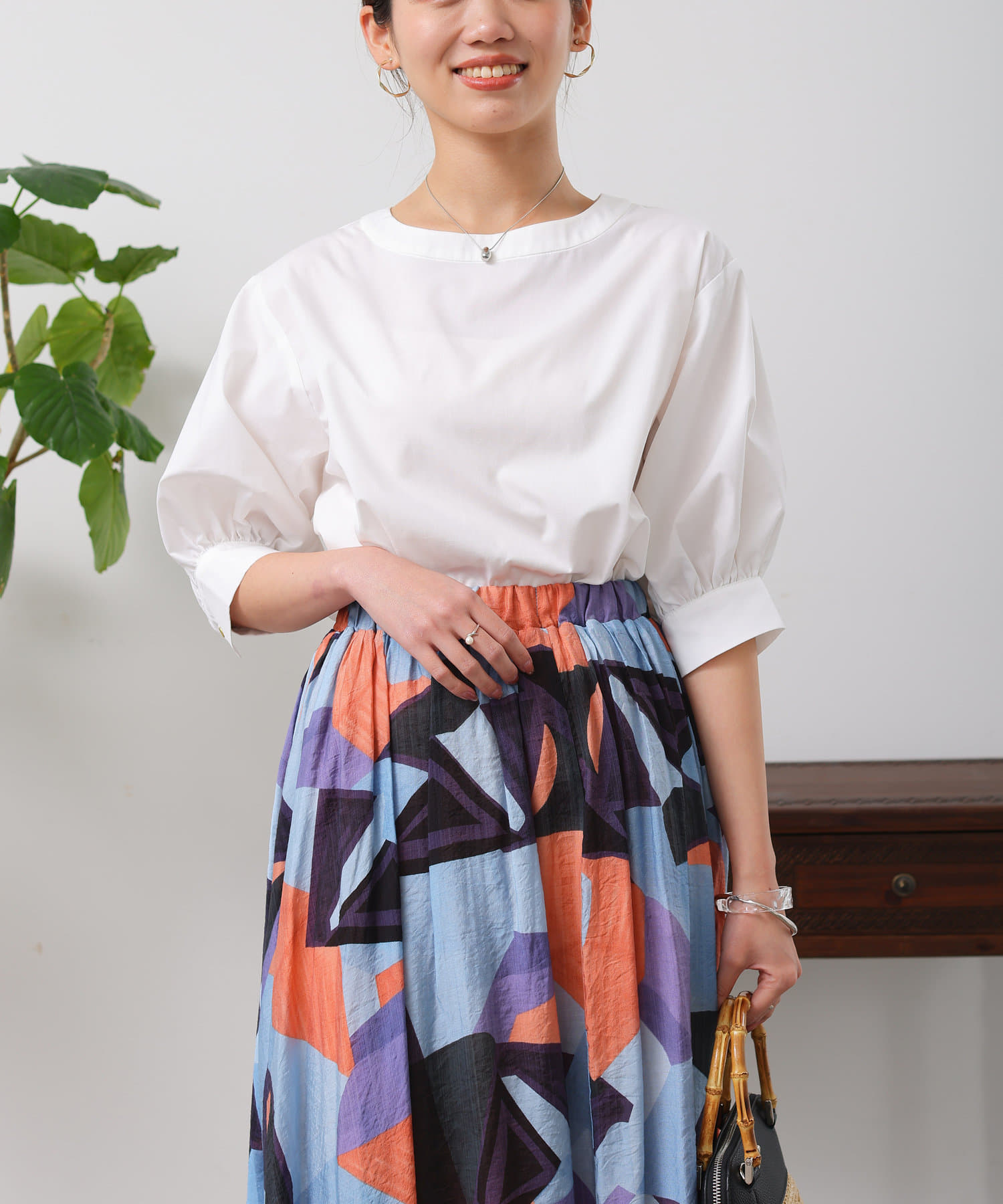 清涼感のある綿素材と5分袖のボリューム感がトレンドライクな1枚