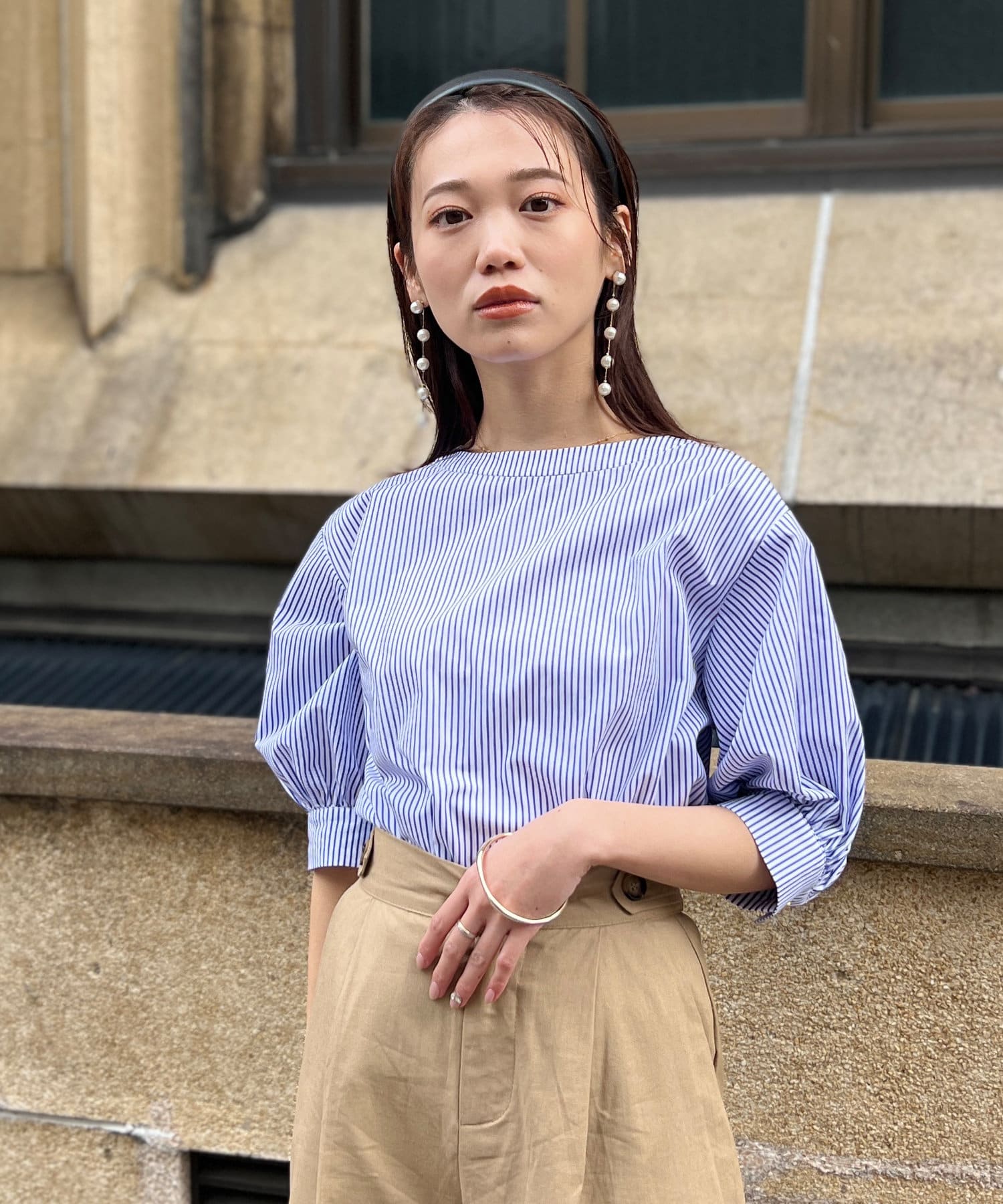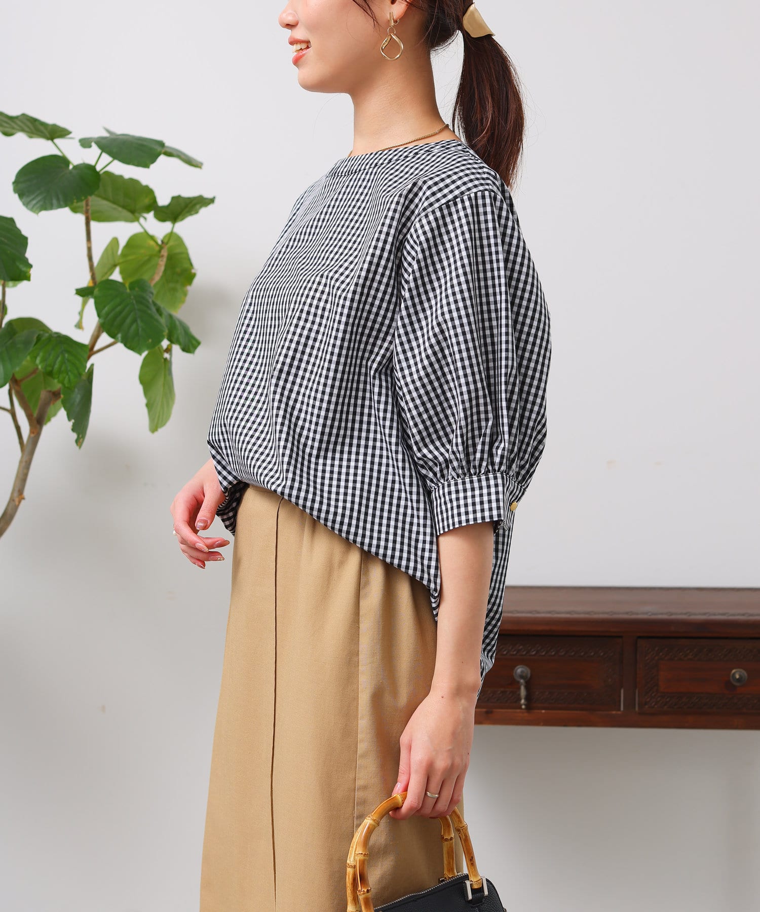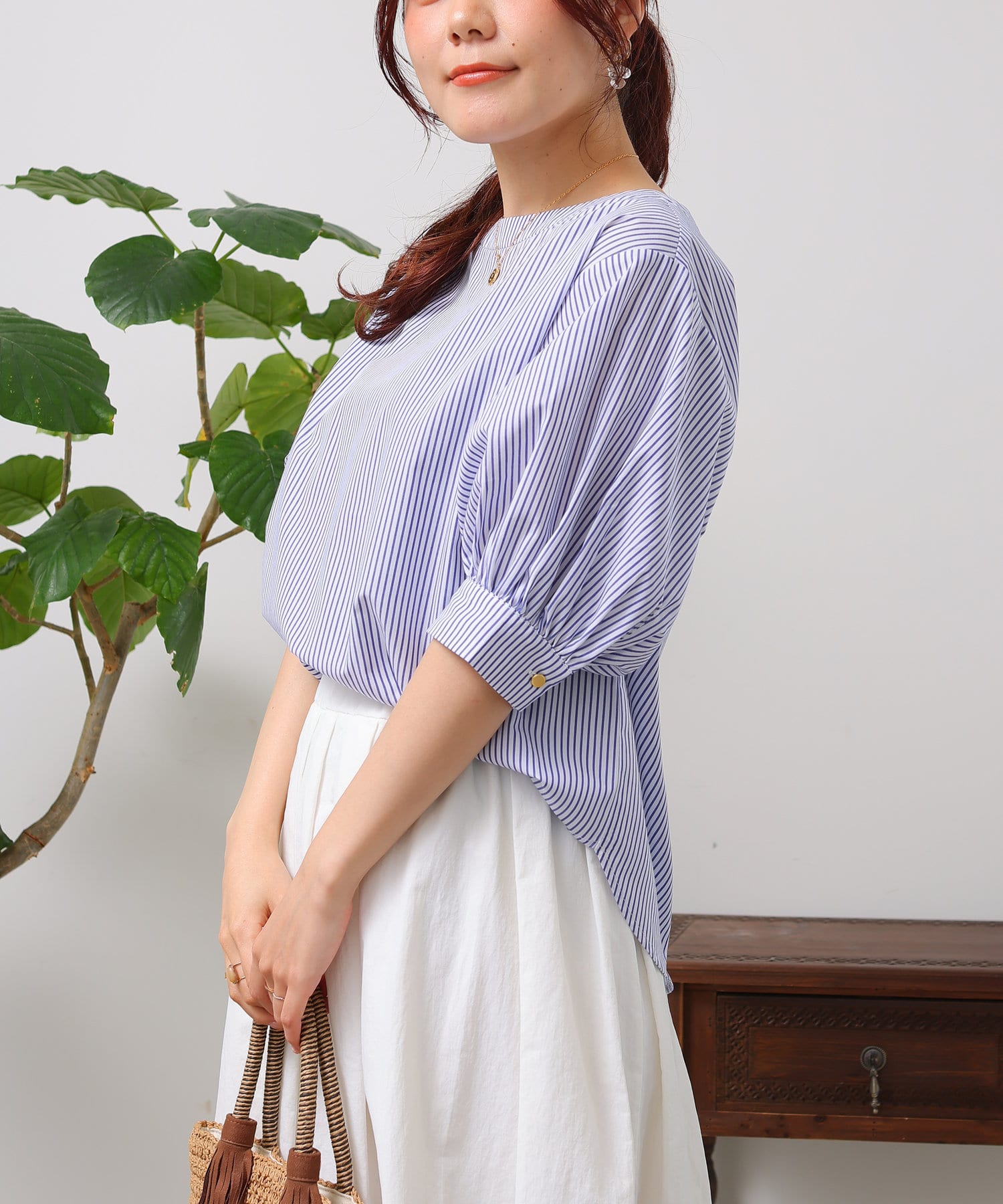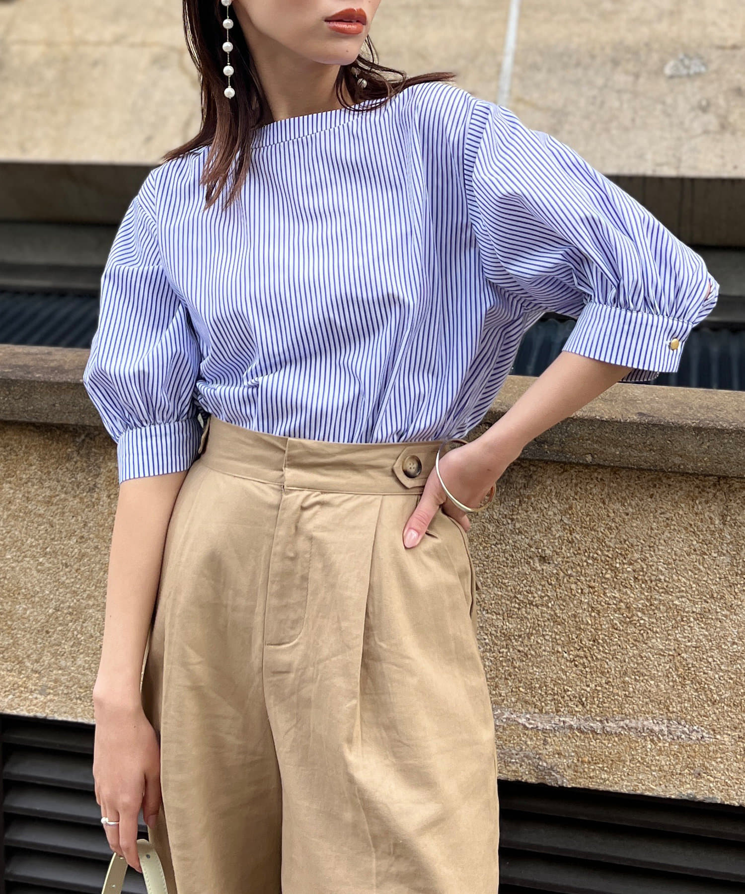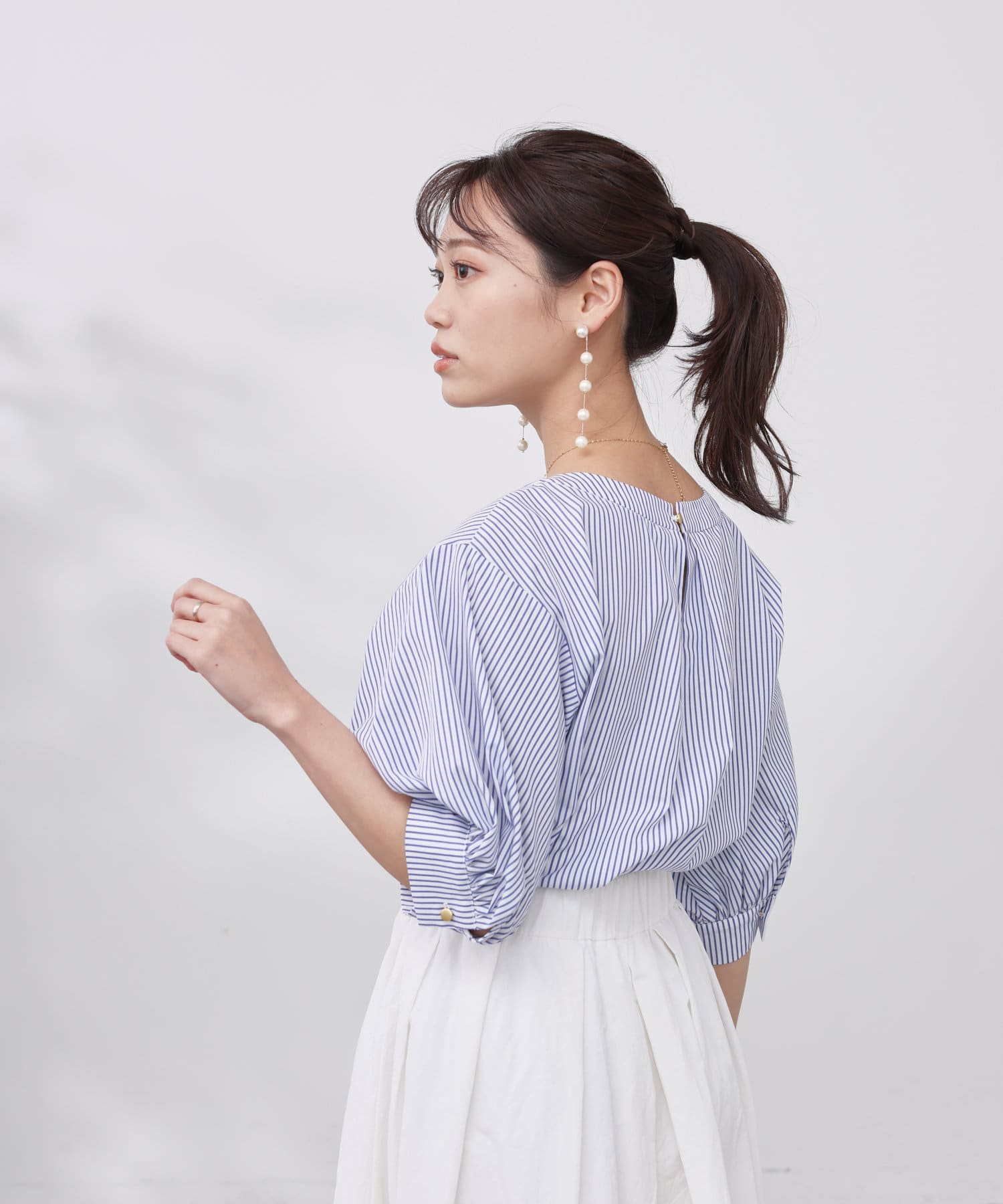 清涼感のある綿素材と5分袖のボリューム感がトレンドライクな1枚