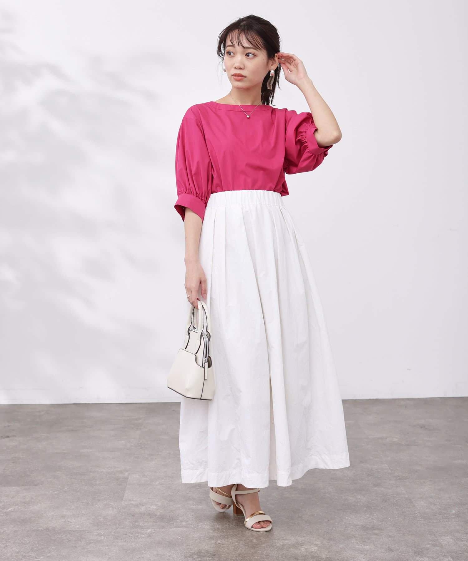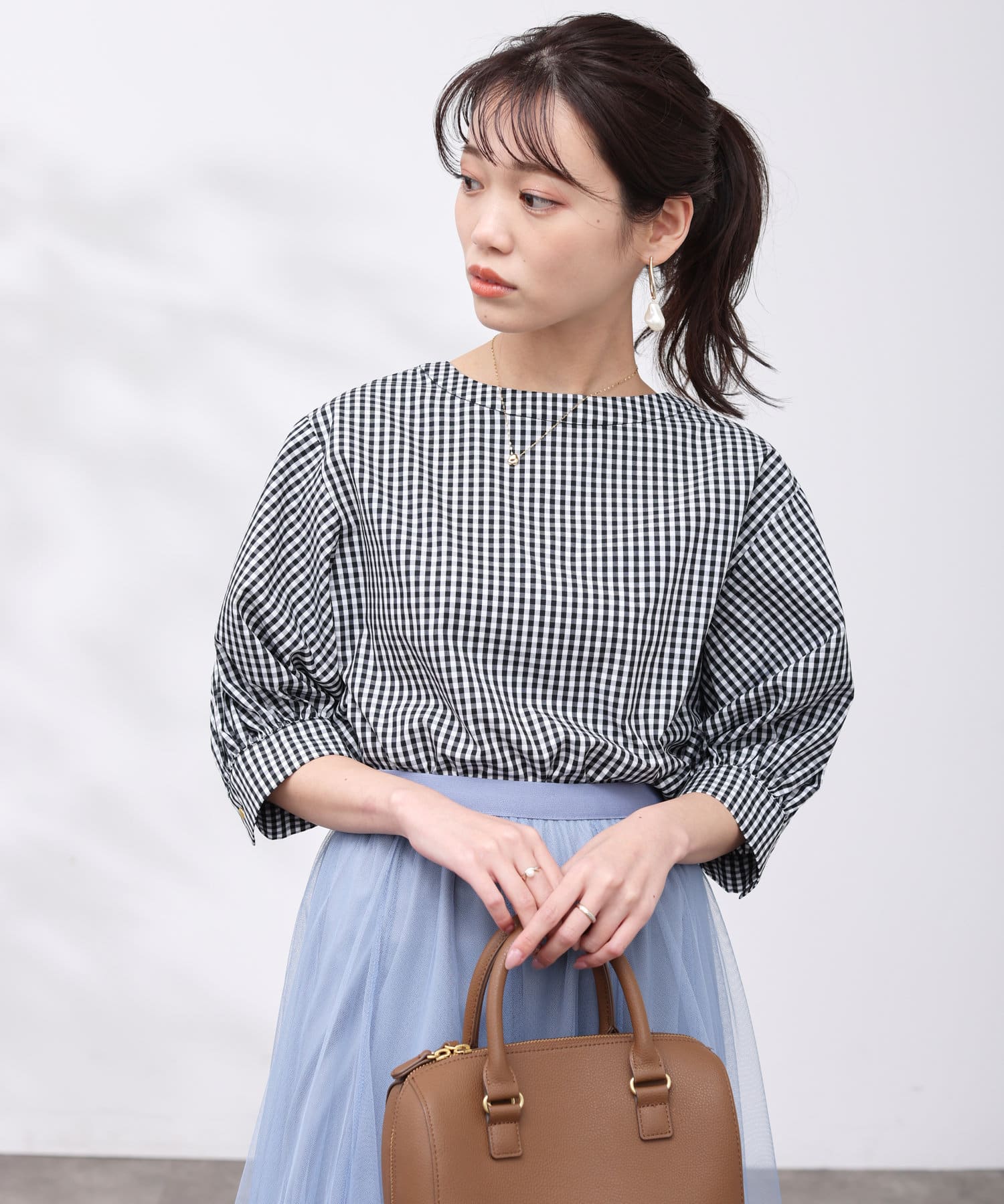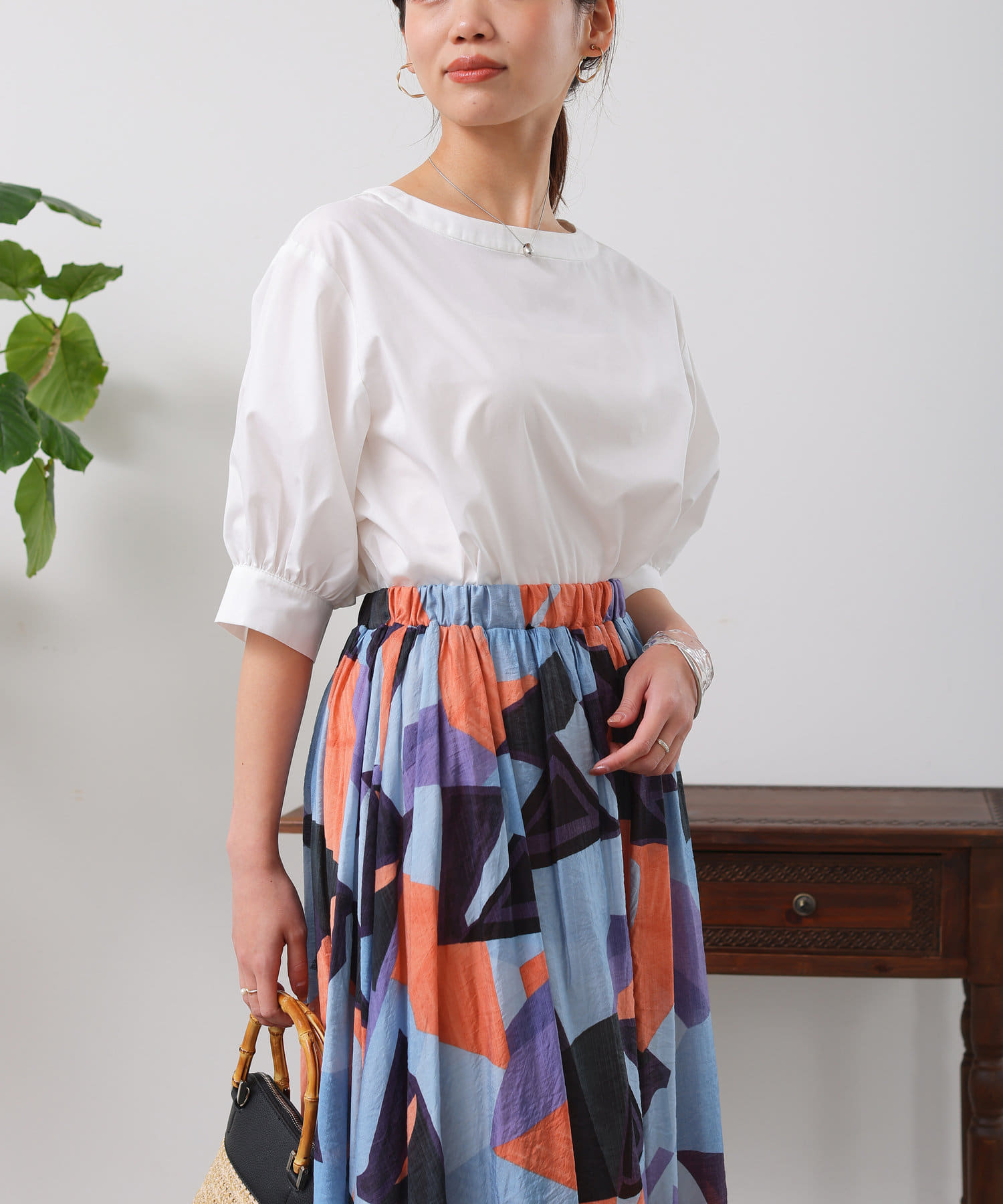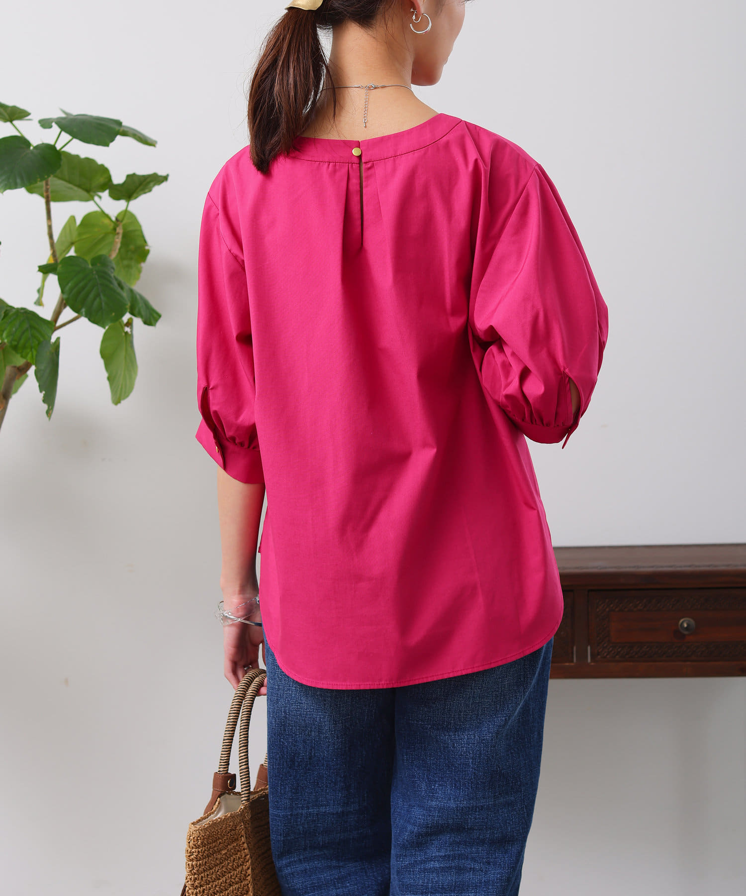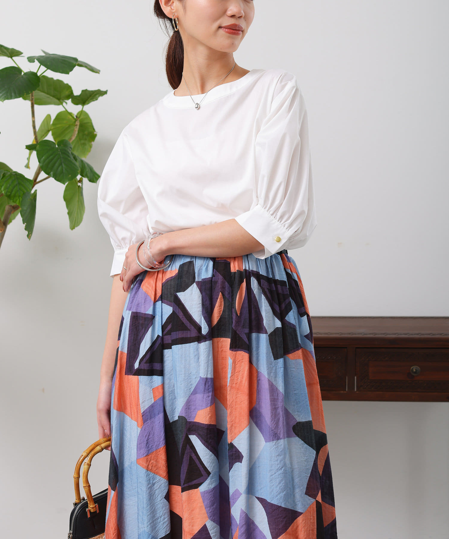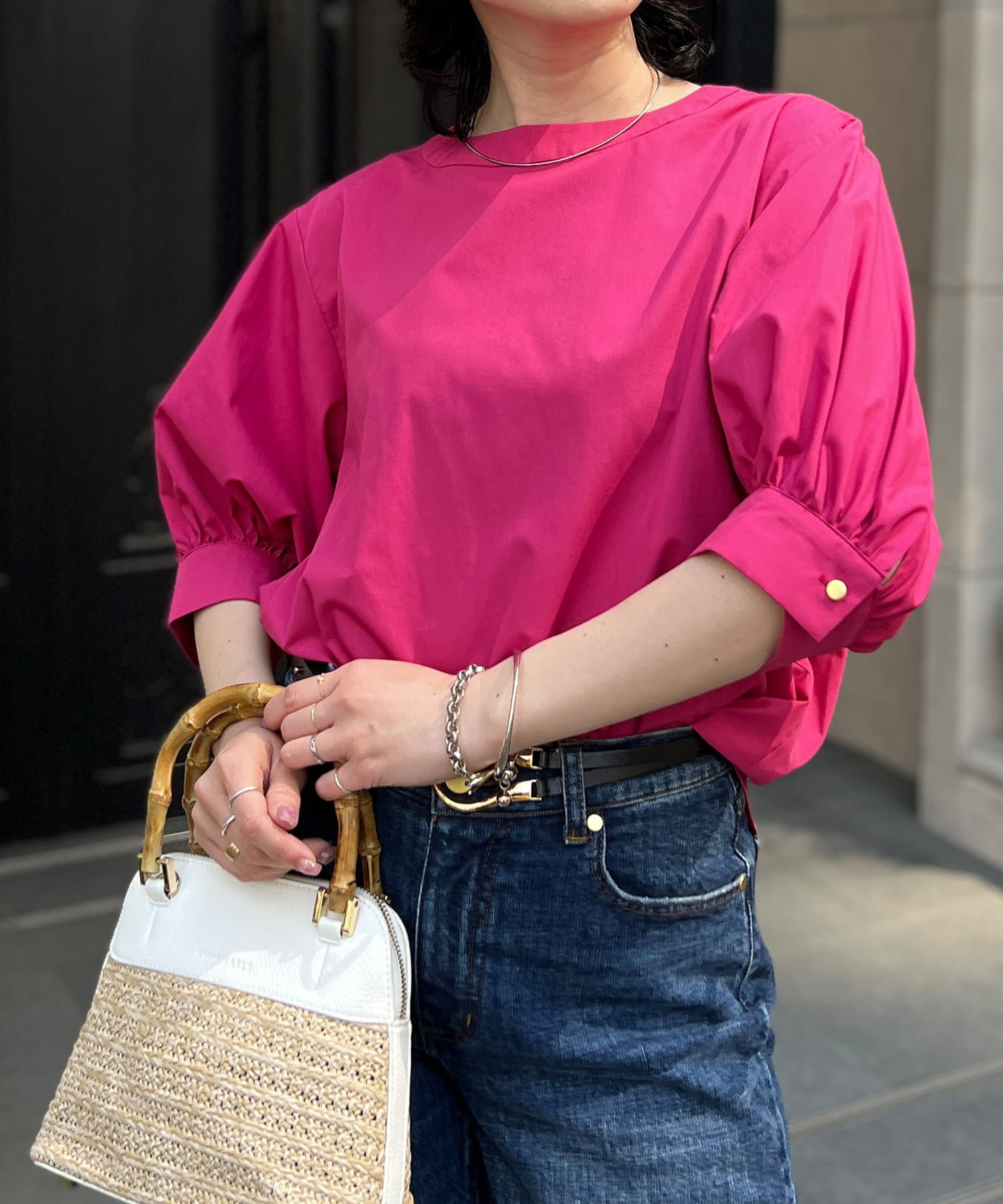 清涼感のある綿素材と5分袖のボリューム感がトレンドライクな1枚